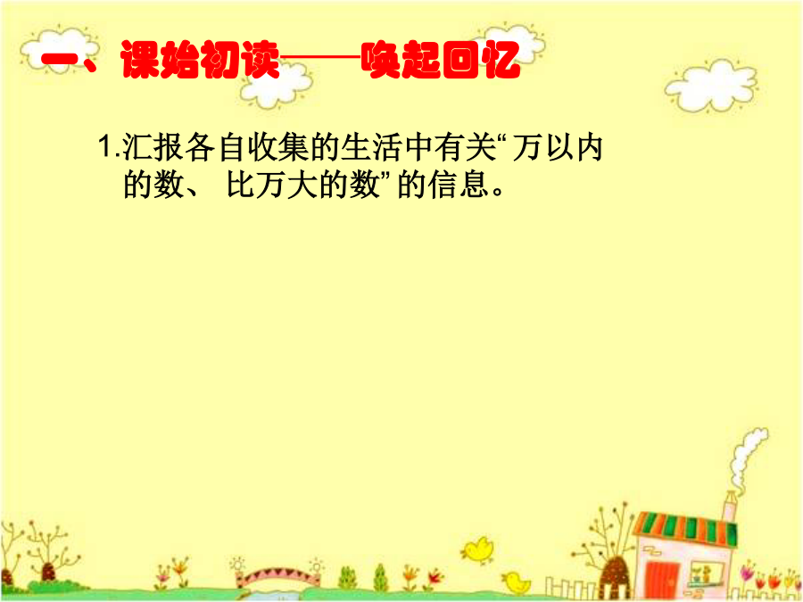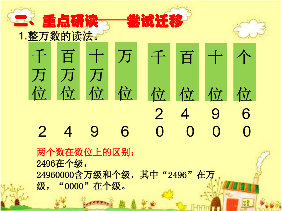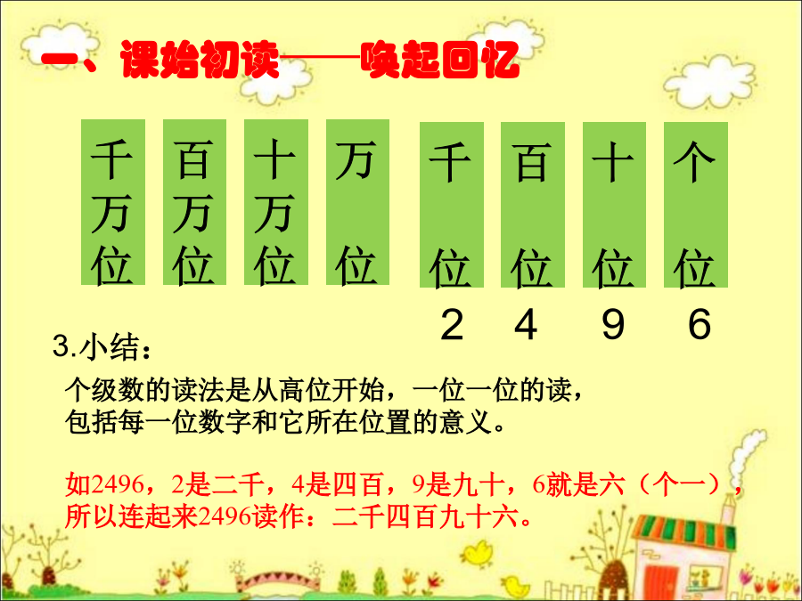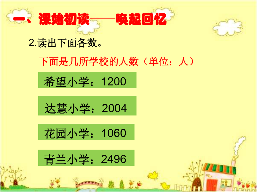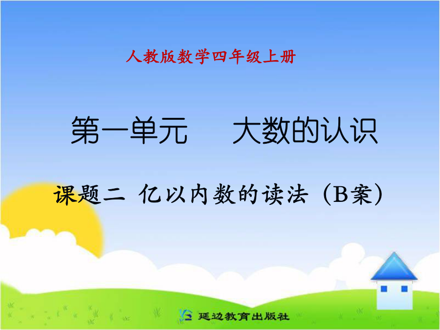 第一单元大数的认识课题二亿以内数的读法(B案)一、课始初读——唤起回忆一、课始初读——唤起回忆个 位个 位千百十个 位位位位个级 千百十个 位位位位 个 位个级 千百十个 位位位位 个 位300500603.含两级的数应该怎么读?北京:13819000人我国总人口: 1295330000人三、熟读精读——夯实基础2.鉴宝专家。3.猜猜房价。4.摆一摆。完成练习一第3、4题。再见