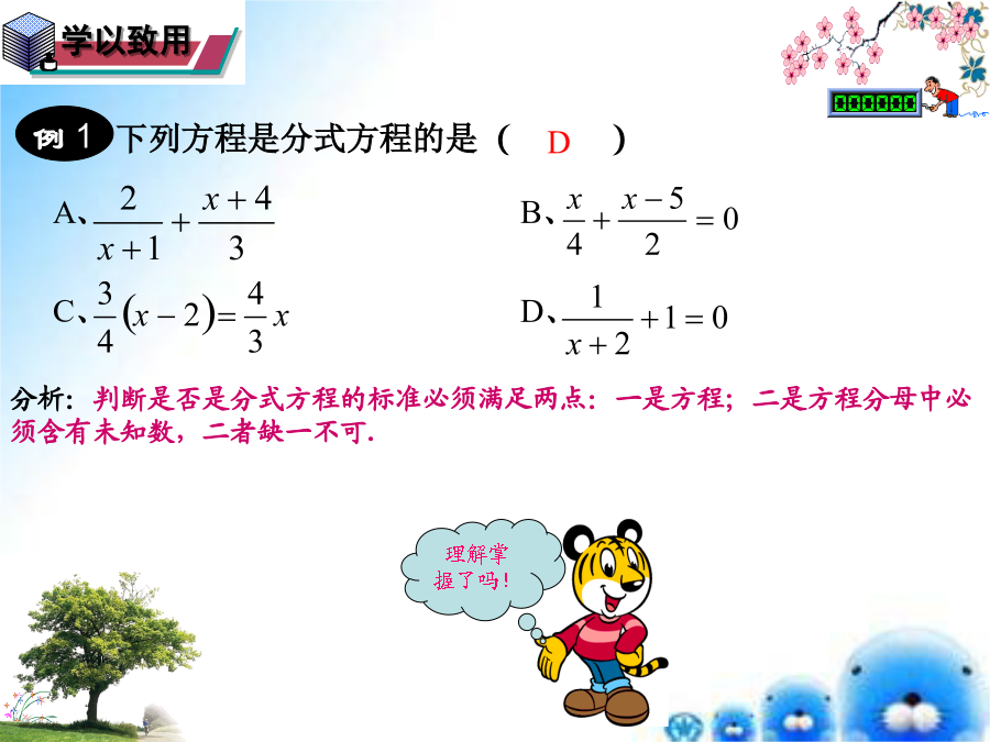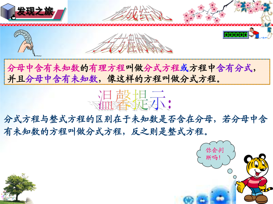 1.什么是一元一次方程?什么是方程的解?探究发现形成结论学以致用经典数学…探究分式方程的解法学以致用华师版第16章分式学无止境归纳总结形成结论经典数学…我的收获是……经典数学…谢谢,再见!