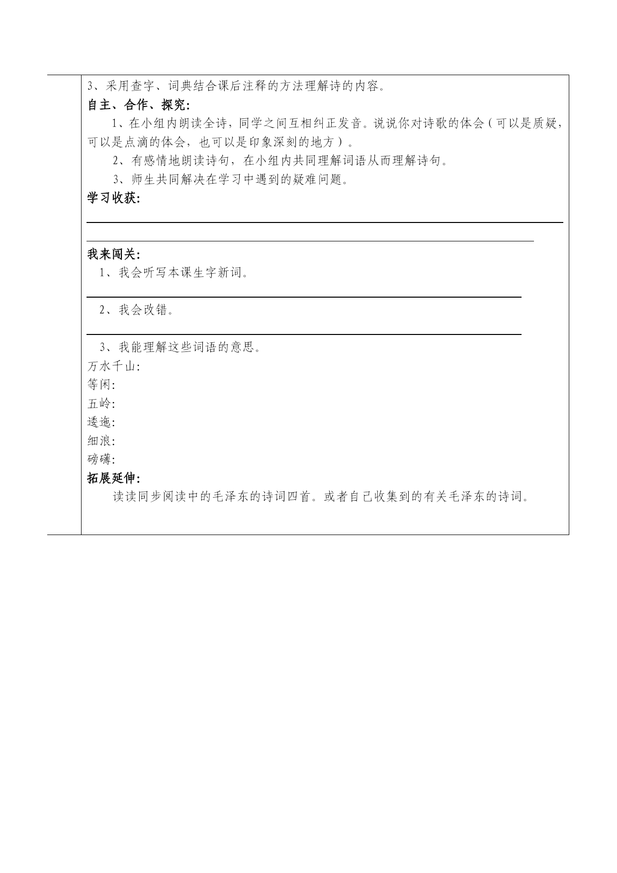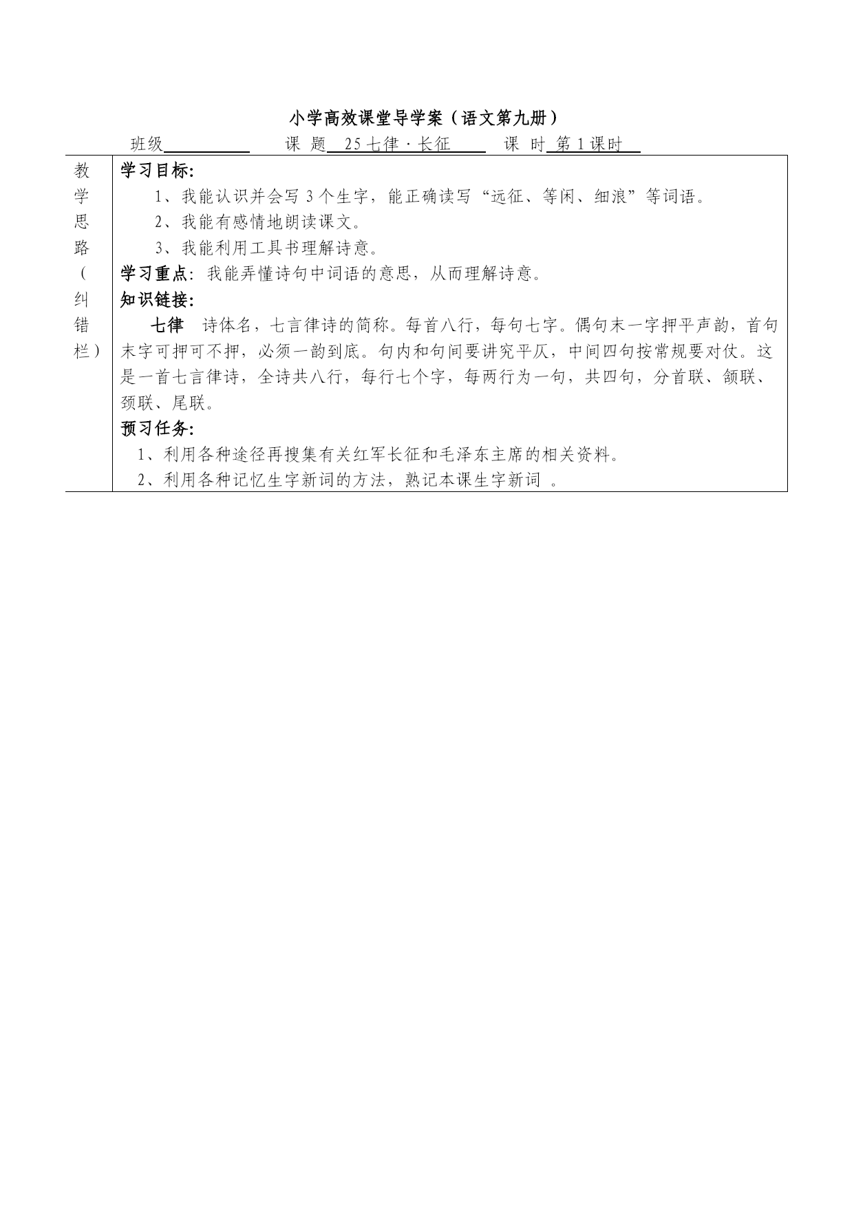 小学高效课堂导学案(语文第九册) 班级课题25七律·长征课时第1课时 教学思路 (纠错栏) 学习目标: 1、我能认识并会写3个生字,能正确读写“远征、等闲、细浪”等词语。 2、我能有感情地朗读课文。 3、我能利用工具书理解诗意。 学习重点:我能弄懂诗句中词语的意思,从而理解诗意。 知识链接: 七律诗体名,七言律诗的简称。每首八行,每句七字。偶句末一字押平声韵,首句末字可押可不押,必须一韵到底。句内和句间要讲究平仄,中间四句按常规要对仗。这是一首七言律诗,全诗共八行,每行七个字,每两行为一句,共四句,分首联、颔联、颈联、尾联。 预习任务: 1、利用各种途径再搜集有关红军长征和毛泽东主席的相关资料。 2、利用各种记忆生字新词的方法,熟记本课生字新词。3、采用查字、词典结合课后注释的方法理解诗的内容。 自主、合作、探究: 1、在小组内朗读全诗,同学之间互相纠正发音。说说你对诗歌的体会(可以是质疑,可以是点滴的体会,也可以是印象深刻的地方)。 2、有感情地朗读诗句,在小组内共同理解词语从而理解诗句。 3、师生共同解决在学习中遇到的疑难问题。 学习收获: 我来闯关: 1、我会听写本课生字新词。 2、我会改错。 3、我能理解这些词语的意思。 万水千山: 等闲: 五岭: 逶迤:细浪: 磅礴: 拓展延伸: 读读同步阅读中的毛泽东的诗词四首。或者自己收集到的有关毛泽东的诗词。