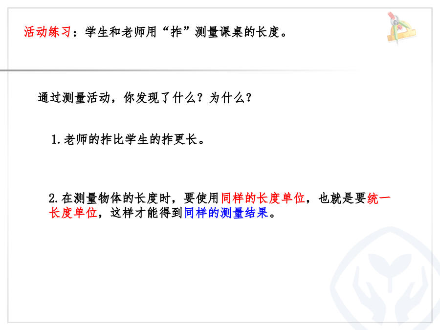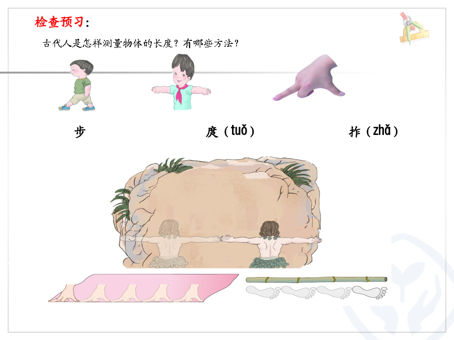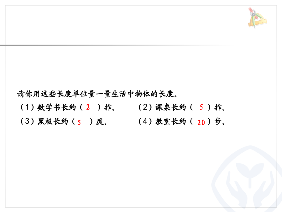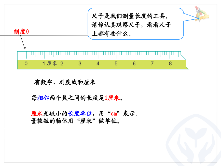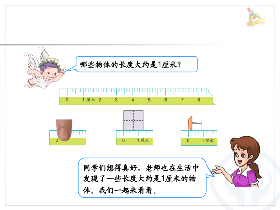 步庹(tuǒ)拃(zhǎ)请你用这些长度单位量一量生活中物体的长度。 (1)数学书长约()拃。(2)课桌长约()拃。 (3)黑板长约()庹。(4)教室长约()步。活动练习:学生和老师用“拃”测量课桌的长度。尺子是我们测量长度的工具。 请你认真观察尺子,看看尺子 上都有些什么。请你在生活中认真观察,看谁能 找到我们身边更多的长度大约是 1厘米的物体。一、复习导入三、知识应用1、厘米是较小的长度单位,用“cm”表示。 量较短的物体用“厘米”做单位。三、知识应用四、课堂作业