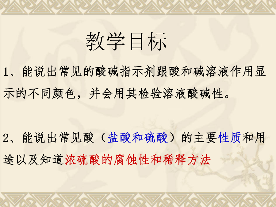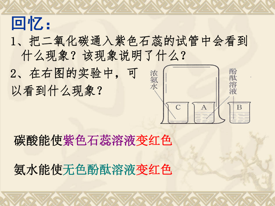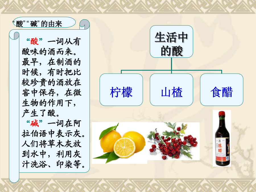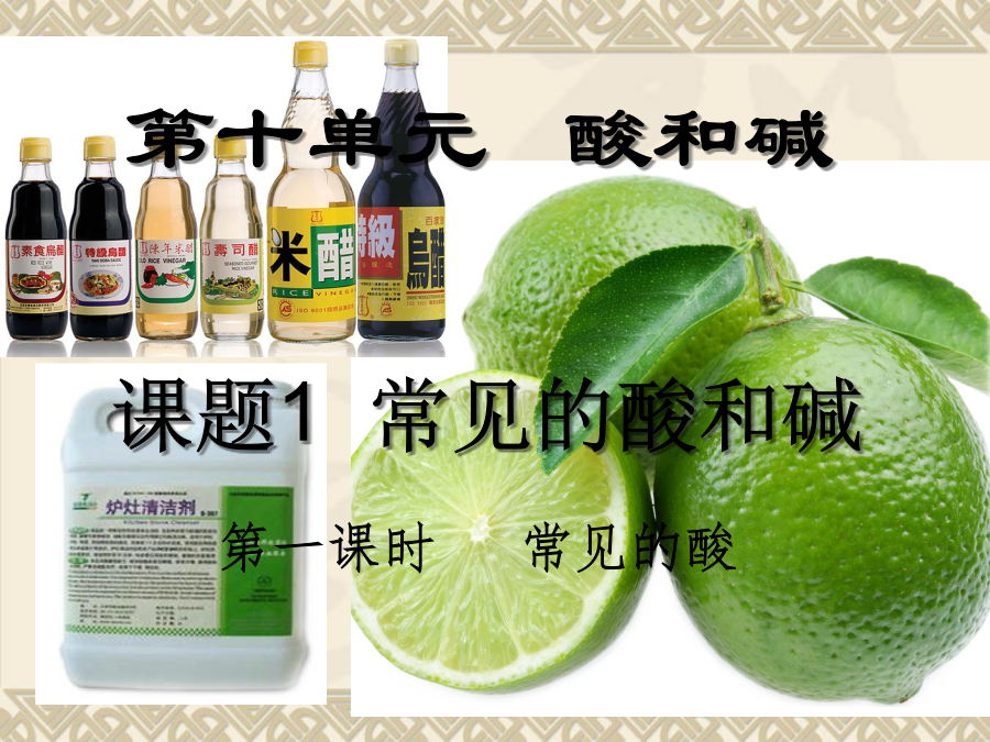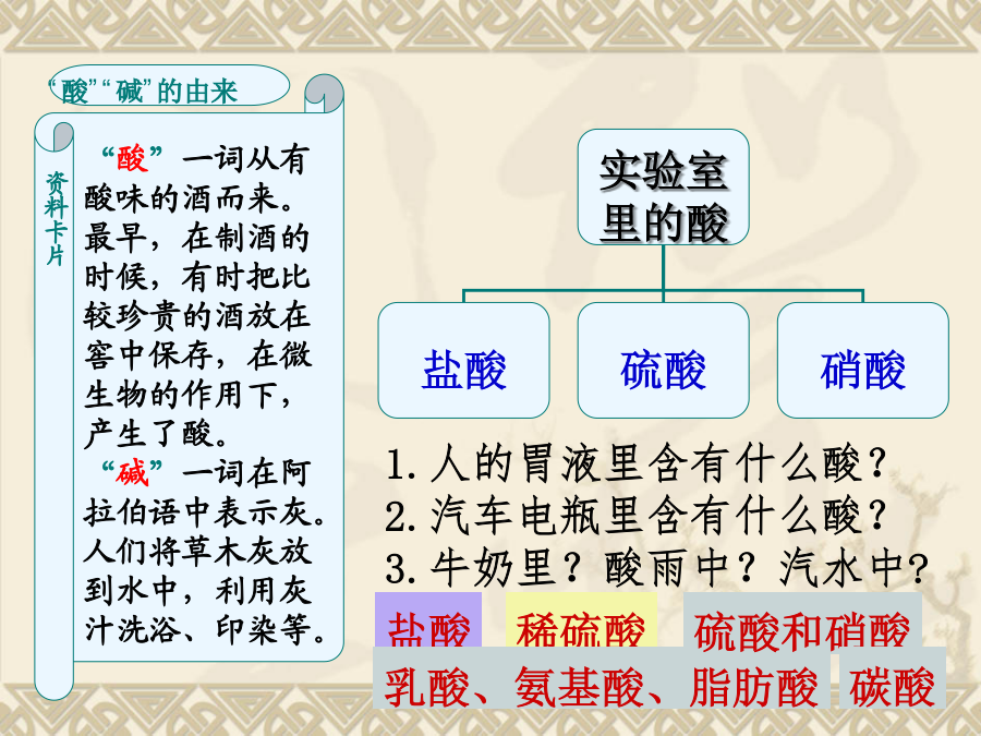 第十单元酸和碱1、把二氧化碳通入紫色石蕊的试管中会看到什么现象?该现象说明了什么? 2、在右图的实验中,可 以看到什么现象?教学目标“酸”一词从有 酸味的酒而来。 最早,在制酒的 时候,有时把比 较珍贵的酒放在 窖中保存,在微 生物的作用下, 产生了酸。 “碱”一词在阿 拉伯语中表示灰。 人们将草木灰放 到水中,利用灰 汁洗浴、印染等。“酸”一词从有 酸味的酒而来。 最早,在制酒的 时候,有时把比 较珍贵的酒放在 窖中保存,在微 生物的作用下, 产生了酸。 “碱”一词在阿 拉伯语中表示灰。 人们将草木灰放 到水中,利用灰 汁洗浴、印染等。能跟酸或碱的溶液起作用而显示不同的颜色的物质叫做酸碱指示剂。口诀:酚酞遇酸仍无色,酚酞遇碱红艳艳; 石蕊遇酸紫变红,石蕊遇碱紫变蓝②、活动与探究:自制酸碱指示剂。二、常见的酸 1.几种常见的酸注意:⑴、盐酸“有挥发性”,瓶口出现白雾是挥发出来的氯化氢气体遇到空气中的水蒸气形成盐酸小液滴 ⑵、浓硫酸具“有吸水性”,在实验室里常做气体的干燥剂(但不能干燥NH3)实验室和工业生产中常用的酸除了盐酸、硫 酸,还有硝酸(HNO3)、醋酸(CH3COOH)。另外,生 活中常见的许多物质中也含有酸。三、浓硫酸的特性实验③、脱水性: 1.盐酸是酸溶液,它使紫色石蕊溶液变______, 使无色的酚酞溶液_______。4、下列对盐酸的叙述,正确的是() A.盐酸是氯化氢气体的水溶液B.纯净的盐酸往往带有黄色 C.盐酸使无色酚酞试液变红D.盐酸具有强烈的吸水性6.下列叙述错误的是() A.打开浓盐酸的试剂瓶盖,瓶口出现白烟 B.用浓硫酸在白纸上写字,白纸上的字迹慢慢变黑 C.稀释浓硫酸时,应将浓硫酸沿器壁慢慢注入水中,并用玻璃棒不断搅拌 D.稀硫酸、稀盐酸都可以用于金属表面除锈 8.下表是四种花的提取液实验的(酒精用于提取花中的色素) ⑴上表中能做酸碱指示剂的花汁是;____________ ⑵将厨房中的少量白醋滴入大红花的花汁中,可以看到的现象是_________; ⑶若将紫罗兰提取液滴入氯化钠溶液中,则可看到的现象是____________。第十单元酸和碱教学目标还记得这幅图片吗?酸的化学性质酸的化学性质酸的化学性质酸的化学性质酸的化学性质小结:酸的化学性质:思考:为什么“酸”具有相似的化学性质呢?1、酸的化学性质 1.如图所示.密闭容器中盛有甲、乙两烧杯,乙烧杯中盛有紫色石蕊试液,当甲烧杯中盛有下列何种试剂时,过一会儿乙烧杯中石蕊试液由紫色变为红色() A.浓硫酸B.氢氧化钠溶液 C.浓盐酸D.氨水3.下列物质放入到稀硫酸中,无气体生成的是() A.铝B碳酸钠C铁锈D石灰石10、初中化学教材中常用下列词语描述物质的性质:a.氧化性b.还原性c.可燃性d.毒性e.吸水性f.溶解性g.酸碱性h.腐蚀性 请你选择合理的序号(a--h)填写下列空格: ⑴浓硫酸可用作干燥剂,是因为它有___; ⑵氢气可用高能燃料,是因为它有____; ⑶氧气在燃烧反应中一般表现出_____; ⑷用CO冶炼铁,是利用它的_____; ⑸石蕊和酚酞可用来检验溶液的_____; ⑹H2SO4和HCl等对人的皮肤有____。11、已知一种固体化合物由C、H、O、Cu四种元素组成。向盛有该化合物的试管中加入稀盐酸,产生大量气泡,固体逐渐溶解,得到蓝绿色溶液。己知这种蓝绿色是氯化铜溶液。(2)从蓝绿色溶液中提取金属铜。现利用该溶液制取金属铜,过程如下:12、实验室有两瓶标签破损的无色溶液,推知它们只能是稀盐酸和氯化钠溶液,试选择不同物质类别的试剂进行区分。第十单元酸和碱1、了解氢氧化钠和氢氧化钙的物理性质和用途摸起来滑滑的一、几种常见的碱1、氢氧化钠[NaOH]小结:氢氧化钠的性质:②腐蚀性: 氢氧化钠有强烈的腐蚀性,氢氧化钠[NaOH]小结:氢氧化钙的性质:除了氢氧化钠和氢氧化钙外,常见的碱还有 氢氧化钾(KOH)、氨水(NH3)等。二、碱的化学性质⒉碱与非金属氧化物反应:⒉碱与非金属氧化物反应:小结:碱与金属氧化物反应小结:碱的化学性质:思考:为什么“碱”具有相似的化学性质呢?【实验10-7】如图10-10所示,分别试验盐酸、硫酸、氢氧化钠溶液、氢氧化钙溶液、蒸馏水和乙醇的导电性。比较项目2、碱的化学性质:课堂反馈4、下列检验物质导电性的实验中,不亮的灯泡是()6、固体氢氧化钠必须密闭保存,其原因是()(1)氢氧化钠有毒;(2)氢氧化钠有强腐蚀性;(3)氢氧化钠在空气中会被氧化;(4)氢氧化钠在空气里易吸收水分而潮解;(5)氢氧化钠能与空气中的二氧化碳反应。A、(1)(2)B、(3)(4)C、(4)(5)D、(2)(5)8、纯净的氢氧化钠是一种_______色固体,由于在空气里它不仅能吸收_______而潮解,还能跟空气里的____