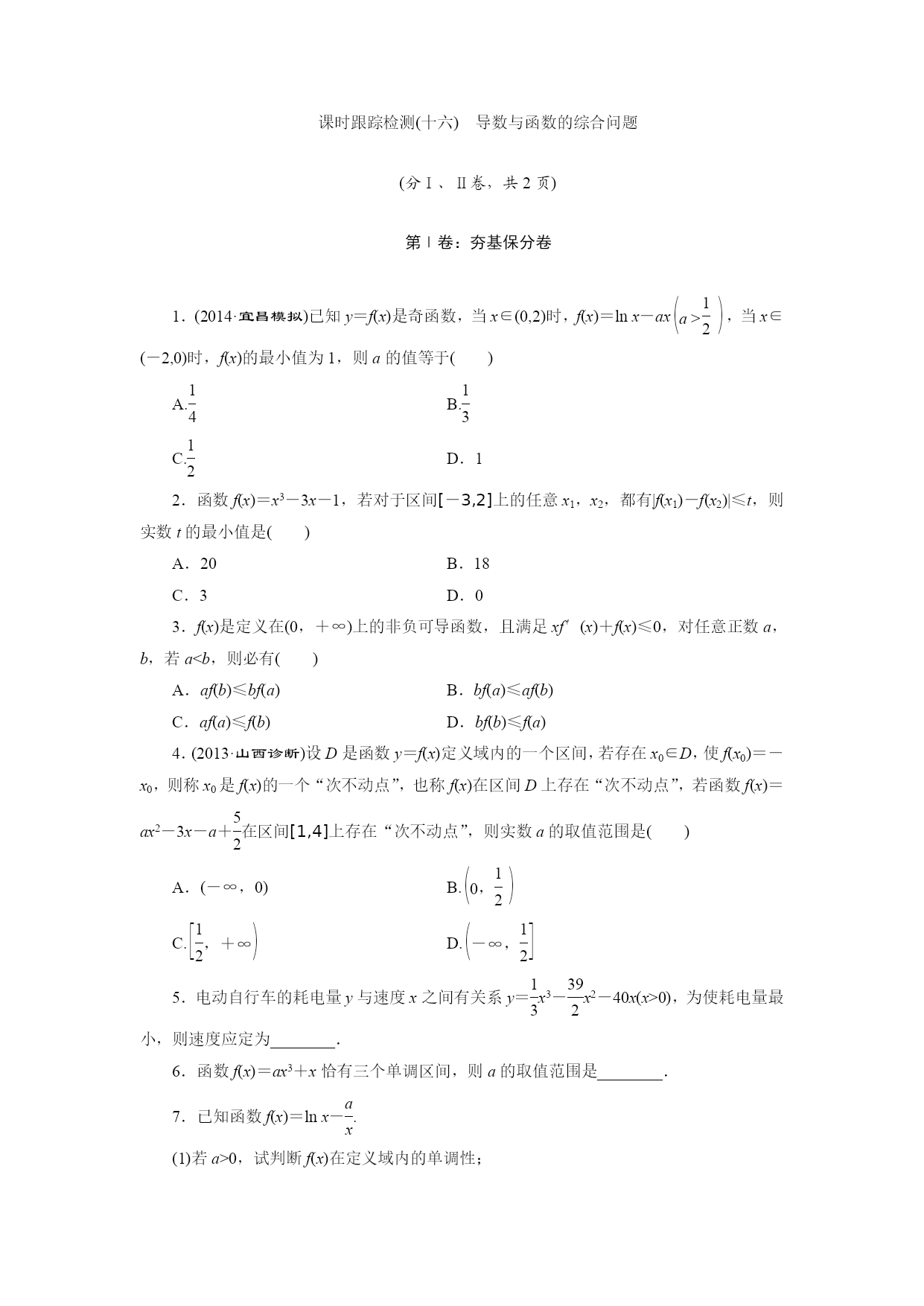 1.(2014·宜昌模拟)已知y=f(x)是奇函数,当x∈(0,2)时,f(x)=lnx-axeq\b\lc\(\rc\)(\a\vs4\al\co1(a>\f(1,2))),当x∈(-2,0)时,f(x)的最小值为1,则a的值等于()