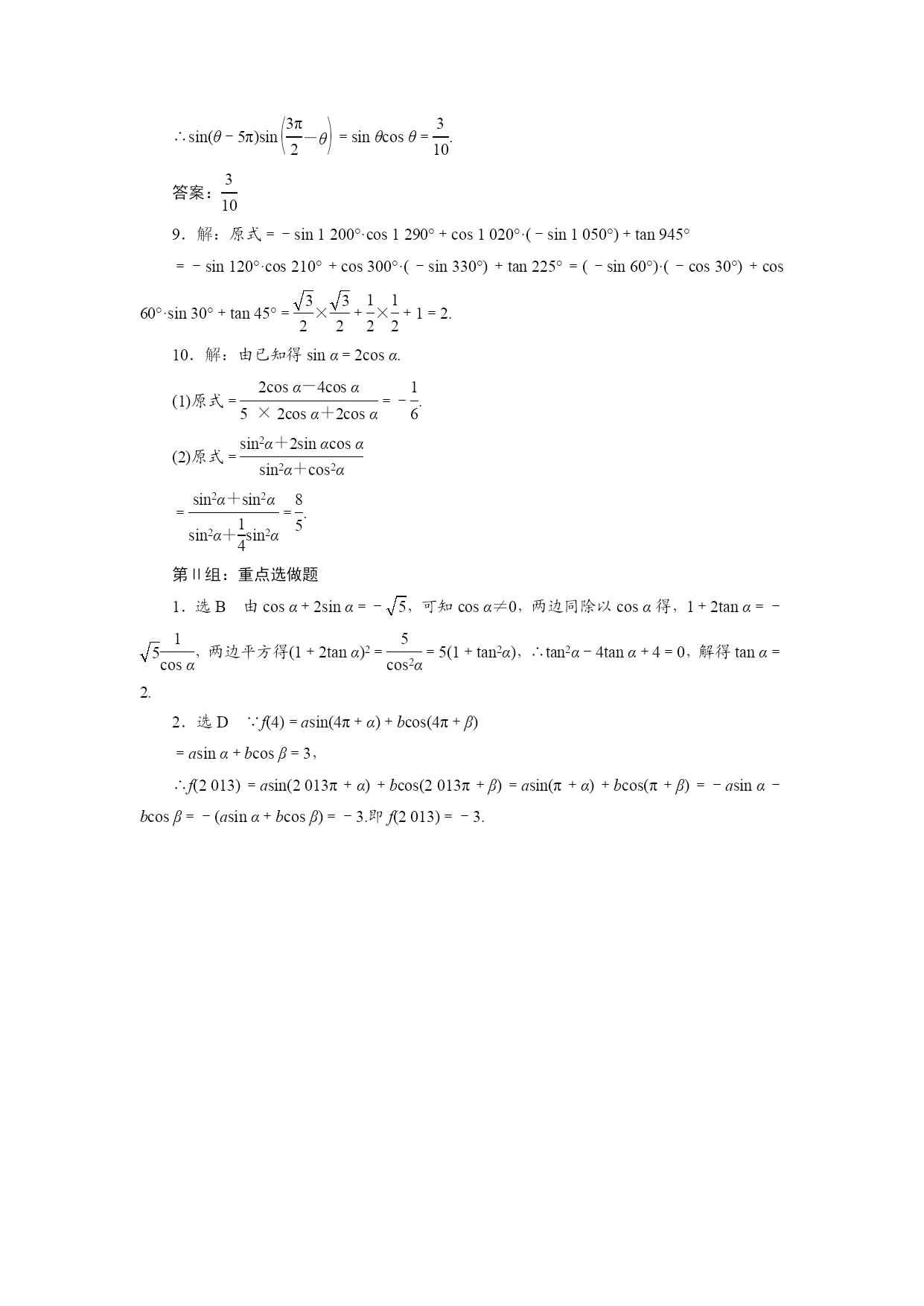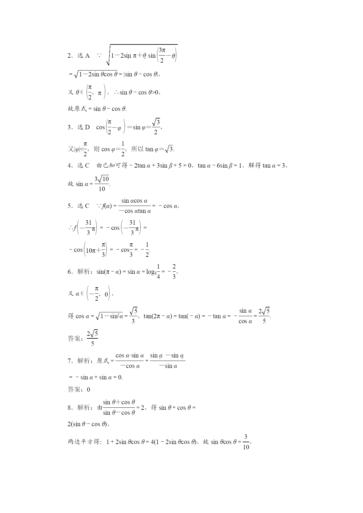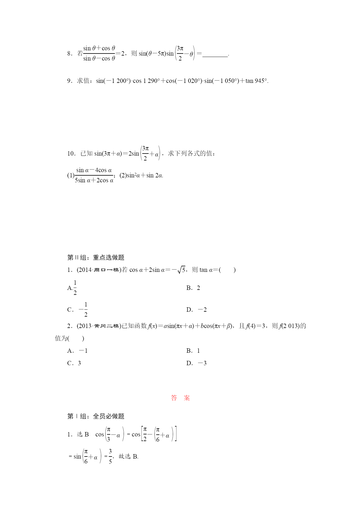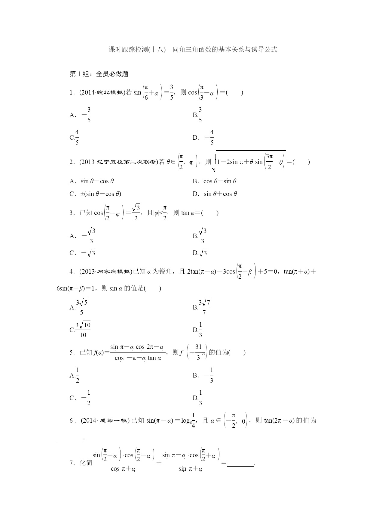 课时跟踪检测(十八)同角三角函数的基本关系与诱导公式 第Ⅰ组:全员必做题 1.(2014·皖北模拟)若sineq\b\lc\(\rc\)(\a\vs4\al\co1(\f(π,6)+α))=eq\f(3,5),则coseq\b\lc\(\rc\)(\a\vs4\al\co1(\f(π,3)-α))=() A.-eq\f(3,5) B.eq\f(3,5) C.eq\f(4,5) D.-eq\f(4,5) 2.(2013·辽宁五校第二次联考)若θ∈eq\b\lc\(\rc\)(\a\vs4\al\co1(\f(π,2),π)),则eq\r(1-2sinπ+θsin\b\lc\(\rc\)(\a\vs4\al\co1(\f(3π,2)-θ)))=() A.sinθ-cosθ B.cosθ-sinθ C.±(sinθ-cosθ) D.sinθ+cosθ 3.已知coseq\b\lc\(\rc\)(\a\vs4\al\co1(\f(π,2)-φ))=eq\f(\r(3),2),且|φ|<eq\f(π,2),则tanφ=() A.-eq\f(\r(3),3) B.eq\f(\r(3),3) C.-eq\r(3) D.eq\r(3) 4.(2013·石家庄模拟)已知α为锐角,且2tan(π-α)-3coseq\b\lc\(\rc\)(\a\vs4\al\co1(\f(π,2)+β))+5=0,tan(π+α)+6sin(π+β)=1,则sinα的值是() A.eq\f(3\r(5),5) B.eq\f(3\r(7),7) C.eq\f(3\r(10),10) D.eq\f(1,3) 5.已知f(α)=eq\f(sinπ-αcos2π-α,cos-π-αtanα),则feq\b\lc\(\rc\)(\a\vs4\al\co1(-\f(31,3)π))的值为() A.eq\f(1,2) B.-eq\f(1,3) C.-eq\f(1,2) D.eq\f(1,3) 6.(2014·成都一模)已知sin(π-α)=log8eq\f(1,4),且α∈eq\b\lc\(\rc\)(\a\vs4\al\co1(-\f(π,2),0)),则tan(2π-α)的值为________. 7.化简eq\f(sin\b\lc\(\rc\)(\a\vs4\al\co1(\f(π,2)+α))·cos\b\lc\(\rc\)(\a\vs4\al\co1(\f(π,2)-α)),cosπ+α)+eq\f(sinπ-α·cos\b\lc\(\rc\)(\a\vs4\al\co1(\f(π,2)+α)),sinπ+α)=________. 8.若eq\f(sinθ+cosθ,sinθ-cosθ)=2,则sin(θ-5π)sineq\b\lc\(\rc\)(\a\vs4\al\co1(\f(3π,2)-θ))=________. 9.求值:sin(-1200°)·cos1290°+cos(-1020°)·sin(-1050°)+tan945°. 10.已知sin(3π+α)=2sineq\b\lc\(\rc\)(\a\vs4\al\co1(\f(3π,2)+α)),求下列各式的值: (1)eq\f(sinα-4cosα,5sinα+2cosα);(2)sin2α+sin2α. 第Ⅱ组:重点选做题 1.(2014·周口一模)若cosα+2sinα=-eq\r(5),则tanα=() A.eq\f(1,2) B.2 C.-eq\f(1,2) D.-2 2.(2013·黄冈二模)已知函数f(x)=asin(πx+α)+bcos(πx+β),且f(4)=3,则f(2013)的值为() A.-1 B.1 C.3 D.-3 答案 第Ⅰ组:全员必做题 1.选Bcoseq\b\lc\(\rc\)(\a\vs4\al\co1(\f(π,3)-α))=coseq\b\lc\[\rc\](\a\vs4\al\co1(\f(π,2)-\b\lc\(\rc\)(\a\vs4\al\co1(\f(π,6)+α)))) =sineq\b\lc\(\rc\)(\a\vs4\al\co1(\f(π,6)+α))=eq\f(3,5),故选B. 2.选A∵eq\r(1-2sinπ+θsin\b\lc\(\rc\)(\a\vs4\al\co1(\f(3π,2)-θ))) =eq\r(1-2sinθ