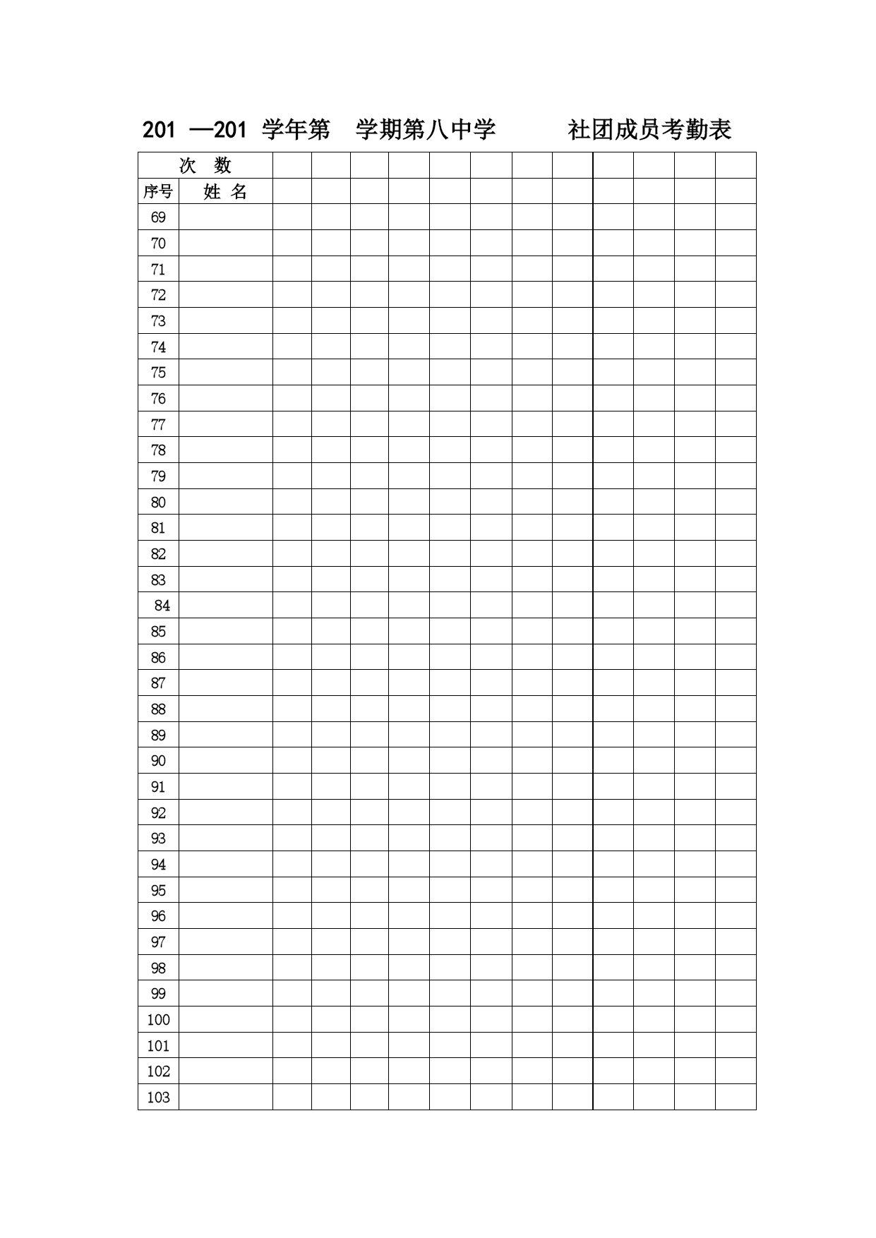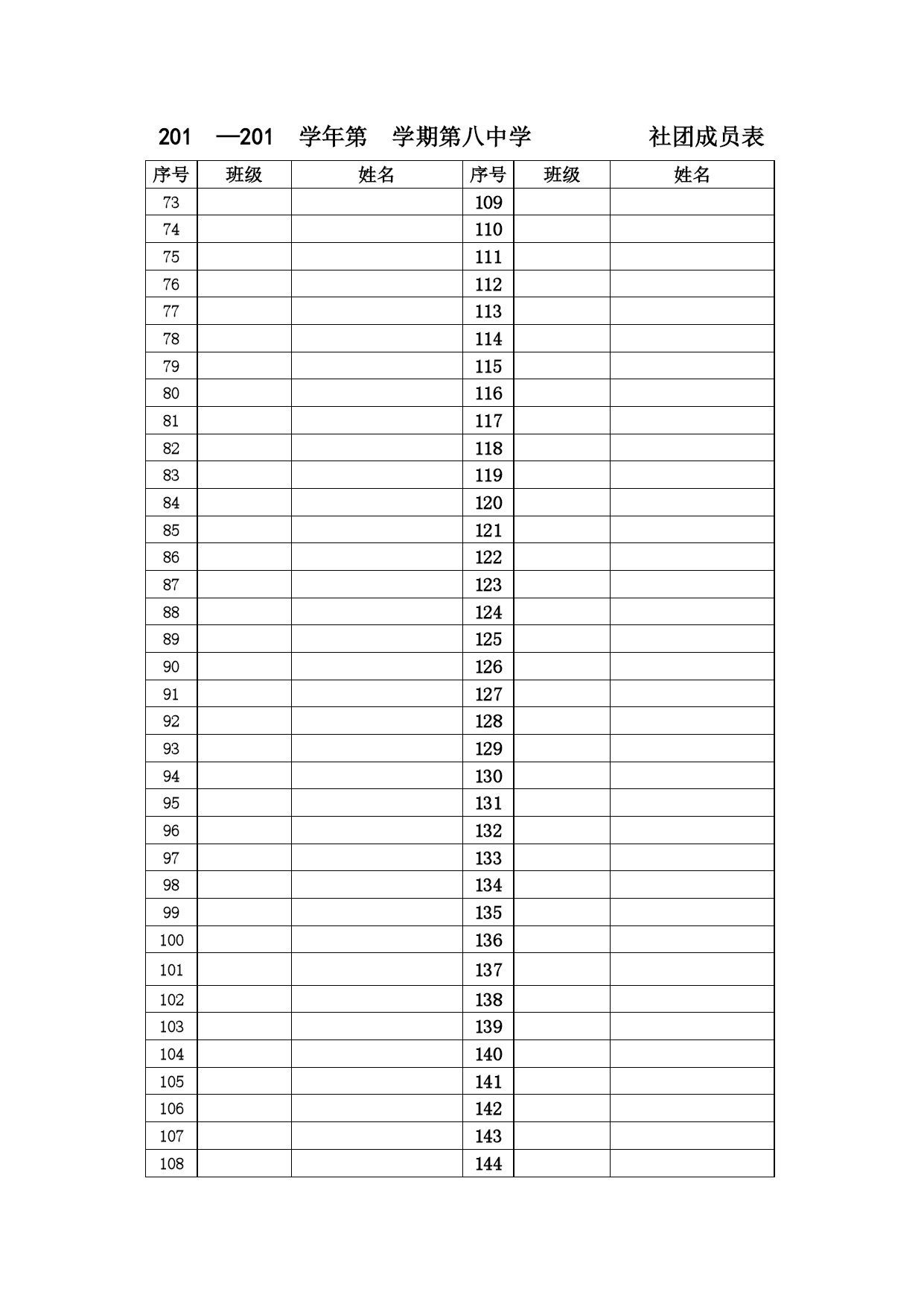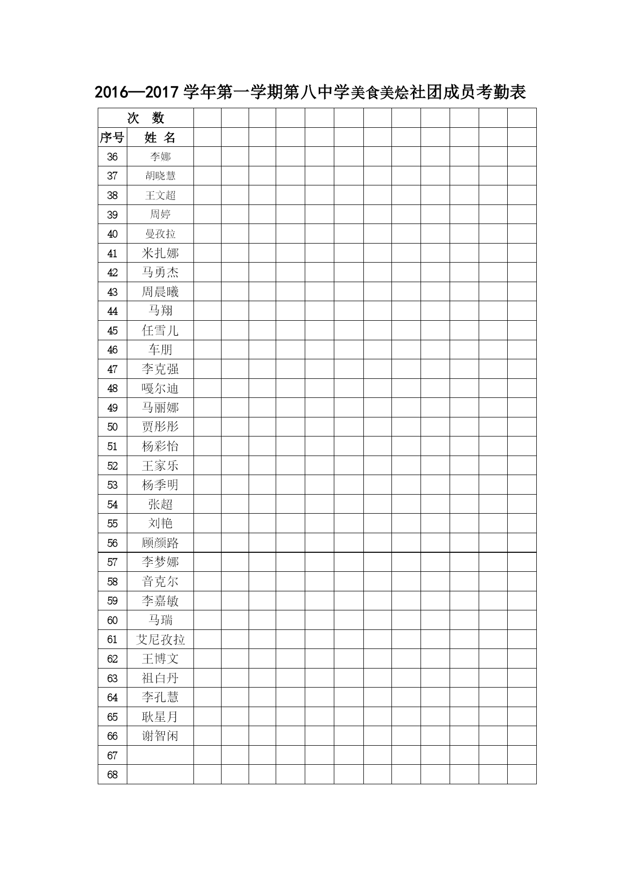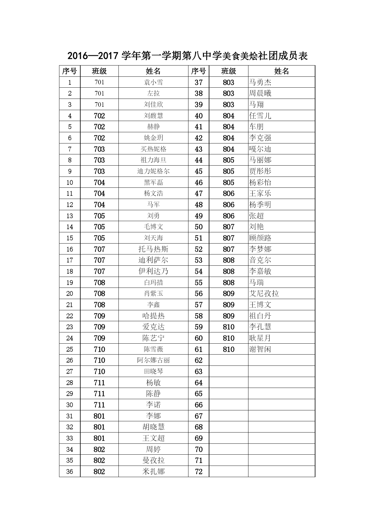2016—2017学年第一学期第八中学美食美烩社团成员表 序号班级姓名序号班级姓名1701袁小雪37803马勇杰2701左拉38803周晨曦3701刘佳欣39803马翔4702刘馥慧40804任雪儿5702赫静41804车朋6702姚金玥42804李克强7703买热妮格43804嘠尔迪8703祖力海旦44805马丽娜9703迪力妮格尔45805贾彤彤10704黑军磊46805杨彩怡11704杨文浩47806王家乐12704马军48806杨季明13705刘勇49806张超14705毛博文50807刘艳15705刘天海51807顾颜路16707托马热斯52807李梦娜17707迪利萨尔53808音克尔18707伊利达乃54808李嘉敏19708白玛措55808马瑞20708肖紫玉56809艾尼孜拉21708李鑫57809王博文22709哈提热58809祖白丹23709爱克达59810李孔慧24709陈艺宁60810耿星月25710陈雪薇61810谢智闲26710阿尔娜古丽6227710田晓琴6328711杨敏6429711陈静6530711李诺6631801李娜6732801胡晓慧6833801王文超6934802周婷7035802曼孜拉7136802米扎娜72 201—201学年第学期第八中学社团成员表 序号班级姓名序号班级姓名7310974110751117611277113781147911580116811178211883119841208512186122871238812489125901269112792128931299413095131961329713398134991351001361011371021381031391041401051411061421071431081442016—2017学年第一学期第八中学美食美烩社团成员考勤表 次数序号姓名1袁小雪2左拉3刘佳欣4刘馥慧5赫静6姚金玥7买热妮格8祖力海旦9迪力妮格尔10黑军磊11杨文浩12马军13刘勇14毛博文15刘天海16托马热斯17迪利萨尔18伊利达乃19白玛措20肖紫玉21李鑫22哈提热23爱克达24陈艺宁25陈雪薇26阿尔娜古丽27田晓琴28杨敏29陈静30李诺31323334352016—2017学年第一学期第八中学美食美烩社团成员考勤表 次数序号姓名36李娜37胡晓慧38王文超39周婷40曼孜拉41米扎娜42马勇杰43周晨曦44马翔45任雪儿46车朋47李克强48嘠尔迪49马丽娜50贾彤彤51杨彩怡52王家乐53杨季明54张超55刘艳56顾颜路57李梦娜58音克尔59李嘉敏60马瑞61艾尼孜拉62王博文63祖白丹64李孔慧65耿星月66谢智闲6768201—201学年第学期第八中学社团成员考勤表 次数序号姓名69707172737475767778798081828384858687888990919293949596979899100101102103