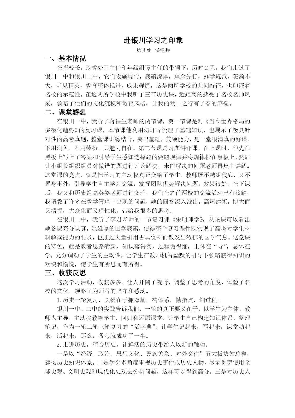 赴银川学习之印象 历史组侯建兵 一、基本情况 在崔校长,政教处王主任和年级组谭主任的带领下,历时2天,我们走过了银川一中和银川二中,它们设施现代,底蕴深厚,理念先行,办学规范,班额不大,却见精英,教育整体推进,成果辉煌,这是两所学校的共同特征,也印证着名校的示范性。在这两所学校中我听了三节历史课,近距离的感受了名校名师风采,领略了他们的文化沉积和教育风格,让我的秋日之行有了春的感受。 二、课堂感想 在银川一中,我听了蒋福生老师的两节课,第一节课是对《当今世界格局的多极化趋势》的复习课,本节课他利用幻灯片梳理了基础知识,也展示了极具针对性的高考真题,整堂课讲练结合,突出基础,兼顾能力,是一堂很清真的好课。不用润色,不用装扮,其魅力自在。第二节课是习题讲评课,在上课时,他先在黑板上写上了答案和引导学生感知选择题的做题规律并将规律抄在黑板上,然后让小组长组织组员对做错的题进行讨论解决,未能解决的问题老师再集中讲解。这堂课的亮点,就是把学习的主动权真正交给了学生,教师既不越俎代庖,又不置身事外,引导学生自主学习交流,发挥团队优势解决问题,效果很好。在下课后,我又和历史组高英姿老师进行交流,我们在之前两校的交流活动已有接触,我请教了许多在教学管理中出现的问题,她的回答深入浅出,高屋建瓴,博大而又精悍,大众化而又理性化,带给我很多的思考。 在银川二中,我听了李君老师的一节复习课《宋明理学》,从该课可以看出她备课充分认真,她雄厚的国学底蕴,使得整个复习课件既实现了高考对学生材料解读能力的要求,也通过大量引用古典资料而散发出浓郁的国学气息。这堂课的特色,就是教者思路清新,知识落得实,过程做得细,主体在“导”,总体在学,充分调动了学生的主动性,让学生在教师机智幽默的引导下领略获得知识的欢快和愉悦,使学生有所思而有所得。 三、收获反思 这次学习活动,收获多多。让人开阔了视野,调整了思考的角度,体验了名校的文化,领略了为师者的坚守和感动。 1.历史一轮复习,关键在于抓双基,构体系,勤指点,细过程。 银川一中、二中的实践告诉我们,一轮的真正要义在于,以学生为主体,教师为主导,主动权教给学生,回归和还原课堂,让学生自己构建知识体系,整理笔记,作为一轮二轮三轮复习的“活字典”。让学生记起来,写起来,课堂动起来,活起来,那么,备考就成功了一半。 2.走进历史,整合历史,让鲜活的历史带给人以新的触动。 一是以“经济、政治、思想文化、民族关系、对外交往”五大板块为总揽,建构历史知识体系。二是学会多角度审视历史事件或历史人物,尽量贯穿使用全球史观、文明史观和现代化史观去分析问题,这样可以得到高分。三是对历史人物的评价或历史事件、历史现象的认识尽量多元化,凸显开放性或多层次性。四是选修和必修教材要尽量从交集出发,融汇其中,不要割裂二者的联系。五是多关注史料或补充史料,与老教材或岳麓版教材及大学教材相互衔接,看重白寿彝先生的《中国通史》和斯塔夫里阿诺斯的《全球通史》,高考史料大多出于这两部史学巨著当中。六是引导学生掌握SOLO评价法(SOLO分类评价法是一种以等级描述为基本特征的质性评价方法,由澳大利亚学者约翰·比格斯(Biggs)教授创建。比格斯教授是一位教育心理学家,曾在澳大利亚、加拿大和香港从事教育心理学的教学和研究工作,主要从事如何激发学生的学习动机和学生的学习模式研究。),从目前高考趋势来看,这种评价法已经有前移倾向(从42题前移到41题第二问)。 “操千曲而后晓声,观千剑而后识器”,此行收获给我们的备考无疑带来了全新的方向,我们将在学校、年级组和备课组的指引下,优化指导,核心突破,全力做好2017年文综历史的备考工作。