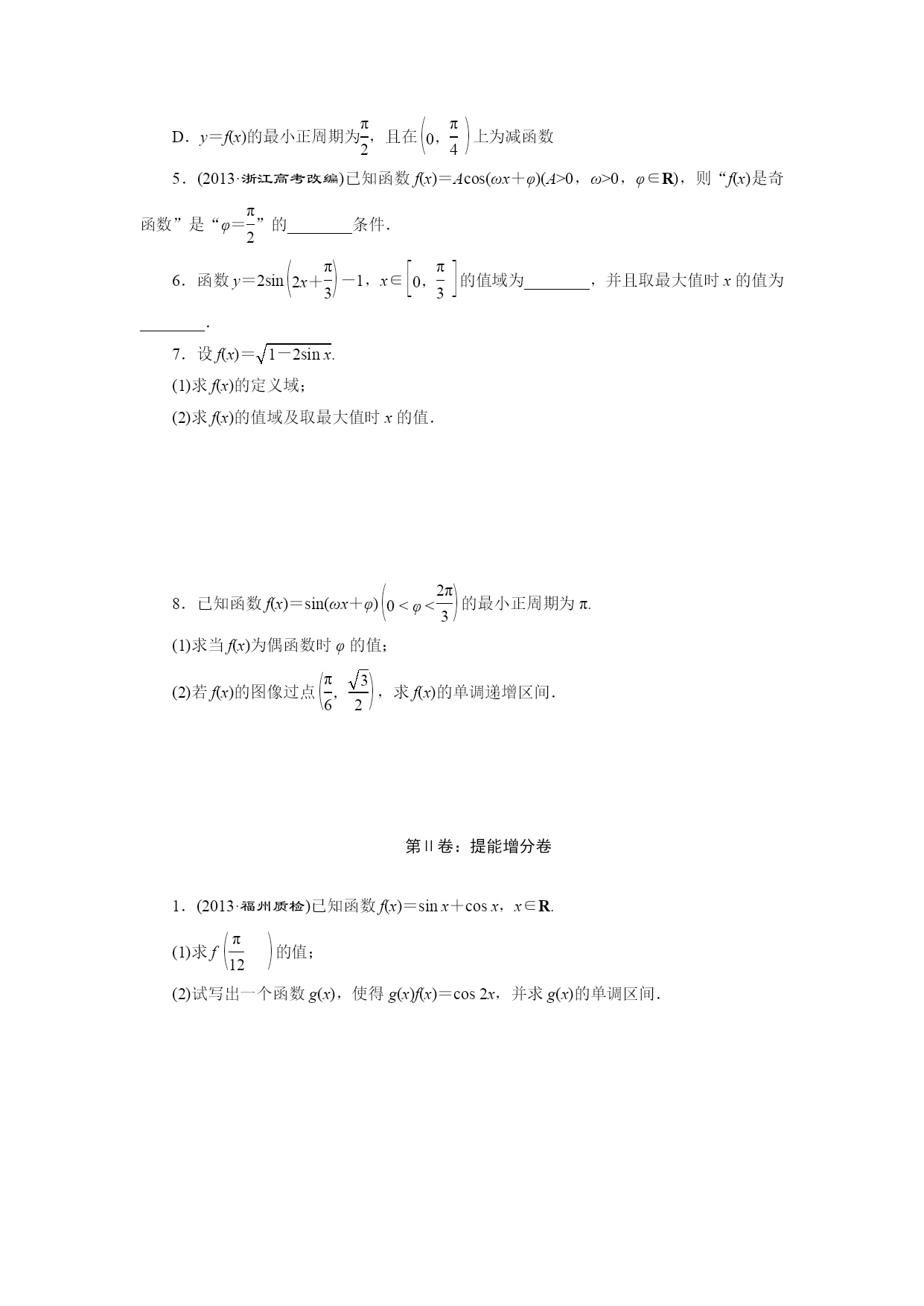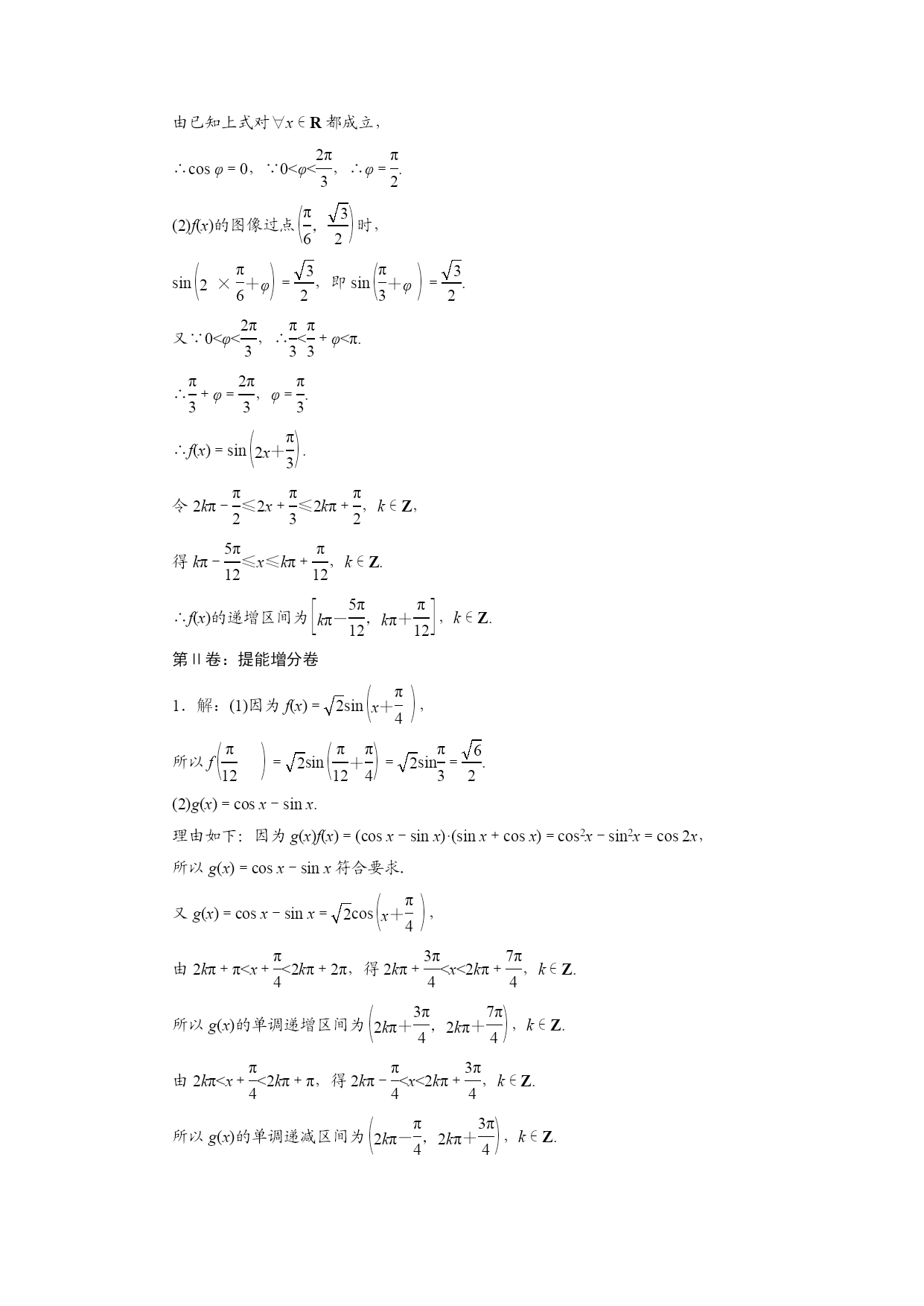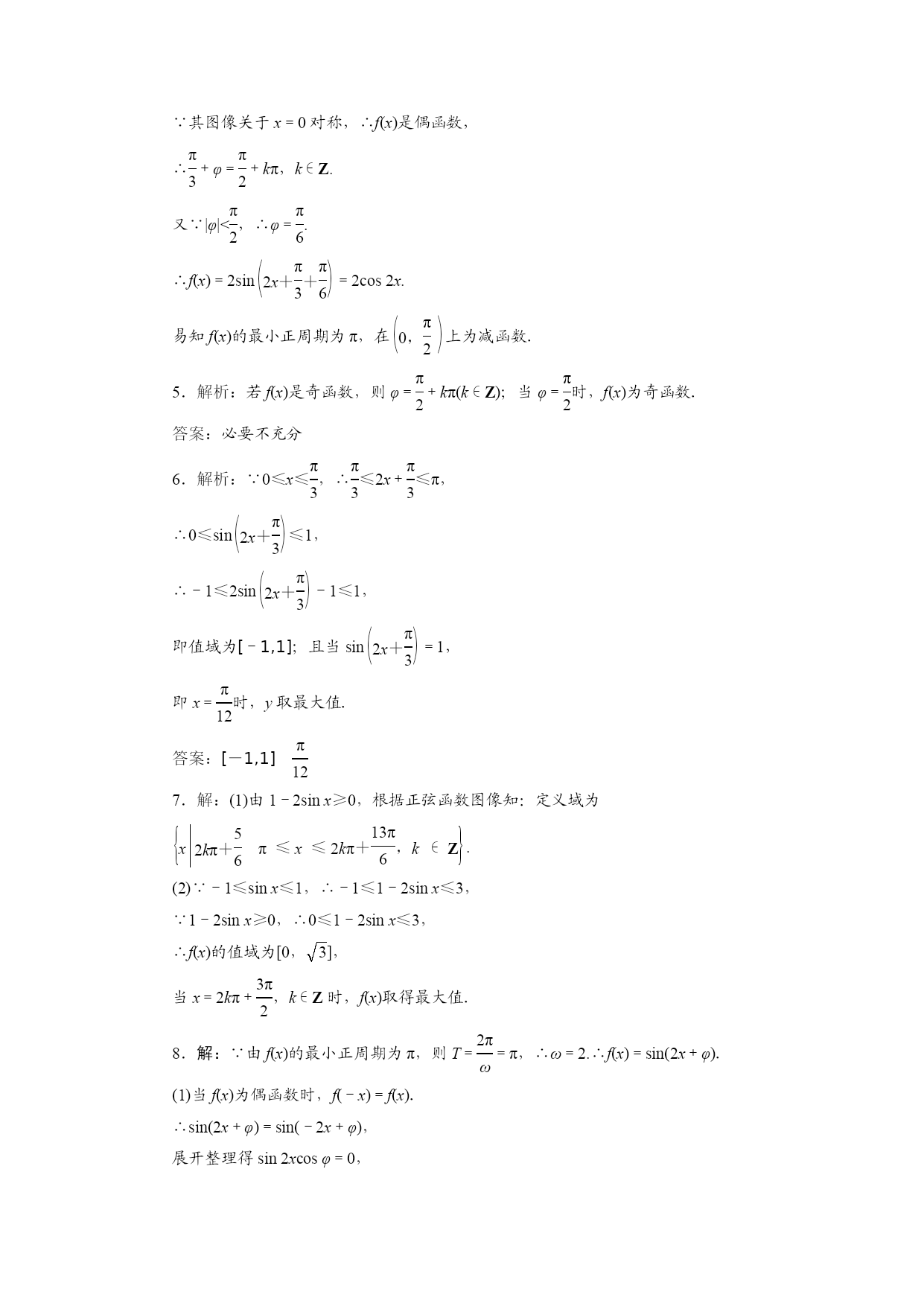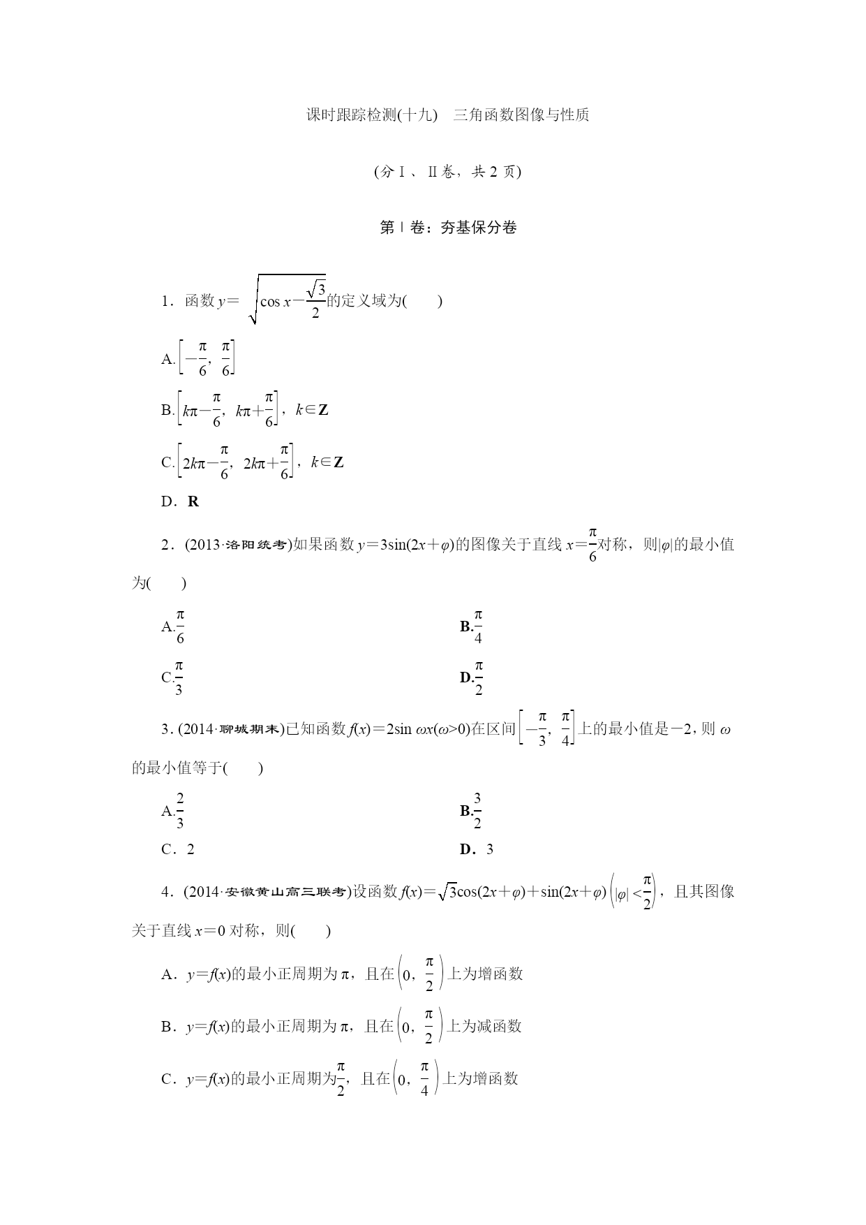 课时跟踪检测(十九)三角函数图像与性质 (分Ⅰ、Ⅱ卷,) 第Ⅰ卷:夯基保分卷 1.函数y=eq\r(cosx-\f(\r(3),2))的定义域为() A.eq\b\lc\[\rc\](\a\vs4\al\co1(-\f(π,6),\f(π,6))) B.eq\b\lc\[\rc\](\a\vs4\al\co1(kπ-\f(π,6),kπ+\f(π,6))),k∈Z C.eq\b\lc\[\rc\](\a\vs4\al\co1(2kπ-\f(π,6),2kπ+\f(π,6))),k∈Z D.R 2.(2013·洛阳统考)如果函数y=3sin(2x+φ)的图像关于直线x=eq\f(π,6)对称,则|φ|的最小值为() A.eq\f(π,6) B.eq\f(π,4) C.eq\f(π,3) D.eq\f(π,2) 3.(2014·聊城期末)已知函数f(x)=2sinωx(ω>0)在区间eq\b\lc\[\rc\](\a\vs4\al\co1(-\f(π,3),\f(π,4)))上的最小值是-2,则ω的最小值等于() A.eq\f(2,3) B.eq\f(3,2) C.2 D.3 4.(2014·安徽黄山高三联考)设函数f(x)=eq\r(3)cos(2x+φ)+sin(2x+φ)eq\b\lc\(\rc\)(\a\vs4\al\co1(|φ|<\f(π,2))),且其图像关于直线x=0对称,则() A.y=f(x)的最小正周期为π,且在eq\b\lc\(\rc\)(\a\vs4\al\co1(0,\f(π,2)))上为增函数 B.y=f(x)的最小正周期为π,且在eq\b\lc\(\rc\)(\a\vs4\al\co1(0,\f(π,2)))上为减函数 C.y=f(x)的最小正周期为eq\f(π,2),且在eq\b\lc\(\rc\)(\a\vs4\al\co1(0,\f(π,4)))上为增函数 D.y=f(x)的最小正周期为eq\f(π,2),且在eq\b\lc\(\rc\)(\a\vs4\al\co1(0,\f(π,4)))上为减函数 5.(2013·浙江高考改编)已知函数f(x)=Acos(ωx+φ)(A>0,ω>0,φ∈R),则“f(x)是奇函数”是“φ=eq\f(π,2)”的________条件. 6.函数y=2sineq\b\lc\(\rc\)(\a\vs4\al\co1(2x+\f(π,3)))-1,x∈eq\b\lc\[\rc\](\a\vs4\al\co1(0,\f(π,3)))的值域为________,并且取最大值时x的值为________. 7.设f(x)=eq\r(1-2sinx). (1)求f(x)的定义域; (2)求f(x)的值域及取最大值时x的值. 8.已知函数f(x)=sin(ωx+φ)eq\b\lc\(\rc\)(\a\vs4\al\co1(0<φ<\f(2π,3)))的最小正周期为π. (1)求当f(x)为偶函数时φ的值; (2)若f(x)的图像过点eq\b\lc\(\rc\)(\a\vs4\al\co1(\f(π,6),\f(\r(3),2))),求f(x)的单调递增区间. 第Ⅱ卷:提能增分卷 1.(2013·福州质检)已知函数f(x)=sinx+cosx,x∈R. (1)求feq\b\lc\(\rc\)(\a\vs4\al\co1(\f(π,12)))的值; (2)试写出一个函数g(x),使得g(x)f(x)=cos2x,并求g(x)的单调区间. 2.eq\a\vs4\al(创新题)设函数f(x)=sineq\b\lc\(\rc\)(\a\vs4\al\co1(\f(πx,3)-\f(π,6)))-2cos2eq\f(πx,6). (1)求y=f(x)的最小正周期及单调递增区间; (2)若函数y=g(x)与y=f(x)的图像关于直线x=2对称,求当x∈[0,1]时,函数y=g(x)的最大值. 3.已知a>0,函数f(x)=-2asineq\b\lc\(\rc\)(\a\vs4\al\co1(2x+\f(π,6)))+2a+b,当x∈eq\b\lc\[\rc\](\a\vs4\al\co1(0,\f(π,2)))时,-5≤f(x)≤1. (1)求常数a,b的值; (2)设g(x)=feq\b\lc\(\rc\)(\a\vs4\al\co1(x+\f(π,2)))且lgg(x)>0,求g(x)的单调区间. 答案 第Ⅰ卷:夯基保分卷 1.选C