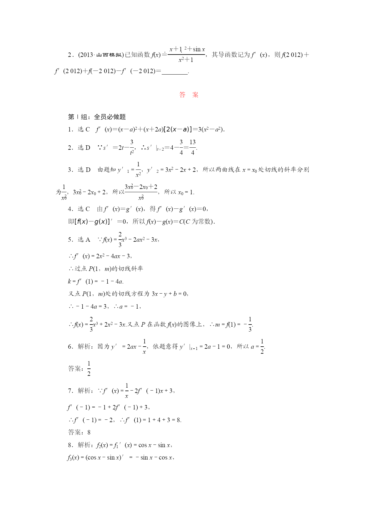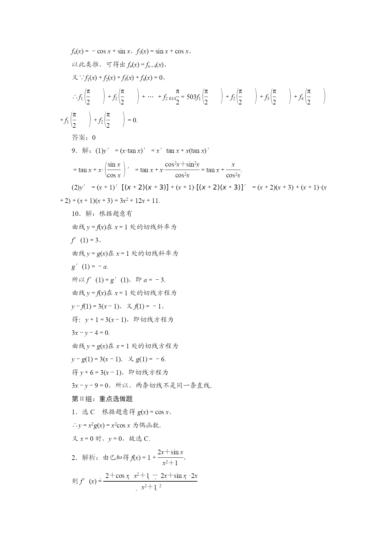 课时跟踪检测(十三)变化率与导数、导数的计算 第Ⅰ组:全员必做题 1.函数f(x)=(x+2a)(x-a)2的导数为() A.2(x2-a2) B.2(x2+a2) C.3(x2-a2) D.3(x2+a2) 2.已知物体的运动方程为s=t2+eq\f(3,t)(t是时间,s是位移),则物体在时刻t=2时的速度为() A.eq\f(19,4) B.eq\f(17,4) C.eq\f(15,4) D.eq\f(13,4) 3.(2014·济南模拟)已知曲线y1=2-eq\f(1,x)与y2=x3-x2+2x在x=x0处切线的斜率的乘积为3,则x0的值为() A.-2 B.2 C.eq\f(1,2) D.1 4.已知f(x)与g(x)是定义在R上的两个可导函数,若f(x),g(x)满足f′(x)=g′(x),则f(x)与g(x)满足() A.f(x)=g(x) B.f(x)=g(x)=0 C.f(x)-g(x)为常数函数 D.f(x)+g(x)为常数函数 5.已知函数f(x)=eq\f(2,3)x3-2ax2-3x(a∈R),若函数f(x)的图像上点P(1,m)处的切线方程为3x-y+b=0,则m的值为() A.-eq\f(1,3) B.-eq\f(1,2) C.eq\f(1,3) D.eq\f(1,2) 6.(2013·广东高考)若曲线y=ax2-lnx在点(1,a)处的切线平行于x轴,则a=________. 7.已知函数f(x)=lnx-f′(-1)x2+3x-4,则f′(1)=________. 8.已知f1(x)=sinx+cosx,记f2(x)=f1′(x),f3(x)=f2′(x),…,fn(x)=fn-1′(x)(n∈N+,n≥2),则f1eq\b\lc\(\rc\)(\a\vs4\al\co1(\f(π,2)))+f2eq\b\lc\(\rc\)(\a\vs4\al\co1(\f(π,2)))+…+f2014eq\b\lc\(\rc\)(\a\vs4\al\co1(\f(π,2)))=________. 9.求下列函数的导数. (1)y=x·tanx; (2)y=(x+1)(x+2)(x+3). 10.已知函数f(x)=x-eq\f(2,x),g(x)=a(2-lnx)(a>0).若曲线y=f(x)与曲线y=g(x)在x=1处的切线斜率相同,求a的值,并判断两条切线是否为同一条直线. 第Ⅱ组:重点选做题 1.(2014·东营一模)设曲线y=sinx上任一点(x,y)处切线的斜率为g(x),则函数y=x2g(x)的部分图像可以为() 2.(2013·山西模拟)已知函数f(x)=eq\f(x+12+sinx,x2+1),其导函数记为f′(x),则f(2012)+f′(2012)+f(-2012)-f′(-2012)=________. 答案 第Ⅰ组:全员必做题 1.选Cf′(x)=(x-a)2+(x+2a)[2(x-a)]=3(x2-a2). 2.选D∵s′=2t-eq\f(3,t2),∴s′|t=2=4-eq\f(3,4)=eq\f(13,4). 3.选D由题知y′1=eq\f(1,x2),y′2=3x2-2x+2,所以两曲线在x=x0处切线的斜率分别为eq\f(1,x\o\al(2,0)),3xeq\o\al(2,0)-2x0+2,所以eq\f(3x\o\al(2,0)-2x0+2,x\o\al(2,0)),所以x0=1. 4.选C由f′(x)=g′(x),得f′(x)-g′(x)=0, 即[f(x)-g(x)]′=0,所以f(x)-g(x)=C(C为常数). 5.选A∵f(x)=eq\f(2,3)x3-2ax2-3x, ∴f′(x)=2x2-4ax-3, ∴过点P(1,m)的切线斜率 k=f′(1)=-1-4a. 又点P(1,m)处的切线方程为3x-y+b=0, ∴-1-4a=3,∴a=-1, ∴f(x)=eq\f(2,3)x3+2x2-3x.又点P在函数f(x)的图像上,∴m=f(1)=-eq\f(1,3). 6.解析:因为y′=2ax-eq\f(1,x),依题意得y′|x=1=2a-1=0,所以a=eq\f(1,2). 答案:eq\f(1,2) 7.解析:∵f′(x)=eq\f(1,x)-2f′(-1)x+3, f′(-1)=-1+2f′(-1)+3, ∴f′(-1)=-2,∴f′(1)=1+4+3=8. 答案:8 8.解析:f2(x)=f1′(x)=cosx-sinx,
