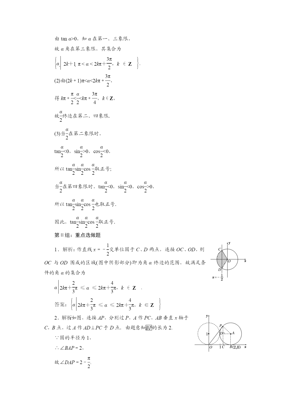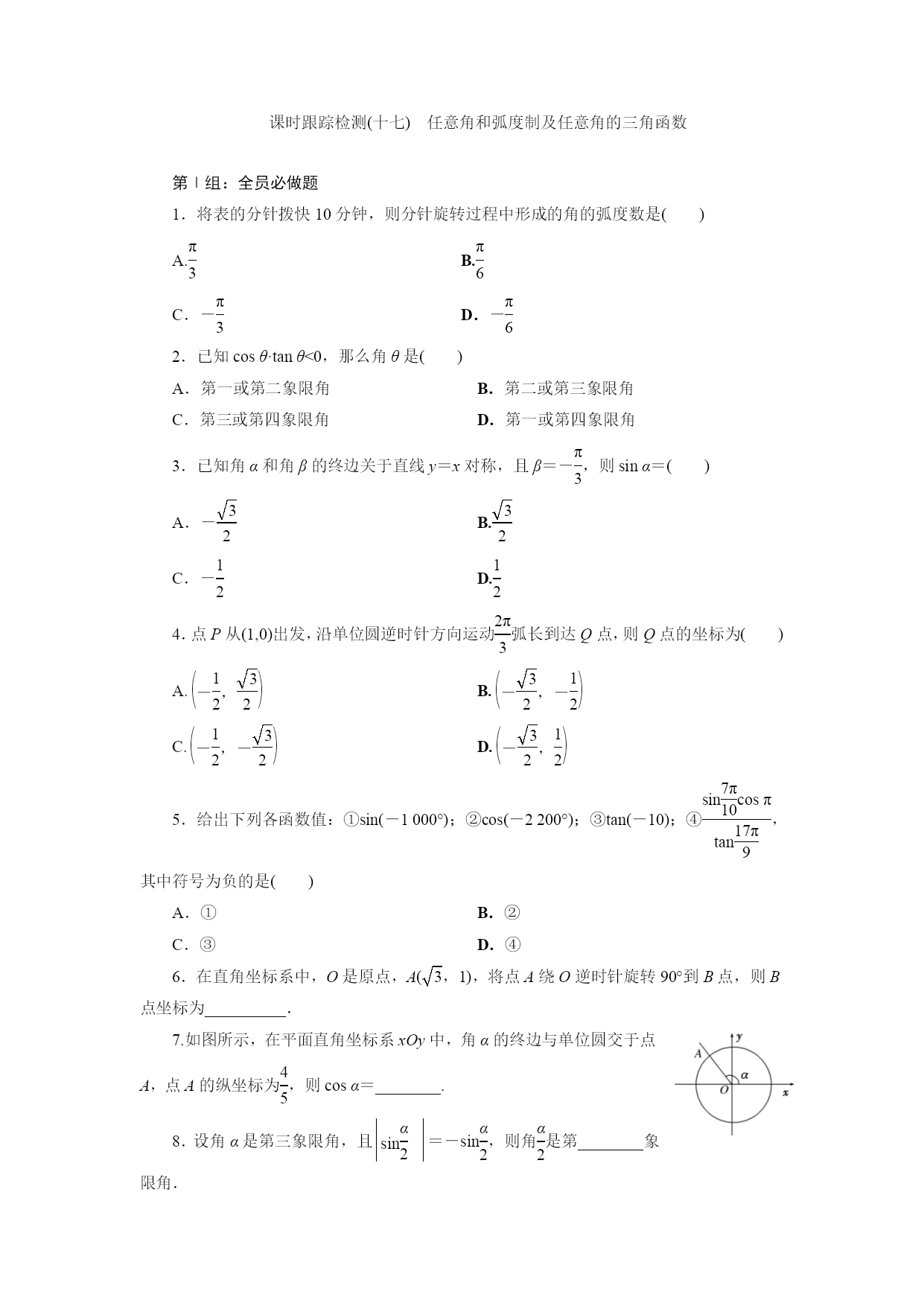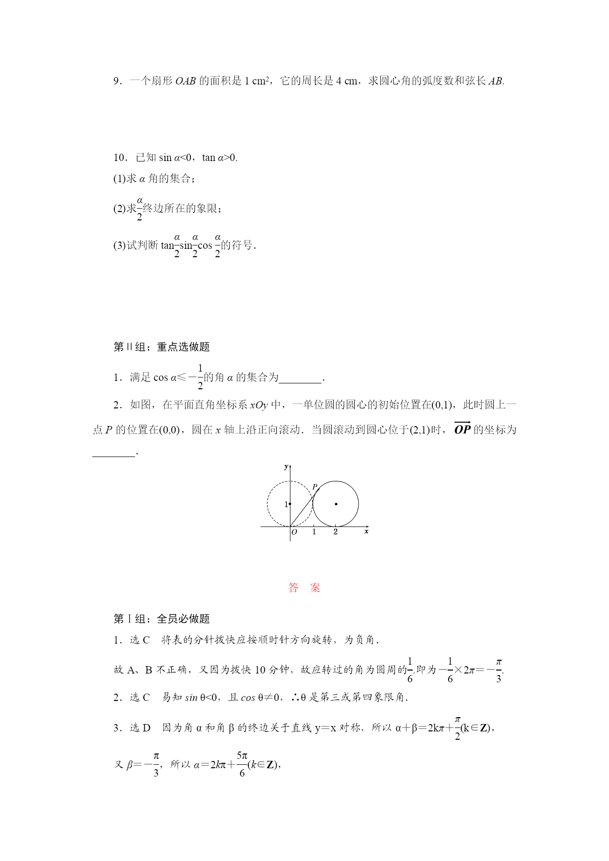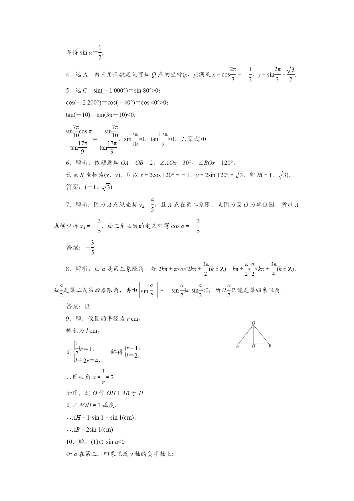 课时跟踪检测(十七)任意角和弧度制及任意角的三角函数 第Ⅰ组:全员必做题 1.将表的分针拨快10分钟,则分针旋转过程中形成的角的弧度数是() A.eq\f(π,3) B.eq\f(π,6) C.-eq\f(π,3) D.-eq\f(π,6) 2.已知cosθ·tanθ<0,那么角θ是() A.第一或第二象限角 B.第二或第三象限角 C.第三或第四象限角 D.第一或第四象限角 3.已知角α和角β的终边关于直线y=x对称,且β=-eq\f(π,3),则sinα=() A.-eq\f(\r(3),2) B.eq\f(\r(3),2) C.-eq\f(1,2) D.eq\f(1,2) 4.点P从(1,0)出发,沿单位圆逆时针方向运动eq\f(2π,3)弧长到达Q点,则Q点的坐标为() A.eq\b\lc\(\rc\)(\a\vs4\al\co1(-\f(1,2),\f(\r(3),2))) B.eq\b\lc\(\rc\)(\a\vs4\al\co1(-\f(\r(3),2),-\f(1,2))) C.eq\b\lc\(\rc\)(\a\vs4\al\co1(-\f(1,2),-\f(\r(3),2))) D.eq\b\lc\(\rc\)(\a\vs4\al\co1(-\f(\r(3),2),\f(1,2))) 5.给出下列各函数值:①sin(-1000°);②cos(-2200°);③tan(-10);④eq\f(sin\f(7π,10)cosπ,tan\f(17π,9)),其中符号为负的是() A.① B.② C.③ D.④ 6.在直角坐标系中,O是原点,A(eq\r(3),1),将点A绕O逆时针旋转90°到B点,则B点坐标为__________. 7.如图所示,在平面直角坐标系xOy中,角α的终边与单位圆交于点A,点A的纵坐标为eq\f(4,5),则cosα=________. 8.设角α是第三象限角,且eq\b\lc\|\rc\|(\a\vs4\al\co1(sin\f(α,2)))=-sineq\f(α,2),则角eq\f(α,2)是第________象限角. 9.一个扇形OAB的面积是1cm2,它的周长是4cm,求圆心角的弧度数和弦长AB. 10.已知sinα<0,tanα>0. (1)求α角的集合; (2)求eq\f(α,2)终边所在的象限; (3)试判断taneq\f(α,2)sineq\f(α,2)coseq\f(α,2)的符号. 第Ⅱ组:重点选做题 1.满足cosα≤-eq\f(1,2)的角α的集合为________. 2.如图,在平面直角坐标系xOy中,一单位圆的圆心的初始位置在(0,1),此时圆上一点P的位置在(0,0),圆在x轴上沿正向滚动.当圆滚动到圆心位于(2,1)时,的坐标为________. 答案 第Ⅰ组:全员必做题 1.选C将表的分针拨快应按顺时针方向旋转,为负角. 故A、B不正确,又因为拨快10分钟,故应转过的角为圆周的eq\f(1,6).即为-eq\f(1,6)×2π=-eq\f(π,3). 2.选C易知sinθ<0,且cosθ≠0,∴θ是第三或第四象限角. 3.选D因为角α和角β的终边关于直线y=x对称,所以α+β=2kπ+eq\f(π,2)(k∈Z), 又β=-eq\f(π,3),所以α=2kπ+eq\f(5π,6)(k∈Z), 即得sinα=eq\f(1,2). 4.选A由三角函数定义可知Q点的坐标(x,y)满足x=coseq\f(2π,3)=-eq\f(1,2),y=sineq\f(2π,3)=eq\f(\r(3),2). 5.选Csin(-1000°)=sin80°>0; cos(-2200°)=cos(-40°)=cos40°>0; tan(-10)=tan(3π-10)<0; eq\f(sin\f(7π,10)cosπ,tan\f(17π,9))=eq\f(-sin\f(7π,10),tan\f(17π,9)),sineq\f(7π,10)>0,taneq\f(17π,9)<0,∴原式>0. 6.解析:依题意知OA=OB=2,∠AOx=30°,∠BOx=120°, 设点B坐标为(x,y),所以x=2cos120°=-1,y=2sin120°=eq\r(3),即B(-1,eq\r(3)). 答案:(-1,eq\r(3)) 7.解析:因为A点纵坐标yA=eq\f(4,5),且A点在第二象限,又因为圆O为