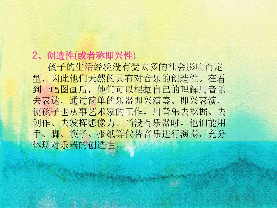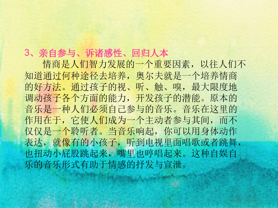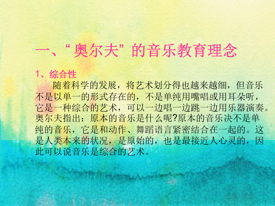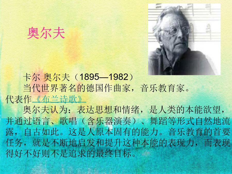 走进奥尔夫奥尔夫 卡尔奥尔夫(1895—1982) 当代世界著名的德国作曲家,音乐教育家。 代表作《布兰诗歌》 奥尔夫认为:表达思想和情绪,是人类的本能欲望,并通过语言、歌唱(含乐器演奏)、舞蹈等形式自然地流露,自古如此。这是人原本固有的能力。音乐教育的首要任务,就是不断地启发和提升这种本能的表现力,而表现得好不好则不是追求的最终目标。一、“奥尔夫”的音乐教育理念 1、综合性 随着科学的发展,将艺术划分得也越来越细,但音乐不是以单一的形式存在的,不是单纯用嘴唱或用耳朵听,它是一种综合的艺术,可以一边唱一边跳一边用乐器演奏。奥尔夫指出:原本的音乐是什么呢?原本的音乐决不是单纯的音乐,它是和动作、舞蹈语言紧密结合在一起的。这是人类本来的状况,是原始的,也是最接近人心灵的,因此可以说音乐是综合的艺术。2、创造性(或者称即兴性) 孩子的生活经验没有受太多的社会影响而定型,因此他们天然的具有对音乐的创造性。在看到一幅图画后,他们可以根据自己的理解用音乐去表达,通过简单的乐器即兴演奏、即兴表演,使孩子也从事艺术家的工作,用音乐去挖掘、去创作、去发挥想像力。当没有乐器时,他们能用手、脚、筷子、报纸等代替音乐进行演奏,充分体现对乐器的创造性。3、亲自参与、诉诸感性、回归人本 情商是人们智力发展的一个重要因素,以往人们不知道通过何种途径去培养,奥尔夫就是一个培养情商的好方法。通过孩子的视、听、触、嗅,最大限度地调动孩子各个方面的能力,开发孩子的潜能。原本的音乐是一种人们必须自己参与的音乐。音乐在这里的作用在于,它使人们成为一个主动者参与其间,而不仅仅是一个聆听者。当音乐响起,你可以用身体动作表达,就像有的小孩子,听到电视里面唱歌或者跳舞,也扭动小屁股跳起来,嘴里也哼唱起来。这种自娱自乐的音乐形式有助于情感的抒发与宣泄。4、从本土文化出发 奥尔夫的音乐教育思想及其教学方法,呈现一种开放性,这使得奥尔夫音乐教育体系在任何一个国家、民族的传播必然形成本土化。奥尔夫音乐重在理念,它没有规定一个标准的示范课程,他鼓励人们依照本国的文化,将他的音乐理念融入其中,这样虽然给教学带来一定难度,但也给各国的奥尔夫教育工作者提供了一个无限发展的空间。 从本土出发,中国的奥尔夫结合了本民族的文化、语言、民歌、童谣甚至是方言。这种音乐更被人们熟知,更为人们所接受,具有通俗性,人们更易懂。因此,各国的奥尔夫理念相同,却在具体内容上不同,不会使奥尔夫局限在某一时代、某一国家,而是不断创新,世世代代发展下去。扳落石头上高山(沪语) 你要啥 我要好 啥叫好 好宝宝 啥叫宝 宝塔山 啥叫山 山里有只大老虎 啥叫虎 花狸斑 啥叫斑 扳落石头上高山5、从儿童出发 音乐不是精英人才的专利品,在七种智能学说里面,提到可以通过艺术渠道对人进行培养。有些家长认为孩子没有音乐细胞,没必要对孩子进行音乐教育,这就大错特错了。艺术是每个人的本能。每个孩子都能感受和体验。 一个6岁以下的孩子,声带发育还不成熟,如果让孩子唱一个长音,他还唱不下来,有时出现唱歌唱不准的现象,也是正常的,但他的动作发展已经成熟,听觉也是成熟的,因此奥尔夫最适于孩子。让他们从小懂得节奏、韵律,了解音乐语言。节奏 是可以单独存在的。十六宫格图谱数个声部的相同旋律依次出现,交叉进行,互相模仿,互相追逐和缠绕,而声部几乎是单调意义上的重复。直到最后……最后的一个小结,最后的一个和弦,它们会融合在一起,永不分离。缠绵至极的音乐,就像两个人生死追随。5.舞蹈。这里指的舞蹈包括律动、表演等。同时,又都不能等同于有关艺术门类的专业概念,而具有“元素性”的含义。奥尔夫教学法所设计的舞蹈对于任何没有学过舞蹈的人也能学会。它所要求的是按音乐的节奏跳、按音乐的形象去想象,最重要的是即兴,学生们可以自由设计,自由编排自己理想的动作。球舞小鸟落落 6.音乐与美术。奥尔夫教学法经常把一首乐曲用美术图形表示。根据乐曲的旋律、力度、速度、重复等设计几种不同的符号把乐曲的结构明确地显示出来,形成一个极易看懂的图形谱。根据这个图形谱或说白或运用打击乐就能极方便而有效地为所学乐曲伴奏了。此方法多用于欣赏音乐。 7、游戏。奥尔夫教学法要求每一节课都是游戏。当然这种游戏不是单纯地玩,而是通过游戏学习音乐知识。它所设计的游戏都是具有音乐性的,都和音乐知识有机地结合在一起。8.创作。奥尔夫教学法让每个儿童把机器开动起来,积极参与创作。这里指的是“元素性”的创作,如一个节奏型、一个舞蹈动作、一个简单的固定音型,虽然总是比较简单、粗糙,但在孩子们眼里却是“我们自己的”。 9.戏剧。奥尔夫教学法把本民族的民谣、童话、民间故事等编成音乐舞蹈剧。也就是我们所说的小歌舞剧。当然,这里一切都是孩子们自己设计的,他们的创造精神在欢乐和愉悦的课堂气氛中得到发展。 10.欣