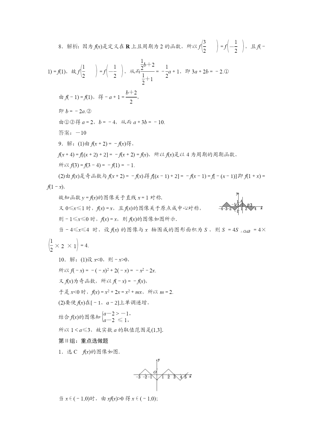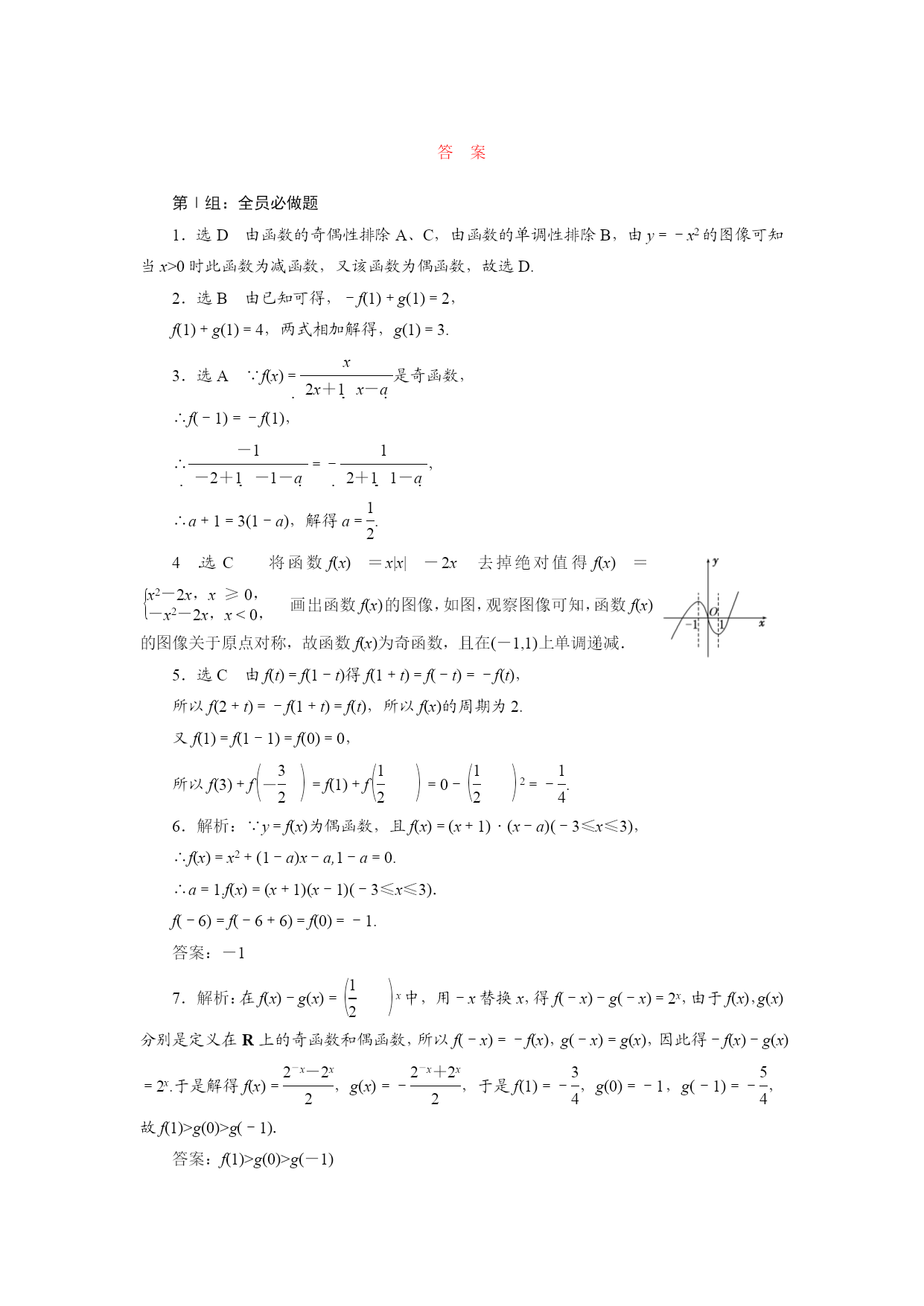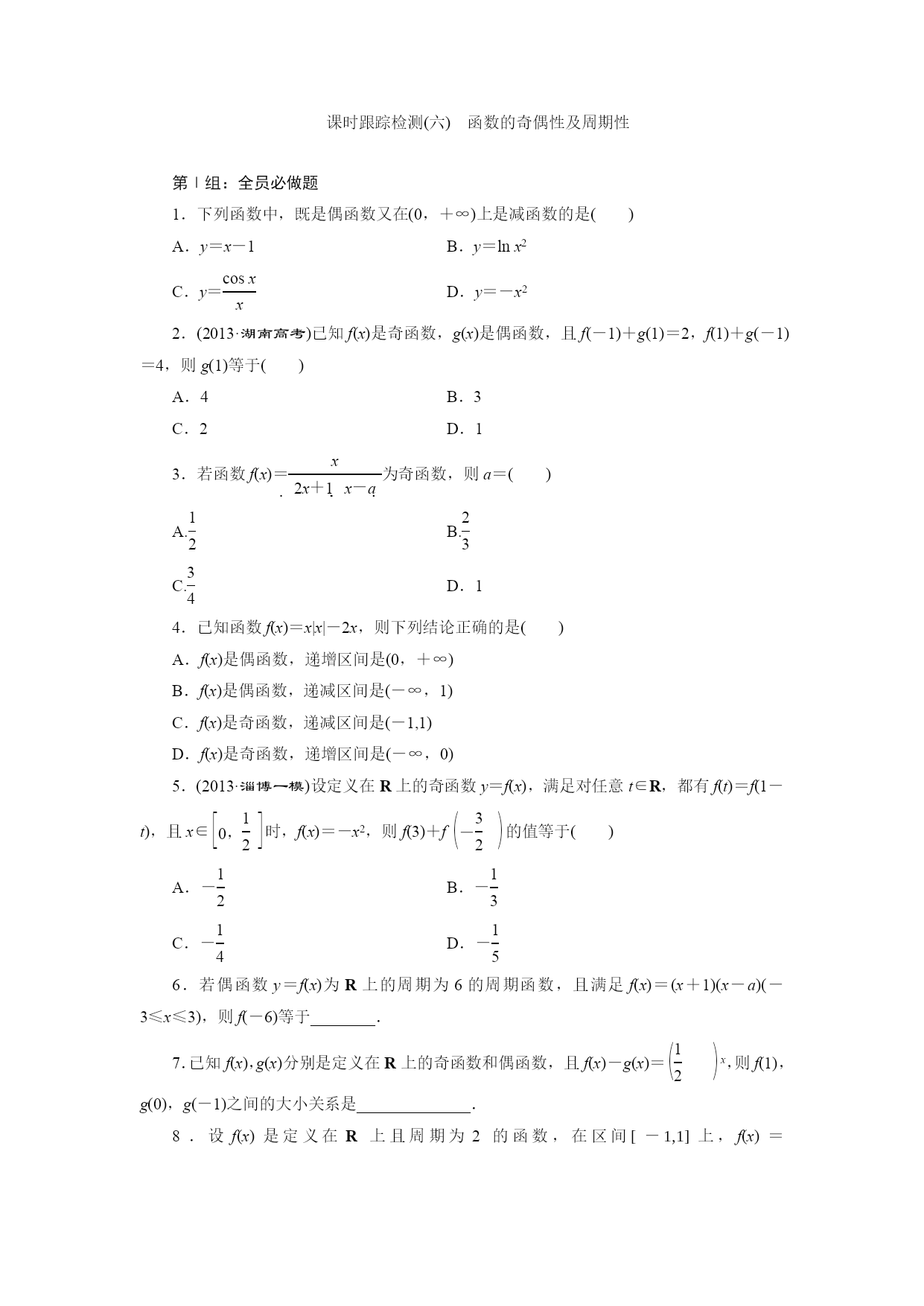 课时跟踪检测(六)函数的奇偶性及周期性 第Ⅰ组:全员必做题 1.下列函数中,既是偶函数又在(0,+∞)上是减函数的是() A.y=x-1 B.y=lnx2 C.y=eq\f(cosx,x) D.y=-x2 2.(2013·湖南高考)已知f(x)是奇函数,g(x)是偶函数,且f(-1)+g(1)=2,f(1)+g(-1)=4,则g(1)等于() A.4 B.3 C.2 D.1 3.若函数f(x)=eq\f(x,2x+1x-a)为奇函数,则a=() A.eq\f(1,2) B.eq\f(2,3) C.eq\f(3,4) D.1 4.已知函数f(x)=x|x|-2x,则下列结论正确的是() A.f(x)是偶函数,递增区间是(0,+∞) B.f(x)是偶函数,递减区间是(-∞,1) C.f(x)是奇函数,递减区间是(-1,1) D.f(x)是奇函数,递增区间是(-∞,0) 5.(2013·淄博一模)设定义在R上的奇函数y=f(x),满足对任意t∈R,都有f(t)=f(1-t),且x∈eq\b\lc\[\rc\](\a\vs4\al\co1(0,\f(1,2)))时,f(x)=-x2,则f(3)+feq\b\lc\(\rc\)(\a\vs4\al\co1(-\f(3,2)))的值等于() A.-eq\f(1,2) B.-eq\f(1,3) C.-eq\f(1,4) D.-eq\f(1,5) 6.若偶函数y=f(x)为R上的周期为6的周期函数,且满足f(x)=(x+1)(x-a)(-3≤x≤3),则f(-6)等于________. 7.已知f(x),g(x)分别是定义在R上的奇函数和偶函数,且f(x)-g(x)=eq\b\lc\(\rc\)(\a\vs4\al\co1(\f(1,2)))x,则f(1),g(0),g(-1)之间的大小关系是______________. 8.设f(x)是定义在R上且周期为2的函数,在区间[-1,1]上,f(x)=eq\b\lc\{\rc\(\a\vs4\al\co1(ax+1,-1≤x<0,,\f(bx+2,x+1),0≤x≤1,))其中a,b∈R.若feq\b\lc\(\rc\)(\a\vs4\al\co1(\f(1,2)))=feq\b\lc\(\rc\)(\a\vs4\al\co1(\f(3,2))),则a+3b的值为________. 9.设f(x)是(-∞,+∞)上的奇函数,f(x+2)=-f(x), 当0≤x≤1时,f(x)=x. (1)求f(3)的值; (2)当-4≤x≤4时,求f(x)的图像与x轴所围成图形的面积. 10.已知函数f(x)=eq\b\lc\{\rc\(\a\vs4\al\co1(-x2+2x,x>0,,0,x=0,,x2+mx,x<0))是奇函数. (1)求实数m的值; (2)若函数f(x)在区间[-1,a-2]上单调递增,求实数a的取值范围. 第Ⅱ组:重点选做题 1.函数f(x)是周期为4的偶函数,当x∈[0,2]时,f(x)=x-1,则不等式xf(x)>0在[-1,3]上的解集为() A.(1,3) B.(-1,1) C.(-1,0)∪(1,3) D.(-1,0)∪(0,1) 2.设函数f(x)是定义在R上的偶函数,且对任意的x∈R恒有f(x+1)=f(x-1),已知当x∈[0,1]时,f(x)=eq\b\lc\(\rc\)(\a\vs4\al\co1(\f(1,2)))1-x,则: ①2是函数f(x)的周期; ②函数f(x)在(1,2)上递减,在(2,3)上递增; ③函数f(x)的最大值是1,最小值是0; ④当x∈(3,4)时,f(x)=eq\b\lc\(\rc\)(\a\vs4\al\co1(\f(1,2)))x-3. 其中所有正确命题的序号是________. 答案 第Ⅰ组:全员必做题 1.选D由函数的奇偶性排除A、C,由函数的单调性排除B,由y=-x2的图像可知当x>0时此函数为减函数,又该函数为偶函数,故选D. 2.选B由已知可得,-f(1)+g(1)=2, f(1)+g(1)=4,两式相加解得,g(1)=3. 3.选A∵f(x)=eq\f(x,2x+1x-a)是奇函数, ∴f(-1)=-f(1), ∴eq\f(-1,-2+1-1-a)=-eq\f(1,2+11-a), ∴a+1=3(1-a),解得a=eq\f(1,2). 4.选C将函数f(x)=x|x|-2x去掉绝对值得f(x)=eq\b\lc\{\rc\(\a\vs4\al\co1(x2-2x,x≥0,,-x2-2x,