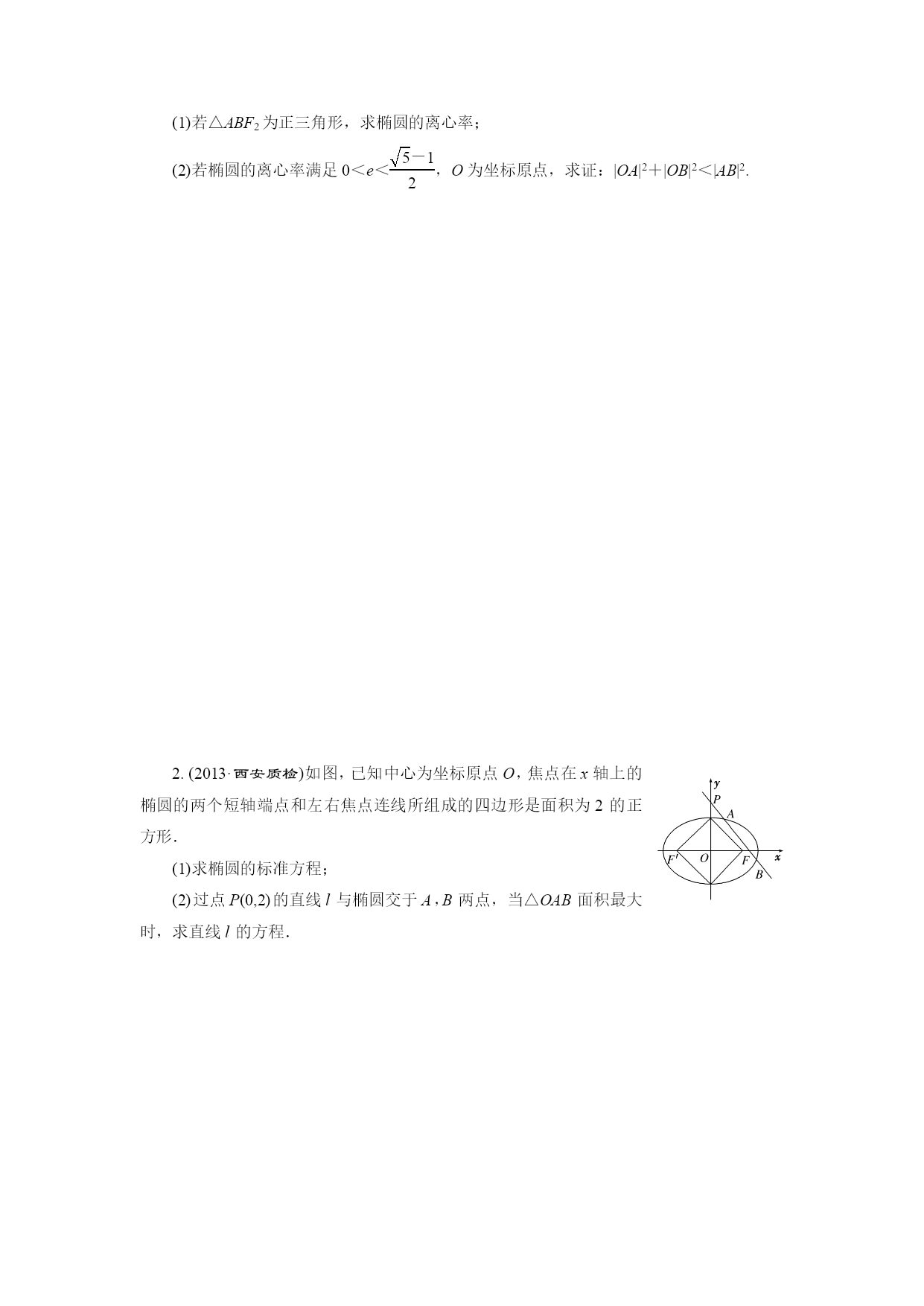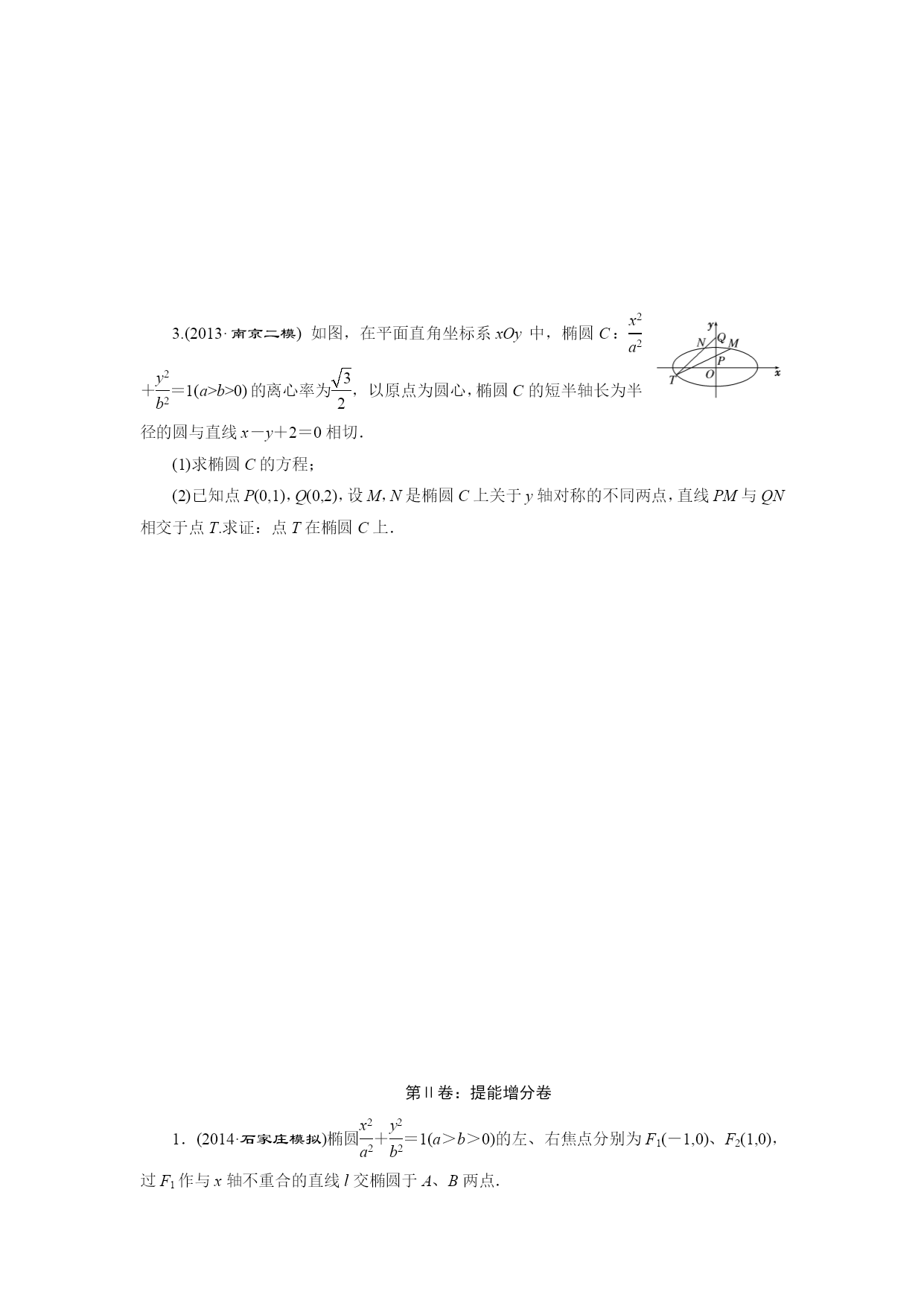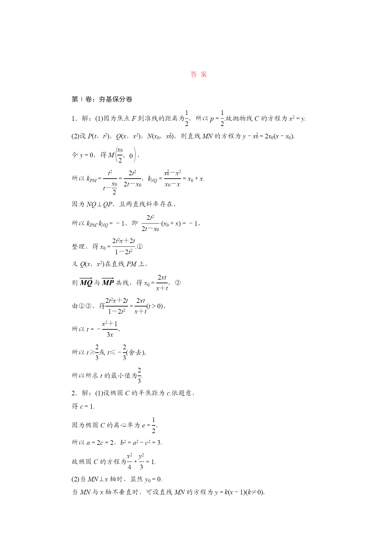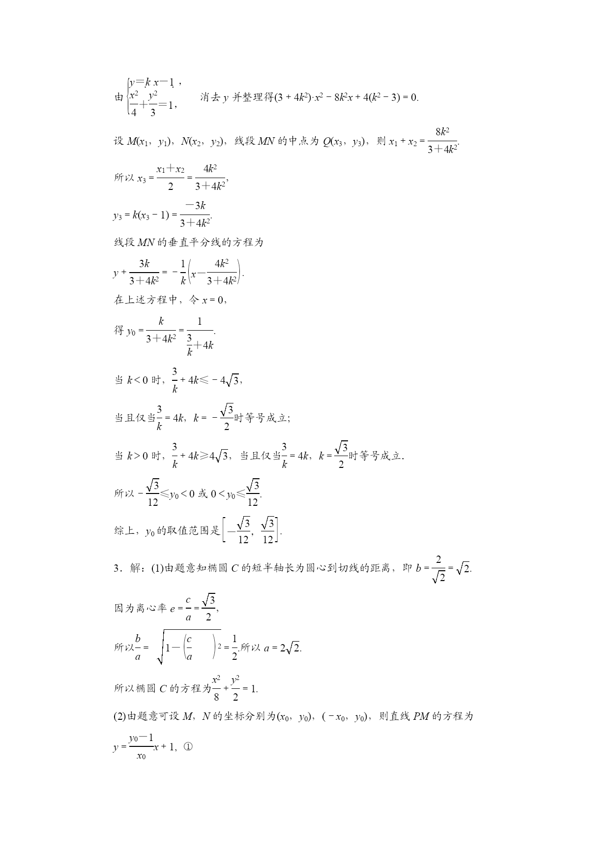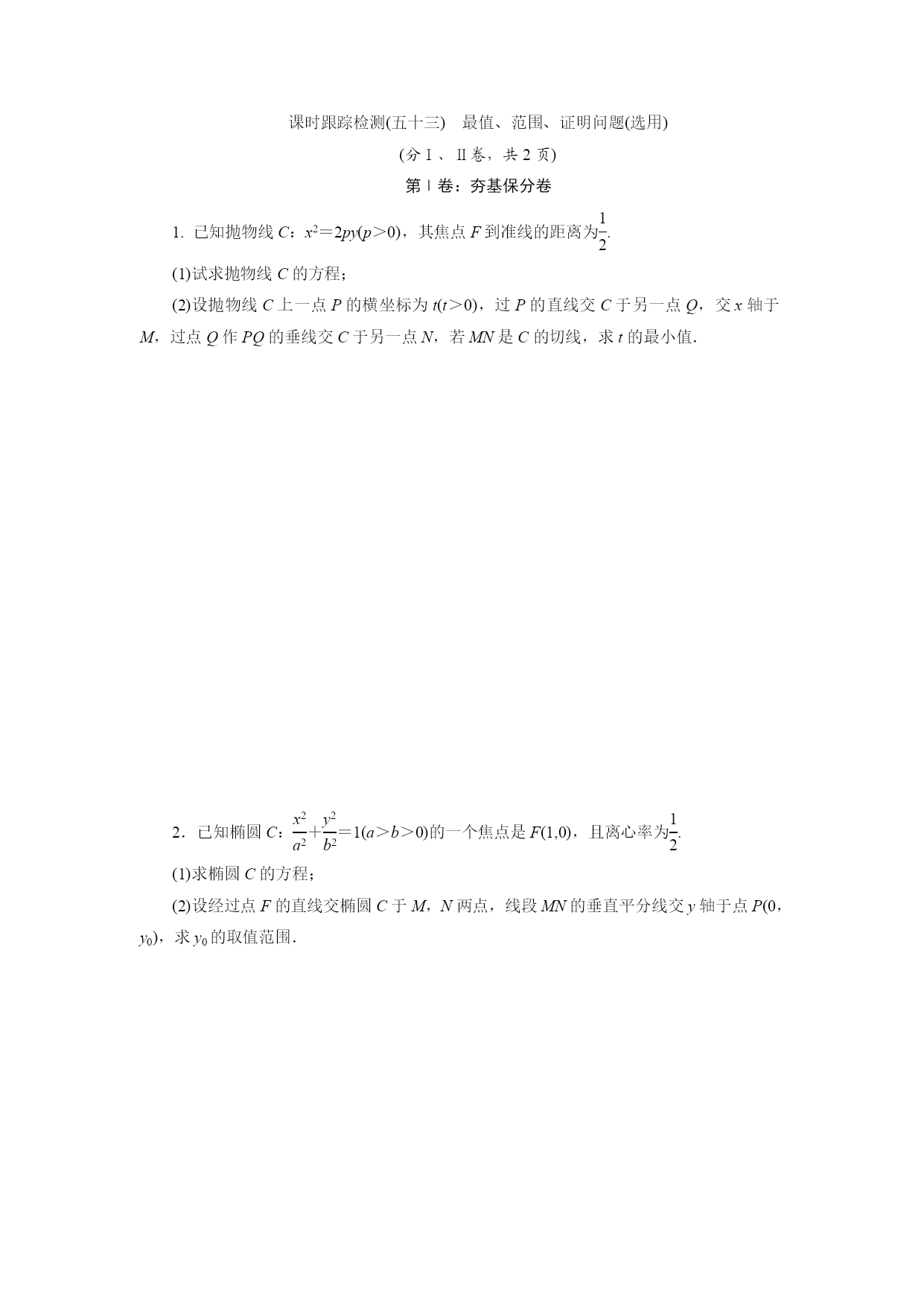 课时跟踪检测(五十三)最值、范围、证明问题(选用) (分Ⅰ、Ⅱ卷,) 第Ⅰ卷:夯基保分卷 1.已知抛物线C:x2=2py(p>0),其焦点F到准线的距离为eq\f(1,2). (1)试求抛物线C的方程; (2)设抛物线C上一点P的横坐标为t(t>0),过P的直线交C于另一点Q,交x轴于M,过点Q作PQ的垂线交C于另一点N,若MN是C的切线,求t的最小值. 2.已知椭圆C:eq\f(x2,a2)+eq\f(y2,b2)=1(a>b>0)的一个焦点是F(1,0),且离心率为eq\f(1,2). (1)求椭圆C的方程; (2)设经过点F的直线交椭圆C于M,N两点,线段MN的垂直平分线交y轴于点P(0,y0),求y0的取值范围. 3.(2013·南京二模)如图,在平面直角坐标系xOy中,椭圆C:eq\f(x2,a2)+eq\f(y2,b2)=1(a>b>0)的离心率为eq\f(\r(3),2),以原点为圆心,椭圆C的短半轴长为半径的圆与直线x-y+2=0相切. (1)求椭圆C的方程; (2)已知点P(0,1),Q(0,2),设M,N是椭圆C上关于y轴对称的不同两点,直线PM与QN相交于点T.求证:点T在椭圆C上. 第Ⅱ卷:提能增分卷 1.(2014·石家庄模拟)椭圆eq\f(x2,a2)+eq\f(y2,b2)=1(a>b>0)的左、右焦点分别为F1(-1,0)、F2(1,0),过F1作与x轴不重合的直线l交椭圆于A、B两点. (1)若△ABF2为正三角形,求椭圆的离心率; (2)若椭圆的离心率满足0<e<eq\f(\r(5)-1,2),O为坐标原点,求证:|OA|2+|OB|2<|AB|2. 2.(2013·西安质检)如图,已知中心为坐标原点O,焦点在x轴上的椭圆的两个短轴端点和左右焦点连线所组成的四边形是面积为2的正方形. (1)求椭圆的标准方程; (2)过点P(0,2)的直线l与椭圆交于A,B两点,当△OAB面积最大时,求直线l的方程. 答案 第Ⅰ卷:夯基保分卷 1.解:(1)因为焦点F到准线的距离为eq\f(1,2),所以p=eq\f(1,2).故抛物线C的方程为x2=y. (2)设P(t,t2),Q(x,x2),N(x0,xeq\o\al(2,0)),则直线MN的方程为y-xeq\o\al(2,0)=2x0(x-x0). 令y=0,得Meq\b\lc\(\rc\)(\a\vs4\al\co1(\f(x0,2),0)), 所以kPM=eq\f(t2,t-\f(x0,2))=eq\f(2t2,2t-x0),kNQ=eq\f(x\o\al(2,0)-x2,x0-x)=x0+x. 因为NQ⊥QP,且两直线斜率存在, 所以kPM·kNQ=-1,即eq\f(2t2,2t-x0)·(x0+x)=-1, 整理,得x0=eq\f(2t2x+2t,1-2t2).① 又Q(x,x2)在直线PM上, 则与共线,得x0=eq\f(2xt,x+t),② 由①②,得eq\f(2t2x+2t,1-2t2)=eq\f(2xt,x+t)(t>0), 所以t=-eq\f(x2+1,3x), 所以t≥eq\f(2,3)或t≤-eq\f(2,3)(舍去). 所以所求t的最小值为eq\f(2,3). 2.解:(1)设椭圆C的半焦距为c.依题意, 得c=1. 因为椭圆C的离心率为e=eq\f(1,2), 所以a=2c=2,b2=a2-c2=3. 故椭圆C的方程为eq\f(x2,4)+eq\f(y2,3)=1. (2)当MN⊥x轴时,显然y0=0. 当MN与x轴不垂直时,可设直线MN的方程为y=k(x-1)(k≠0). 由eq\b\lc\{\rc\(\a\vs4\al\co1(y=kx-1,,\f(x2,4)+\f(y2,3)=1,))消去y并整理得(3+4k2)·x2-8k2x+4(k2-3)=0. 设M(x1,y1),N(x2,y2),线段MN的中点为Q(x3,y3),则x1+x2=eq\f(8k2,3+4k2). 所以x3=eq\f(x1+x2,2)=eq\f(4k2,3+4k2), y3=k(x3-1)=eq\f(-3k,3+4k2). 线段MN的垂直平分线的方程为 y+eq\f(3k,3+4k2)=-eq\f(1,k)eq\b\lc\(\rc\)(\a\vs4\al\co1(x-