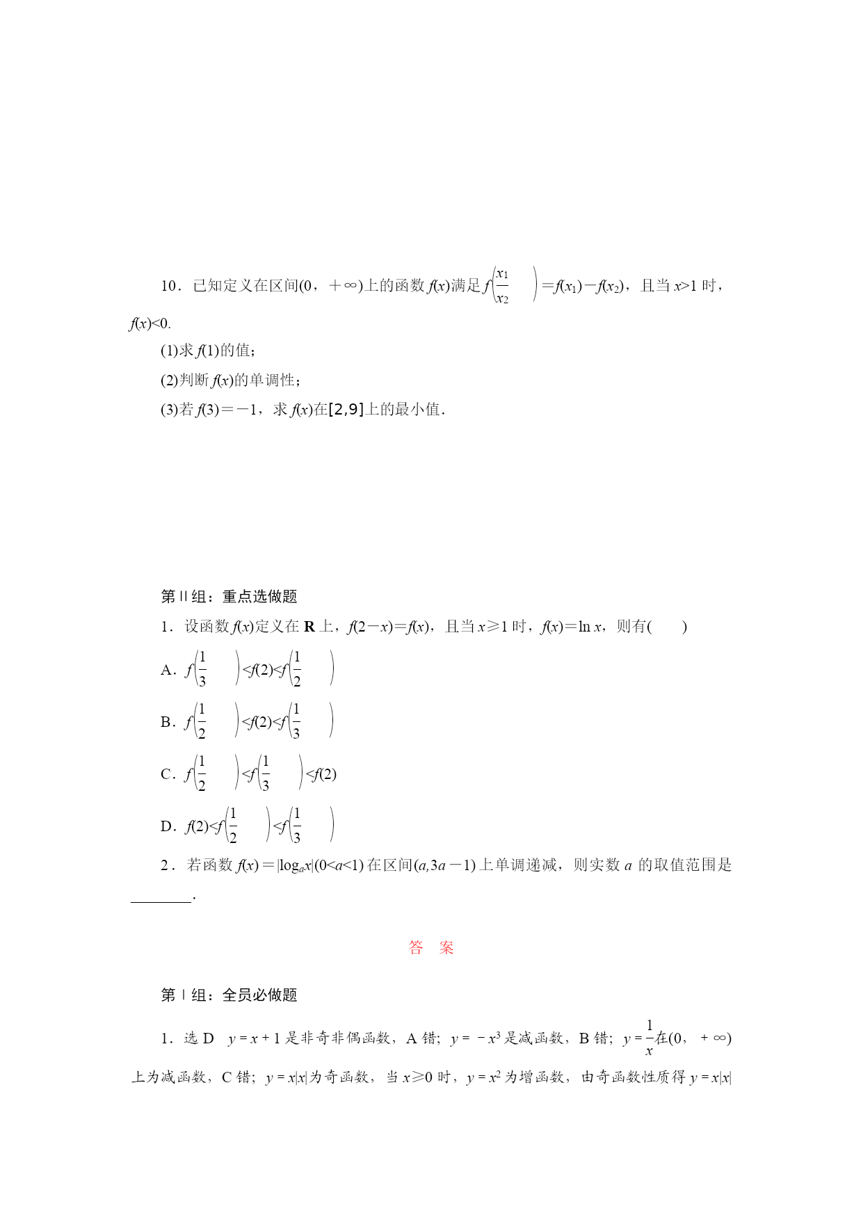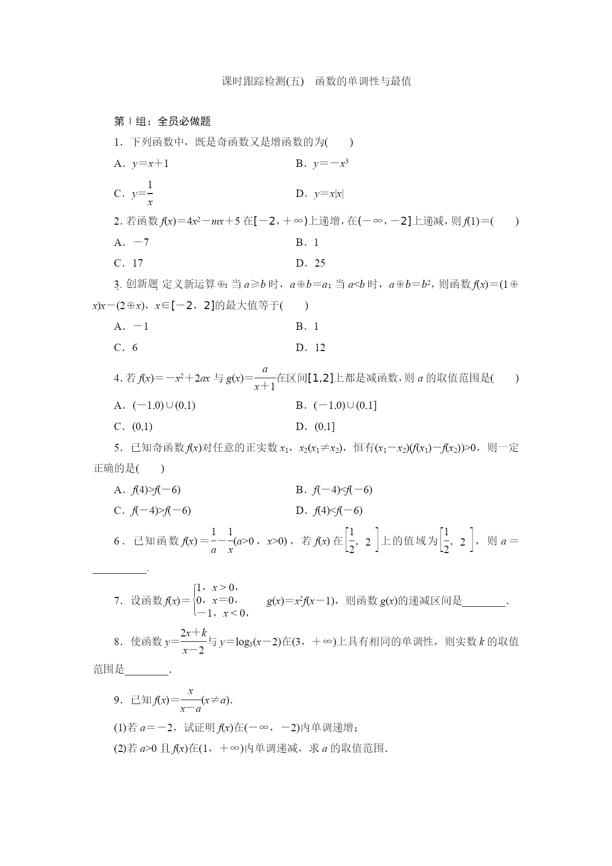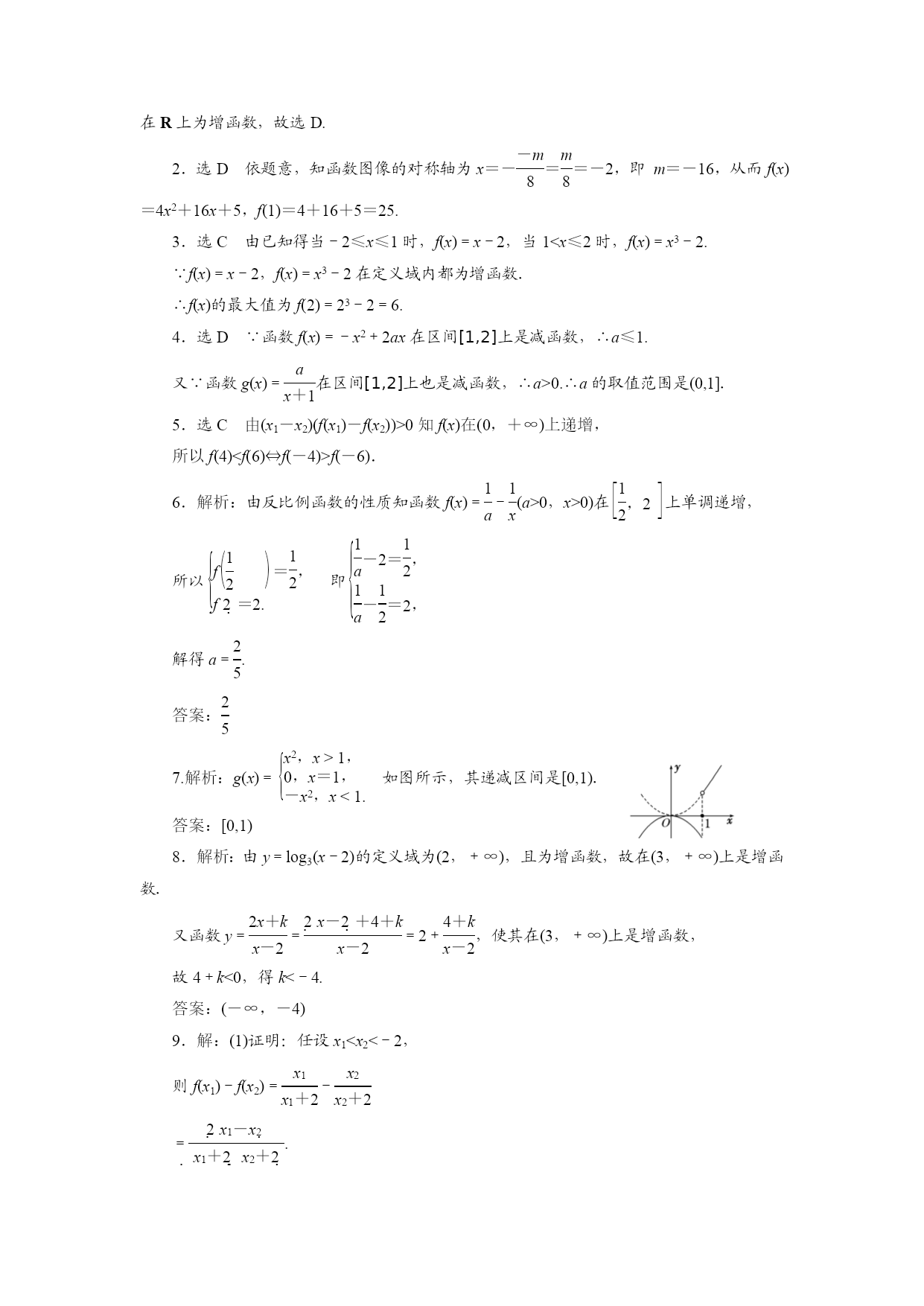 课时跟踪检测(五)函数的单调性与最值 第Ⅰ组:全员必做题 1.下列函数中,既是奇函数又是增函数的为() A.y=x+1 B.y=-x3 C.y=eq\f(1,x) D.y=x|x| 2.若函数f(x)=4x2-mx+5在[-2,+∞)上递增,在(-∞,-2]上递减,则f(1)=() A.-7 B.1 C.17 D.25 3.eq\a\vs4\al(创新题)定义新运算⊕:当a≥b时,a⊕b=a;当a<b时,a⊕b=b2,则函数f(x)=(1⊕x)x-(2⊕x),x∈[-2,2]的最大值等于() A.-1 B.1 C.6 D.12 4.若f(x)=-x2+2ax与g(x)=eq\f(a,x+1)在区间[1,2]上都是减函数,则a的取值范围是() A.(-1,0)∪(0,1) B.(-1,0)∪(0,1] C.(0,1) D.(0,1] 5.已知奇函数f(x)对任意的正实数x1,x2(x1≠x2),恒有(x1-x2)(f(x1)-f(x2))>0,则一定正确的是() A.f(4)>f(-6) B.f(-4)<f(-6) C.f(-4)>f(-6) D.f(4)<f(-6) 6.已知函数f(x)=eq\f(1,a)-eq\f(1,x)(a>0,x>0),若f(x)在eq\b\lc\[\rc\](\a\vs4\al\co1(\f(1,2),2))上的值域为eq\b\lc\[\rc\](\a\vs4\al\co1(\f(1,2),2)),则a=__________. 7.设函数f(x)=eq\b\lc\{\rc\(\a\vs4\al\co1(1,x>0,,0,x=0,,-1,x<0,))g(x)=x2f(x-1),则函数g(x)的递减区间是________. 8.使函数y=eq\f(2x+k,x-2)与y=log3(x-2)在(3,+∞)上具有相同的单调性,则实数k的取值范围是________. 9.已知f(x)=eq\f(x,x-a)(x≠a). (1)若a=-2,试证明f(x)在(-∞,-2)内单调递增; (2)若a>0且f(x)在(1,+∞)内单调递减,求a的取值范围. 10.已知定义在区间(0,+∞)上的函数f(x)满足feq\b\lc\(\rc\)(\a\vs4\al\co1(\f(x1,x2)))=f(x1)-f(x2),且当x>1时,f(x)<0. (1)求f(1)的值; (2)判断f(x)的单调性; (3)若f(3)=-1,求f(x)在[2,9]上的最小值. 第Ⅱ组:重点选做题 1.设函数f(x)定义在R上,f(2-x)=f(x),且当x≥1时,f(x)=lnx,则有() A.feq\b\lc\(\rc\)(\a\vs4\al\co1(\f(1,3)))<f(2)<feq\b\lc\(\rc\)(\a\vs4\al\co1(\f(1,2))) B.feq\b\lc\(\rc\)(\a\vs4\al\co1(\f(1,2)))<f(2)<feq\b\lc\(\rc\)(\a\vs4\al\co1(\f(1,3))) C.feq\b\lc\(\rc\)(\a\vs4\al\co1(\f(1,2)))<feq\b\lc\(\rc\)(\a\vs4\al\co1(\f(1,3)))<f(2) D.f(2)<feq\b\lc\(\rc\)(\a\vs4\al\co1(\f(1,2)))<feq\b\lc\(\rc\)(\a\vs4\al\co1(\f(1,3))) 2.若函数f(x)=|logax|(0<a<1)在区间(a,3a-1)上单调递减,则实数a的取值范围是________. 答案 第Ⅰ组:全员必做题 1.选Dy=x+1是非奇非偶函数,A错;y=-x3是减函数,B错;y=eq\f(1,x)在(0,+∞)上为减函数,C错;y=x|x|为奇函数,当x≥0时,y=x2为增函数,由奇函数性质得y=x|x|在R上为增函数,故选D. 2.选D依题意,知函数图像的对称轴为x=-eq\f(-m,8)=eq\f(m,8)=-2,即m=-16,从而f(x)=4x2+16x+5,f(1)=4+16+5=25. 3.选C由已知得当-2≤x≤1时,f(x)=x-2,当1<x≤2时,f(x)=x3-2. ∵f(x)=x-2,f(x)=x3-2在定义域内都为增函数. ∴f(x)的最大值为f(2)=23-2=6. 4.选D∵函数f(x)=-x2+2ax在区间[1,2]上是减函数,∴a≤1. 又∵函数g(x)=eq\f(a,x+1)在区间[1,2]上也是减函数,∴a>0.∴a的取值范围是