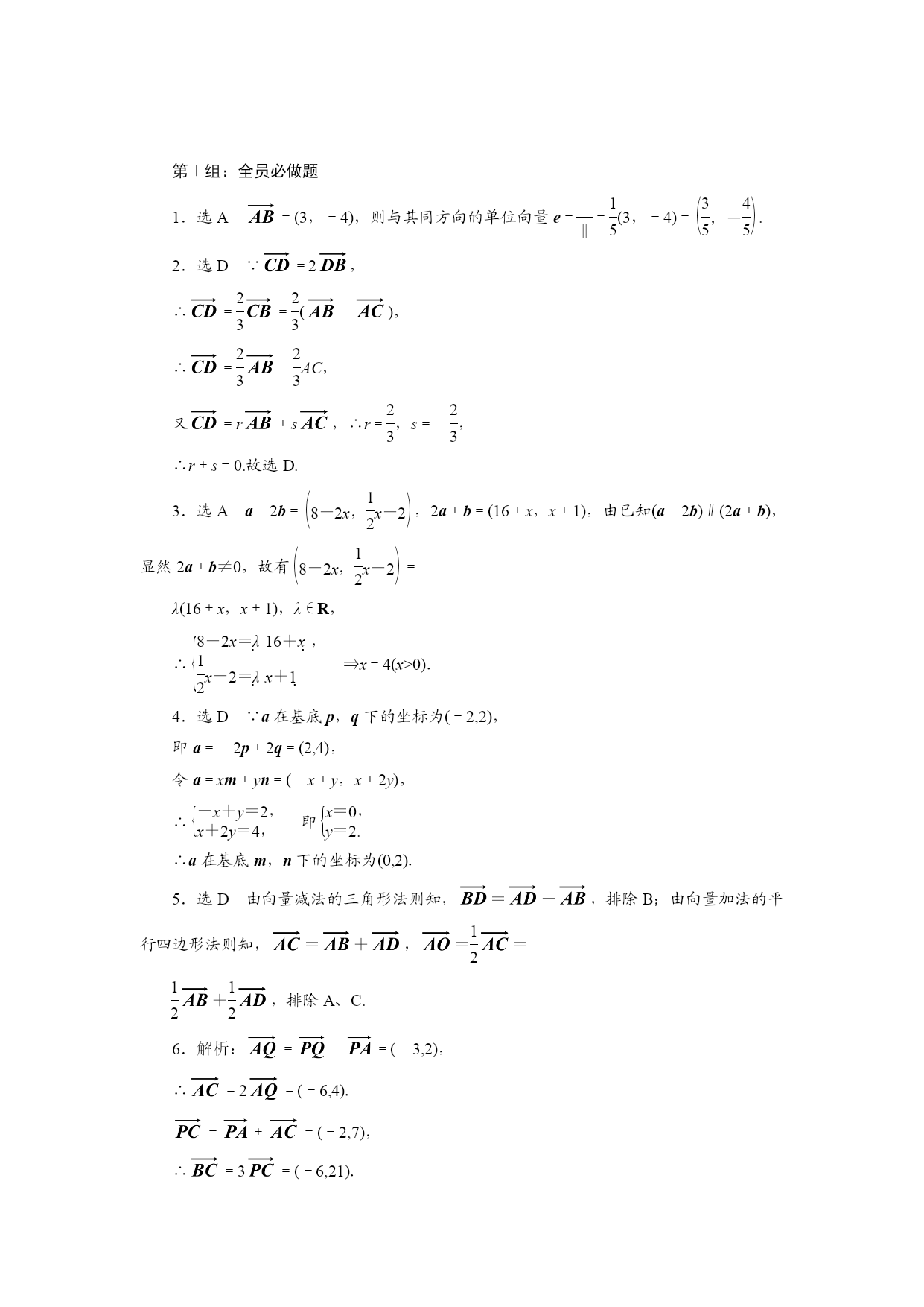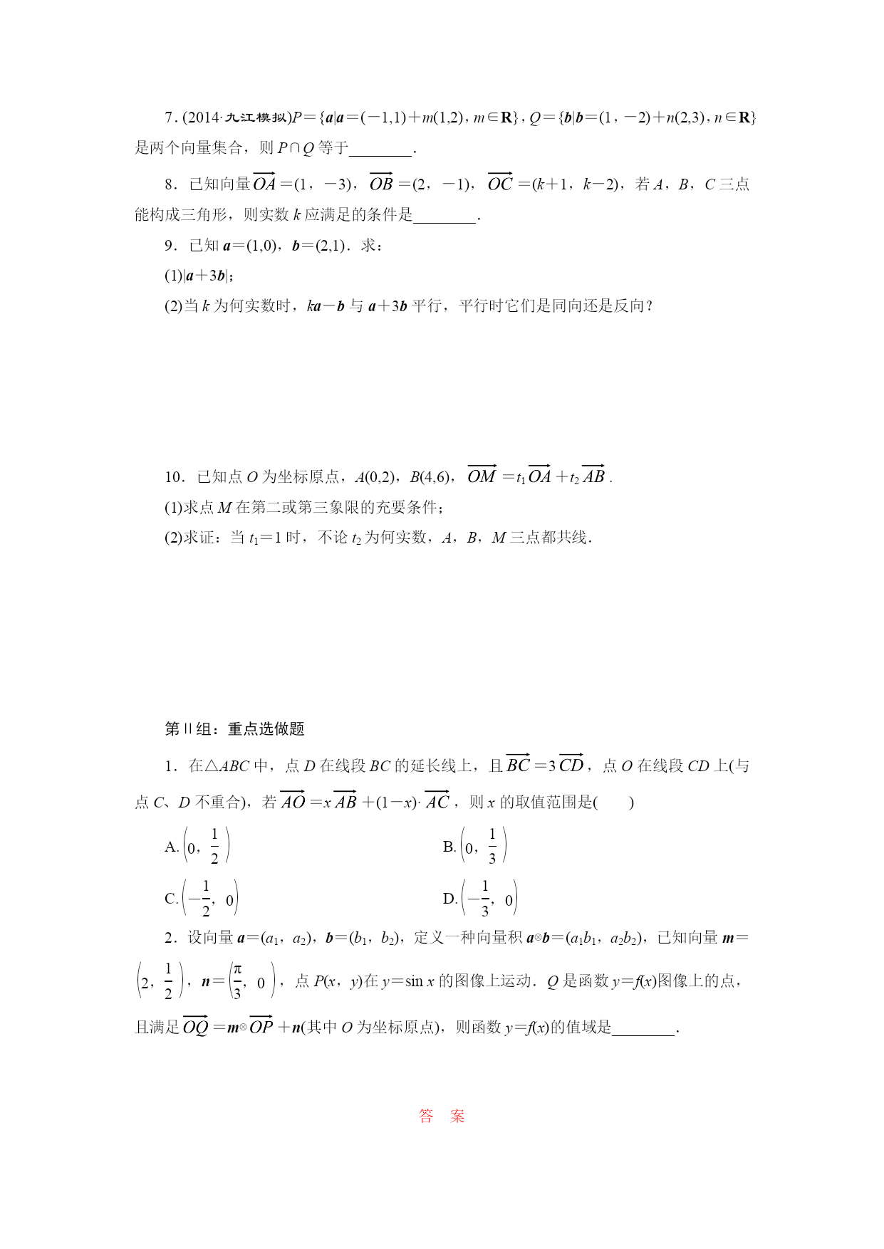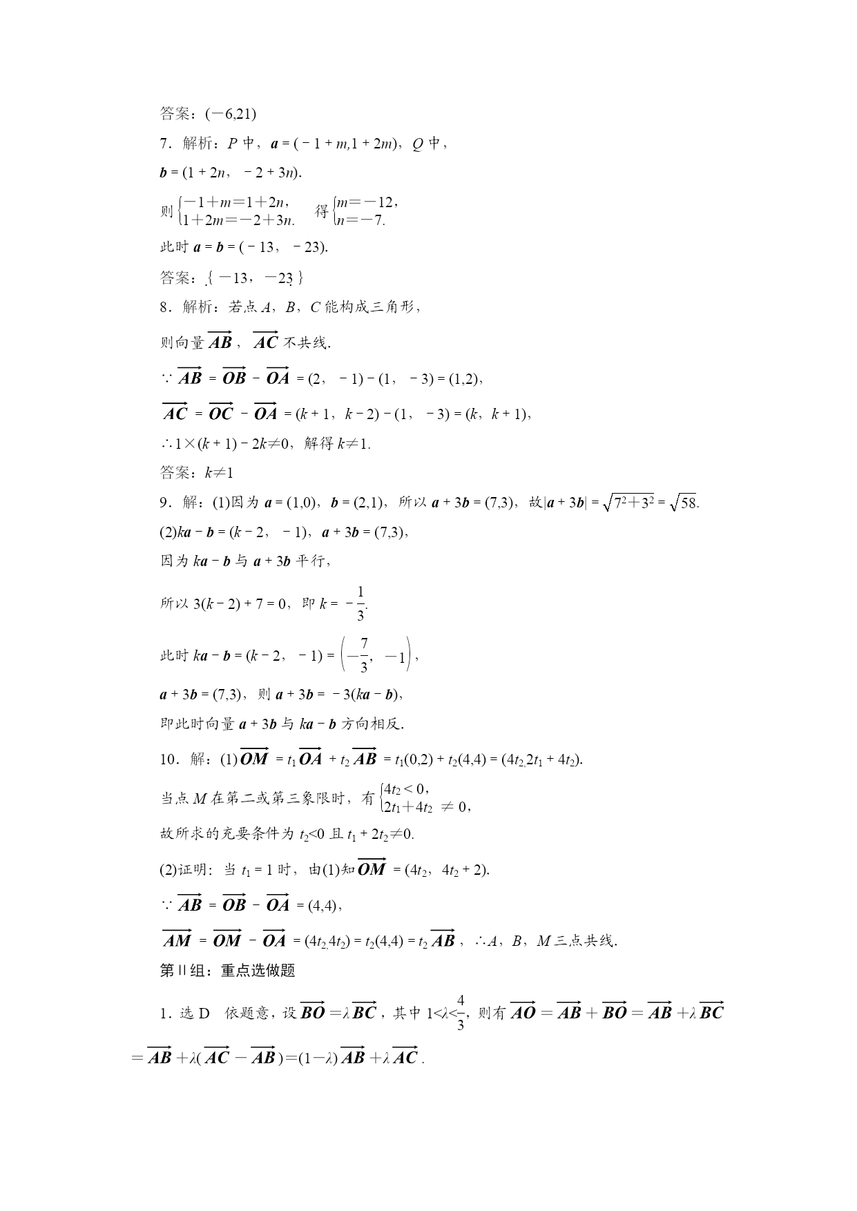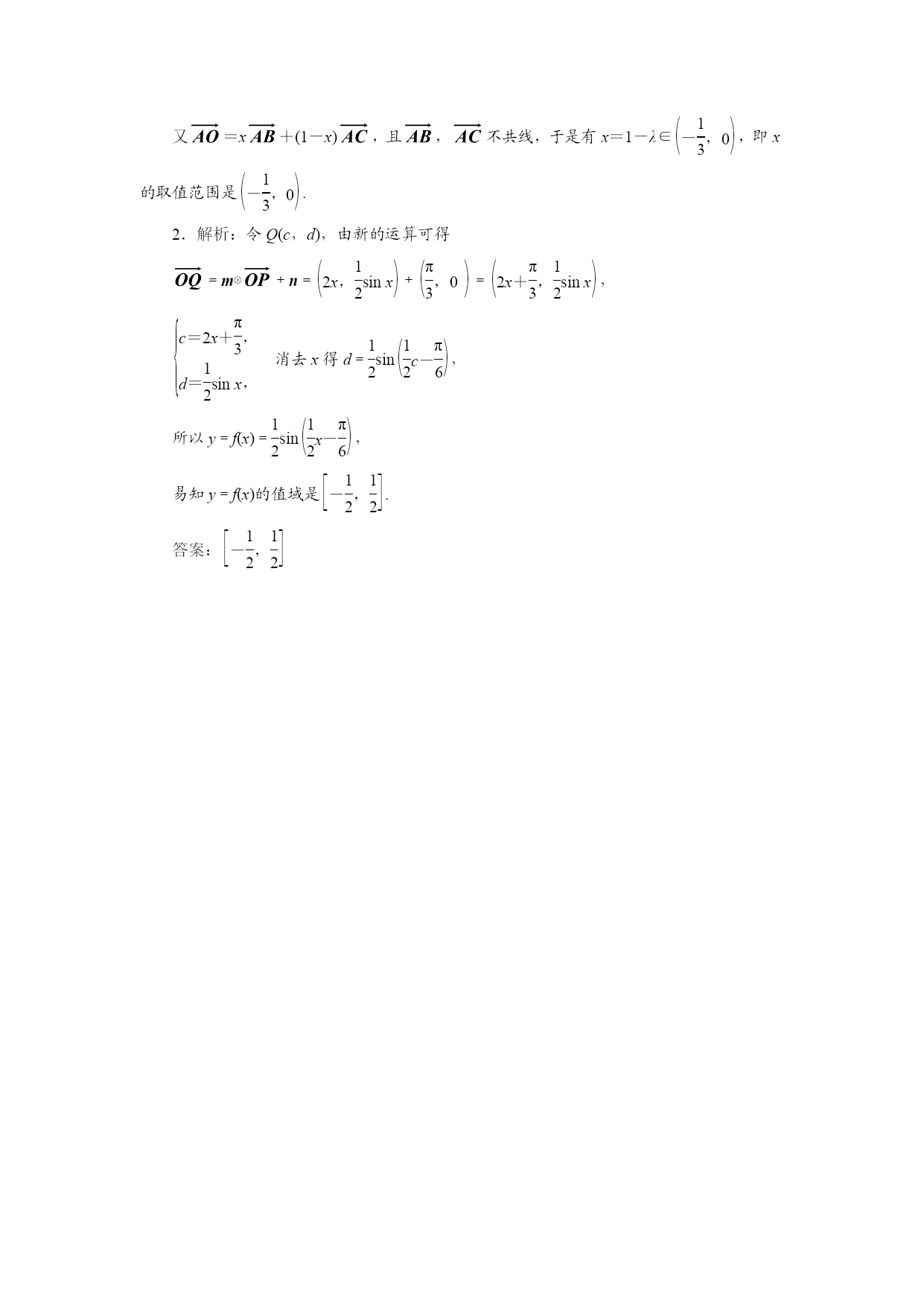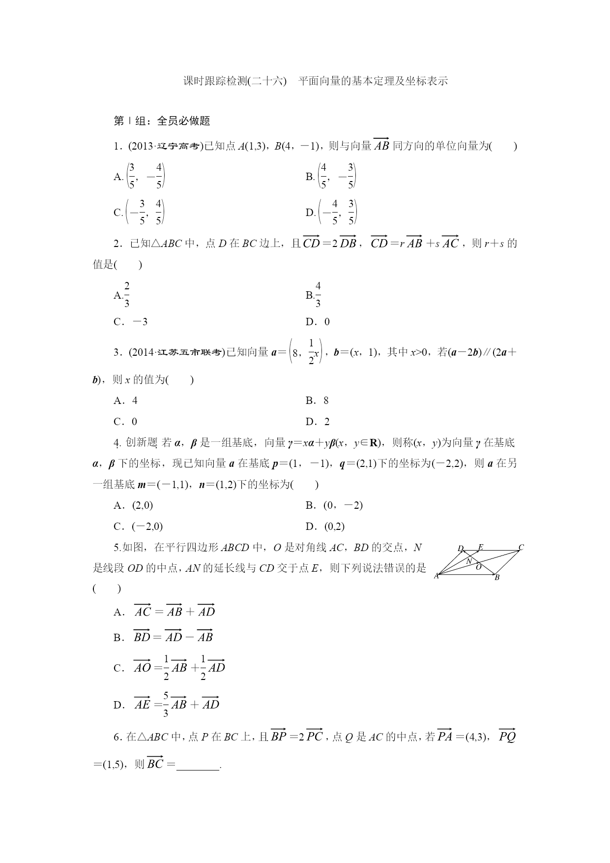 课时跟踪检测(二十六)平面向量的基本定理及坐标表示 第Ⅰ组:全员必做题 1.(2013·辽宁高考)已知点A(1,3),B(4,-1),则与向量同方向的单位向量为() A.eq\b\lc\(\rc\)(\a\vs4\al\co1(\f(3,5),-\f(4,5))) B.eq\b\lc\(\rc\)(\a\vs4\al\co1(\f(4,5),-\f(3,5))) C.eq\b\lc\(\rc\)(\a\vs4\al\co1(-\f(3,5),\f(4,5))) D.eq\b\lc\(\rc\)(\a\vs4\al\co1(-\f(4,5),\f(3,5))) 2.已知△ABC中,点D在BC边上,且=2,=r+s,则r+s的值是() A.eq\f(2,3) B.eq\f(4,3) C.-3 D.0 3.(2014·江苏五市联考)已知向量a=eq\b\lc\(\rc\)(\a\vs4\al\co1(8,\f(1,2)x)),b=(x,1),其中x>0,若(a-2b)∥(2a+b),则x的值为() A.4 B.8 C.0 D.2 4.eq\a\vs4\al(创新题)若α,β是一组基底,向量γ=xα+yβ(x,y∈R),则称(x,y)为向量γ在基底α,β下的坐标,现已知向量a在基底p=(1,-1),q=(2,1)下的坐标为(-2,2),则a在另一组基底m=(-1,1),n=(1,2)下的坐标为() A.(2,0) B.(0,-2) C.(-2,0) D.(0,2) 5.如图,在平行四边形ABCD中,O是对角线AC,BD的交点,N是线段OD的中点,AN的延长线与CD交于点E,则下列说法错误的是() A.=+ B.=- C.=eq\f(1,2)+eq\f(1,2) D.=eq\f(5,3)+ 6.在△ABC中,点P在BC上,且=2,点Q是AC的中点,若=(4,3),=(1,5),则=________. 7.(2014·九江模拟)P={a|a=(-1,1)+m(1,2),m∈R},Q={b|b=(1,-2)+n(2,3),n∈R}是两个向量集合,则P∩Q等于________. 8.已知向量=(1,-3),=(2,-1),=(k+1,k-2),若A,B,C三点能构成三角形,则实数k应满足的条件是________. 9.已知a=(1,0),b=(2,1).求: (1)|a+3b|; (2)当k为何实数时,ka-b与a+3b平行,平行时它们是同向还是反向? 10.已知点O为坐标原点,A(0,2),B(4,6),=t1+t2. (1)求点M在第二或第三象限的充要条件; (2)求证:当t1=1时,不论t2为何实数,A,B,M三点都共线. 第Ⅱ组:重点选做题 1.在△ABC中,点D在线段BC的延长线上,且=3,点O在线段CD上(与点C、D不重合),若=x+(1-x)·,则x的取值范围是() A.eq\b\lc\(\rc\)(\a\vs4\al\co1(0,\f(1,2))) B.eq\b\lc\(\rc\)(\a\vs4\al\co1(0,\f(1,3))) C.eq\b\lc\(\rc\)(\a\vs4\al\co1(-\f(1,2),0)) D.eq\b\lc\(\rc\)(\a\vs4\al\co1(-\f(1,3),0)) 2.设向量a=(a1,a2),b=(b1,b2),定义一种向量积a⊗b=(a1b1,a2b2),已知向量m=eq\b\lc\(\rc\)(\a\vs4\al\co1(2,\f(1,2))),n=eq\b\lc\(\rc\)(\a\vs4\al\co1(\f(π,3),0)),点P(x,y)在y=sinx的图像上运动.Q是函数y=f(x)图像上的点,且满足=m⊗+n(其中O为坐标原点),则函数y=f(x)的值域是________. 答案 第Ⅰ组:全员必做题 1.选A=(3,-4),则与其同方向的单位向量e=eq\f(,||)=eq\f(1,5)(3,-4)=eq\b\lc\(\rc\)(\a\vs4\al\co1(\f(3,5),-\f(4,5))). 2.选D∵=2, ∴=eq\f(2,3)=eq\f(2,3)(-), ∴=eq\f(2,3)-eq\f(2,3)AC, 又=r+s,∴r=eq\f(2,3),s=-eq\f(2,3), ∴r+s=0.故选D. 3.选Aa-2b=eq\b\lc\(\rc\)(\a\vs4\al\co1(8-2x,\f(1,2)x-2)),2a+b=(16+x,x+1),由已知(a-2b)∥(2a+b)