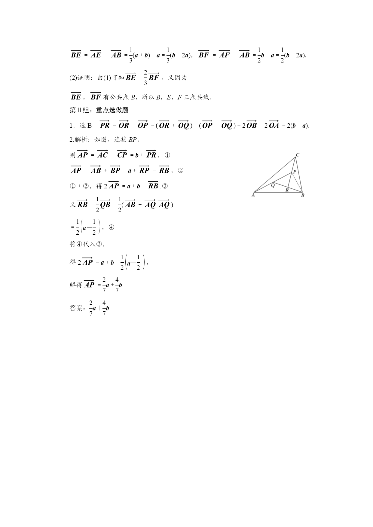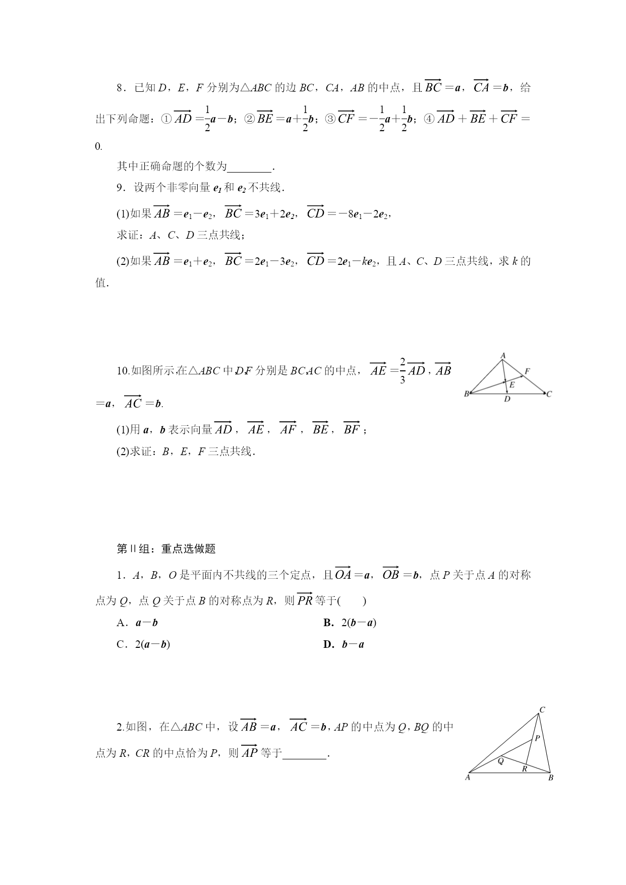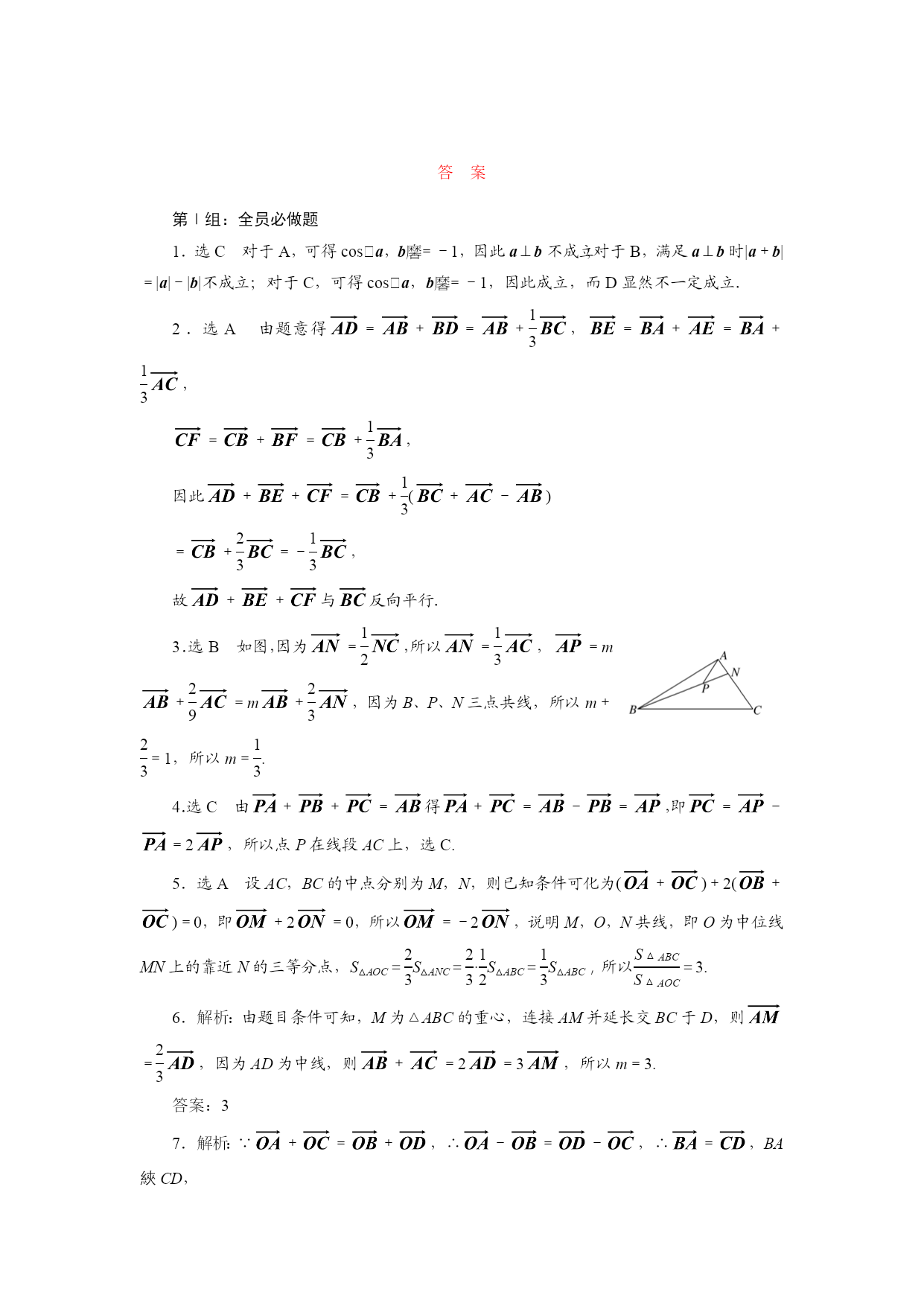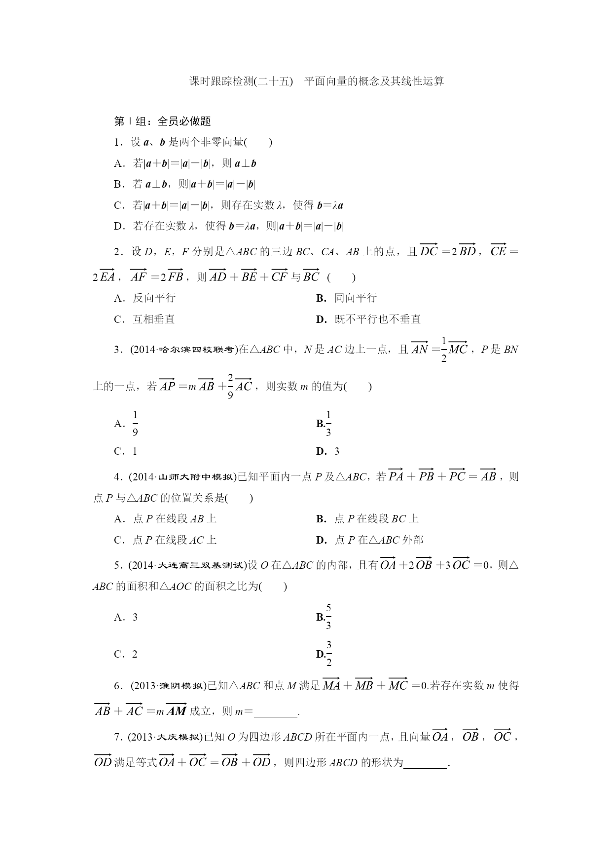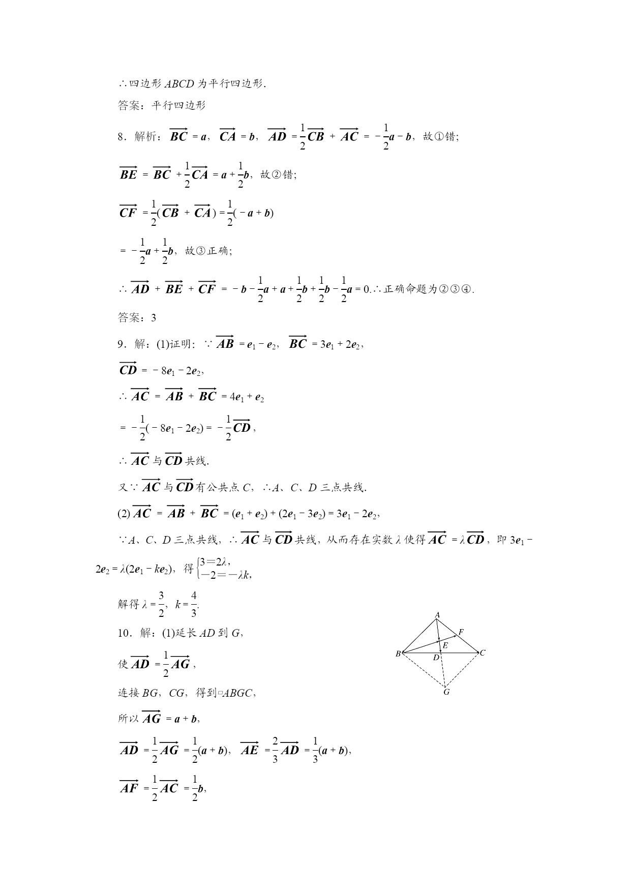 课时跟踪检测(二十五)平面向量的概念及其线性运算 第Ⅰ组:全员必做题 1.设a、b是两个非零向量() A.若|a+b|=|a|-|b|,则a⊥b B.若a⊥b,则|a+b|=|a|-|b| C.若|a+b|=|a|-|b|,则存在实数λ,使得b=λa D.若存在实数λ,使得b=λa,则|a+b|=|a|-|b| 2.设D,E,F分别是△ABC的三边BC、CA、AB上的点,且=2,=2,=2,则++与() A.反向平行 B.同向平行 C.互相垂直 D.既不平行也不垂直 3.(2014·哈尔滨四校联考)在△ABC中,N是AC边上一点,且=eq\f(1,2),P是BN上的一点,若=m+eq\f(2,9),则实数m的值为() A.eq\f(1,9) B.eq\f(1,3) C.1 D.3 4.(2014·山师大附中模拟)已知平面内一点P及△ABC,若++=,则点P与△ABC的位置关系是() A.点P在线段AB上 B.点P在线段BC上 C.点P在线段AC上 D.点P在△ABC外部 5.(2014·大连高三双基测试)设O在△ABC的内部,且有+2+3=0,则△ABC的面积和△AOC的面积之比为() A.3 B.eq\f(5,3) C.2 D.eq\f(3,2) 6.(2013·淮阴模拟)已知△ABC和点M满足++=0.若存在实数m使得+=m成立,则m=________. 7.(2013·大庆模拟)已知O为四边形ABCD所在平面内一点,且向量,,,满足等式+=+,则四边形ABCD的形状为________. 8.已知D,E,F分别为△ABC的边BC,CA,AB的中点,且=a,=b,给出下列命题:①=eq\f(1,2)a-b;②=a+eq\f(1,2)b;③=-eq\f(1,2)a+eq\f(1,2)b;④++=0. 其中正确命题的个数为________. 9.设两个非零向量e1和e2不共线. (1)如果=e1-e2,=3e1+2e2,=-8e1-2e2, 求证:A、C、D三点共线; (2)如果=e1+e2,=2e1-3e2,=2e1-ke2,且A、C、D三点共线,求k的值. 10.如图所示,在△ABC中,D,F分别是BC,AC的中点,=eq\f(2,3),=a,=b. (1)用a,b表示向量,,,,; (2)求证:B,E,F三点共线. 第Ⅱ组:重点选做题 1.A,B,O是平面内不共线的三个定点,且=a,=b,点P关于点A的对称点为Q,点Q关于点B的对称点为R,则等于() A.a-b B.2(b-a) C.2(a-b) D.b-a 2.如图,在△ABC中,设=a,=b,AP的中点为Q,BQ的中点为R,CR的中点恰为P,则等于________. 答案 第Ⅰ组:全员必做题 1.选C对于A,可得cosa,b=-1,因此a⊥b不成立;对于B,满足a⊥b时|a+b|=|a|-|b|不成立;对于C,可得cosa,b=-1,因此成立,而D显然不一定成立. 2.选A由题意得=+=+eq\f(1,3),=+=+eq\f(1,3), =+=+eq\f(1,3), 因此++=+eq\f(1,3)(+-) =+eq\f(2,3)=-eq\f(1,3), 故++与反向平行. 3.选B如图,因为=eq\f(1,2),所以=eq\f(1,3),=m+eq\f(2,9)=m+eq\f(2,3),因为B、P、N三点共线,所以m+eq\f(2,3)=1,所以m=eq\f(1,3). 4.选C由++=得+=-=,即=-=2,所以点P在线段AC上,选C. 5.选A设AC,BC的中点分别为M,N,则已知条件可化为(+)+2(+)=0,即+2=0,所以=-2,说明M,O,N共线,即O为中位线MN上的靠近N的三等分点,S△AOC=eq\f(2,3)S△ANC=eq\f(2,3)·eq\f(1,2)S△ABC=eq\f(1,3)S△ABC,所以eq\f(S△ABC,S△AOC)=3. 6.解析:由题目条件可知,M为△ABC的重心,连接AM并延长交BC于D,则=eq\f(2,3),因为AD为中线,则+=2=3,所以m=3. 答案:3 7.解析:∵+=+,∴-=-,∴=,BA綊CD, ∴四边形ABCD为平行四边形. 答案:平行四边形 8.解析:=a,=b,=eq\f(1,2)+=-eq\f(1,2)a-b,故①错; =+eq\f(1,2)=a+eq\f(1,2)b,故②错; =eq\f(1,2)(+)=eq\f(1,2)(-a+b) =-eq\f(