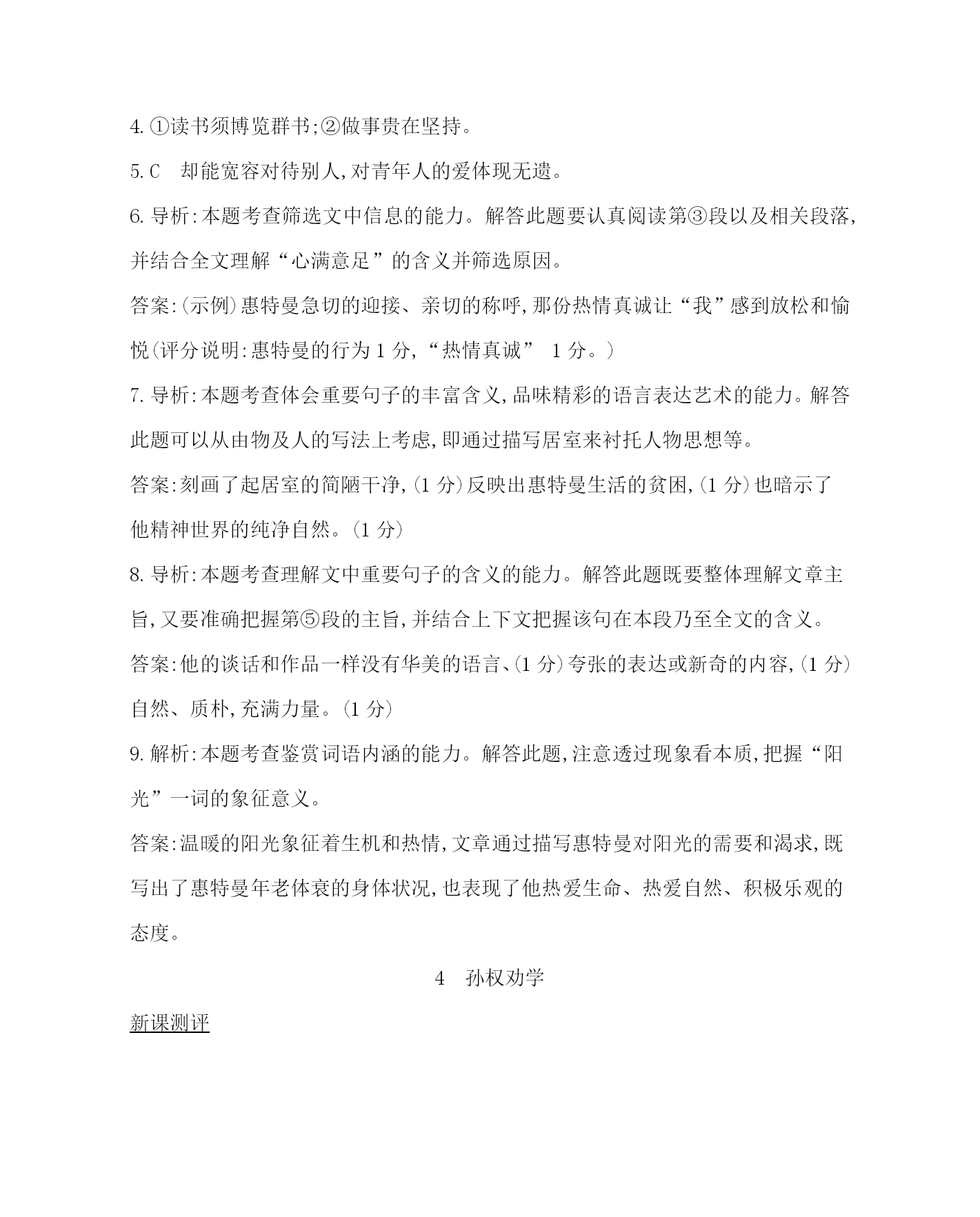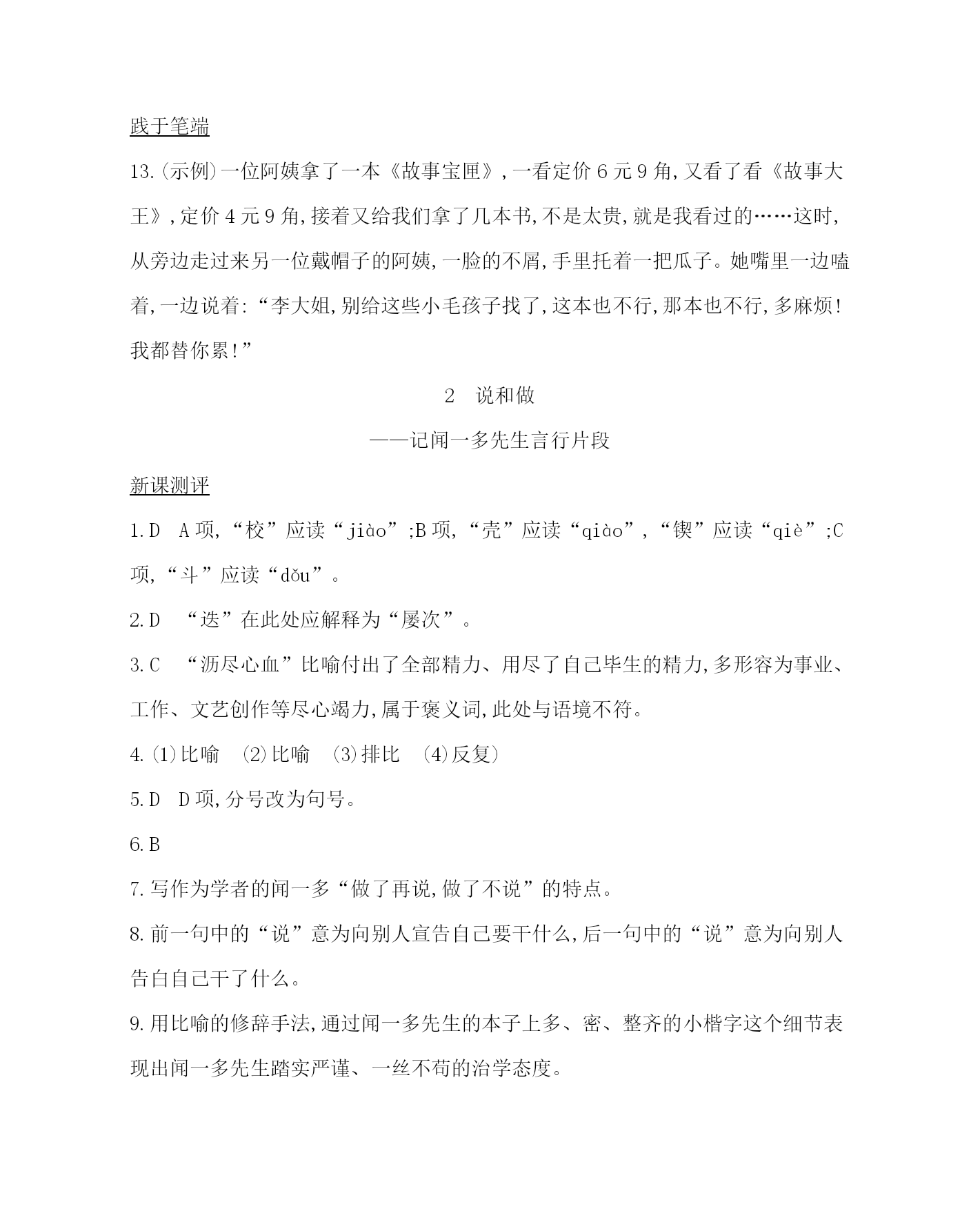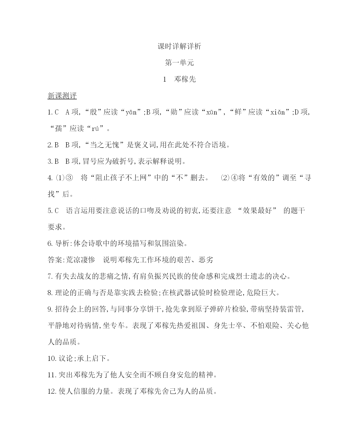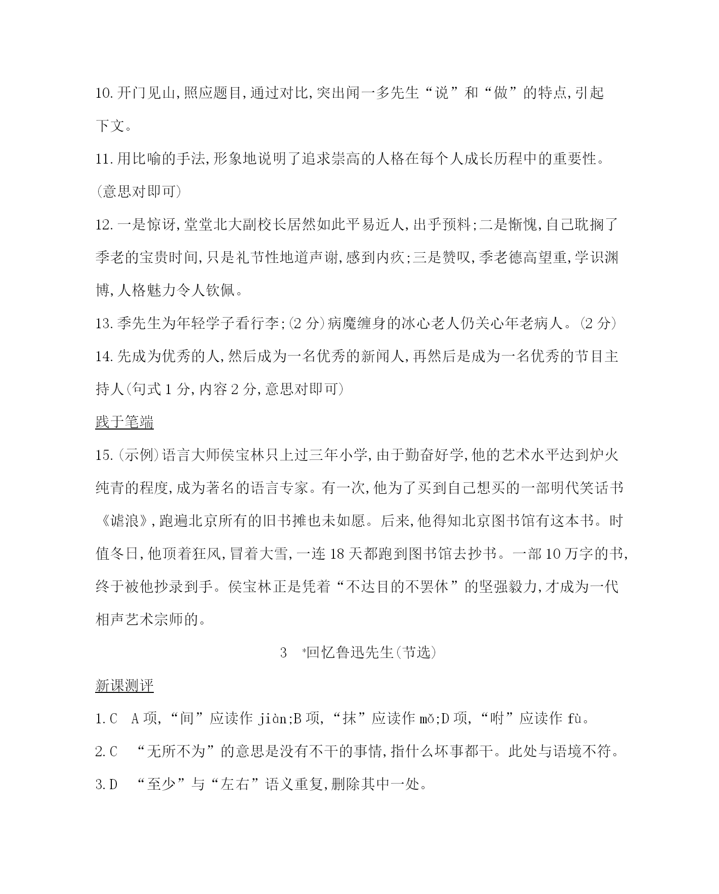 课时详解详析 第一单元 1邓稼先 新课测评 1.CA项,“殷”应读“yān”;B项,“勋”应读“xūn”,“鲜”应读“xiǎn”;D项,“孺”应读“rú”。 2.BB项,“当之无愧”是褒义词,用在此处不符合语境。 3.BB项,冒号应为破折号,表示解释说明。 4.(1)③将“阻止孩子不上网”中的“不”删去。(2)④将“有效的”调至“寻找”后。 5.C语言运用要注意说话的口吻及劝说的初衷,还要注意“效果最好”的题干 要求。 6.导析:体会诗歌中的环境描写和氛围渲染。 答案:荒凉凄惨说明邓稼先工作环境的艰苦、恶劣 7.有失去战友的悲痛之情,有肩负振兴民族的使命感和完成烈士遗志的决心。 8.理论的正确与否是靠实践去检验;在核武器试验时检验理论,危险巨大。 9.招待会上的回答,与同事分享饼干,抢先拿到原子弹碎片检验,带病坚持装雷管,平静地对待病情,坐专车。表现了邓稼先热爱祖国、身先士卒、不怕艰险、关心他人的品质。 10.议论;承上启下。 11.突出邓稼先为了他人安全而不顾自身安危的精神。 12.使人信服的力量。表现了邓稼先舍己为人的品质。 践于笔端 13.(示例)一位阿姨拿了一本《故事宝匣》,一看定价6元9角,又看了看《故事大王》,定价4元9角,接着又给我们拿了几本书,不是太贵,就是我看过的……这时,从旁边走过来另一位戴帽子的阿姨,一脸的不屑,手里托着一把瓜子。她嘴里一边嗑着,一边说着:“李大姐,别给这些小毛孩子找了,这本也不行,那本也不行,多麻烦!我都替你累!” 2说和做 ——记闻一多先生言行片段 新课测评 1.DA项,“校”应读“jiào”;B项,“壳”应读“qiào”,“锲”应读“qiè”;C项,“斗”应读“dǒu”。 2.D“迭”在此处应解释为“屡次”。 3.C“沥尽心血”比喻付出了全部精力、用尽了自己毕生的精力,多形容为事业、工作、文艺创作等尽心竭力,属于褒义词,此处与语境不符。 4.(1)比喻(2)比喻(3)排比(4)反复) 5.DD项,分号改为句号。 6.B 7.写作为学者的闻一多“做了再说,做了不说”的特点。 8.前一句中的“说”意为向别人宣告自己要干什么,后一句中的“说”意为向别人告白自己干了什么。 9.用比喻的修辞手法,通过闻一多先生的本子上多、密、整齐的小楷字这个细节表现出闻一多先生踏实严谨、一丝不苟的治学态度。 10.开门见山,照应题目,通过对比,突出闻一多先生“说”和“做”的特点,引起 下文。 11.用比喻的手法,形象地说明了追求崇高的人格在每个人成长历程中的重要性。(意思对即可) 12.一是惊讶,堂堂北大副校长居然如此平易近人,出乎预料;二是惭愧,自己耽搁了季老的宝贵时间,只是礼节性地道声谢,感到内疚;三是赞叹,季老德高望重,学识渊博,人格魅力令人钦佩。 13.季先生为年轻学子看行李;(2分)病魔缠身的冰心老人仍关心年老病人。(2分) 14.先成为优秀的人,然后成为一名优秀的新闻人,再然后是成为一名优秀的节目主持人(句式1分,内容2分,意思对即可) 践于笔端 15.(示例)语言大师侯宝林只上过三年小学,由于勤奋好学,他的艺术水平达到炉火纯青的程度,成为著名的语言专家。有一次,他为了买到自己想买的一部明代笑话书《谑浪》,跑遍北京所有的旧书摊也未如愿。后来,他得知北京图书馆有这本书。时值冬日,他顶着狂风,冒着大雪,一连18天都跑到图书馆去抄书。一部10万字的书,终于被他抄录到手。侯宝林正是凭着“不达目的不罢休”的坚强毅力,才成为一代相声艺术宗师的。 3*回忆鲁迅先生(节选) 新课测评 1.CA项,“间”应读作jiàn;B项,“抹”应读作mǒ;D项,“咐”应读作fù。 2.C“无所不为”的意思是没有不干的事情,指什么坏事都干。此处与语境不符。 3.D“至少”与“左右”语义重复,删除其中一处。 4.①读书须博览群书;②做事贵在坚持。 5.C却能宽容对待别人,对青年人的爱体现无遗。 6.导析:本题考查筛选文中信息的能力。解答此题要认真阅读第③段以及相关段落,并结合全文理解“心满意足”的含义并筛选原因。 答案:(示例)惠特曼急切的迎接、亲切的称呼,那份热情真诚让“我”感到放松和愉悦(评分说明:惠特曼的行为1分,“热情真诚”1分。) 7.导析:本题考查体会重要句子的丰富含义,品味精彩的语言表达艺术的能力。解答此题可以从由物及人的写法上考虑,即通过描写居室来衬托人物思想等。 答案:刻画了起居室的简陋干净,(1分)反映出惠特曼生活的贫困,(1分)也暗示了他精神世界的纯净自然。(1分) 8.导析:本题考查理解文中重要句子的含义的能力。解答此题既要整体理解文章主旨,又要准确把握第⑤段的主旨,并结合上下文把握该句在本段乃至全文的含义。 答案:他的谈话和作品一样没有华美的语言、(1分)夸张的表达或新奇的内容,(1分)自然、质朴,充满力