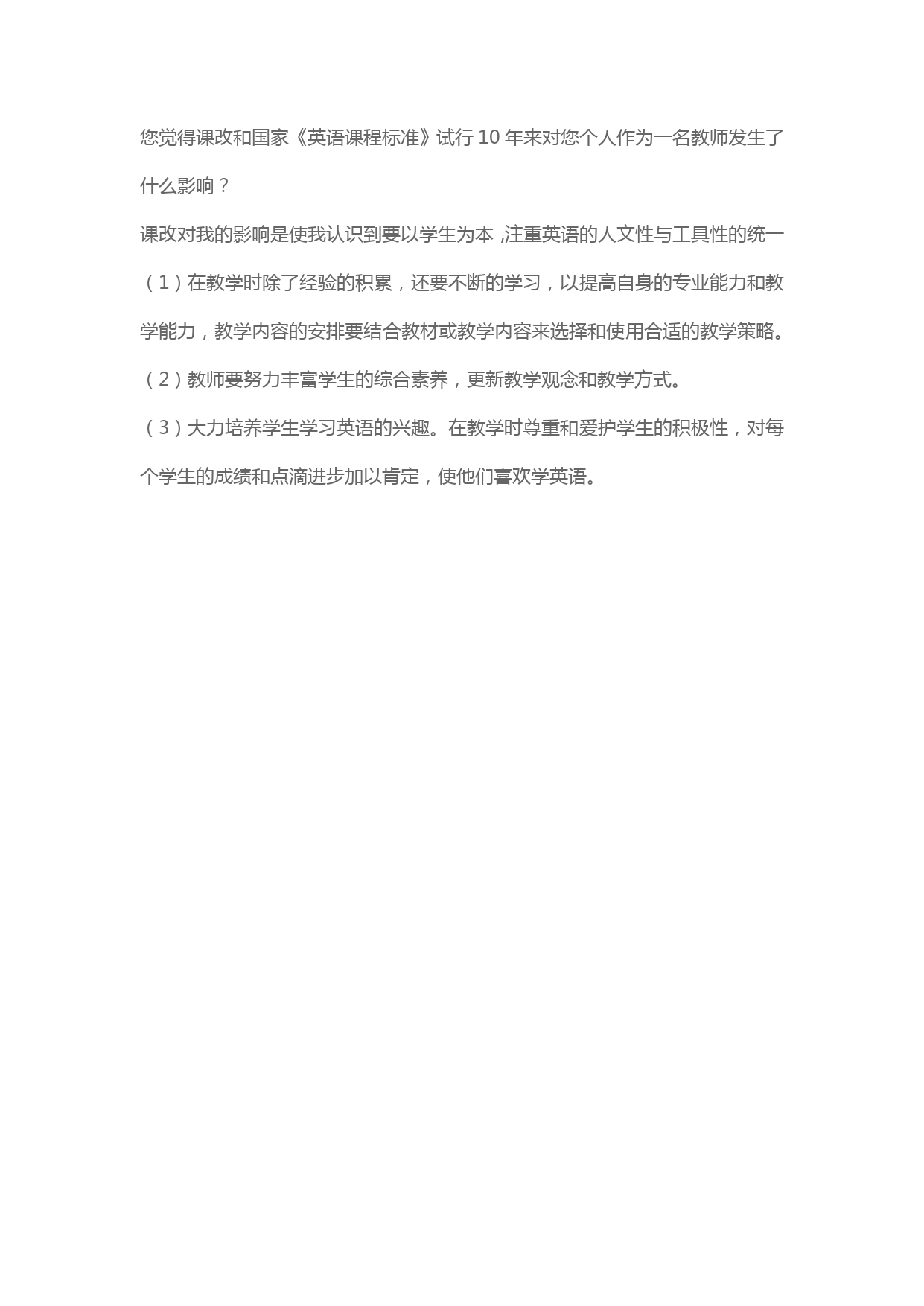 您觉得课改和国家《英语课程标准》试行10年来对您个人作为一名教师发生了什么影响? 课改对我的影响是使我认识到要以学生为本,注重英语的人文性与工具性的统一(1)在教学时除了经验的积累,还要不断的学习,以提高自身的专业能力和教学能力,教学内容的安排要结合教材或教学内容来选择和使用合适的教学策略。(2)教师要努力丰富学生的综合素养,更新教学观念和教学方式。 (3)大力培养学生学习英语的兴趣。在教学时尊重和爱护学生的积极性,对每个学生的成绩和点滴进步加以肯定,使他们喜欢学英语。