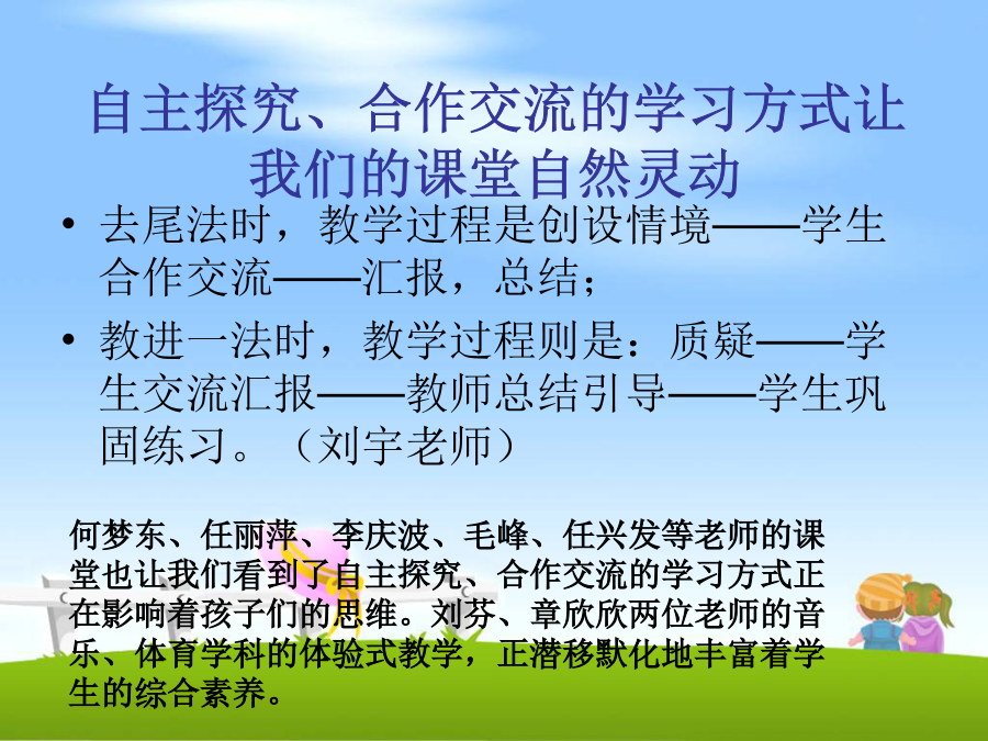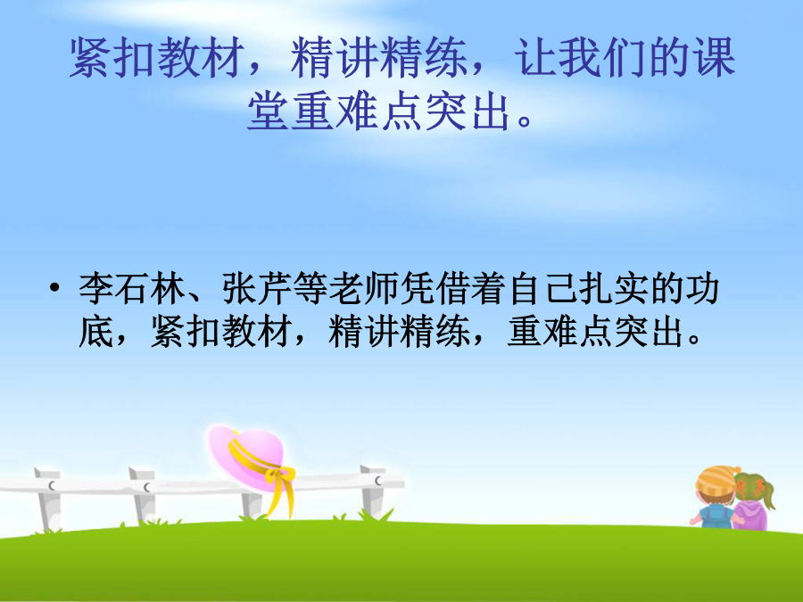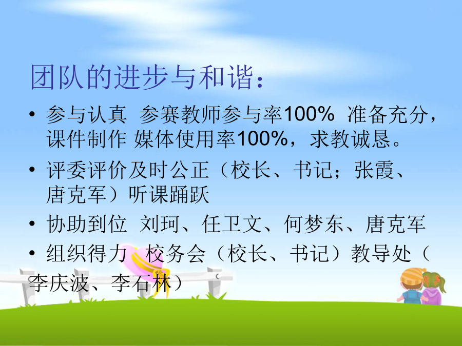 团队的进步与和谐:自主探究、合作交流的学习方式让我们的课堂自然灵动平等对话,亦师亦友的评价方式,让我们的课堂如沐春风。紧扣教材,精讲精练,让我们的课堂重难点突出。学校课堂教学的基本模式:建构模式的目的我们该注意什么:我们该注意什么:我们该注意什么:我们该注意什么: