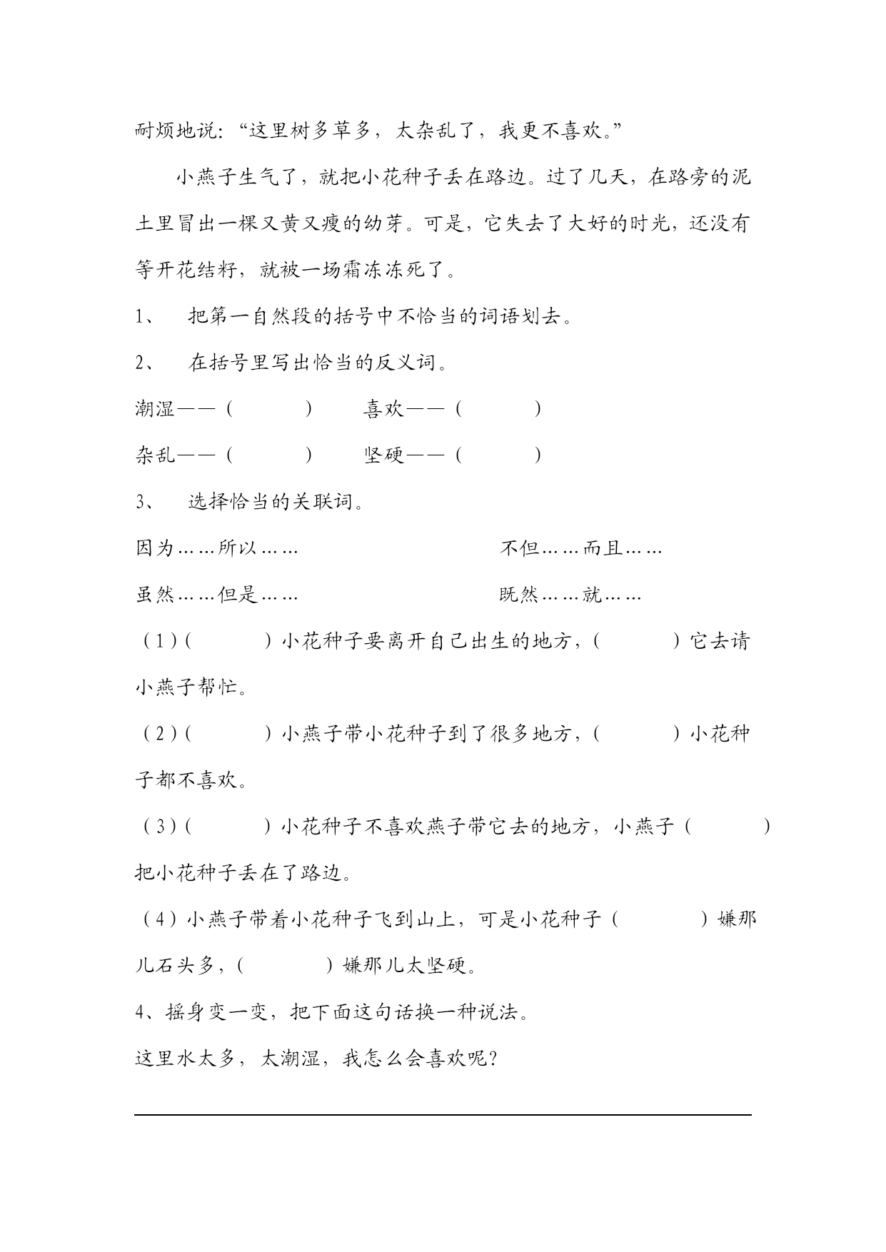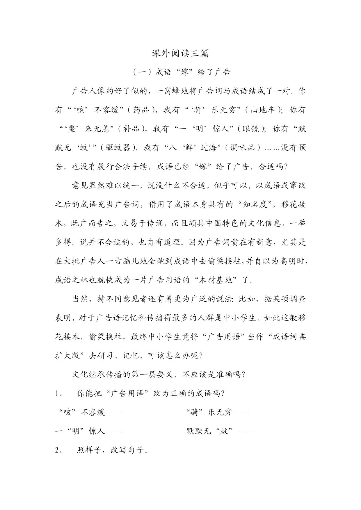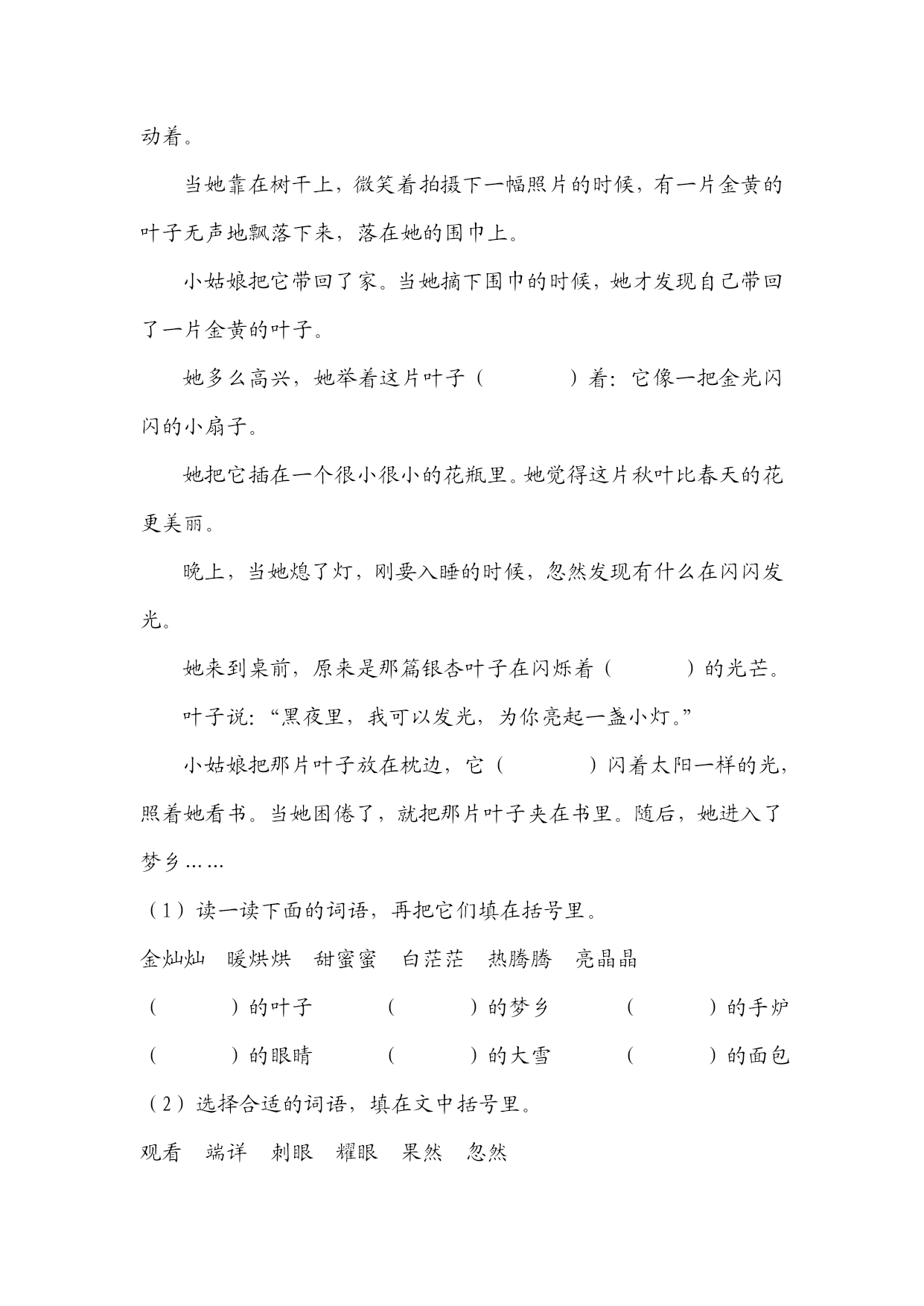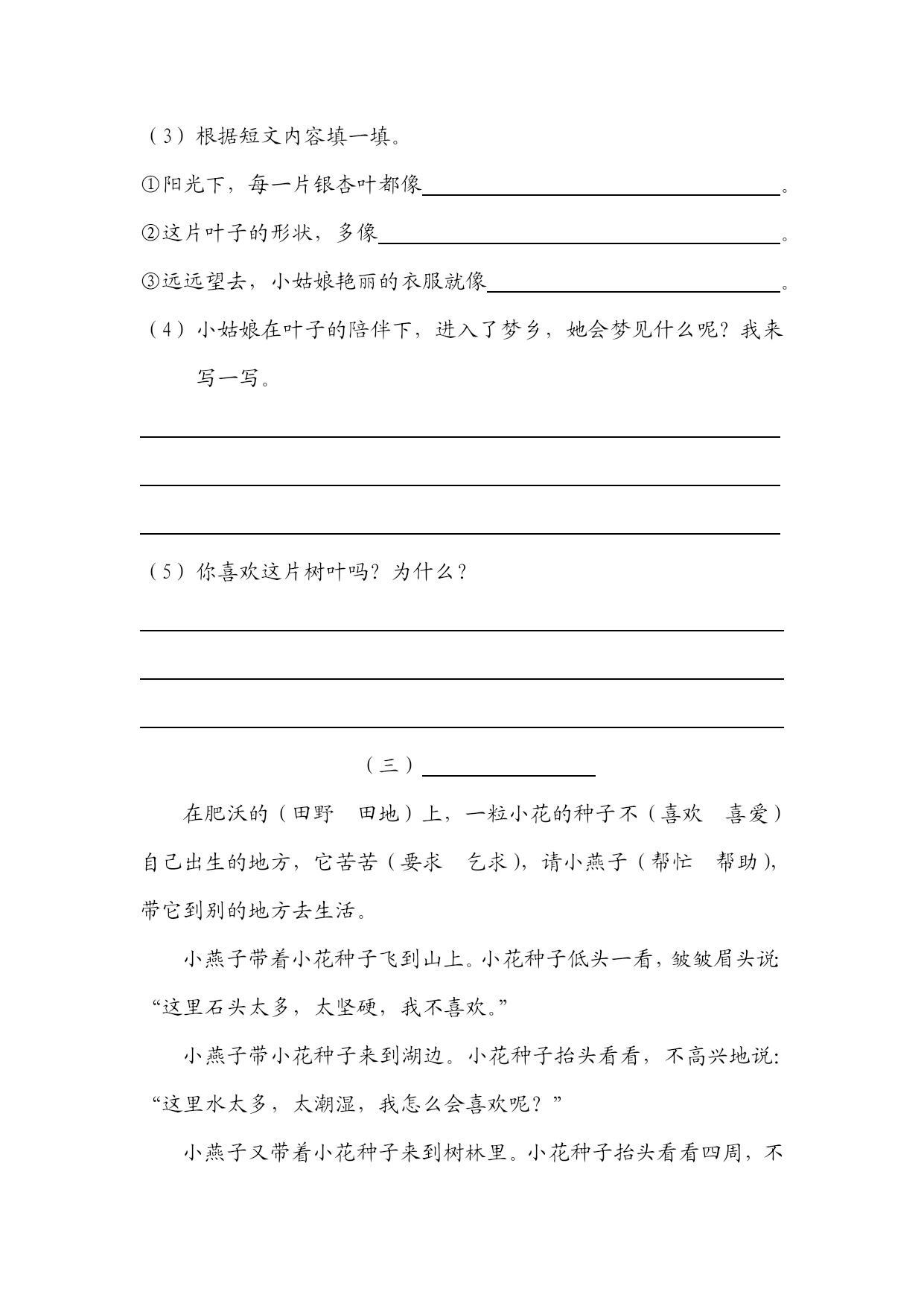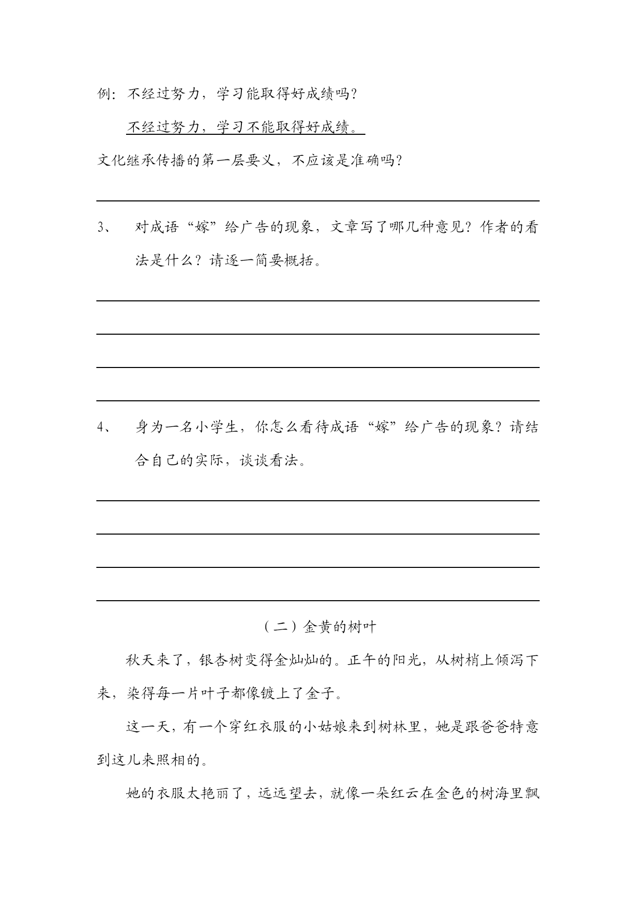 课外阅读三篇 (一)成语“嫁”给了广告 广告人像约好了似的,一窝蜂地将广告词与成语结成了一对。你有“‘咳’不容缓”(药品),我有“‘骑’乐无穷”(山地车);你有“‘鳖’来无恙”(补品),我有“一‘明’惊人”(眼镜);你有“默默无‘蚊’”(驱蚊器),我有“八‘鲜’过海”(调味品)……没有预告,也没有履行合法手续,成语已经“嫁”给了广告,合适吗? 意见显然难以统一,说没什么不合适,似乎可以。以成语或窜改之后的成语充当广告词,借用了成语本身具有的“知名度”,移花接木,既广而告之,又易于传诵,而且颇具中国特色的文化信息,一举多得。说并不合适的,也自有道理。因为广告词贵在有新意,尤其是在大批广告人一古脑儿地全跑到成语中去偷梁换柱,并自以为高明时,成语之林也就快成为一片广告用语的“木材基地”了。 当然,持不同意见者还有着更为广泛的说法:比如,据某项调查表明,对于广告语记忆和传播得最多的人群是中小学生。如此这般移花接木,偷梁换柱,最终中小学生竟将“广告用语”当作“成语词典扩大版”去研习、记忆,可该怎么办呢? 文化继承传播的第一层要义,不应该是准确吗? 你能把“广告用语”改为正确的成语吗? “咳”不容缓——“骑”乐无穷—— 一“明”惊人——默默无“蚊”—— 照样子,改写句子。 例:不经过努力,学习能取得好成绩吗? 不经过努力,学习不能取得好成绩。 文化继承传播的第一层要义,不应该是准确吗? 对成语“嫁”给广告的现象,文章写了哪几种意见?作者的看法是什么?请逐一简要概括。 身为一名小学生,你怎么看待成语“嫁”给广告的现象?请结合自己的实际,谈谈看法。 (二)金黄的树叶 秋天来了,银杏树变得金灿灿的。正午的阳光,从树梢上倾泻下来,染得每一片叶子都像镀上了金子。 这一天,有一个穿红衣服的小姑娘来到树林里,她是跟爸爸特意到这儿来照相的。 她的衣服太艳丽了,远远望去,就像一朵红云在金色的树海里飘动着。 当她靠在树干上,微笑着拍摄下一幅照片的时候,有一片金黄的叶子无声地飘落下来,落在她的围巾上。 小姑娘把它带回了家。当她摘下围巾的时候,她才发现自己带回了一片金黄的叶子。 她多么高兴,她举着这片叶子()着:它像一把金光闪闪的小扇子。 她把它插在一个很小很小的花瓶里。她觉得这片秋叶比春天的花更美丽。 晚上,当她熄了灯,刚要入睡的时候,忽然发现有什么在闪闪发光。 她来到桌前,原来是那篇银杏叶子在闪烁着()的光芒。 叶子说:“黑夜里,我可以发光,为你亮起一盏小灯。” 小姑娘把那片叶子放在枕边,它()闪着太阳一样的光,照着她看书。当她困倦了,就把那片叶子夹在书里。随后,她进入了梦乡…… 读一读下面的词语,再把它们填在括号里。 金灿灿暖烘烘甜蜜蜜白茫茫热腾腾亮晶晶 ()的叶子()的梦乡()的手炉 ()的眼睛()的大雪()的面包 选择合适的词语,填在文中括号里。 观看端详刺眼耀眼果然忽然 根据短文内容填一填。 =1\*GB3①阳光下,每一片银杏叶都像。 =2\*GB3②这片叶子的形状,多像。 =3\*GB3③远远望去,小姑娘艳丽的衣服就像。 小姑娘在叶子的陪伴下,进入了梦乡,她会梦见什么呢?我来写一写。 你喜欢这片树叶吗?为什么? (三) 在肥沃的(田野田地)上,一粒小花的种子不(喜欢喜爱)自己出生的地方,它苦苦(要求乞求),请小燕子(帮忙帮助),带它到别的地方去生活。 小燕子带着小花种子飞到山上。小花种子低头一看,皱皱眉头说:“这里石头太多,太坚硬,我不喜欢。” 小燕子带小花种子来到湖边。小花种子抬头看看,不高兴地说:“这里水太多,太潮湿,我怎么会喜欢呢?” 小燕子又带着小花种子来到树林里。小花种子抬头看看四周,不耐烦地说:“这里树多草多,太杂乱了,我更不喜欢。” 小燕子生气了,就把小花种子丢在路边。过了几天,在路旁的泥土里冒出一棵又黄又瘦的幼芽。可是,它失去了大好的时光,还没有等开花结籽,就被一场霜冻冻死了。 把第一自然段的括号中不恰当的词语划去。 在括号里写出恰当的反义词。 潮湿——()喜欢——() 杂乱——()坚硬——() 选择恰当的关联词。 因为……所以……不但……而且…… 虽然……但是……既然……就…… (1)()小花种子要离开自己出生的地方,()它去请小燕子帮忙。 (2)()小燕子带小花种子到了很多地方,()小花种子都不喜欢。 (3)()小花种子不喜欢燕子带它去的地方,小燕子()把小花种子丢在了路边。 (4)小燕子带着小花种子飞到山上,可是小花种子()嫌那儿石头多,()嫌那儿太坚硬。 4、摇身变一变,把下面这句话换一种说法。 这里水太多,太潮湿,我怎么会喜欢呢? 5、我会填,也会说。 燕子曾把生在的小花种子带到、和,小花种子都,最后,它被丢在了。 我想对小燕子说:“ 。” 我还想对小花种子说:“ 。” 6