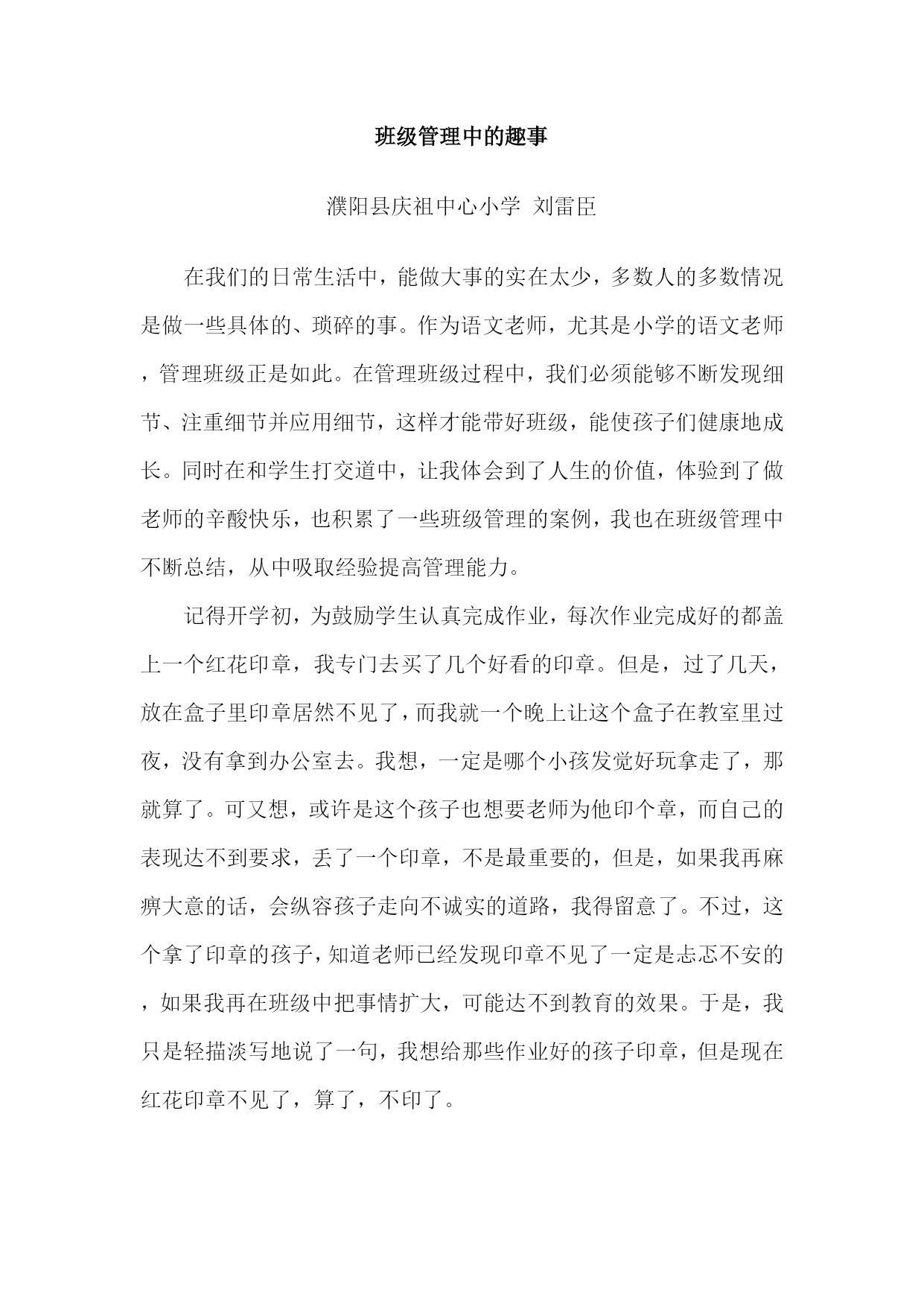 班级管理中的趣事 濮阳县庆祖中心小学刘雷臣 在我们的日常生活中,能做大事的实在太少,多数人的多数情况是做一些具体的、琐碎的事。作为语文老师,尤其是小学的语文老师,管理班级正是如此。在管理班级过程中,我们必须能够不断发现细节、注重细节并应用细节,这样才能带好班级,能使孩子们健康地成长。同时在和学生打交道中,让我体会到了人生的价值,体验到了做老师的辛酸快乐,也积累了一些班级管理的案例,我也在班级管理中不断总结,从中吸取经验提高管理能力。 记得开学初,为鼓励学生认真完成作业,每次作业完成好的都盖上一个红花印章,我专门去买了几个好看的印章。但是,过了几天,放在盒子里印章居然不见了,而我就一个晚上让这个盒子在教室里过夜,没有拿到办公室去。我想,一定是哪个小孩发觉好玩拿走了,那就算了。可又想,或许是这个孩子也想要老师为他印个章,而自己的表现达不到要求,丢了一个印章,不是最重要的,但是,如果我再麻痹大意的话,会纵容孩子走向不诚实的道路,我得留意了。不过,这个拿了印章的孩子,知道老师已经发现印章不见了一定是忐忑不安的,如果我再在班级中把事情扩大,可能达不到教育的效果。于是,我只是轻描淡写地说了一句,我想给那些作业好的孩子印章,但是现在红花印章不见了,算了,不印了。 过了一段时间,我改给孩子印五星时,无意间发现有个孩子在自己本上印了好几个红花。我一下子闷住了,难道这印章是他拿的?我就问了一句:“这究竟是怎么回事?”他回答了一句:“是我自己印的。”“你这印章哪儿来的?”他吱吱唔唔的,说不清楚。我的火一下子吊了起来。但我强压住火,不露声色地对对他说:“你走吧。” 又过了一天,我抽空让这个孩子跟我到办公室去。在走廊上,我边走边和颜悦色地问他:“今天放学后,谁来接你?”当他告诉我说是他奶奶接时,我又对他说:“我想让你妈妈来接你,我想跟你妈妈聊聊。”然后,一路到办公室没有说话。走进办公室,或许是事隔了一天,我一点火气都没有了,只问了他一句:“你的红花本子究竟是怎么回事?”他就告诉了我,印章是他拿的,并且承认了错误,并保证下次在也不做这样的错事了。从这以后,这个孩子真的不再犯这样的错误,而且在其他方面的表现进步也很大。 看来,对待学生的犯错,你一味地去训斥,效果不一定好。如果你为该孩子留有空间去思考,在同学面前为他保留一点面子,让他自己去认识到自己的错误,会得到意想不到的效果。