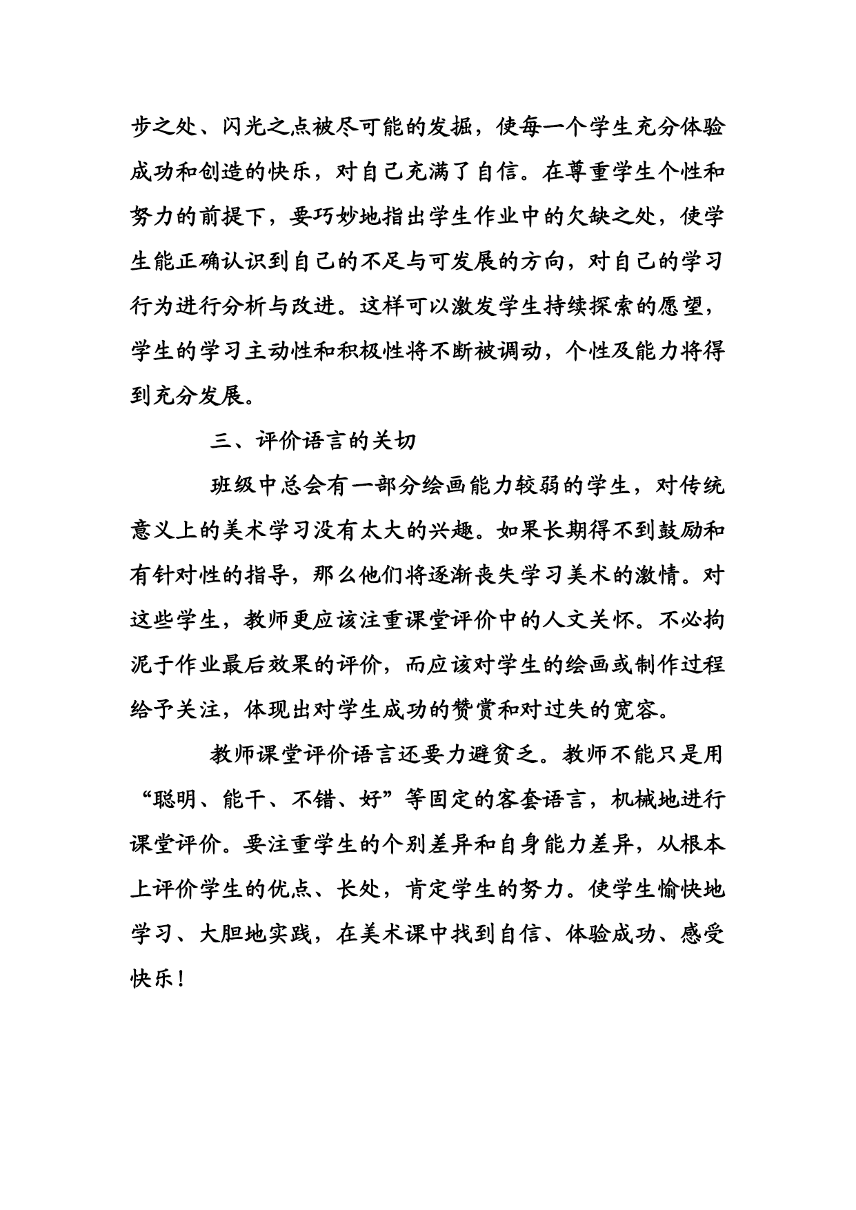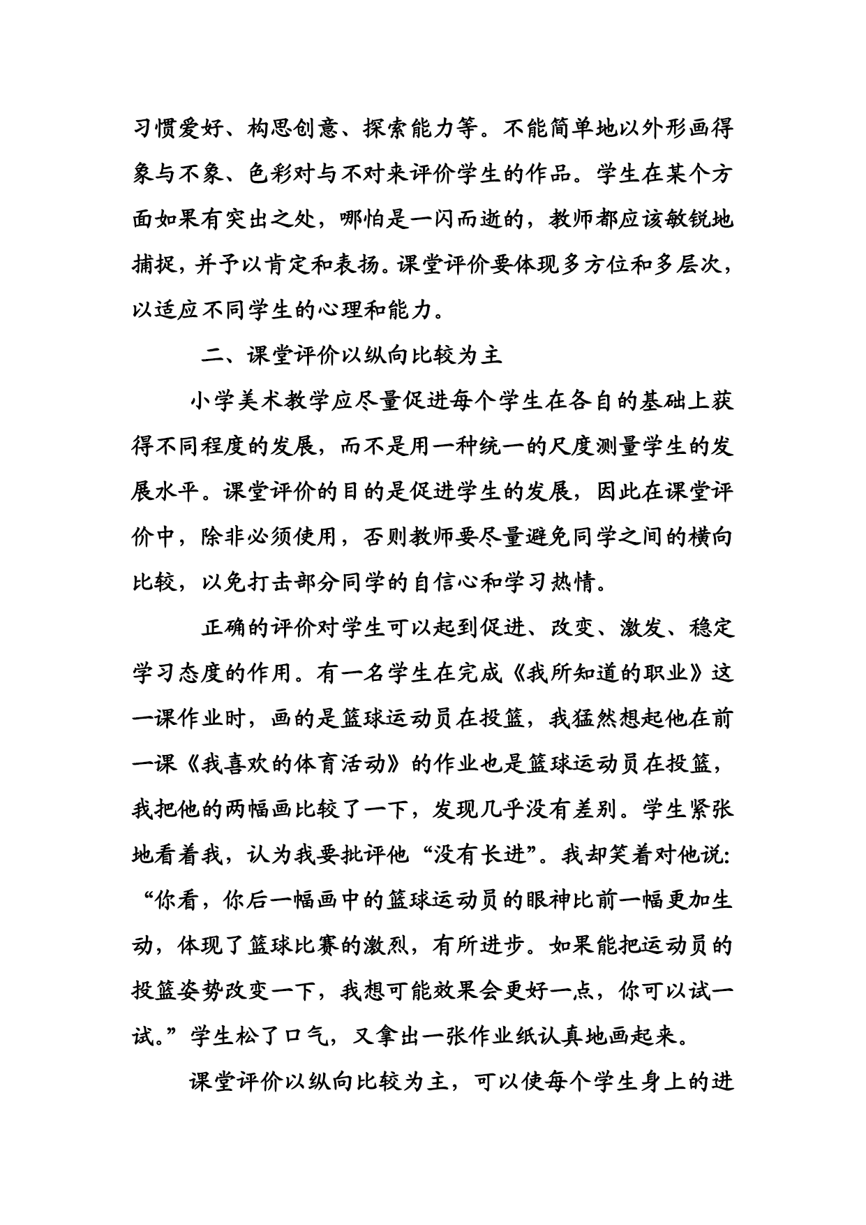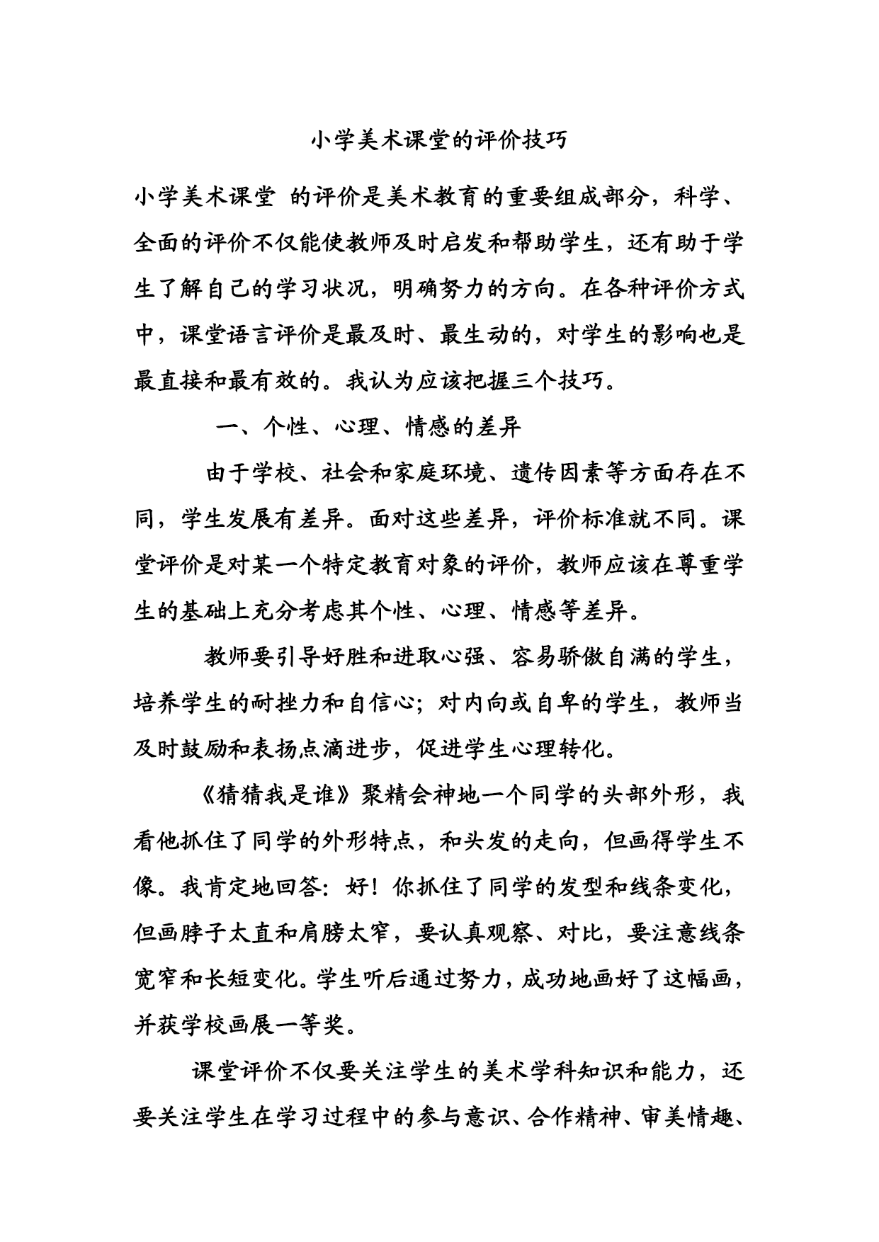 小学美术课堂的评价技巧 小学美术课堂的评价是美术教育的重要组成部分,科学、全面的评价不仅能使教师及时启发和帮助学生,还有助于学生了解自己的学习状况,明确努力的方向。在各种评价方式中,课堂语言评价是最及时、最生动的,对学生的影响也是最直接和最有效的。我认为应该把握三个技巧。 一、个性、心理、情感的差异 由于学校、社会和家庭环境、遗传因素等方面存在不同,学生发展有差异。面对这些差异,评价标准就不同。课堂评价是对某一个特定教育对象的评价,教师应该在尊重学生的基础上充分考虑其个性、心理、情感等差异。 教师要引导好胜和进取心强、容易骄傲自满的学生,培养学生的耐挫力和自信心;对内向或自卑的学生,教师当及时鼓励和表扬点滴进步,促进学生心理转化。 《猜猜我是谁》聚精会神地一个同学的头部外形,我看他抓住了同学的外形特点,和头发的走向,但画得学生不像。我肯定地回答:好!你抓住了同学的发型和线条变化,但画脖子太直和肩膀太窄,要认真观察、对比,要注意线条宽窄和长短变化。学生听后通过努力,成功地画好了这幅画,并获学校画展一等奖。 课堂评价不仅要关注学生的美术学科知识和能力,还要关注学生在学习过程中的参与意识、合作精神、审美情趣、习惯爱好、构思创意、探索能力等。不能简单地以外形画得象与不象、色彩对与不对来评价学生的作品。学生在某个方面如果有突出之处,哪怕是一闪而逝的,教师都应该敏锐地捕捉,并予以肯定和表扬。课堂评价要体现多方位和多层次,以适应不同学生的心理和能力。 二、课堂评价以纵向比较为主 小学美术教学应尽量促进每个学生在各自的基础上获得不同程度的发展,而不是用一种统一的尺度测量学生的发展水平。课堂评价的目的是促进学生的发展,因此在课堂评价中,除非必须使用,否则教师要尽量避免同学之间的横向比较,以免打击部分同学的自信心和学习热情。 正确的评价对学生可以起到促进、改变、激发、稳定学习态度的作用。有一名学生在完成《我所知道的职业》这一课作业时,画的是篮球运动员在投篮,我猛然想起他在前一课《我喜欢的体育活动》的作业也是篮球运动员在投篮,我把他的两幅画比较了一下,发现几乎没有差别。学生紧张地看着我,认为我要批评他“没有长进”。我却笑着对他说:“你看,你后一幅画中的篮球运动员的眼神比前一幅更加生动,体现了篮球比赛的激烈,有所进步。如果能把运动员的投篮姿势改变一下,我想可能效果会更好一点,你可以试一试。”学生松了口气,又拿出一张作业纸认真地画起来。 课堂评价以纵向比较为主,可以使每个学生身上的进步之处、闪光之点被尽可能的发掘,使每一个学生充分体验成功和创造的快乐,对自己充满了自信。在尊重学生个性和努力的前提下,要巧妙地指出学生作业中的欠缺之处,使学生能正确认识到自己的不足与可发展的方向,对自己的学习行为进行分析与改进。这样可以激发学生持续探索的愿望,学生的学习主动性和积极性将不断被调动,个性及能力将得到充分发展。 三、评价语言的关切 班级中总会有一部分绘画能力较弱的学生,对传统意义上的美术学习没有太大的兴趣。如果长期得不到鼓励和有针对性的指导,那么他们将逐渐丧失学习美术的激情。对这些学生,教师更应该注重课堂评价中的人文关怀。不必拘泥于作业最后效果的评价,而应该对学生的绘画或制作过程给予关注,体现出对学生成功的赞赏和对过失的宽容。 教师课堂评价语言还要力避贫乏。教师不能只是用“聪明、能干、不错、好”等固定的客套语言,机械地进行课堂评价。要注重学生的个别差异和自身能力差异,从根本上评价学生的优点、长处,肯定学生的努力。使学生愉快地学习、大胆地实践,在美术课中找到自信、体验成功、感受快乐!