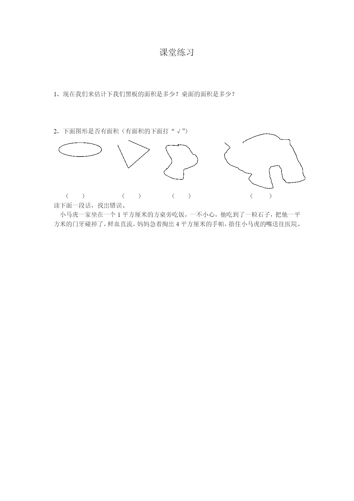 课堂练习 1、现在我们来估计下我们黑板的面积是多少?桌面的面积是多少? 2、下面图形是否有面积(有面积的下面打“√”) ()()()() 读下面一段话,找出错误。 小马虎一家坐在一个1平方厘米的方桌旁吃饭,一不小心,他吃到了一粒石子,把他一平方米的门牙碰掉了,鲜血直流,妈妈急着掏出4平方厘米的手帕,捂住小马虎的嘴送往医院。