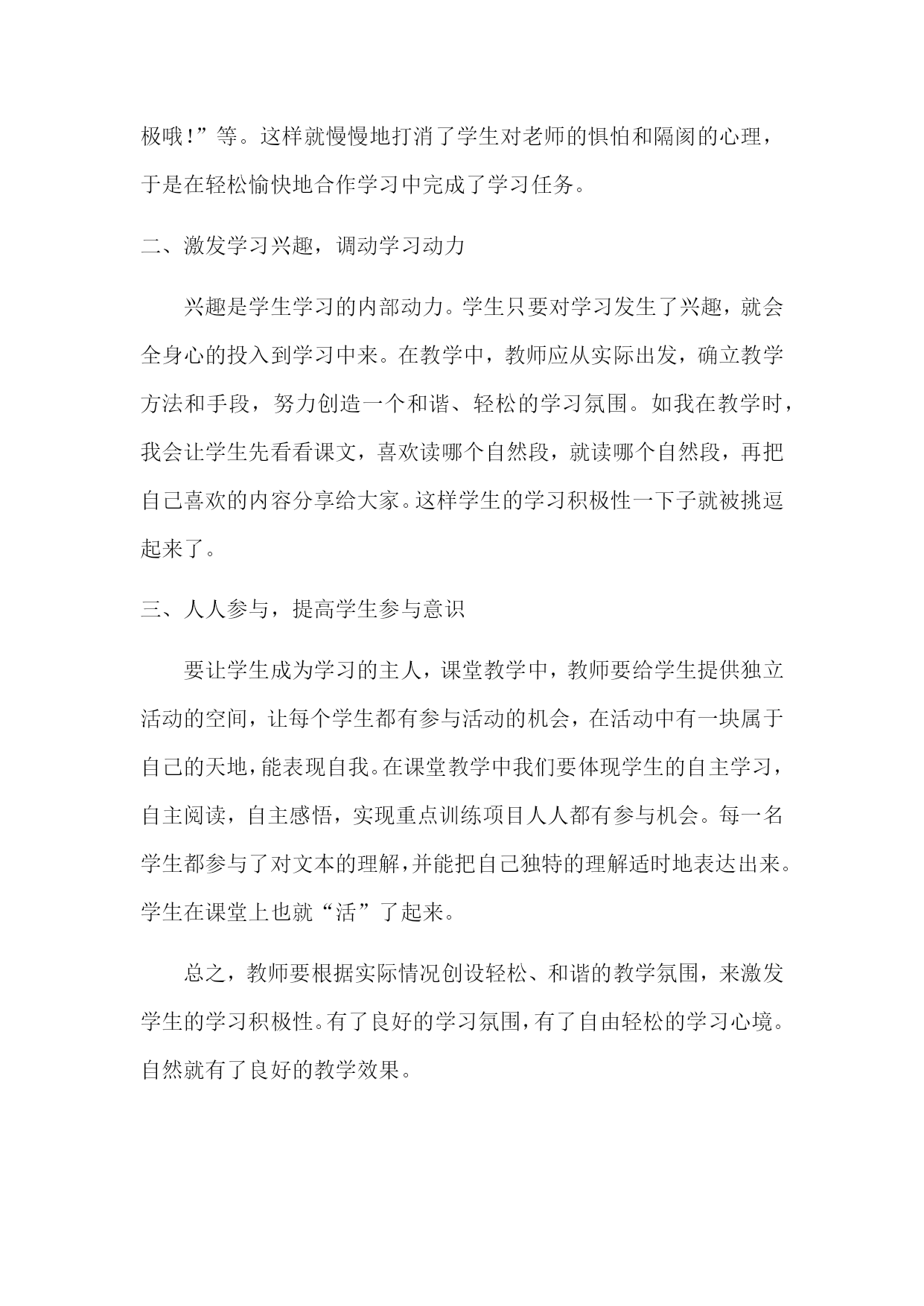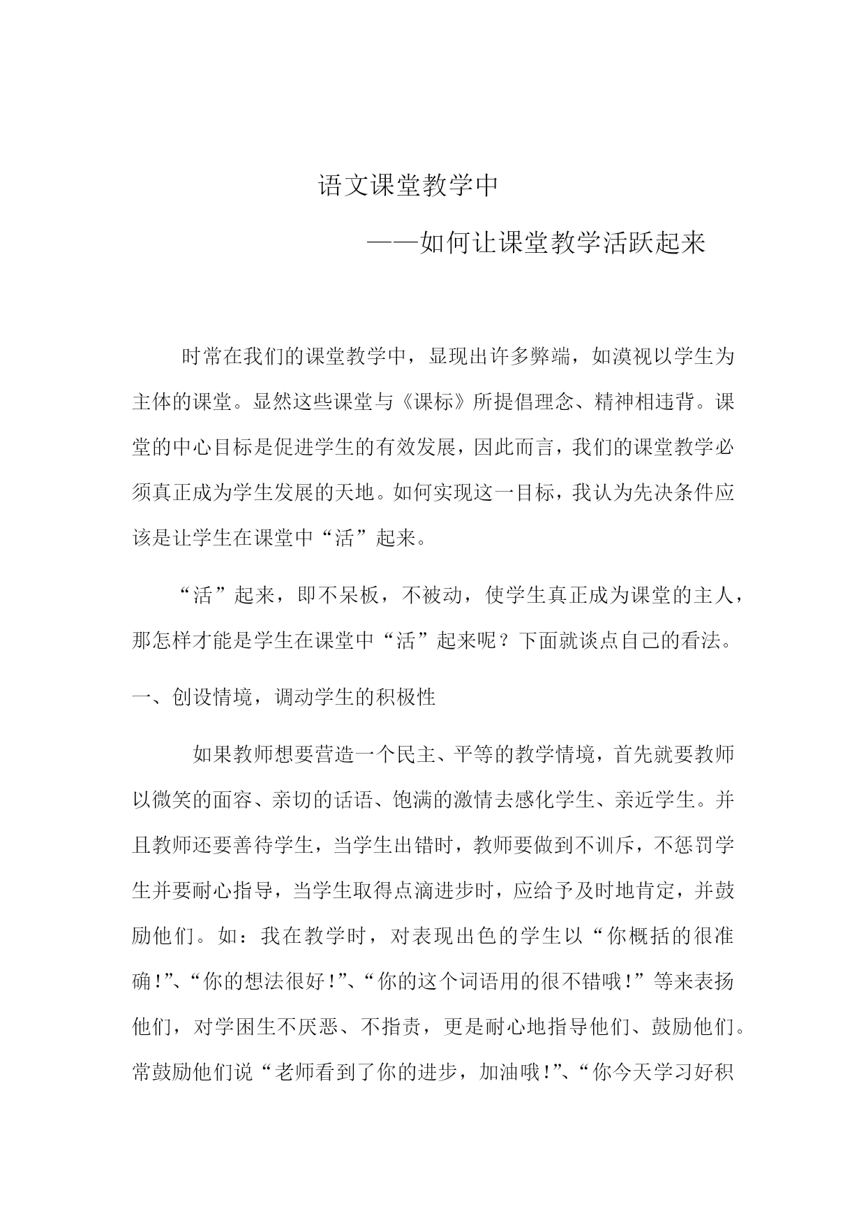 语文课堂教学中 ——如何让课堂教学活跃起来 时常在我们的课堂教学中,显现出许多弊端,如漠视以学生为主体的课堂。显然这些课堂与《课标》所提倡理念、精神相违背。课堂的中心目标是促进学生的有效发展,因此而言,我们的课堂教学必须真正成为学生发展的天地。如何实现这一目标,我认为先决条件应该是让学生在课堂中“活”起来。 “活”起来,即不呆板,不被动,使学生真正成为课堂的主人,那怎样才能是学生在课堂中“活”起来呢?下面就谈点自己的看法。 一、创设情境,调动学生的积极性 如果教师想要营造一个民主、平等的教学情境,首先就要教师以微笑的面容、亲切的话语、饱满的激情去感化学生、亲近学生。并且教师还要善待学生,当学生出错时,教师要做到不训斥,不惩罚学生并要耐心指导,当学生取得点滴进步时,应给予及时地肯定,并鼓励他们。如:我在教学时,对表现出色的学生以“你概括的很准确!”、“你的想法很好!”、“你的这个词语用的很不错哦!”等来表扬他们,对学困生不厌恶、不指责,更是耐心地指导他们、鼓励他们。常鼓励他们说“老师看到了你的进步,加油哦!”、“你今天学习好积极哦!”等。这样就慢慢地打消了学生对老师的惧怕和隔阂的心理,于是在轻松愉快地合作学习中完成了学习任务。 二、激发学习兴趣,调动学习动力 兴趣是学生学习的内部动力。学生只要对学习发生了兴趣,就会全身心的投入到学习中来。在教学中,教师应从实际出发,确立教学方法和手段,努力创造一个和谐、轻松的学习氛围。如我在教学时,我会让学生先看看课文,喜欢读哪个自然段,就读哪个自然段,再把自己喜欢的内容分享给大家。这样学生的学习积极性一下子就被挑逗起来了。 三、人人参与,提高学生参与意识 要让学生成为学习的主人,课堂教学中,教师要给学生提供独立活动的空间,让每个学生都有参与活动的机会,在活动中有一块属于自己的天地,能表现自我。在课堂教学中我们要体现学生的自主学习,自主阅读,自主感悟,实现重点训练项目人人都有参与机会。每一名学生都参与了对文本的理解,并能把自己独特的理解适时地表达出来。学生在课堂上也就“活”了起来。 总之,教师要根据实际情况创设轻松、和谐的教学氛围,来激发学生的学习积极性。有了良好的学习氛围,有了自由轻松的学习心境。自然就有了良好的教学效果。