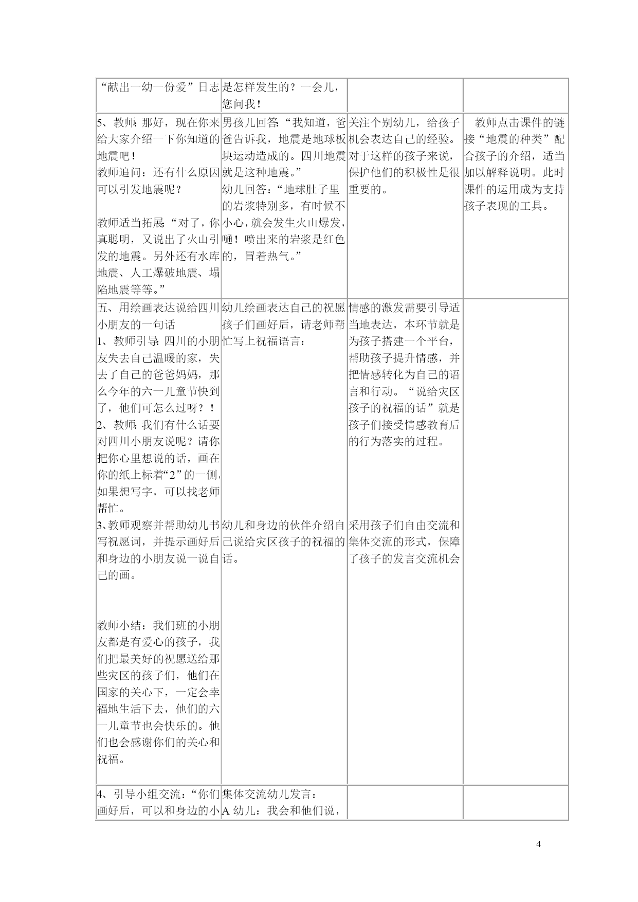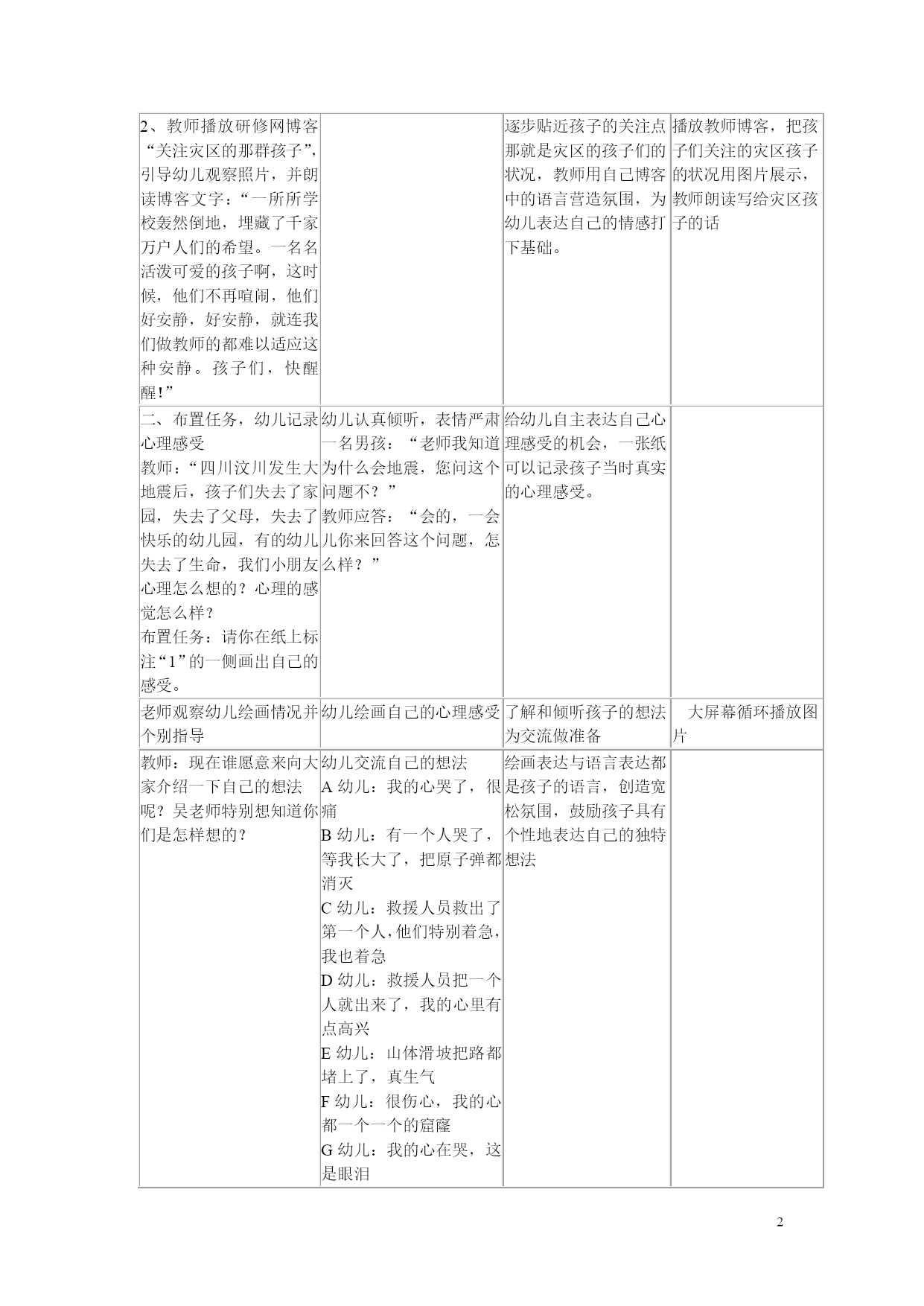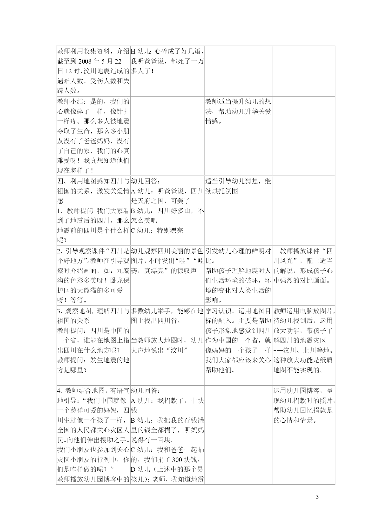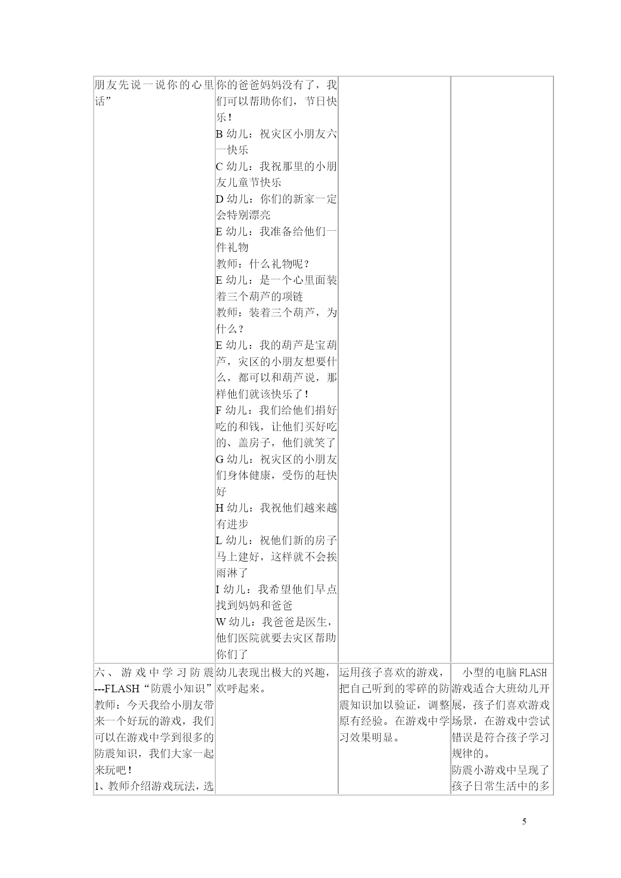 幼儿园大班社会活动《可怕的地震》课堂实录 延庆县第一幼儿园吴连柱 活动班级:延庆县第一幼儿园大二班幼儿:25名活动时间:2016年5月26日 活动内容社会领域活动“可怕的地震” (选自幼儿园大班主题综合活动“地震了”)活动目标1、在谈话和猜想过程中理解适宜的环境对人类的重要意义; 2、运用绘画和语言表达自己真实的感受和情感; 3、初步感知人“活着”和“死亡”活动准备课件“可怕的地震”,地震后的丰富经验,参与捐款的情感体验教学重点能够运用自己的语言方式表达出自己的关爱情感教学难点准确表达自己关爱情感的方法 教学过程实录 教师活动学生活动设计意图信息技术应用教师:今天吴老师又要和大二班的小朋友一起来游戏了,你们高兴吗?吴老师今天可是要考一考你们了,你们怕不怕呀?幼儿情绪很高,积极回答,声音响亮“高兴”“吴老师,我就愿意和你一起玩儿”“我们什么都不怕”活动前与大二班幼儿沟通情感,激发参与活动的积极性和迎接挑战的勇气。 教师:请你按照指令完成任务,先取一张纸对折一次,并在纸的两侧分别标上数字“1”“2”幼儿操作,幼儿折叠和标注速度快,只有一名幼儿在前边写“2”,后边写“1”在准备环节请小朋友按照指令完成任务,学习做记录的方法一、引入主题,激发情感; 教师:今天,我要和小朋友们交流一个非常非常重要的话题,出示课件名称“可怕的地震” 教师:今天我们研究的题目就是“可怕的地震”。那么,地震真的有那么可怕吗?到底地震有多可怕呢? 幼儿观察课件,部分小朋友自主读出自己认识的文字 幼儿集体大声读出“可怕的地震” 大部分幼儿说“可怕”“特别可怕,还能砸死人呢”,只有一个男孩说:“有时候也不可怕” 点明主题,调动幼儿原有经验启动,适当的机会融入汉字认读。 观察幼儿原有经验状况,为下边的引导做准备 播放课件首页,出示文字,文字强化“可怕”和“地震”,画面震撼力强。 1、教师播放视频资料“唐山大地震”“四川汶川地震”,感受地震的残酷性。 幼儿观看视频资料,自由交流,不时发出惊呼声 听着老师的朗诵声,孩子们安静了,不出声地看着画面,有些小女孩和老师一样眼里含着泪水运用网络视频真实的画面震撼孩子心灵,触动情感,引发情绪。 运用网络视频播放“唐山大地震新闻播报”“汶川大地震伤亡统计播报” 2、教师播放研修网博客“关注灾区的那群孩子”,引导幼儿观察照片,并朗读博客文字:“一所所学校轰然倒地,埋藏了千家万户人们的希望。一名名活泼可爱的孩子啊,这时候,他们不再喧闹,他们好安静,好安静,就连我们做教师的都难以适应这种安静。孩子们,快醒醒!”逐步贴近孩子的关注点,那就是灾区的孩子们的状况,教师用自己博客中的语言营造氛围,为幼儿表达自己的情感打下基础。播放教师博客,把孩子们关注的灾区孩子的状况用图片展示,教师朗读写给灾区孩子的话二、布置任务,幼儿记录心理感受 教师:“四川汶川发生大地震后,孩子们失去了家园,失去了父母,失去了快乐的幼儿园,有的幼儿失去了生命,我们小朋友心理怎么想的?心理的感觉怎么样? 布置任务:请你在纸上标注“1”的一侧画出自己的感受。幼儿认真倾听,表情严肃 一名男孩:“老师我知道为什么会地震,您问这个问题不?” 教师应答:“会的,一会儿你来回答这个问题,怎么样?”给幼儿自主表达自己心理感受的机会,一张纸可以记录孩子当时真实的心理感受。老师观察幼儿绘画情况并个别指导幼儿绘画自己的心理感受了解和倾听孩子的想法,为交流做准备大屏幕循环播放图片教师:现在谁愿意来向大家介绍一下自己的想法呢?吴老师特别想知道你们是怎样想的? 教师利用收集资料,介绍截至到2008年5月22日12时,汶川地震造成的遇难人数、受伤人数和失踪人数。幼儿交流自己的想法 A幼儿:我的心哭了,很痛 B幼儿:有一个人哭了,等我长大了,把原子弹都消灭 C幼儿:救援人员救出了第一个人,他们特别着急,我也着急 D幼儿:救援人员把一个人就出来了,我的心里有点高兴 E幼儿:山体滑坡把路都堵上了,真生气 F幼儿:很伤心,我的心都一个一个的窟窿 G幼儿:我的心在哭,这是眼泪 H幼儿:心碎成了好几瓣,我听爸爸说,都死了一万多人了! 绘画表达与语言表达都是孩子的语言,创造宽松氛围,鼓励孩子具有个性地表达自己的独特想法教师小结:是的,我们的心就像碎了一样,像针扎一样疼。那么多人被地震夺取了生命,那么多小朋友没有了爸爸妈妈,没有了自己的家,我们的心真难受呀!我真想知道他们现在怎样了!教师适当提升幼儿的想法,帮助幼儿升华关爱情感。四、利用地图感知四川与祖国的关系,激发关爱情感 1、教师提问:我们大家看到了地震后的四川,那么地震前的四川是个什么样呢?幼儿回答: A幼儿:听爸爸说,四川是天府之国,可美了 B幼儿:四川好多山,不怎么美吧 C幼儿:特别漂亮适当引导幼儿猜想,继续