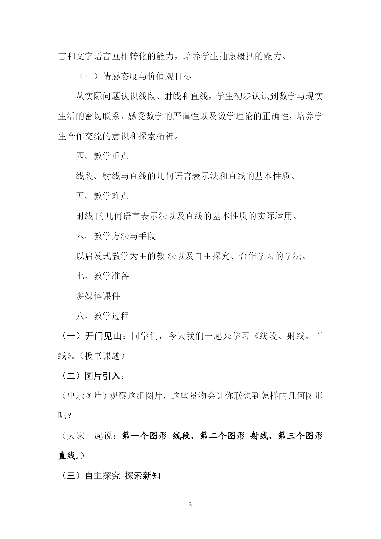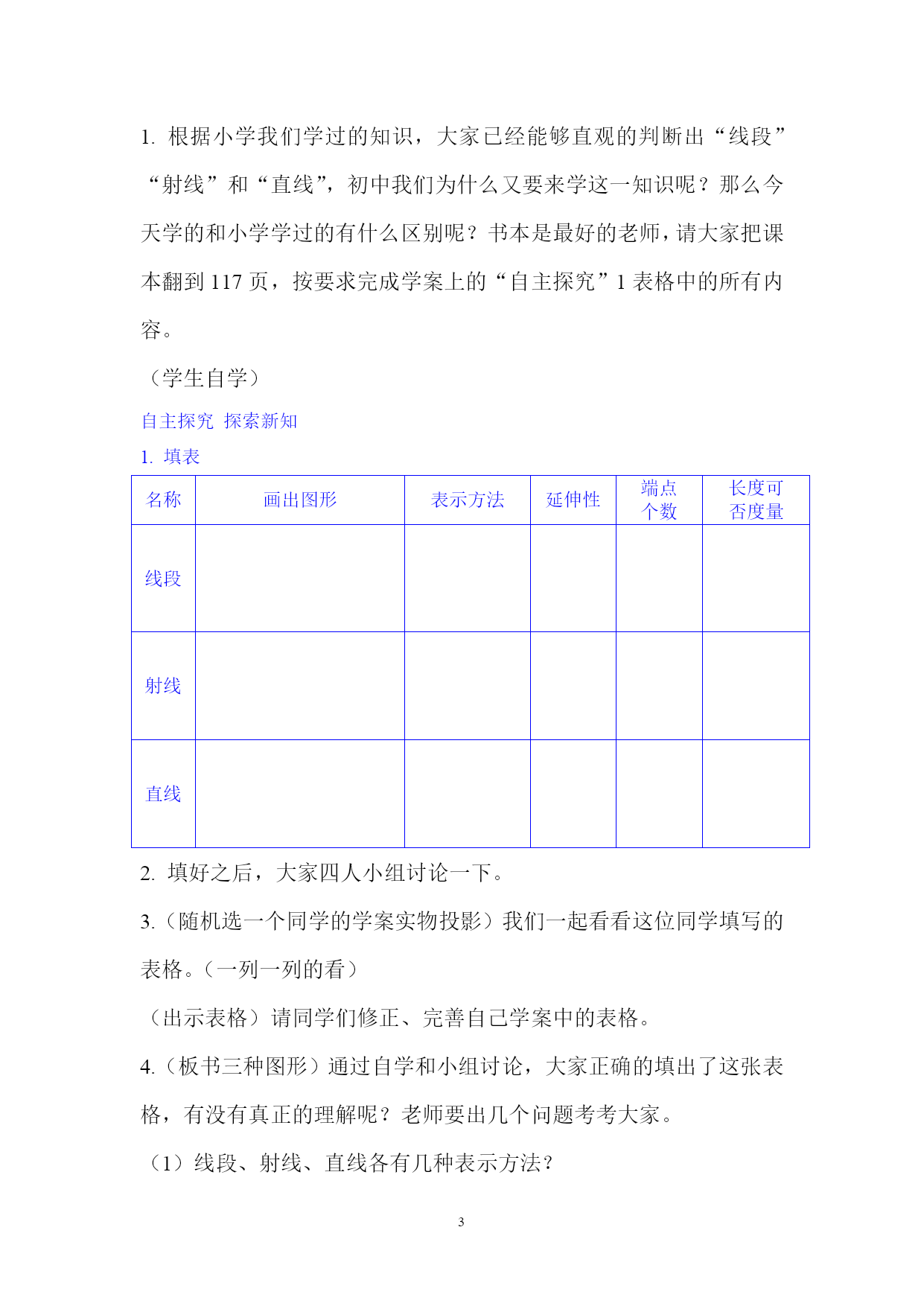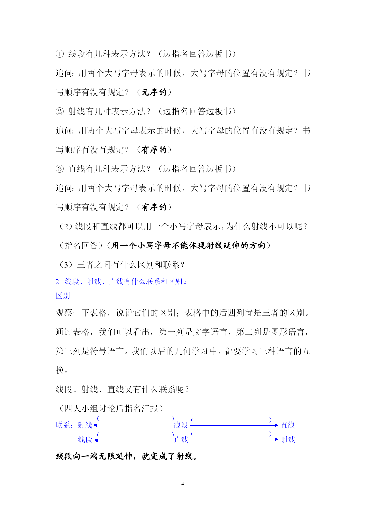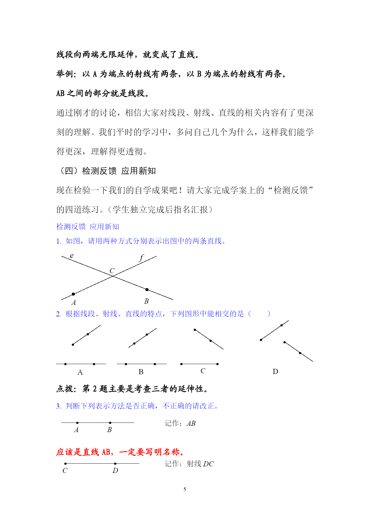 《4.2线段、射线、直线》课堂实录 城东学校李菁 一、教材分析 本节课是湘教版七年级上册第四章第二节,学生在学习本节课之前已经初步认识了线段、射线和直线,本节课进一步学习三者的几何表示方法以及直线的基本性质,它是今后学习几何知识的基础。同时直线的基本性质在人们的生活中有着广泛的应用。无论在知识上,还是解决实际问题的能力上,本节课都起着不容忽视的作用。 二、学情分析 本节课的授课对象是七年级学生。他们活泼好动,充满好奇心,模仿能力较强,具备了一定的学习能力,同时他们爱发表意见,希望得到老师和同学的关注,所以在教学中应充分创造条件和机会,让学生发表自己独立的见解,充分体现学生学习的主体性。学生此前初步认识了线段、射线与直线,但他们对正确使用几何语言表示线段、射线与直线存在困难,因此需要教师的引导。 三、教学目标 (一)知识与技能目标 1.掌握线段、射线与直线的几何语言表示方法; 2.理解直线、射线、线段的联系与区别; 3.能运用直线的基本性质解决实际问题。 (二)过程与方法目标 通过对知识的建构,初步培养学生观察、类比、归纳以及几何语言和文字语言互相转化的能力,培养学生抽象概括的能力。 (三)情感态度与价值观目标 从实际问题认识线段、射线和直线,学生初步认识到数学与现实生活的密切联系,感受数学的严谨性以及数学理论的正确性,培养学生合作交流的意识和探索精神。 四、教学重点 线段、射线与直线的几何语言表示法和直线的基本性质。 五、教学难点 射线的几何语言表示法以及直线的基本性质的实际运用。 六、教学方法与手段 以启发式教学为主的教法以及自主探究、合作学习的学法。 七、教学准备 多媒体课件。 八、教学过程 (一)开门见山:同学们,今天我们一起来学习《线段、射线、直线》。(板书课题) (二)图片引入: (出示图片)观察这组图片,这些景物会让你联想到怎样的几何图形呢? (大家一起说:第一个图形线段,第二个图形射线,第三个图形直线。) (三)自主探究探索新知 1.根据小学我们学过的知识,大家已经能够直观的判断出“线段”“射线”和“直线”,初中我们为什么又要来学这一知识呢?那么今天学的和小学学过的有什么区别呢?书本是最好的老师,请大家把课本翻到117页,按要求完成学案上的“自主探究”1表格中的所有内容。 (学生自学) 自主探究探索新知 1.填表 名称画出图形表示方法延伸性端点 个数长度可 否度量线段射线直线2.填好之后,大家四人小组讨论一下。 3.(随机选一个同学的学案实物投影)我们一起看看这位同学填写的表格。(一列一列的看) (出示表格)请同学们修正、完善自己学案中的表格。 4.(板书三种图形)通过自学和小组讨论,大家正确的填出了这张表格,有没有真正的理解呢?老师要出几个问题考考大家。 (1)线段、射线、直线各有几种表示方法? ①线段有几种表示方法?(边指名回答边板书) 追问:用两个大写字母表示的时候,大写字母的位置有没有规定?书写顺序有没有规定?(无序的) ②射线有几种表示方法?(边指名回答边板书) 追问:用两个大写字母表示的时候,大写字母的位置有没有规定?书写顺序有没有规定?(有序的) ③直线有几种表示方法?(边指名回答边板书) 追问:用两个大写字母表示的时候,大写字母的位置有没有规定?书写顺序有没有规定?(有序的) (2)线段和直线都可以用一个小写字母表示,为什么射线不可以呢? (指名回答)(用一个小写字母不能体现射线延伸的方向) (3)三者之间有什么区别和联系? 2.线段、射线、直线有什么联系和区别? 区别 观察一下表格,说说它们的区别;表格中的后四列就是三者的区别。 通过表格,我们可以看出,第一列是文字语言,第二列是图形语言,第三列是符号语言。我们以后的几何学习中,都要学习三种语言的互换。 线段、射线、直线又有什么联系呢? () () (四人小组讨论后指名汇报) () () 联系:射线线段直线 线段直线射线 线段向一端无限延伸,就变成了射线。 线段向两端无限延伸,就变成了直线。 举例:以A为端点的射线有两条,以B为端点的射线有两条。 AB之间的部分就是线段。 通过刚才的讨论,相信大家对线段、射线、直线的相关内容有了更深刻的理解。我们平时的学习中,多问自己几个为什么,这样我们能学得更深,理解得更透彻。 (四)检测反馈应用新知 现在检验一下我们的自学成果吧!请大家完成学案上的“检测反馈”的四道练习。(学生独立完成后指名汇报) 检测反馈应用新知 A B · · C e f 1.如图,请用两种方式分别表示出图中的两条直线。 · · · · D C B A · · · · · · · · · · · · 2.根据线段、射线、直线的特点,下列图形中能相交的是() 点拨:第2题主要是考查三者的延伸性。 · · A