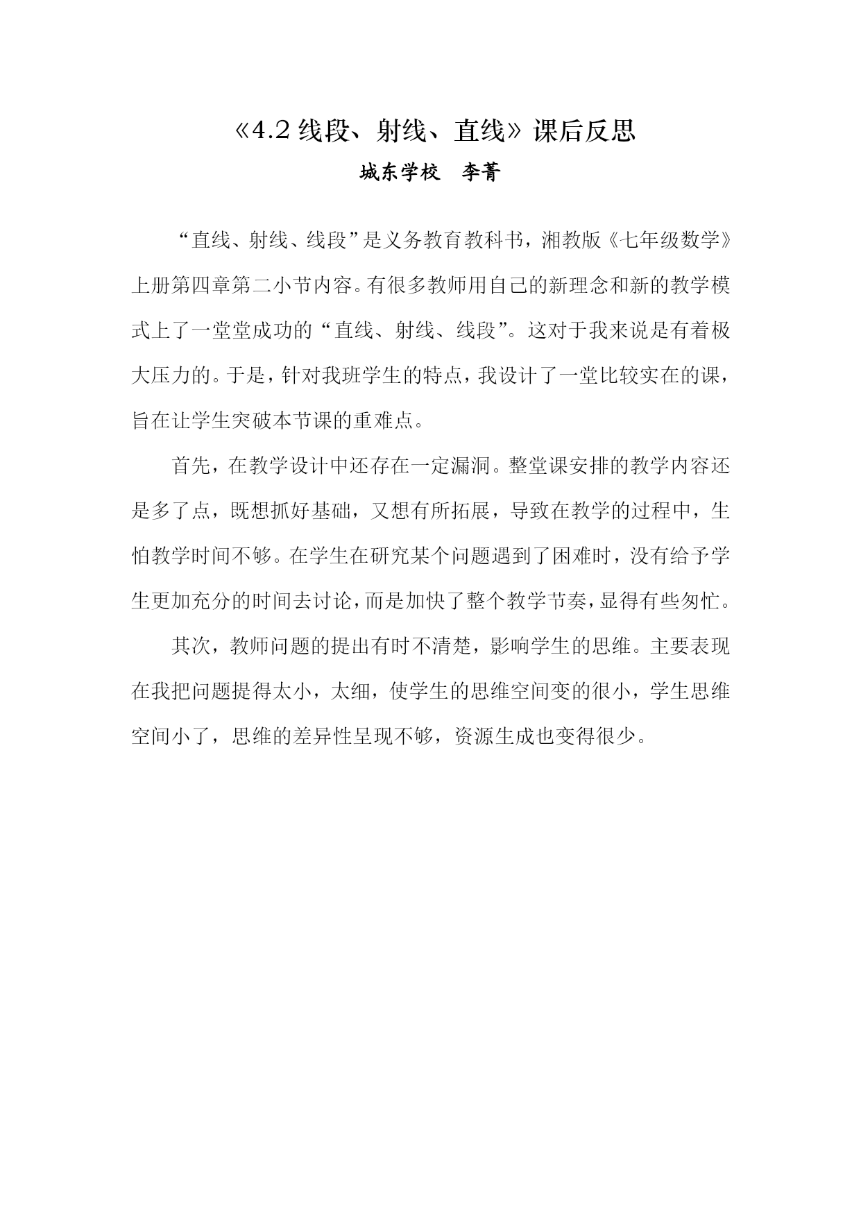 《4.2线段、射线、直线》课后反思 城东学校李菁 “直线、射线、线段”是义务教育教科书,湘教版《七年级数学》上册第四章第二小节内容。有很多教师用自己的新理念和新的教学模式上了一堂堂成功的“直线、射线、线段”。这对于我来说是有着极大压力的。于是,针对我班学生的特点,我设计了一堂比较实在的课,旨在让学生突破本节课的重难点。 首先,在教学设计中还存在一定漏洞。整堂课安排的教学内容还是多了点,既想抓好基础,又想有所拓展,导致在教学的过程中,生怕教学时间不够。在学生在研究某个问题遇到了困难时,没有给予学生更加充分的时间去讨论,而是加快了整个教学节奏,显得有些匆忙。 其次,教师问题的提出有时不清楚,影响学生的思维。主要表现在我把问题提得太小,太细,使学生的思维空间变的很小,学生思维空间小了,思维的差异性呈现不够,资源生成也变得很少。