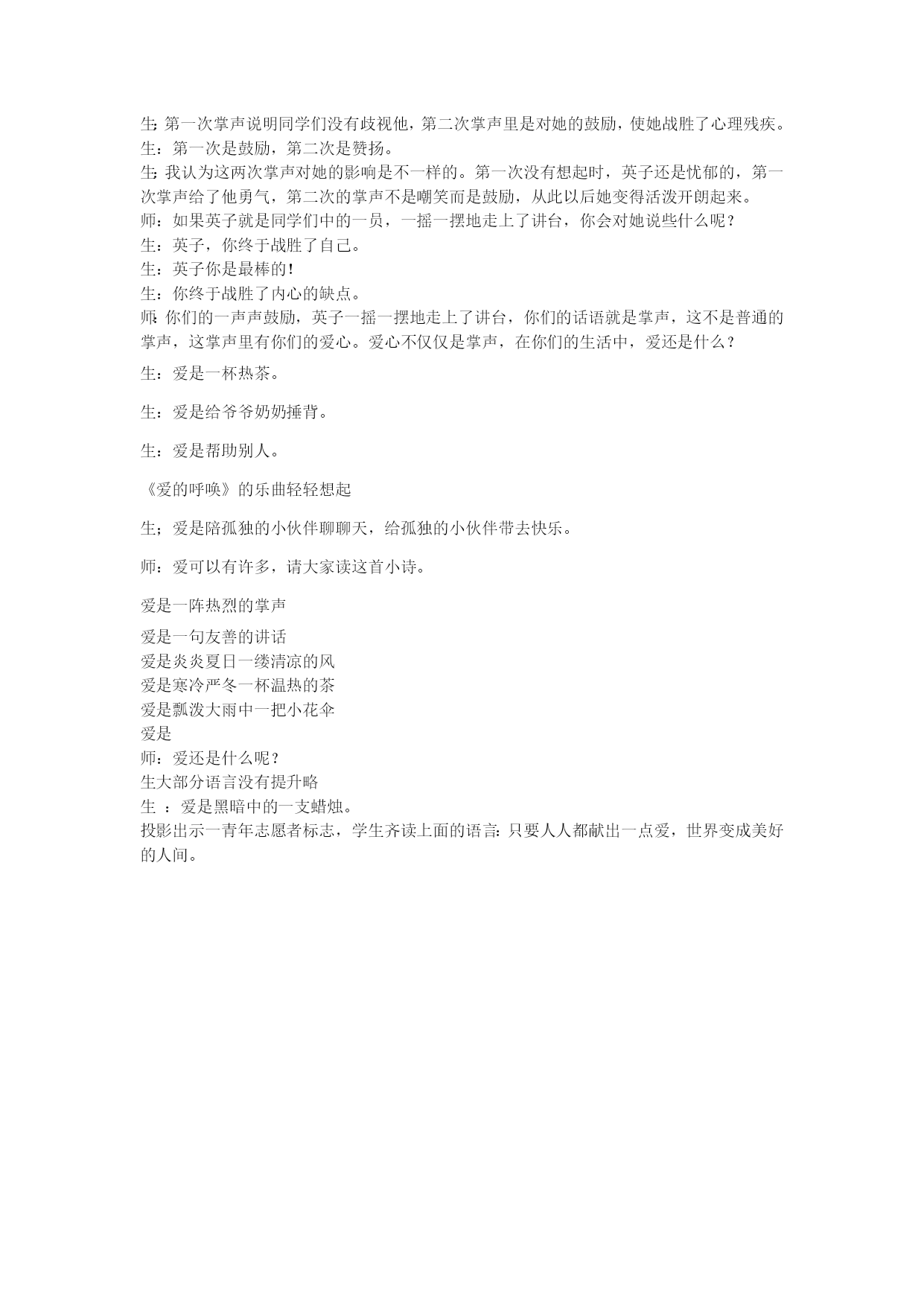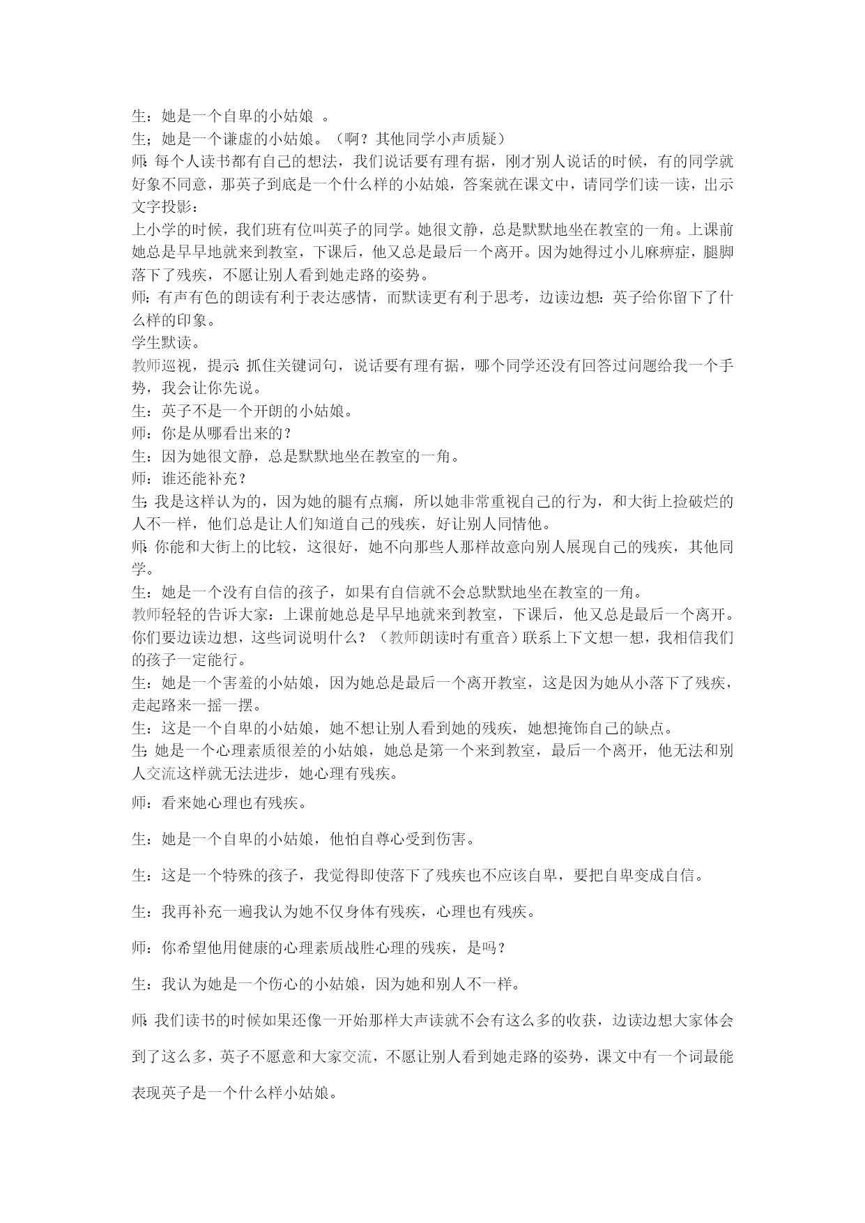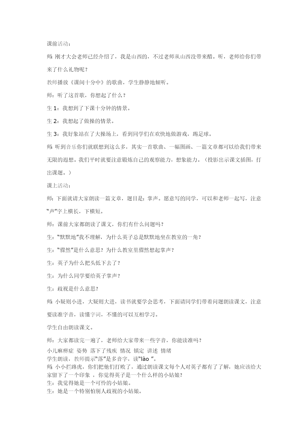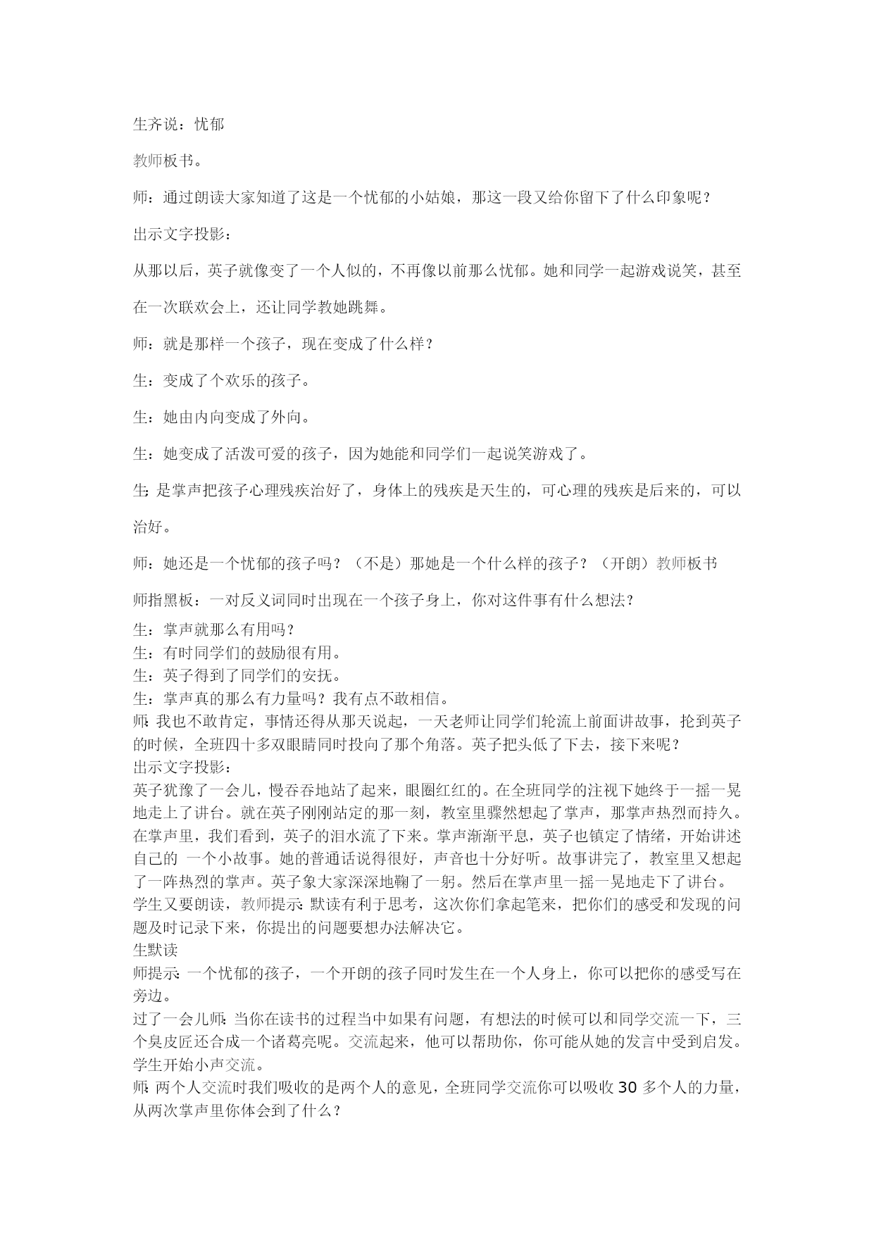 课前HYPERLINK"http://www.teachercn.com/Kcgg/Hdkc/"\t"_blank"活动:师:刚才大会老师已经介绍了,我是山西的,不过老师从山西没带来醋。听,老师给你们带来了什么礼物呢?HYPERLINK"http://WWW.teachercn.com"\t"_blank"教师播放《课间十分中》的歌曲,学生静静地倾听。师:听了这首歌,你想起了什么?生1:我想到了下课十分钟的情景。生2:我想起了做操的情景。生3:我好象站在了大操场上,看到同学们在欢快地做游戏,踢足球。师:听到HYPERLINK"http://www.teachercn.com/Jylw/YinYueLunWen/"\t"_blank"音乐你们就联想到这么多,其实一首歌曲、一幅图画、一篇文章都可以给我们带来无限的遐想。我们平时就要注意锻炼自己的观察能力,想象能力。(投影出示课文插图,打出课题。)课上HYPERLINK"http://www.teachercn.com/Kcgg/Hdkc/"\t"_blank"活动:师:下面就请大家朗读一篇文章,题目是:掌声。愿意写的同学,可以和老师一起写,注意“声”字上横长,下横短。师:课前大家都朗读了课文,你们有什么问题吗?生:“默默地”我不理解,为什么英子总是默默地坐在教室的一角?生:“骤然”是什么意思?为什么教室里骤然想起掌声?生:英子为什么把头低下去了?生:为什么同学要给英子掌声?生:歧视是什么意思?师:小疑则小进,大疑则大进,读书就要学会思考,下面请同学们带着问题朗读课文,注意要读准字音,读懂HYPERLINK"http://www.teachercn.com/Xxyw/Zc/"\t"_blank"字词,不懂的可以互相学习。学生自由朗读课文。师:大家都读完一遍了,老师给大家带来一些字音,你能读准吗? 小儿麻痹症姿势落下了残疾情况镇定讲述情绪学生朗读,HYPERLINK"http://WWW.teachercn.com"\t"_blank"教师提示“落”是多音字,读“lào”。师;小小拦路虎,你们把他们打败了,通过朗读课文每个人对英子都有了了解,她应该给大家留下了一个印象,你觉得英子是一个什么样的小姑娘?生:我觉得她是一个可怜的小姑娘。生:她是一个特别怕别人歧视的小姑娘。生:她是一个自卑的小姑娘。生;她是一个谦虚的小姑娘。(啊?其他同学小声质疑)师:每个人读书都有自己的想法,我们说话要有理有据,刚才别人说话的时候,有的同学就好象不同意,那英子到底是一个什么样的小姑娘,答案就在课文中,请同学们读一读,出示文字投影:上小学的时候,我们班有位叫英子的同学。她很文静,总是默默地坐在教室的一角。上课前她总是早早地就来到教室,下课后,他又总是最后一个离开。因为她得过小儿麻痹症,腿脚落下了残疾,不愿让别人看到她走路的姿势。师:有声有色的朗读有利于表达感情,而默读更有利于思考,边读边想:英子给你留下了什么样的印象。学生默读。HYPERLINK"http://WWW.teachercn.com"\t"_blank"教师巡视,提示:抓住关键词句,说话要有理有据,哪个同学还没有回答过问题给我一个手势,我会让你先说。生:英子不是一个开朗的小姑娘。师:你是从哪看出来的?生:因为她很文静,总是默默地坐在教室的一角。师:谁还能补充?生:我是这样认为的,因为她的腿有点瘸,所以她非常重视自己的行为,和大街上捡破烂的人不一样,他们总是让人们知道自己的残疾,好让别人同情他。师:你能和大街上的比较,这很好,她不向那些人那样故意向别人展现自己的残疾,其他同学。生:她是一个没有自信的孩子,如果有自信就不会总默默地坐在教室的一角。HYPERLINK"http://WWW.teachercn.com"\t"_blank"教师轻轻的告诉大家:上课前她总是早早地就来到教室,下课后,他又总是最后一个离开。你们要边读边想,这些词说明什么?(HYPERLINK"http://WWW.teachercn.com"\t"_blank"教师朗读时有重音)联系上下文想一想,我相信我们的孩子一定能行。生:她是一个害羞的小姑娘,因为她总是最后一个离开教室,这是因为她从小落下了残疾,走起路来一摇一摆。生:这是一个自卑的小姑娘,她不想让别人看到她的残疾,她想掩饰自己的缺点。生:她是一个心理素质很差的小姑娘,她总是第一个来到教室,最后一个离开,他无法和别人HYPERLINK"http://www.caidown.cn/"\t"_blank"交流这样就无法进步,她心理有残疾。 师:看来她心理也有残疾。生:她是一个自卑的小姑娘,他怕自尊心受到伤害。生:这是一个特殊的孩子,我觉得即使落下了残疾也不应该自卑,要把