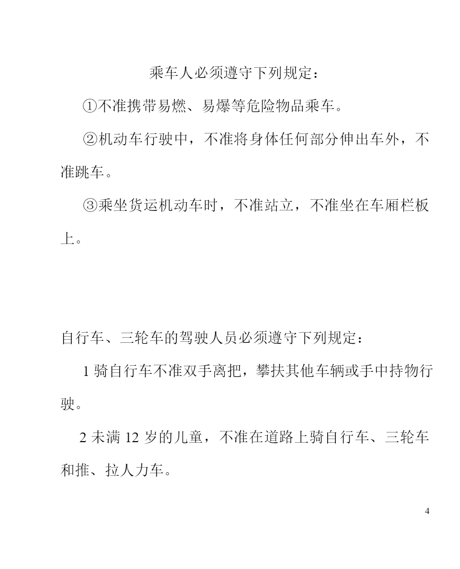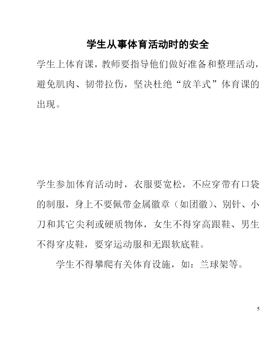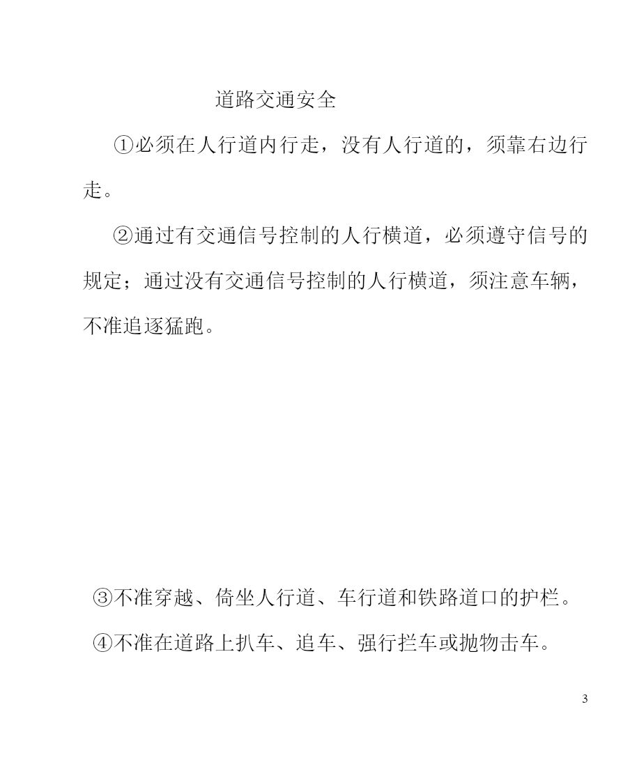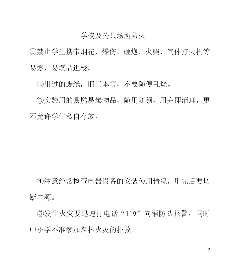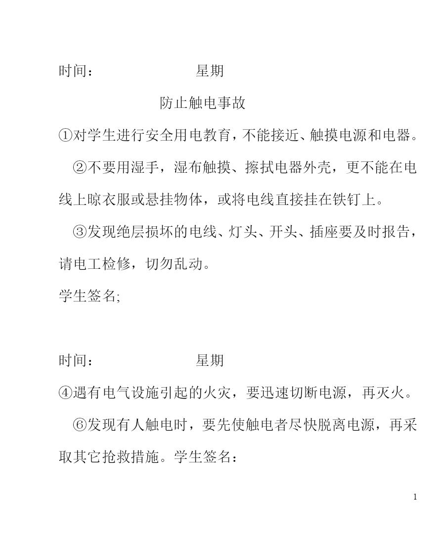 时间:星期 防止触电事故 ①对学生进行安全用电教育,不能接近、触摸电源和电器。 ②不要用湿手,湿布触摸、擦拭电器外壳,更不能在电线上晾衣服或悬挂物体,或将电线直接挂在铁钉上。 ③发现绝层损坏的电线、灯头、开头、插座要及时报告,请电工检修,切勿乱动。 学生签名; 时间:星期 ④遇有电气设施引起的火灾,要迅速切断电源,再灭火。 ⑥发现有人触电时,要先使触电者尽快脱离电源,再采取其它抢救措施。学生签名: 学校及公共场所防火 ①禁止学生携带烟花、爆伤、砸炮、火柴、气体打火机等易燃、易爆品进校。 ②用过的废纸,旧书本等,不要随便乱烧。 ③实验用的易燃易爆物品,随用随领,用完即清理,更不允许学生私自存放。 ④注意经常检查电器设备的安装使用情况,用完后要切断电源。 ⑤发生火灾要迅速打电话“119”向消防队报警,同时中小学不准参加森林火灾的扑救。 道路交通安全 ①必须在人行道内行走,没有人行道的,须靠右边行走。 ②通过有交通信号控制的人行横道,必须遵守信号的规定;通过没有交通信号控制的人行横道,须注意车辆,不准追逐猛跑。 ③不准穿越、倚坐人行道、车行道和铁路道口的护栏。 ④不准在道路上扒车、追车、强行拦车或抛物击车。 乘车人必须遵守下列规定: ①不准携带易燃、易爆等危险物品乘车。 ②机动车行驶中,不准将身体任何部分伸出车外,不准跳车。 ③乘坐货运机动车时,不准站立,不准坐在车厢栏板上。 自行车、三轮车的驾驶人员必须遵守下列规定: 1骑自行车不准双手离把,攀扶其他车辆或手中持物行驶。 2未满12岁的儿童,不准在道路上骑自行车、三轮车和推、拉人力车。 学生从事体育活动时的安全 学生上体育课,教师要指导他们做好准备和整理活动,避免肌肉、韧带拉伤,坚决杜绝“放羊式”体育课的出现。 学生参加体育活动时,衣服要宽松,不应穿带有口袋的制服,身上不要佩带金属徽章(如团徽)、别针、小刀和其它尖利或硬质物体,女生不得穿高跟鞋、男生不得穿皮鞋,要穿运动服和无跟软底鞋。 学生不得攀爬有关体育设施,如:兰球架等。 如何防止触电 对学生进行安全用电教育,不能接近、触摸电源和电器。 不要用湿手,湿布触摸、擦拭电器外壳,更不能在电线上晾衣服或悬挂物体,或将电线直接挂在铁钉上。 发现绝层损坏的电线、灯头、开头、插座要及时报告,请电工检修,切勿乱动。电工对消除以上安全隐患要及时不得推脱。 如何防止触电 学生不得在配电房、变压器周围逗留,更不能攀爬变压器,不得把其他物体抛向变压器及配电房内,不得乱动电气设备。 万一遇有电气设施引起的火灾,要迅速切断电源,然后再灭火。 有人触电时,要先使触电者尽快脱离电源,再采取其它抢救措施。 如何防止火灾的发生 禁止学生携带烟花、爆竹、砸炮、火柴、气体打火机等易燃、易爆品进校。 用过的废纸,旧书本等,不要随便乱烧。如非烧不可时,也要远离建筑物,并要有专人负责看守,等余火完全熄来后再离开现场。 实验用的易燃易爆物品,要在专门库房存放,随用随领,用完即清理,不要在现场存放,更不允许学生私自存放。 如何防止火灾的发生 注意经常检查电器设备的安装使用情况,用完后要切断电源。 伙房、锅炉房、库房、实验室要按照有关防火规定使用。 生产劳动中,坚决禁止学生在山林玩火。 发生火灾要迅速打电话“119”向消防队报警。 如何遵守交通安全 行人必须遵守下列规定: 必须在人行道内行走,没有人行道的,须靠右边行走。 通过有交通信号控制的人行横道,必须遵守信号的规定;通过没有交通信号控制的人行横道,须注意车辆,不准追逐猛跑。 没有人行横道的,须直行通过,不准在车辆临近时突然横穿。 不准穿越、倚坐人行道、车行道和铁路道口的护栏。 如何遵守交通安全 ④不准在道路上扒车、追车、强行拦车或抛物击车。 ⑤列队通过道路时,每横队不准超过2人。且须靠车行道的右边行进;列队横过车行道时,须从人行横道迅速通过;没有人行横道的,须直行通过;长列队伍在必须时可能暂时中断通行。 防止触电事故 ①对学生进行安全用电教育,不能接近、触摸电源和电器。 ②不要用湿手,湿布触摸、擦拭电器外壳,更不能在电线上晾衣服或悬挂物体,或将电线直接挂在铁钉上。 ③发现绝层损坏的电线、灯头、开头、插座要及时报告,请电工检修,切勿乱动。电工对消除以上安全隐患要及时不得推脱。 ④学生不得在配电房、变压器周围逗留,更不能攀爬变压器,不得把其他物体抛向变压器及配电房内,不得乱动电气设备。 ⑤遇有电气设施引起的火灾,要迅速切断电源,再灭火。 ⑥发现有人触电时,要先使触电者尽快脱离电源,再采取其它抢救措施。 学校及公共场所防火 ①禁止学生携带烟花、爆伤、砸炮、火柴、气体打火机等易燃、易爆品进校。 ②用过的废纸,旧书本等,