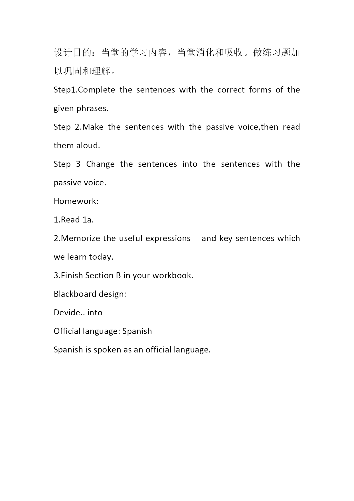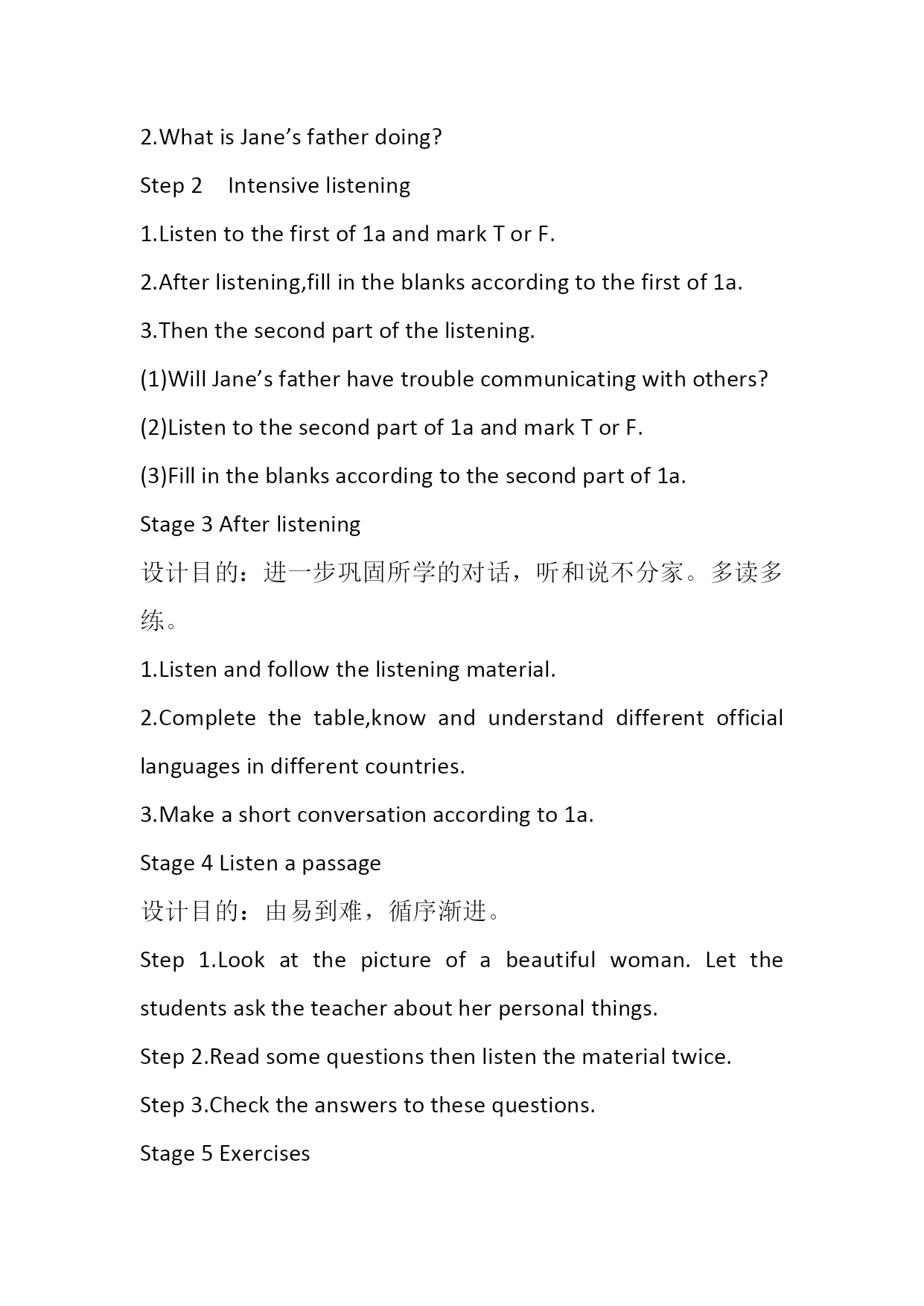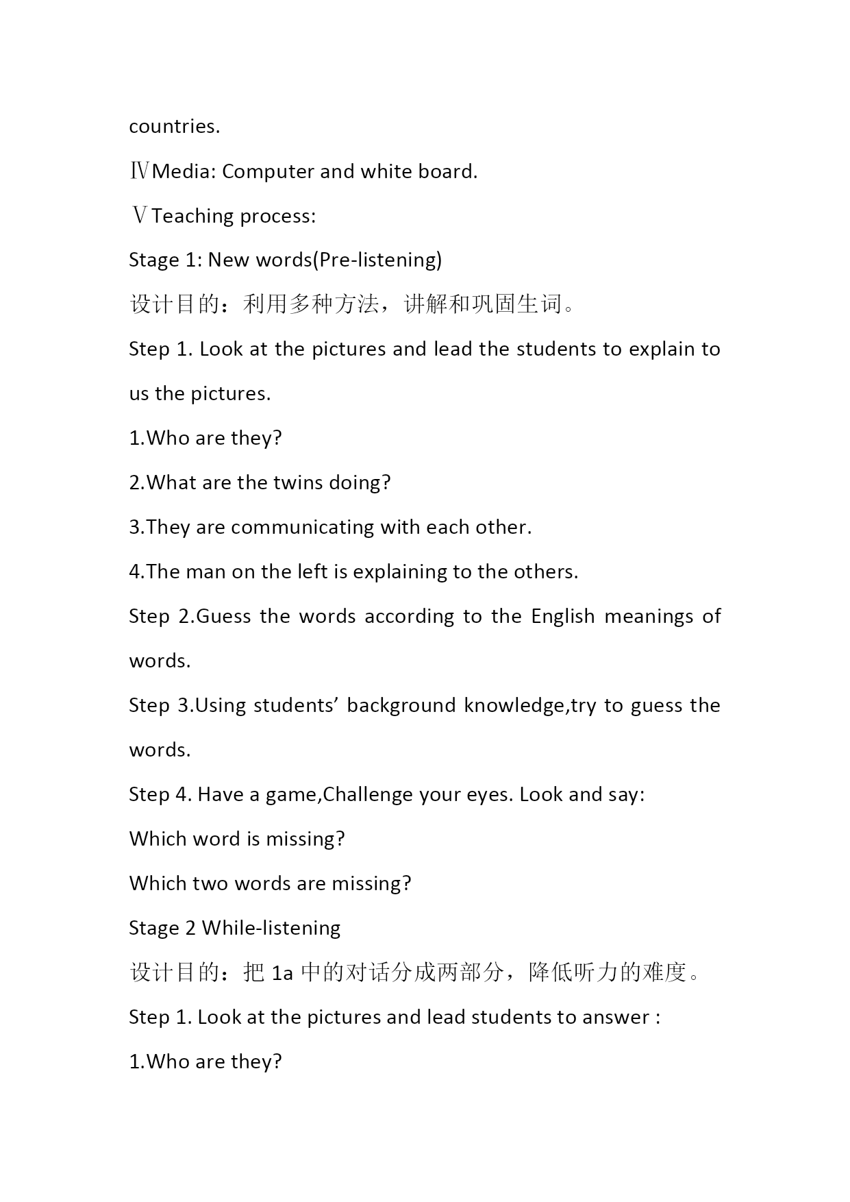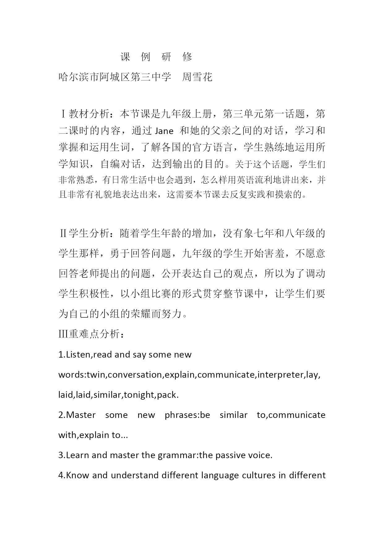 课例研修 哈尔滨市阿城区第三中学周雪花 Ⅰ教材分析:本节课是九年级上册,第三单元第一话题,第二课时的内容,通过Jane和她的父亲之间的对话,学习和掌握和运用生词,了解各国的官方语言,学生熟练地运用所学知识,自编对话,达到输出的目的。关于这个话题,学生们非常熟悉,有日常生活中也会遇到,怎么样用英语流利地讲出来,并且非常有礼貌地表达出来,这需要本节课去反复实践和摸索的。 Ⅱ学生分析:随着学生年龄的增加,没有象七年和八年级的学生那样,勇于回答问题,九年级的学生开始害羞,不愿意回答老师提出的问题,公开表达自己的观点,所以为了调动学生积极性,以小组比赛的形式贯穿整节课中,让学生们要为自己的小组的荣耀而努力。 Ⅲ重难点分析: Listen,readandsaysomenew words:twin,conversation,explain,communicate,interpreter,lay, laid,laid,similar,tonight,pack. Mastersomenewphrases:besimilarto,communicatewith,explainto... Learnandmasterthegrammar:thepassivevoice. Knowandunderstanddifferentlanguageculturesindifferentcountries. ⅣMedia:Computerandwhiteboard. ⅤTeachingprocess: Stage1:Newwords(Pre-listening) 设计目的:利用多种方法,讲解和巩固生词。 Step1.Lookatthepicturesandleadthestudentstoexplaintousthepictures. Whoarethey? Whatarethetwinsdoing? Theyarecommunicatingwitheachother. Themanontheleftisexplainingtotheothers. Step2.GuessthewordsaccordingtotheEnglishmeaningsofwords. Step3.Usingstudents’backgroundknowledge,trytoguessthewords. Step4.Haveagame,Challengeyoureyes.Lookandsay: Whichwordismissing? Whichtwowordsaremissing? Stage2While-listening 设计目的:把1a中的对话分成两部分,降低听力的难度。 Step1.Lookatthepicturesandleadstudentstoanswer: 1.Whoarethey? 2.WhatisJane’sfatherdoing? Step2Intensivelistening Listentothefirstof1aandmarkTorF. Afterlistening,fillintheblanksaccordingtothefirstof1a. Thenthesecondpartofthelistening. WillJane’sfatherhavetroublecommunicatingwithothers? (2)Listentothesecondpartof1aandmarkTorF. (3)Fillintheblanksaccordingtothesecondpartof1a. Stage3Afterlistening 设计目的:进一步巩固所学的对话,听和说不分家。多读多练。 Listenandfollowthelisteningmaterial. Completethetable,knowandunderstanddifferentofficiallanguagesindifferentcountries. Makeashortconversationaccordingto1a. Stage4Listenapassage 设计目的:由易到难,循序渐进。 Step1.Lookatthepictureofabeautifulwoman.Letthestudentsasktheteacheraboutherpersonalthings. Step2.Readsomequestionsthenlistenthematerialtwice. Step3.Checktheanswerstothesequestions. Stage5Exercises 设计目的:当堂的学习内容,当堂消化和吸收。做练习题加以巩固和理解。 Step1.Completethese