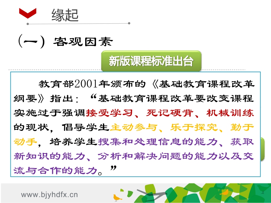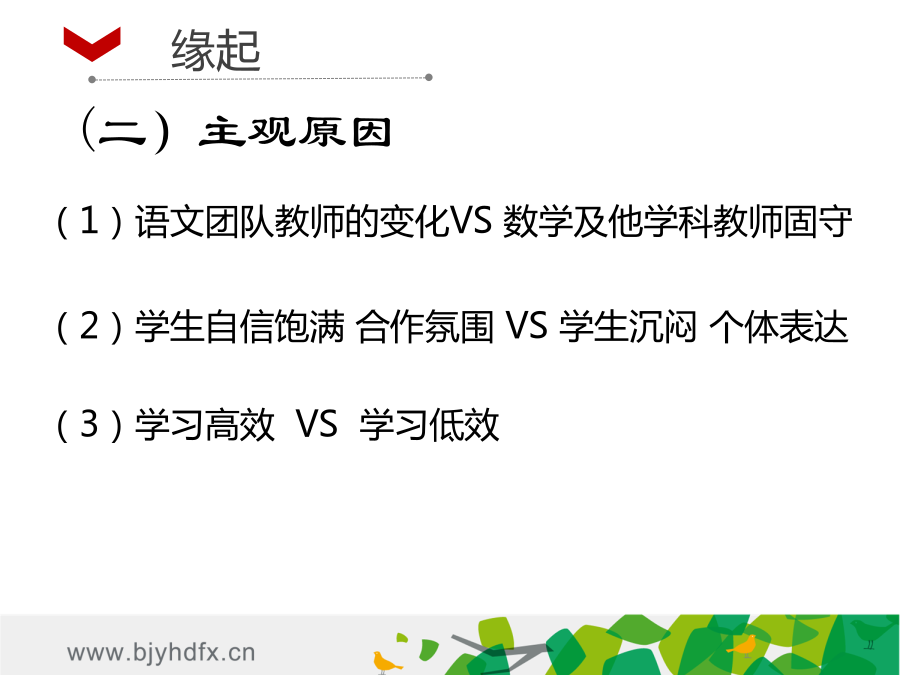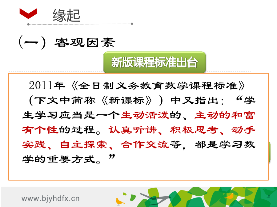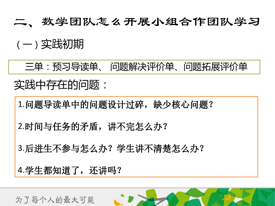 二、数学团队怎么开展小组合作团队学习整体阅读和梳理,了解“教材呈现的了哪些内容,为什么要这样呈现,初步读懂教材设计的内容、编排线索,初步领会教材编写意图,明确这节课“学什么,教什么”。(二)改变怎样学 怎样教记录课前思考1.变化后的教材,我们怎么用?2.面对教与学方式的变革,我们怎样改变?设计前置性学习方案课堂探究前移课前探究当看到有学生在前置性学习中提出“想进一步研究圆周率是怎样得到的?说明对圆周率的意义并不清楚。 对教材进行重组 1.认识圆的周长,体会圆的周长与直径之间的关系,理解圆周率的意义,推导圆周长的计算公式。 2.通过数据的收集和分析过程,经历数学再创造过程,提高学生归纳推理的能力和解决问题的能力。 3.发展科学的研究态度和反思意识,感受数学的文化价值,体会科学严谨的探究精神。 四、教学过程:圆周长与直径有关系 真探究之一: 周长与直径有关系,有什么关系? 改变直接告诉有圆周长除以直径 体会为什么是除的关系? 知其然还要知其所以然 小组合作学习单 研究主题:探究圆的周长与直径的关系 计算观察数据 你们有什么新的发现? 当学生发现虽然商都不同,但不同中有相同,都是3倍多一些。 几何画板刘徽的割圆术 揭示圆周率,学生的兴趣点、探究欲望得到满足,使学生感受周长除以直径的结果能够更精确,从而体验数学的文化的深厚及坚持不懈的探究精神。 让“学习”发生在学生真正需要的地方前置性学习强调教师在学生思维的“最近发展区”设计学习内容,学生自主或团队备学后“最近发展区”就转化为“最近学习工作区”,学生用自己已有的知识、经验、判断力去解决问题,完成新任务。课堂上面对适度的学习困难,再次亲历数学情境,促进学生独立思考、小组合作完成学习任务。 如:《24时计时法》 1.收集三个不同场所的作息时间。 2.说说为什么要这样表达作息时间,试着把上面的作息时间换成一种方式表达。 3.关于时间的表达,提出三个问题在小组内讨论。 如:《小数的初步认识》 1.逛逛超市,收集生活中的小数。 2.试着读一读、写一写收集来的小数 3.关于小数,提出三个有价值的数学问题在班级内讨论。如:《分数的再认识》 1.你们对分数已有哪些了解。 2.用自己的方式表示是三个分数,看谁最有创意。 3.对于分数问题,请写出三条友情提醒。如:《三角形边的关系》 1.用9条长短不同的小棒或纸条代替,分别标上标号与长度。围三角形,其中哪三条线段能围成三角形?你一共能围几个? 2.不能围成的三角形的3条线段之间有什么关系。 3.经过尝试,你发现了什么?请把你的发现记录下来,并演示给小组同学。 4.提出三个数学问题在小组内进行讨论。