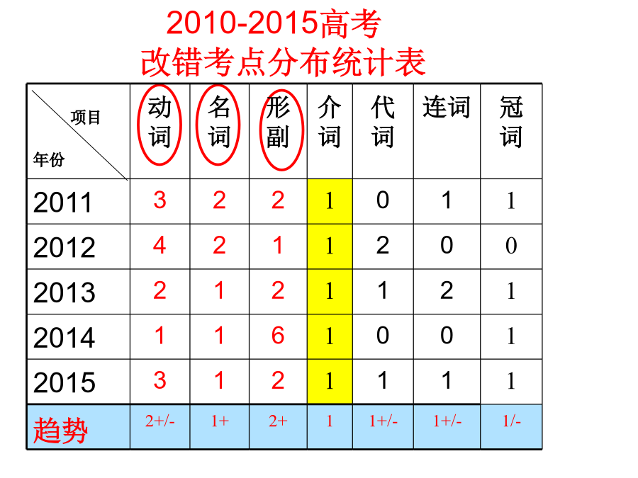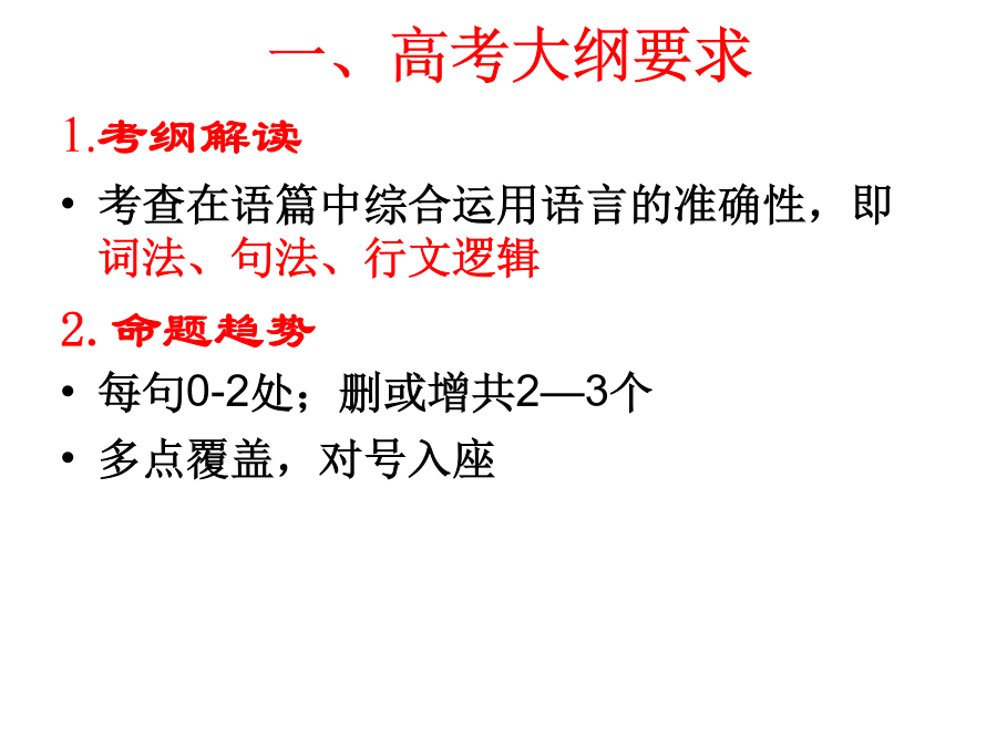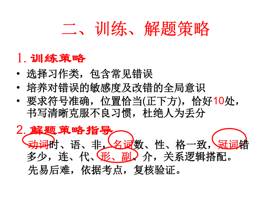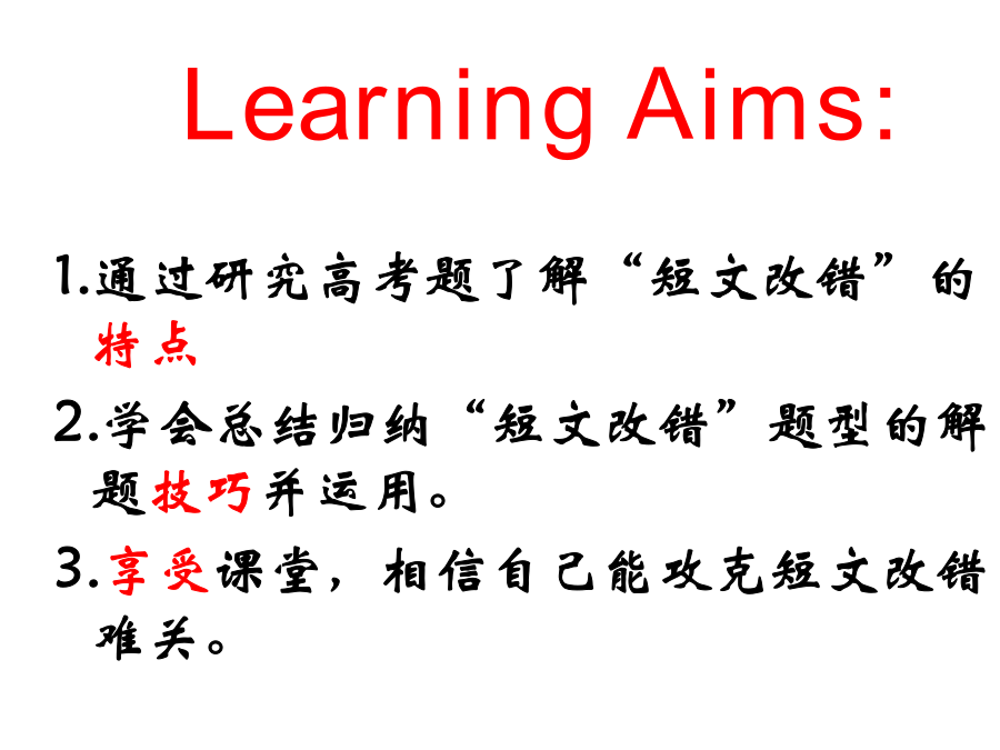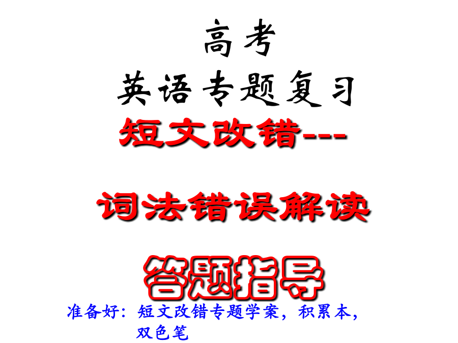 短文改错--- 词法错误解读 答题指导LearningAims:一、高考大纲要求一对一原则 改正以一个层次为原则 添加或删除以虚词居多 改变形式以实词居多 忠于原文的原则 小心局部陷阱 警惕局部通顺的陷阱,结合语篇进行全面分析。 解题步骤要遵循答题原则要牢记5).Atpresent,playingcomputergamesare becomingmoreandmorepopular.1).I’msorrytohearthatyouarehavingproblemswithyourexams.Youarenotlonely.Manystudentshavethesame problemasyoudo.1).Sheinsistedthatshewouldgetgood educationabroadthanathome.形容词或副词的多用:5.介词:错用,多用,少用6.连接词:需检验,逻辑关系前后辨。7.冠词: 英语中冠词只有三个,只能从以下几个方向出题: 1)冠词a、an、the互改; 2)根据需要增删冠词。冠词的增减:体验高考(2015新课标全国卷Ⅰ)Tips 短文改错 书面表达课后作业