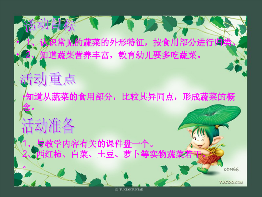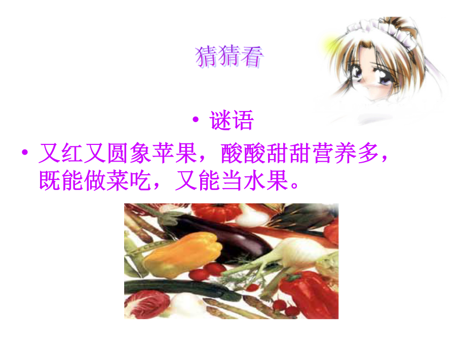 又红又圆象苹果,酸酸甜甜营养多,既能做菜吃,又能当水果。植物的果实(西红柿、黄瓜、茄子、辣椒)猜猜看植物的根(萝卜)植物的叶(白菜、菠菜)植物的块茎(土豆、藕、)儿歌小朋友们,平时吃我的哪一部分小朋友们,平时吃我的哪一部分小朋友们,平时吃我的哪一部分小朋友们,平时吃我的哪一部分小朋友们,平时吃我的哪一部分小朋友们,平时吃我的哪一部分让我们解决这些问题做游戏:找朋友再见,小朋友!