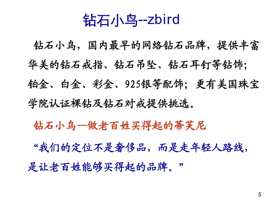 市场定位案例导入Tiffany-蒂芙尼 钻石小鸟,国内最早的网络钻石品牌,提供丰富华美的钻石戒指、钻石吊坠、钻石耳钉等钻饰;铂金、白金、彩金、925银等配饰;更有美国珠宝学院认证裸钻及钻石对戒提供挑选。 钻石小鸟—做老百姓买得起的蒂芙尼 “我们的定位不是奢侈品,而是走年轻人路线,是让老百姓能够买得起的品牌。”教学目标: 1、知识目标:了解市场定位的概述及定位策略。 2、能力目标:通过讨论、竞争性发言,提高学生的沟通能力。 教学重点:市场定位必要性 教学难点:市场定位的策略 教学方法:案例分析法,讨论法本讲主要内容 企业根据所选定目标市场上竞争者状况和企业自身的条件,从各方面为产品塑造一定的市场形象,以求在目标顾客心目中形成一种特殊的偏爱。 比如:汰渍-高效,立白-不伤手, 超能-低泡易漂奇瑞QQ是国内第一款为年轻人打造的轿车, 定位于“年轻人的第一辆车”, 其设计原则就是“快乐”。 其3万-5万的价格也是相当具有潜力的。二、市场定位策略1.避强定位策略 是指企业力图避免与实力最强的或较强的其他企业直接发生竞争,而将自己的产品定位于另一市场区域内,使自己的产品在某些特征或属性方面与最强或较强的对手有比较显著的区别。 避强定位案例2.迎强定位策略 是指企业根据自身的实力,为占据较佳的市场位置,不惜与市场上占支配地位的、实力最强或较强的竞争对手发生正面竞争,而使自己的产品进入与对手相同的市场位置。 迎强定位案例3.重新定位策略 思考:哪些情况下,企业应考虑重新定位? (1)市场定位不准确 (2)市场开始定位得当,但市场情况发生了变化(如遇到竞争者定位与本公司接近,侵占了本公司部分市场) (3)消费者或用户的偏好发生变化,转移到竞争者方面时,就应考虑重新定位。 重新定位是以退为进的策略,目的是为了实施更有效的定位。万宝路——西部牛仔的男子汉教学小结Thanks!