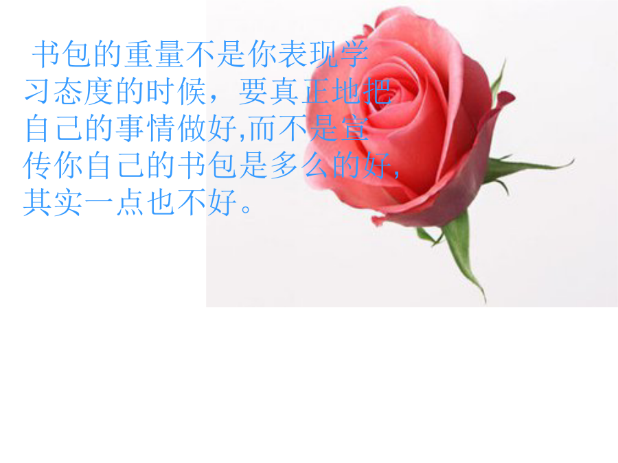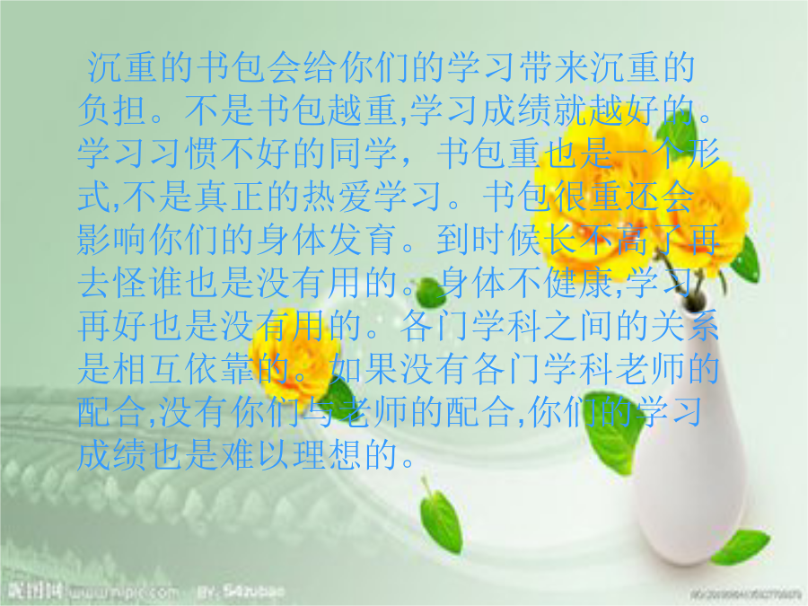 给书包减肥沉重的书包会给你们的学习带来沉重的负担。不是书包越重,学习成绩就越好的。学习习惯不好的同学,书包重也是一个形式,不是真正的热爱学习。书包很重还会影响你们的身体发育。到时候长不高了再去怪谁也是没有用的。身体不健康,学习再好也是没有用的。各门学科之间的关系是相互依靠的。如果没有各门学科老师的配合,没有你们与老师的配合,你们的学习成绩也是难以理想的。形式和内容的结合才能带来美好的感觉。如果只有外在的表现而没有内在的美丽,是不能把学习学好的。好的学习态度是促进学习的抓手。如果不懂得尊重学习,就难以将学习的效果提高。学习效果提高了,你们才能将学习提高。你的书包究竟有多重?怎样给它减肥?书包的重量不是你表现学习态度的时候,要真正地把自己的事情做好,而不是宣传你自己的书包是多么的好,其实一点也不好。