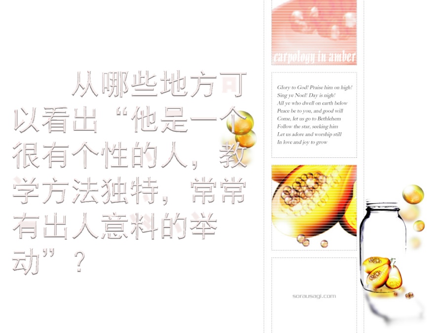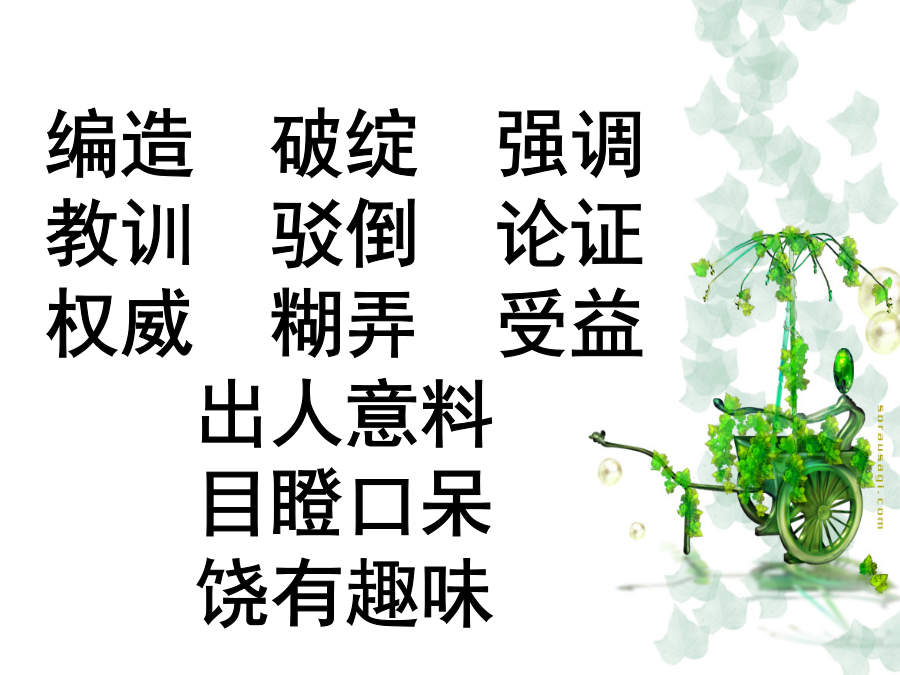 21.我最好的老师编造破绽强调教训驳倒论证权威糊弄受益出人意料 目瞪口呆 饶有趣味课文主要讲了一件什么事?从哪些地方可以看出“他是一个很有个性的人,教学方法独特,常常有出人意料的举动”?作者开始明白老师的意图了吗?从哪里可以看出?作者后来明白老师的意图了吗?从哪里可以看出?此外让我们明白了什么道理?现在我全明白了: 我最好的老师怀特森老师,他,所以我很; ……这样的老师你们喜欢吗?小练笔:选下面的一个题目写一写 《我看怀特森先生》 《由<我最好的老师>所想到的》 《假如我是怀特森先生的学生》 《怎样看待书本和权威》课后继续查阅、收集关于不迷信书本、不迷信权威的故事。