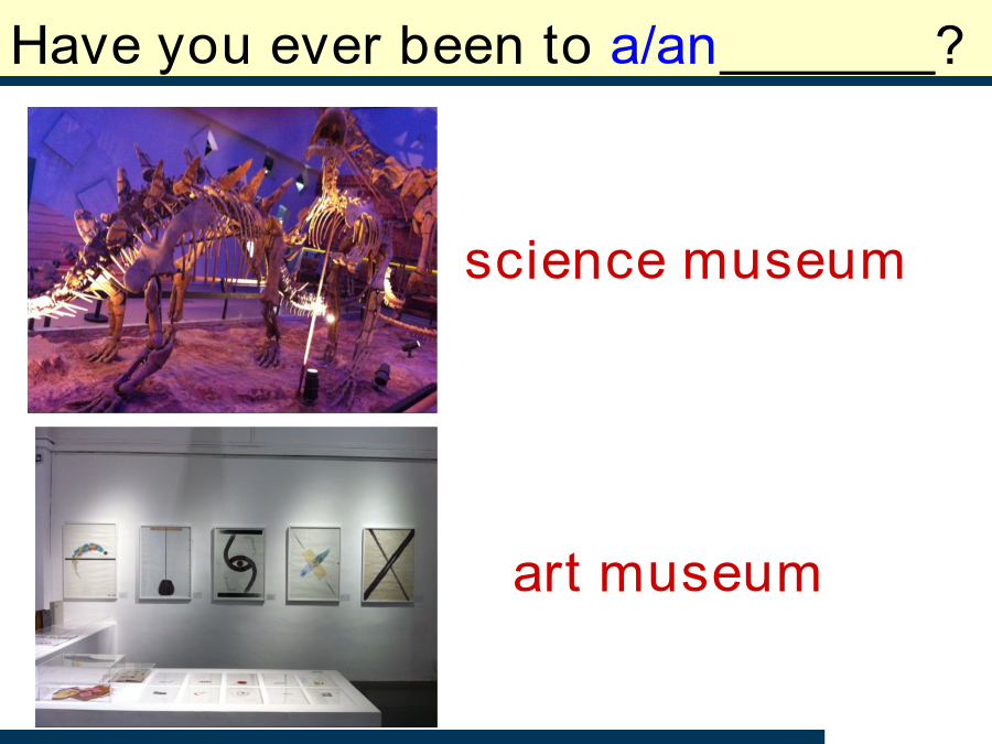 Unit9 Haveyoueverbeentoamuseum?Haveyoueverbeentoa/an_______?sciencemuseumwaterparkamusementparkIwenttoan____lastmonthinQingdao.Haveyoueverbeentoa/an…?Listen.Havethesestudentseverbeentotheseplaces?Check(√)theboxes.Lookatthemapofthetown.Listenandcircletheplacesyouhear.2bWhatdidAnnadolastweekend? 2.HasJillbeentothefilmmuseum? 3.WhatdidJilldolastweekend? Haveyoueverbeentoasciencemuseum?