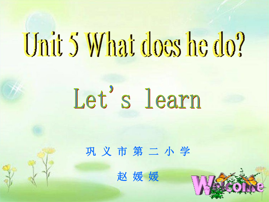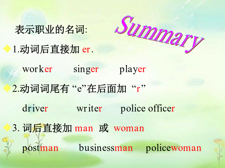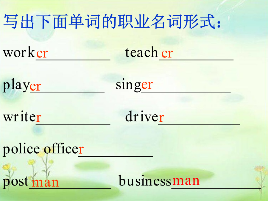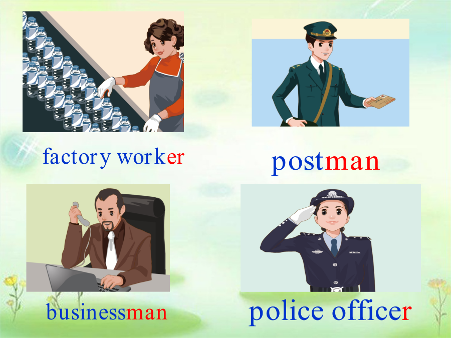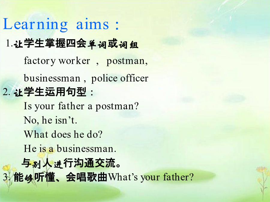 Unit5Whatdoeshedo?Learningaims: 1.让学生掌握四会单词或词组 factoryworker,postman, businessman,policeofficer 2.让学生运用句型: Isyourfatherapostman? No,heisn’t. Whatdoeshedo? Heisabusinessman. 与别人进行沟通交流。 3.能够听懂、会唱歌曲What’syourfather?factoryworker 表示职业的名词: 1.动词后直接加er. workersingerplayer 2.动词词尾有“e”在后面加“r” driverwriterpoliceofficer 3.词后直接加man或woman postmanbusinessmanpolicewomanWhatdoesGeNan’sfatherdo? WhatdoesZhouJia’smotherdo? WhatdoesLiuQian’sfatherdo?What’syourfather?What’syourfather? He’saworker,he’saworker. Whatdoesyourmotherdo? Whatdoesyourmotherdo? She’sateacher,She’sateacher. Homework
