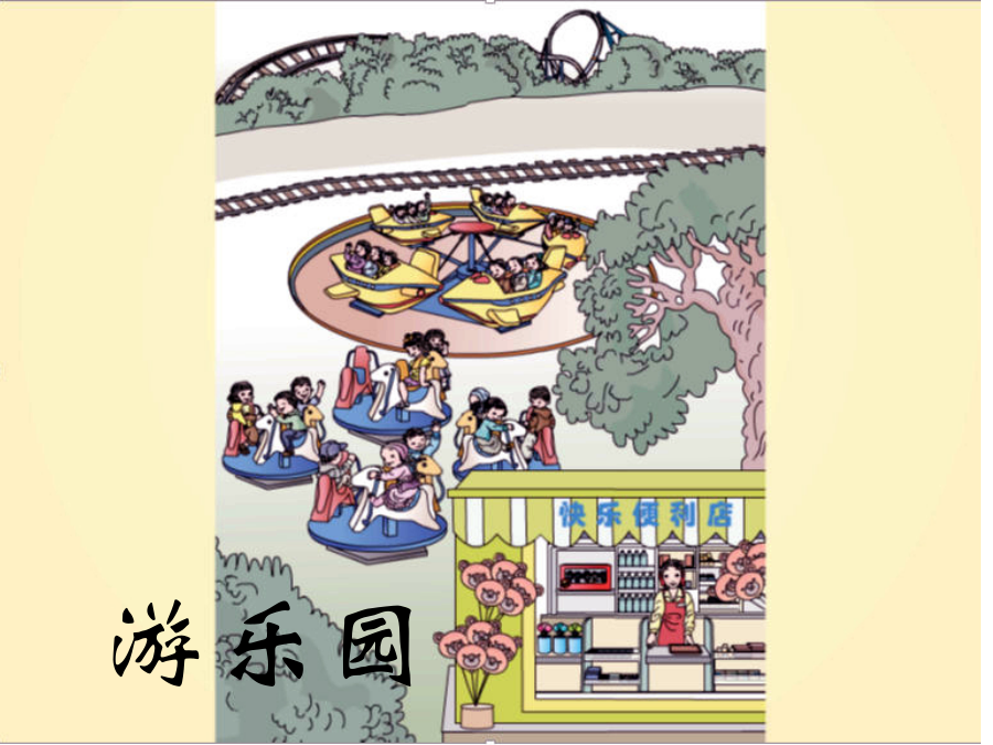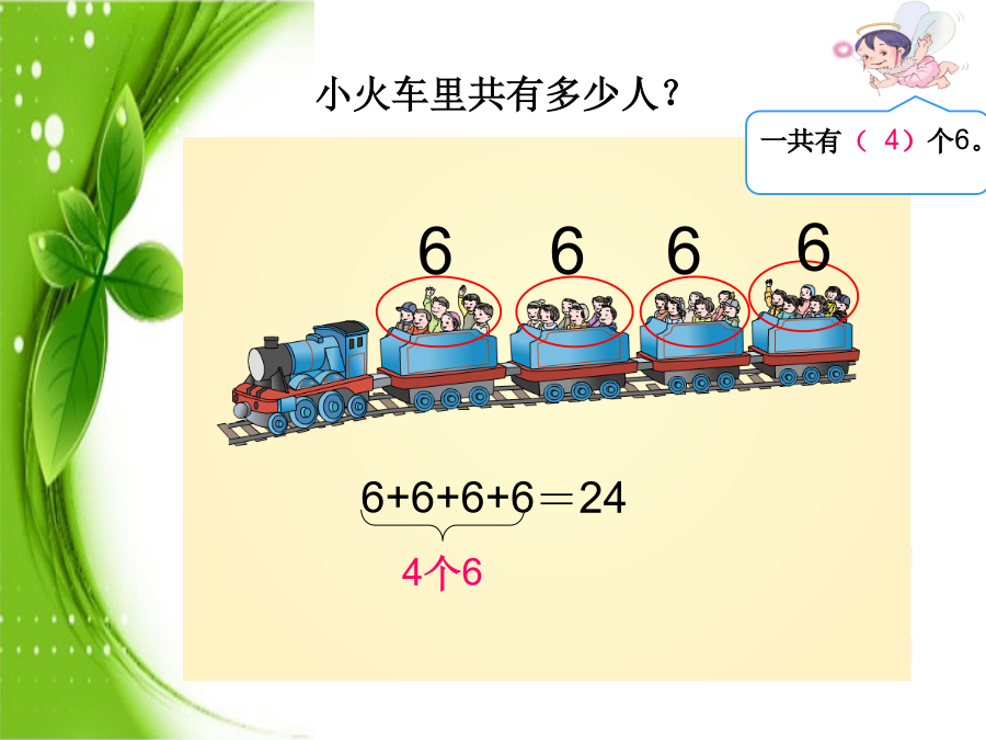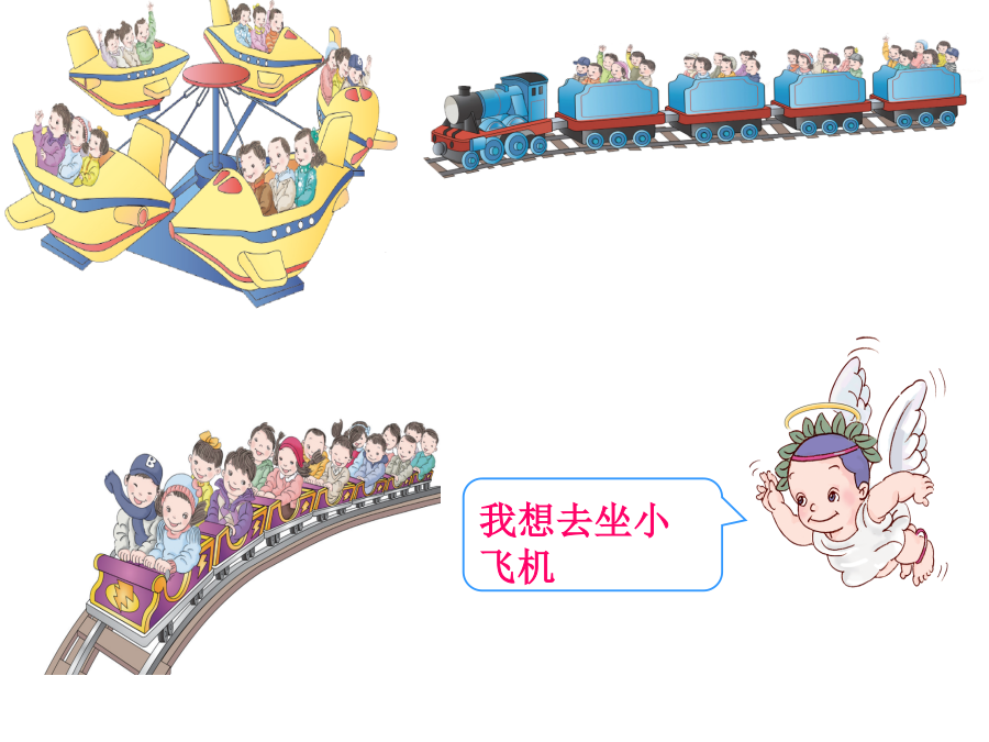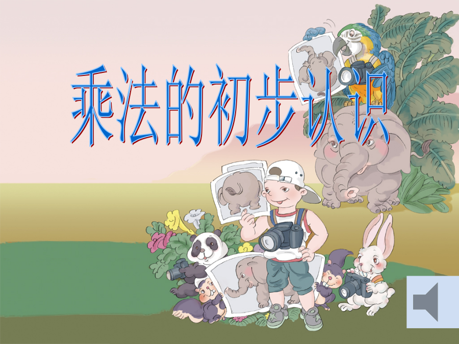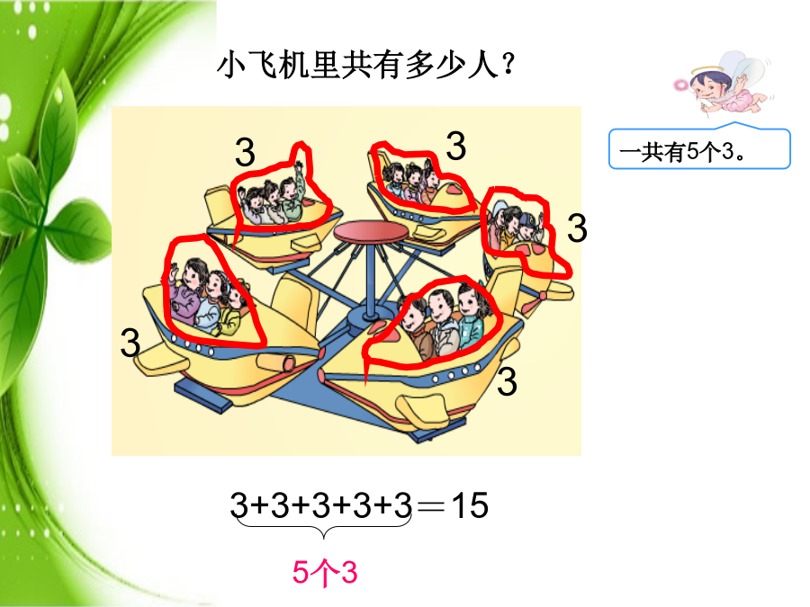 游乐园我想去坐小飞机3小火车里共有多少人?过山车里共有多少人?一共有多少人? 3+3+3+3+3=15第一关:基础关今天我们学习了_______,我觉得乘号像_______,乘法和加法是有联系的,当__________的时候用乘法计算比较简便。 再见