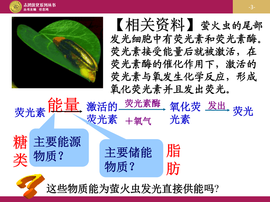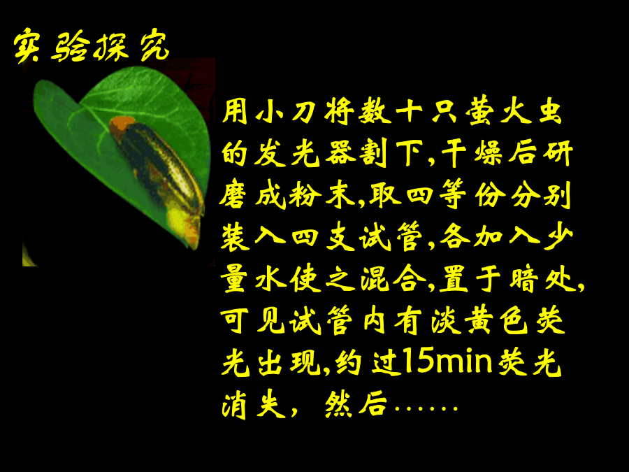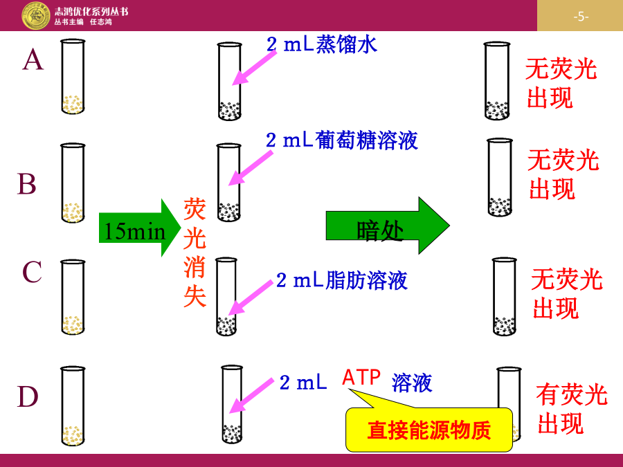 第2节细胞的能量通货——ATP有种虫儿真奇怪, 一盏灯笼随身带, 黑夜点灯满天飞, 像星闪闪真可爱。能量15min一.ATP的结构合作学习下列叙述错误的是() A.①圈中部分水解后产生一分子腺嘌呤和一分子磷酸 B.②圈中部分是腺嘌呤 C.③中的圈中部分是腺嘌呤脱氧核糖核苷酸 D.④圈中部分水解后产生一分子腺嘌呤、一分子核糖和一分子磷酸一般将水解时,能够释放20.92kJ/mol能量的化合物都叫做高能化合物. ATP在水解时释放的能量是30.54kJ/mol(千焦每摩尔)ATP水解释放的能量是一般磷酸键水解时释放能量的两倍以上。A-P~P~P3、哪些生命活动由ATP直接供能?阅读资料:三、生物体细胞内ATP与ADP的相互转化。ADP转化成ATP时所需能量的主要来源ATPATP合成与ATP分解的比较:ATP含高能磷酸键,储存较多能量且不稳定(活跃的化学能);ATP与ADP的相互转化十分迅速,含量处于动态平衡中,保证了细胞内稳定的供能环境。小结1、ATP在细胞内的含量及其生成是() A、很多,很快B、很少,很慢 C、很多,很慢D、很少,很快 2、ATP之所以能作为能量的直接来源是因为() A.ATP在细胞中数量非常多 B、ATP中的高能磷酸键很稳定 C、ATP中的高能磷酸键储藏的能量多且很不稳定 D、ATP是生物体内惟一可以释放能量的化合物3.三磷酸腺苷中任何高能磷酸键水解后均可放能30.54kJ/mol。那么,1molATP中所有磷酸键储存的化学能为() A.30.54molB.61.08mol C.91.62molD.介于61.08与91.62之间