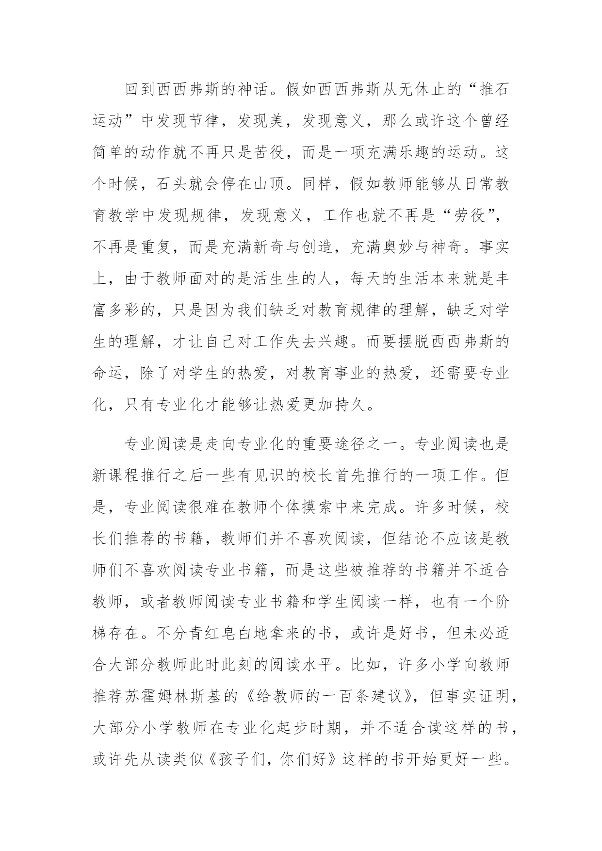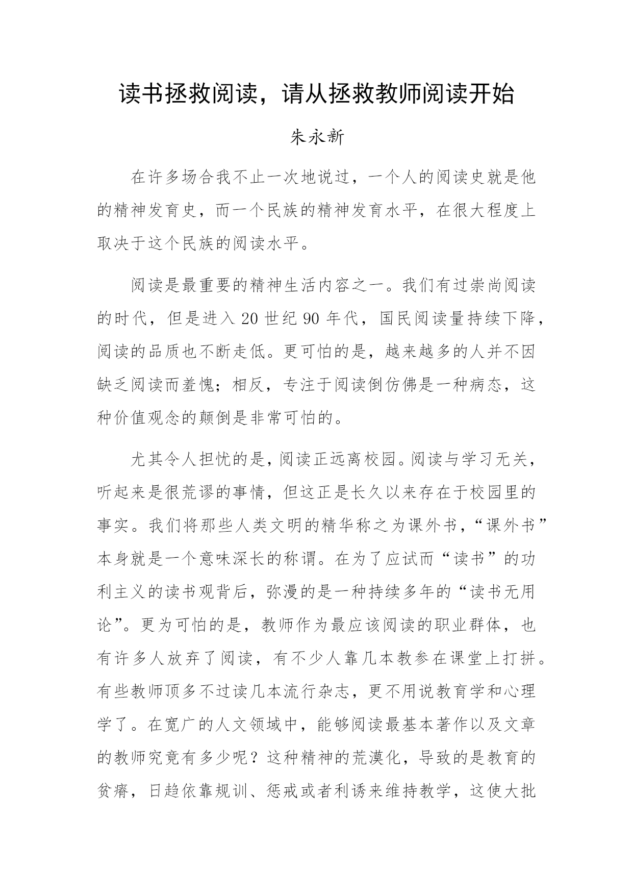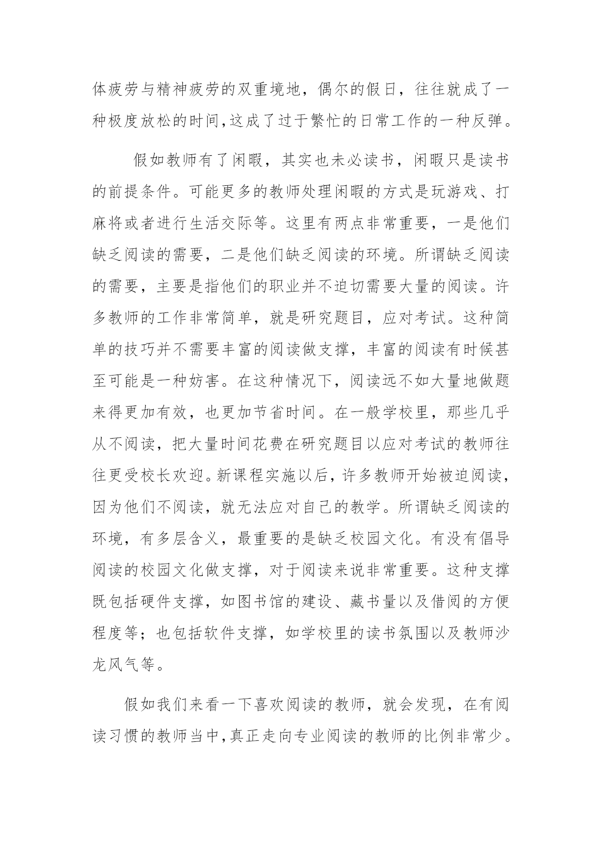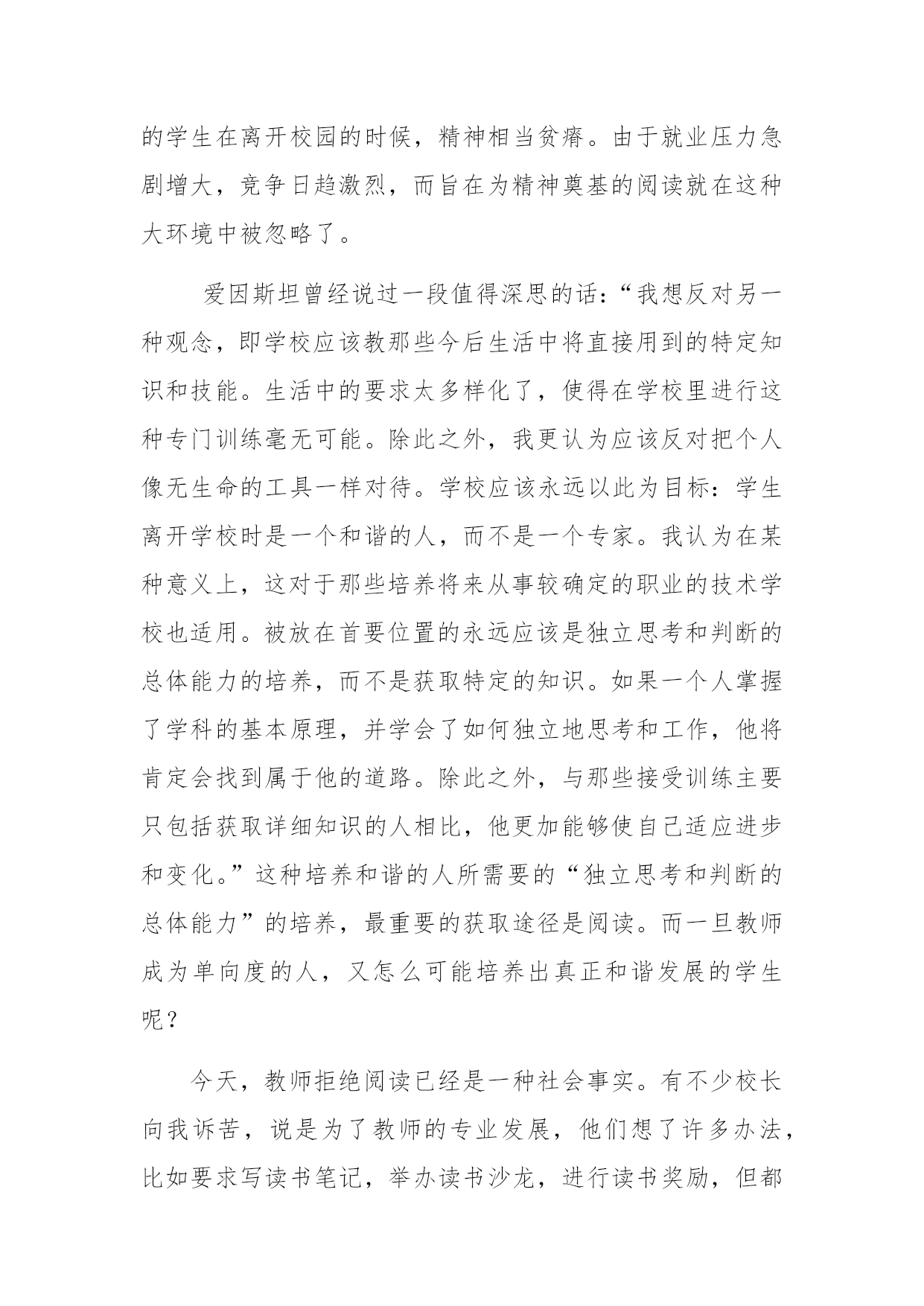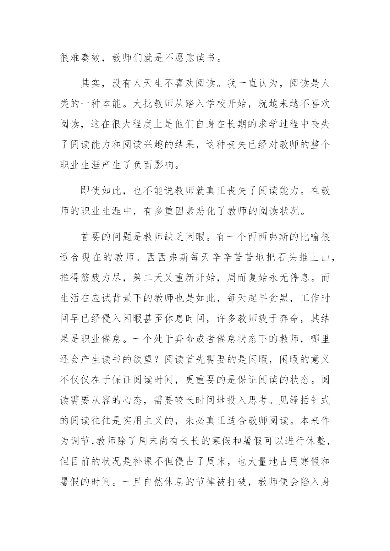 读书拯救阅读,请从拯救教师阅读开始 朱永新 在许多场合我不止一次地说过,一个人的阅读史就是他的精神发育史,而一个民族的精神发育水平,在很大程度上取决于这个民族的阅读水平。 阅读是最重要的精神生活内容之一。我们有过崇尚阅读的时代,但是进入20世纪90年代,国民阅读量持续下降,阅读的品质也不断走低。更可怕的是,越来越多的人并不因缺乏阅读而羞愧;相反,专注于阅读倒仿佛是一种病态,这种价值观念的颠倒是非常可怕的。 尤其令人担忧的是,阅读正远离校园。阅读与学习无关,听起来是很荒谬的事情,但这正是长久以来存在于校园里的事实。我们将那些人类文明的精华称之为课外书,“课外书”本身就是一个意味深长的称谓。在为了应试而“读书”的功利主义的读书观背后,弥漫的是一种持续多年的“读书无用论”。更为可怕的是,教师作为最应该阅读的职业群体,也有许多人放弃了阅读,有不少人靠几本教参在课堂上打拼。有些教师顶多不过读几本流行杂志,更不用说教育学和心理学了。在宽广的人文领域中,能够阅读最基本著作以及文章的教师究竟有多少呢?这种精神的荒漠化,导致的是教育的贫瘠,日趋依靠规训、惩戒或者利诱来维持教学,这使大批的学生在离开校园的时候,精神相当贫瘠。由于就业压力急剧增大,竞争日趋激烈,而旨在为精神奠基的阅读就在这种大环境中被忽略了。 爱因斯坦曾经说过一段值得深思的话:“我想反对另一种观念,即学校应该教那些今后生活中将直接用到的特定知识和技能。生活中的要求太多样化了,使得在学校里进行这种专门训练毫无可能。除此之外,我更认为应该反对把个人像无生命的工具一样对待。学校应该永远以此为目标:学生离开学校时是一个和谐的人,而不是一个专家。我认为在某种意义上,这对于那些培养将来从事较确定的职业的技术学校也适用。被放在首要位置的永远应该是独立思考和判断的总体能力的培养,而不是获取特定的知识。如果一个人掌握了学科的基本原理,并学会了如何独立地思考和工作,他将肯定会找到属于他的道路。除此之外,与那些接受训练主要只包括获取详细知识的人相比,他更加能够使自己适应进步和变化。”这种培养和谐的人所需要的“独立思考和判断的总体能力”的培养,最重要的获取途径是阅读。而一旦教师成为单向度的人,又怎么可能培养出真正和谐发展的学生呢? 今天,教师拒绝阅读已经是一种社会事实。有不少校长向我诉苦,说是为了教师的专业发展,他们想了许多办法,比如要求写读书笔记,举办读书沙龙,进行读书奖励,但都很难奏效,教师们就是不愿意读书。 其实,没有人天生不喜欢阅读。我一直认为,阅读是人类的一种本能。大批教师从踏入学校开始,就越来越不喜欢阅读,这在很大程度上是他们自身在长期的求学过程中丧失了阅读能力和阅读兴趣的结果,这种丧失已经对教师的整个职业生涯产生了负面影响。 即使如此,也不能说教师就真正丧失了阅读能力。在教师的职业生涯中,有多重因素恶化了教师的阅读状况。 首要的问题是教师缺乏闲暇。有一个西西弗斯的比喻很适合现在的教师。西西弗斯每天辛辛苦苦地把石头推上山,推得筋疲力尽,第二天又重新开始,周而复始永无停息。而生活在应试背景下的教师也是如此,每天起早贪黑,工作时间早已经侵入闲暇甚至休息时间,许多教师疲于奔命,其结果是职业倦怠。一个处于奔命或者倦怠状态下的教师,哪里还会产生读书的欲望?阅读首先需要的是闲暇,闲暇的意义不仅仅在于保证阅读时间,更重要的是保证阅读的状态。阅读需要从容的心态,需要较长时间地投入思考。见缝插针式的阅读往往是实用主义的,未必真正适合教师阅读。本来作为调节,教师除了周末尚有长长的寒假和暑假可以进行休整,但目前的状况是补课不但侵占了周末,也大量地占用寒假和暑假的时间。一旦自然休息的节律被打破,教师便会陷入身体疲劳与精神疲劳的双重境地,偶尔的假日,往往就成了一种极度放松的时间,这成了过于繁忙的日常工作的一种反弹。 假如教师有了闲暇,其实也未必读书,闲暇只是读书的前提条件。可能更多的教师处理闲暇的方式是玩游戏、打麻将或者进行生活交际等。这里有两点非常重要,一是他们缺乏阅读的需要,二是他们缺乏阅读的环境。所谓缺乏阅读的需要,主要是指他们的职业并不迫切需要大量的阅读。许多教师的工作非常简单,就是研究题目,应对考试。这种简单的技巧并不需要丰富的阅读做支撑,丰富的阅读有时候甚至可能是一种妨害。在这种情况下,阅读远不如大量地做题来得更加有效,也更加节省时间。在一般学校里,那些几乎从不阅读,把大量时间花费在研究题目以应对考试的教师往往更受校长欢迎。新课程实施以后,许多教师开始被迫阅读,因为他们不阅读,就无法应对自己的教学。所谓缺乏阅读的环境,有多层含义,最重要的是缺乏校园文化。有没有倡导阅读的校园文化做支撑,对于阅读来说非常重要。这种支撑既包括硬件支撑,如图书馆的建设、藏书量以及借阅的方便程度等;也包括软件支撑,如学校里的读书氛围