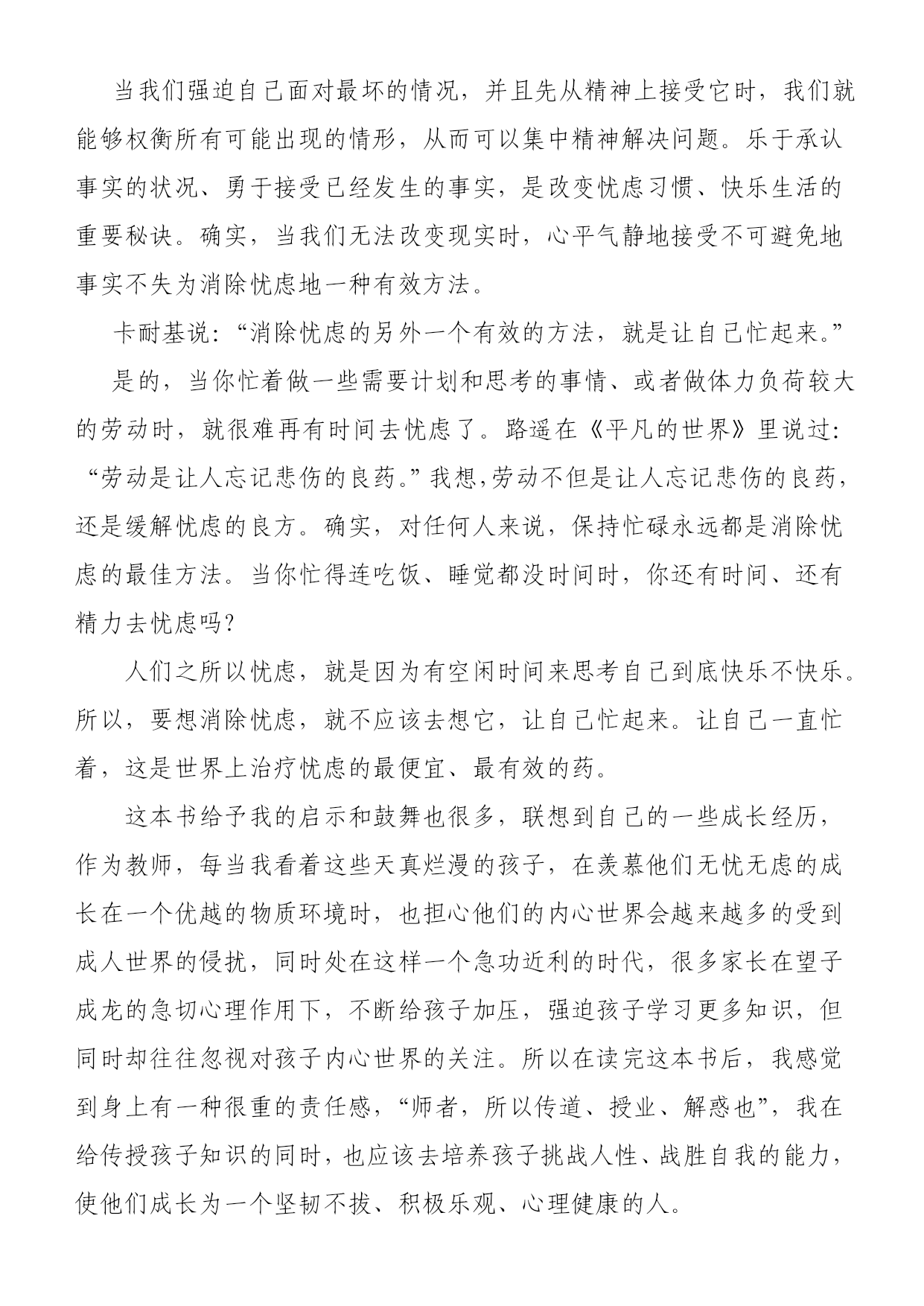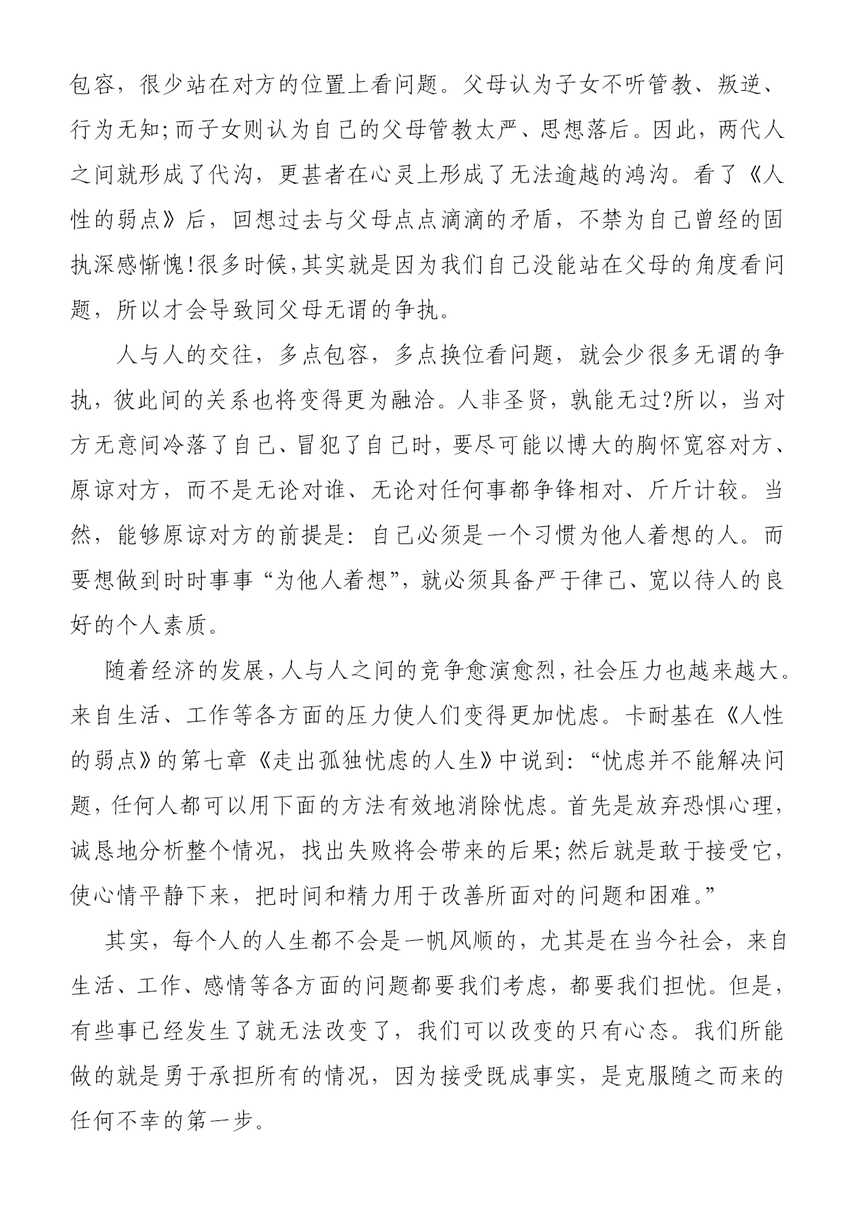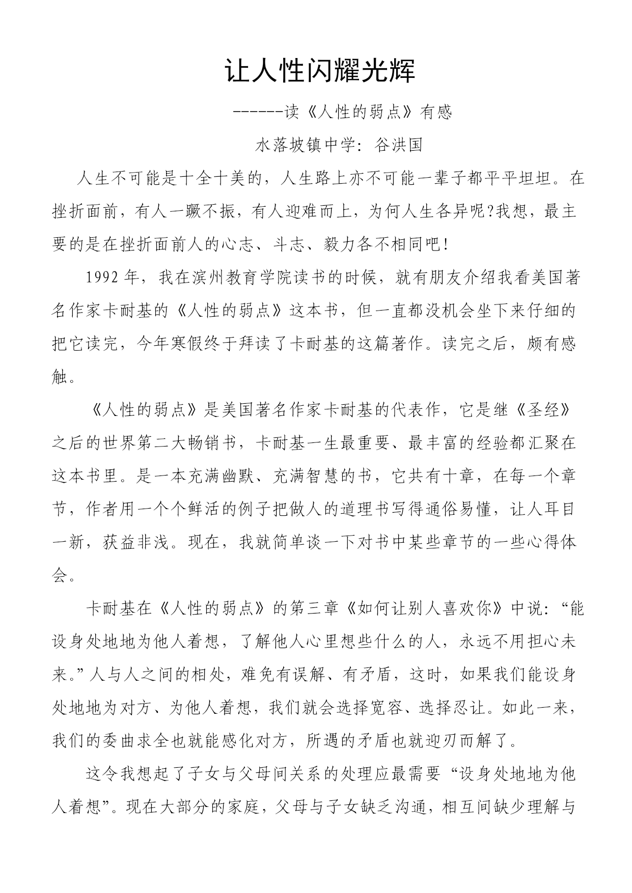 让人性闪耀光辉 ------读《人性的弱点》有感 水落坡镇中学:谷洪国 人生不可能是十全十美的,人生路上亦不可能一辈子都平平坦坦。在挫折面前,有人一蹶不振,有人迎难而上,为何人生各异呢?我想,最主要的是在挫折面前人的心志、斗志、毅力各不相同吧! 1992年,我在滨州教育学院读书的时候,就有朋友介绍我看美国著名作家卡耐基的《人性的弱点》这本书,但一直都没机会坐下来仔细的把它读完,今年寒假终于拜读了卡耐基的这篇著作。读完之后,颇有感触。 《人性的弱点》是美国著名作家卡耐基的代表作,它是继《圣经》之后的世界第二大畅销书,卡耐基一生最重要、最丰富的经验都汇聚在这本书里。是一本充满幽默、充满智慧的书,它共有十章,在每一个章节,作者用一个个鲜活的例子把做人的道理书写得通俗易懂,让人耳目一新,获益非浅。现在,我就简单谈一下对书中某些章节的一些心得体会。 卡耐基在《人性的弱点》的第三章《如何让别人喜欢你》中说:“能设身处地地为他人着想,了解他人心里想些什么的人,永远不用担心未来。”人与人之间的相处,难免有误解、有矛盾,这时,如果我们能设身处地地为对方、为他人着想,我们就会选择宽容、选择忍让。如此一来,我们的委曲求全也就能感化对方,所遇的矛盾也就迎刃而解了。 这令我想起了子女与父母间关系的处理应最需要“设身处地地为他人着想”。现在大部分的家庭,父母与子女缺乏沟通,相互间缺少理解与包容,很少站在对方的位置上看问题。父母认为子女不听管教、叛逆、行为无知;而子女则认为自己的父母管教太严、思想落后。因此,两代人之间就形成了代沟,更甚者在心灵上形成了无法逾越的鸿沟。看了《人性的弱点》后,回想过去与父母点点滴滴的矛盾,不禁为自己曾经的固执深感惭愧!很多时候,其实就是因为我们自己没能站在父母的角度看问题,所以才会导致同父母无谓的争执。 人与人的交往,多点包容,多点换位看问题,就会少很多无谓的争执,彼此间的关系也将变得更为融洽。人非圣贤,孰能无过?所以,当对方无意间冷落了自己、冒犯了自己时,要尽可能以博大的胸怀宽容对方、原谅对方,而不是无论对谁、无论对任何事都争锋相对、斤斤计较。当然,能够原谅对方的前提是:自己必须是一个习惯为他人着想的人。而要想做到时时事事“为他人着想”,就必须具备严于律己、宽以待人的良好的个人素质。 随着经济的发展,人与人之间的竞争愈演愈烈,社会压力也越来越大。来自生活、工作等各方面的压力使人们变得更加忧虑。卡耐基在《人性的弱点》的第七章《走出孤独忧虑的人生》中说到:“忧虑并不能解决问题,任何人都可以用下面的方法有效地消除忧虑。首先是放弃恐惧心理,诚恳地分析整个情况,找出失败将会带来的后果;然后就是敢于接受它,使心情平静下来,把时间和精力用于改善所面对的问题和困难。” 其实,每个人的人生都不会是一帆风顺的,尤其是在当今社会,来自生活、工作、感情等各方面的问题都要我们考虑,都要我们担忧。但是,有些事已经发生了就无法改变了,我们可以改变的只有心态。我们所能做的就是勇于承担所有的情况,因为接受既成事实,是克服随之而来的任何不幸的第一步。 当我们强迫自己面对最坏的情况,并且先从精神上接受它时,我们就能够权衡所有可能出现的情形,从而可以集中精神解决问题。乐于承认事实的状况、勇于接受已经发生的事实,是改变忧虑习惯、快乐生活的重要秘诀。确实,当我们无法改变现实时,心平气静地接受不可避免地事实不失为消除忧虑地一种有效方法。 卡耐基说:“消除忧虑的另外一个有效的方法,就是让自己忙起来。” 是的,当你忙着做一些需要计划和思考的事情、或者做体力负荷较大的劳动时,就很难再有时间去忧虑了。路遥在《平凡的世界》里说过:“劳动是让人忘记悲伤的良药。”我想,劳动不但是让人忘记悲伤的良药,还是缓解忧虑的良方。确实,对任何人来说,保持忙碌永远都是消除忧虑的最佳方法。当你忙得连吃饭、睡觉都没时间时,你还有时间、还有精力去忧虑吗? 人们之所以忧虑,就是因为有空闲时间来思考自己到底快乐不快乐。所以,要想消除忧虑,就不应该去想它,让自己忙起来。让自己一直忙着,这是世界上治疗忧虑的最便宜、最有效的药。 这本书给予我的启示和鼓舞也很多,联想到自己的一些成长经历,作为教师,每当我看着这些天真烂漫的孩子,在羡慕他们无忧无虑的成长在一个优越的物质环境时,也担心他们的内心世界会越来越多的受到成人世界的侵扰,同时处在这样一个急功近利的时代,很多家长在望子成龙的急切心理作用下,不断给孩子加压,强迫孩子学习更多知识,但同时却往往忽视对孩子内心世界的关注。所以在读完这本书后,我感觉到身上有一种很重的责任感,“师者,所以传道、授业、解惑也”,我在给传授孩子知识的同时,也应该去培养孩子挑战人性、战胜自我的能力,使他们成长为一个坚韧不拔、积极乐观、心理健康的人。