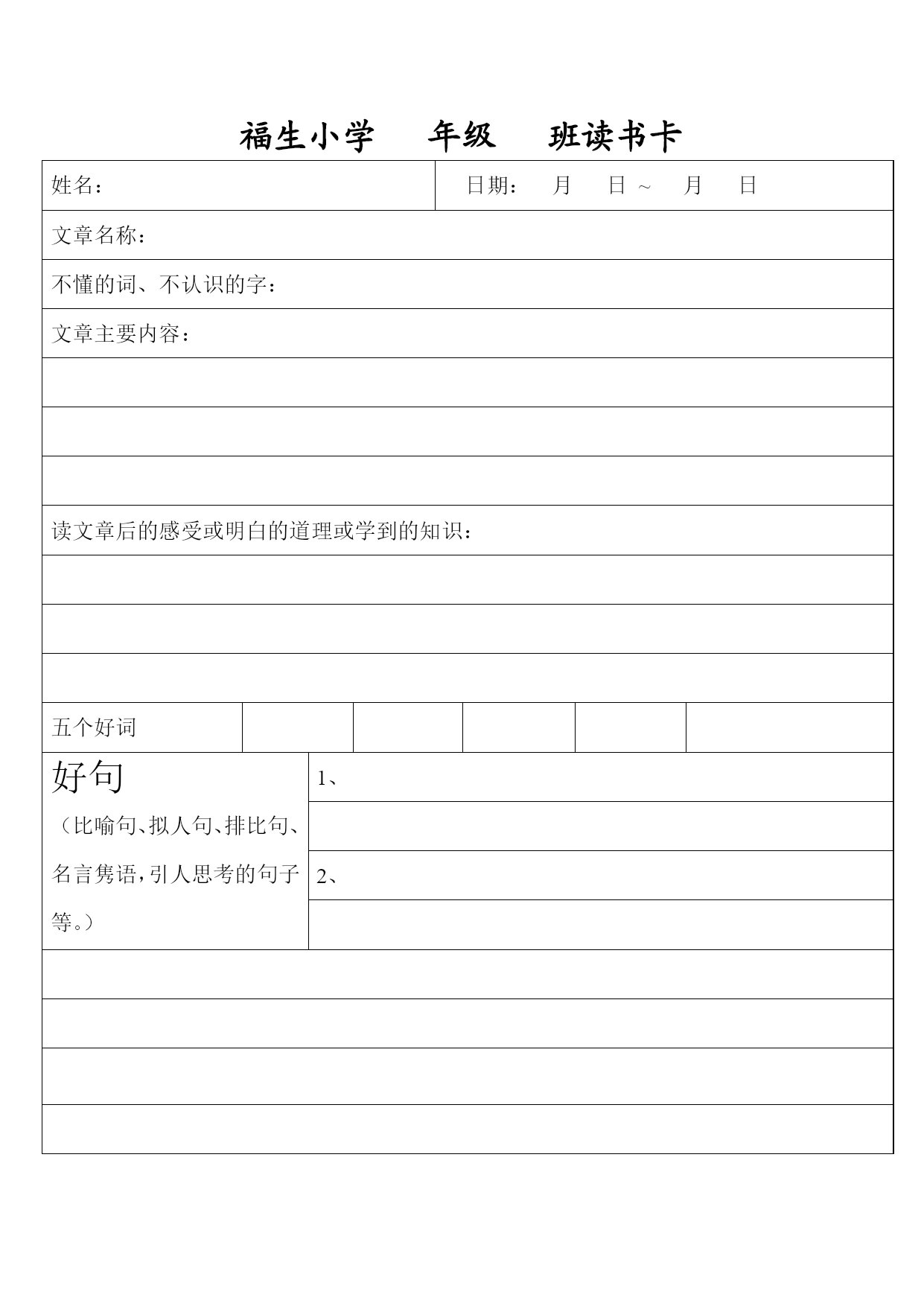 福生小学年级班读书卡 姓名:日期:月日~月日文章名称:不懂的词、不认识的字:文章主要内容:读文章后的感受或明白的道理或学到的知识:五个好词好句 (比喻句、拟人句、排比句、名言隽语,引人思考的句子等。)1、2、