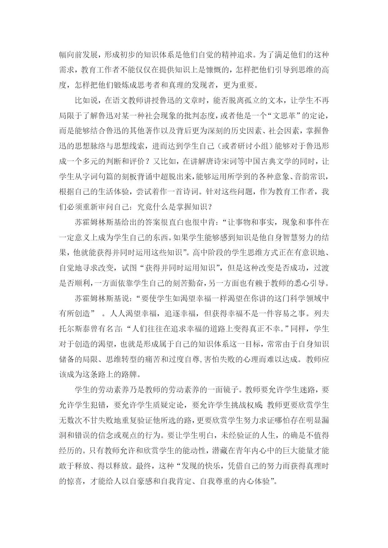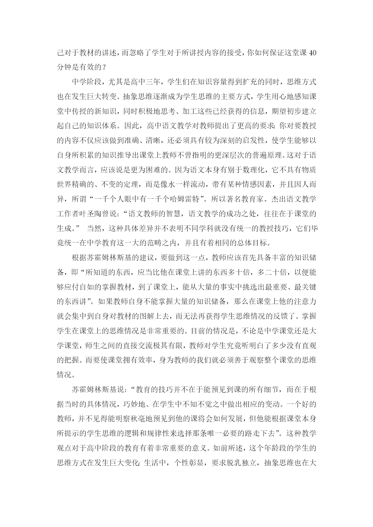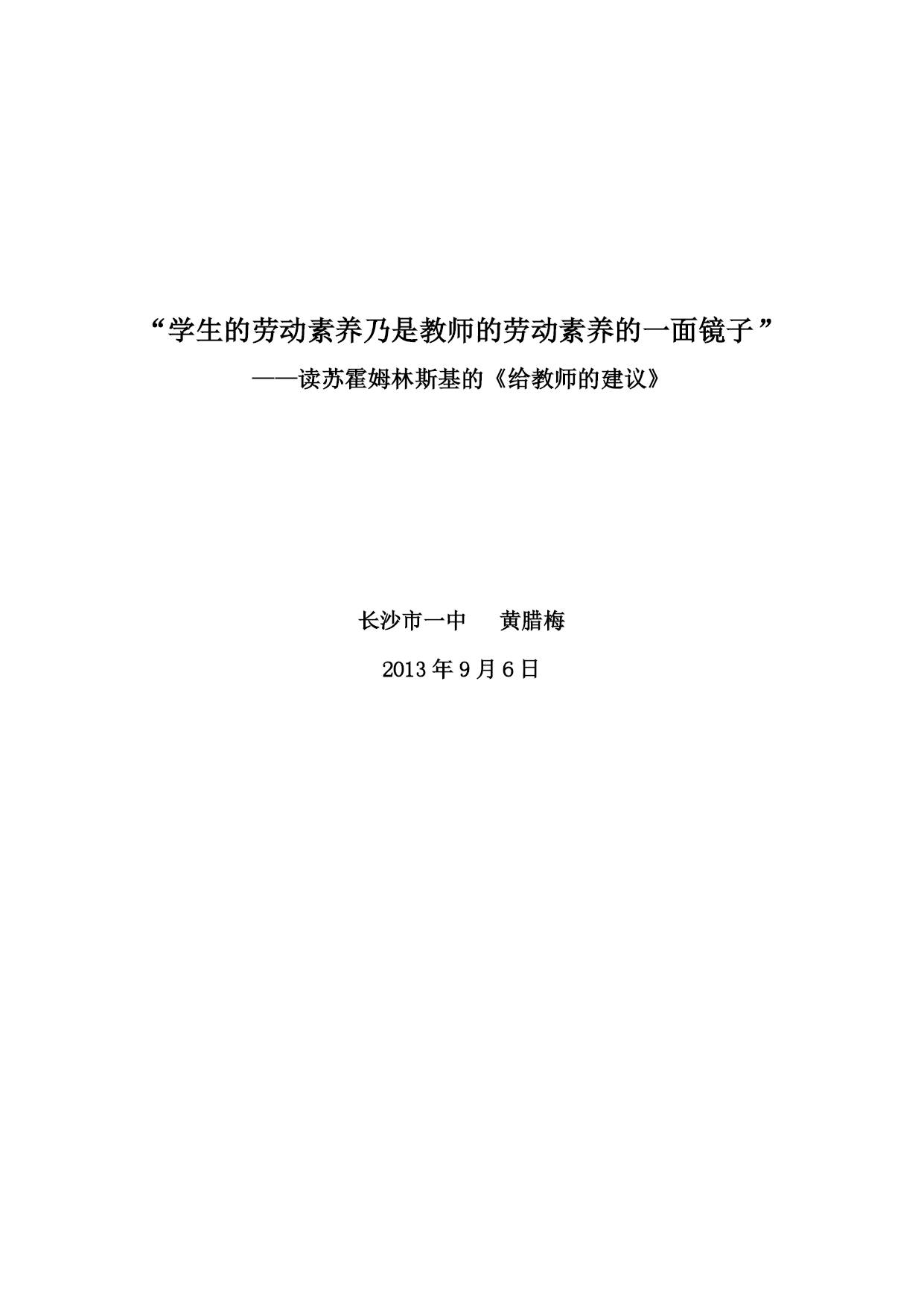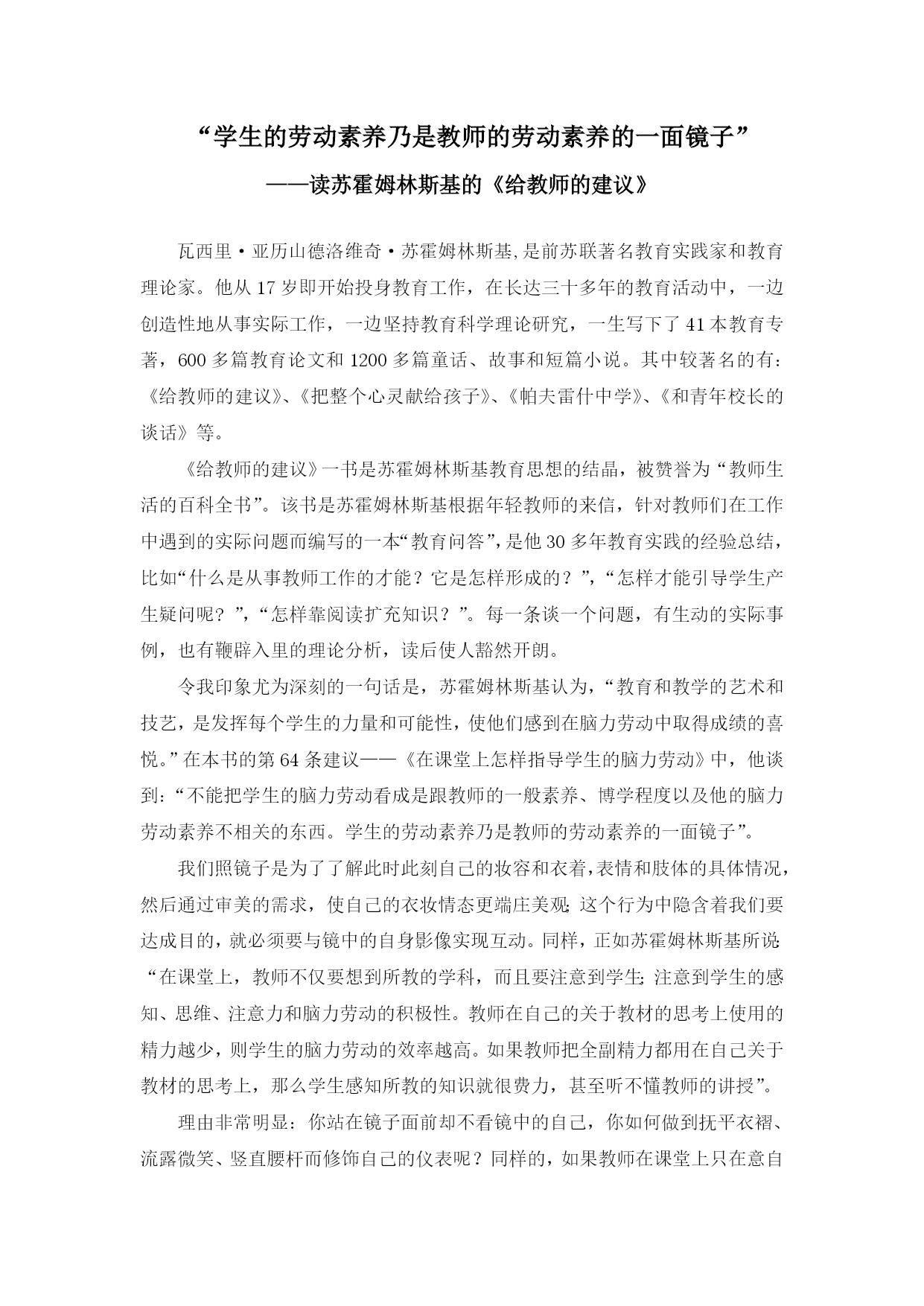 “学生的劳动素养乃是教师的劳动素养的一面镜子” ——读苏霍姆林斯基的《给教师的建议》 长沙市一中黄腊梅 2013年9月6日 “学生的劳动素养乃是教师的劳动素养的一面镜子” ——读苏霍姆林斯基的《给教师的建议》 瓦西里·亚历山德洛维奇·苏霍姆林斯基,是前苏联著名教育实践家和教育理论家。他从17岁即开始投身教育工作,在长达三十多年的教育活动中,一边创造性地从事实际工作,一边坚持教育科学理论研究,一生写下了41本教育专著,600多篇教育论文和1200多篇童话、故事和短篇小说。其中较著名的有:《给教师的建议》、《把整个心灵献给孩子》、《帕夫雷什中学》、《和青年校长的谈话》等。 《给教师的建议》一书是苏霍姆林斯基教育思想的结晶,被赞誉为“教师生活的百科全书”。该书是苏霍姆林斯基根据年轻教师的来信,针对教师们在工作中遇到的实际问题而编写的一本“教育问答”,是他30多年教育实践的经验总结,比如“什么是从事教师工作的才能?它是怎样形成的?”,“怎样才能引导学生产生疑问呢?”,“怎样靠阅读扩充知识?”。每一条谈一个问题,有生动的实际事例,也有鞭辟入里的理论分析,读后使人豁然开朗。 令我印象尤为深刻的一句话是,苏霍姆林斯基认为,“教育和教学的艺术和技艺,是发挥每个学生的力量和可能性,使他们感到在脑力劳动中取得成绩的喜悦。”在本书的第64条建议——《在课堂上怎样指导学生的脑力劳动》中,他谈到:“不能把学生的脑力劳动看成是跟教师的一般素养、博学程度以及他的脑力劳动素养不相关的东西。学生的劳动素养乃是教师的劳动素养的一面镜子”。 我们照镜子是为了了解此时此刻自己的妆容和衣着,表情和肢体的具体情况,然后通过审美的需求,使自己的衣妆情态更端庄美观;这个行为中隐含着我们要达成目的,就必须要与镜中的自身影像实现互动。同样,正如苏霍姆林斯基所说:“在课堂上,教师不仅要想到所教的学科,而且要注意到学生;注意到学生的感知、思维、注意力和脑力劳动的积极性。教师在自己的关于教材的思考上使用的精力越少,则学生的脑力劳动的效率越高。如果教师把全副精力都用在自己关于教材的思考上,那么学生感知所教的知识就很费力,甚至听不懂教师的讲授”。 理由非常明显:你站在镜子面前却不看镜中的自己,你如何做到抚平衣褶、流露微笑、竖直腰杆而修饰自己的仪表呢?同样的,如果教师在课堂上只在意自己对于教材的讲述,而忽略了学生对于所讲授内容的接受,你如何保证这堂课40分钟是有效的? 中学阶段,尤其是高中三年,学生们在知识容量得到扩充的同时,思维方式也在发生巨大转变。抽象思维逐渐成为学生思维的主要方式,学生用心地感知课堂中传授的新知识,同时积极地思考、加工这些已经获得的信息,期望初步建立起自己的知识体系。因此,高中语文教学对教师提出了更高的要求:你对要教授的内容不仅应该做到准确、清晰,还必须具有较为深刻的启发性,使学生能够以自身所积累的知识推导出课堂上教师不曾指明的更深层次的普遍原理。这对于语文教学而言,应该说是更为困难的。因为语文本身有别于数理化,它不具有物质世界精确的、不变的定理,而是像水一样流动,带有某种情感因素,并且因人而异,所谓“一千个人眼中有一千个哈姆雷特”。所以著名教育家、杰出语文教学工作者叶圣陶曾说:“语文教师的智慧,语文教学的成功之处,往往在于课堂的生成。”当然,这种具体差异并不表明不同学科就没有统一的教授技巧,它们毕竟统一在中学教育这一大的范畴之内,并且有着相同的总体目标。 根据苏霍姆林斯基的建议,要做到这一点,教师应该首先具备丰富的知识储备,即“所知道的东西,应当比他在课堂上讲的东西多十倍,多二十倍,以便能够应付自如的掌握教材,到了课堂上,能从大量的事实中挑选出最重要、最关键的东西讲”。如果教师自身不能掌握大量的知识储备,那么在课堂上他的注意力就会集中到自身对教材的图解上去,而无法再获得学生思维情况的反馈了。掌握学生在课堂上的思维情况是非常重要的。目前的情况是,不论是中学课堂还是大学课堂,师生之间的直接交流极其有限,教师对学生究竟听明白了多少没有直观的把握。而要使课堂拥有效率,身为教师的我们就必须善于观察整个课堂的思维情况。 苏霍姆林斯基说:“教育的技巧并不在于能预见到课的所有细节,而在于根据当时的具体情况,巧妙地、在学生中不知不觉之中做出相应的变动。一个好的教师,并不见得能明察秋毫地预见到他的课将会如何发展,但他能根据课堂本身所提示的学生思维的逻辑和规律性来选择那条唯一必要的路走下去”。这种教学观点对于高中阶段的教育有着非常重要的意义。如前所述,这个年龄段的学生的思维方式在发生巨大变化:生活中,个性彰显,要求脱乳独立,抽象思维也在大幅向前发展,形成初步的知识体系是他们自觉的精神追求。为了满足他们的这种需求,教育工作者不能仅仅在提供知识上是慷慨的