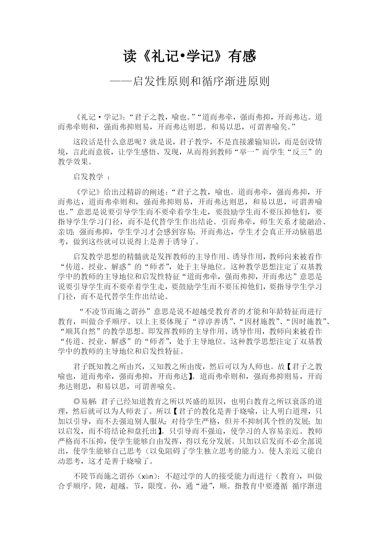 读《礼记•学记》有感 ——启发性原则和循序渐进原则 《礼记·学记》:“君子之教,喻也。”“道而弗牵,强而弗抑,开而弗达。道而弗牵则和,强而弗抑则易,开而弗达则思。和易以思,可谓善喻矣。” 这段话是什么意思呢?就是说,君子教学,不是直接灌输知识,而是创设情境,言此而意彼,让学生感悟、发现,从而得到教师“举一”而学生“反三”的教学效果。 启发教学: 《学记》给出过精辟的阐述:“君子之教,喻也。道而弗牵,强而弗抑,开而弗达,道而弗牵则和,强而弗抑则易,开而弗达则思,和易以思,可谓善喻也。”意思是说要引导学生而不要牵着学生走,要鼓励学生而不要压抑他们,要指导学生学习门径,而不是代替学生作出结论。引而弗牵,师生关系才能融洽、亲切;强而弗抑,学生学习才会感到容易;开而弗达,学生才会真正开动脑筋思考,做到这些就可以说得上是善于诱导了。 启发教学思想的精髓就是发挥教师的主导作用、诱导作用,教师向来被看作“传道、授业、解惑”的“师者”,处于主导地位。这种教学思想注定了双基教学中的教师的主导地位和启发性特征“道而弗牵,强而弗抑,开而弗达”意思是说要引导学生而不要牵着学生走,要鼓励学生而不要压抑他们,要指导学生学习门径,而不是代替学生作出结论。 “不凌节而施之谓孙”意思是说不超越受教育者的才能和年龄特征而进行教育,叫做合乎顺序。以上主要体现了“谆谆善诱”、“因材施教”、“因时施教”、“顺其自然”的教学思想。即发挥教师的主导作用、诱导作用,教师向来被看作“传道、授业、解惑”的“师者”,处于主导地位。这种教学思想注定了双基教学中的教师的主导地位和启发性特征。 君子既知教之所由兴,又知教之所由废,然后可以为人师也。故【君子之教喻也,道而弗牵,强而弗抑,开而弗达】。道而弗牵则和,强而弗抑则易,开而弗达则思,和易以思,可谓善喻矣。 ◎易解:君子已经知道教育之所以兴盛的原因,也明白教育之所以衰落的道理,然后就可以为人师表了。所以【君子的教化是善于晓喻,让人明白道理,只加以引导,而不去强迫别人服从;对待学生严格,但并不抑制其个性的发展;加以启发,而不将结论和盘托出】。只引导而不强迫,使学习的人容易亲近。教师严格而不压抑,使学生能够自由发挥,得以充分发展。只加以启发而不必全部说出,使学生能够自己思考(以免阻碍了学生独立思考的能力)。使人亲近又能自动思考,这才是善于晓喻了。 不陵节而施之谓孙(xùn):不超过学的人的接受能力而进行(教育),叫做合乎顺序。陵,超越。节,限度。孙,通“逊”,顺。指教育中要遵循循序渐进的教学原则。