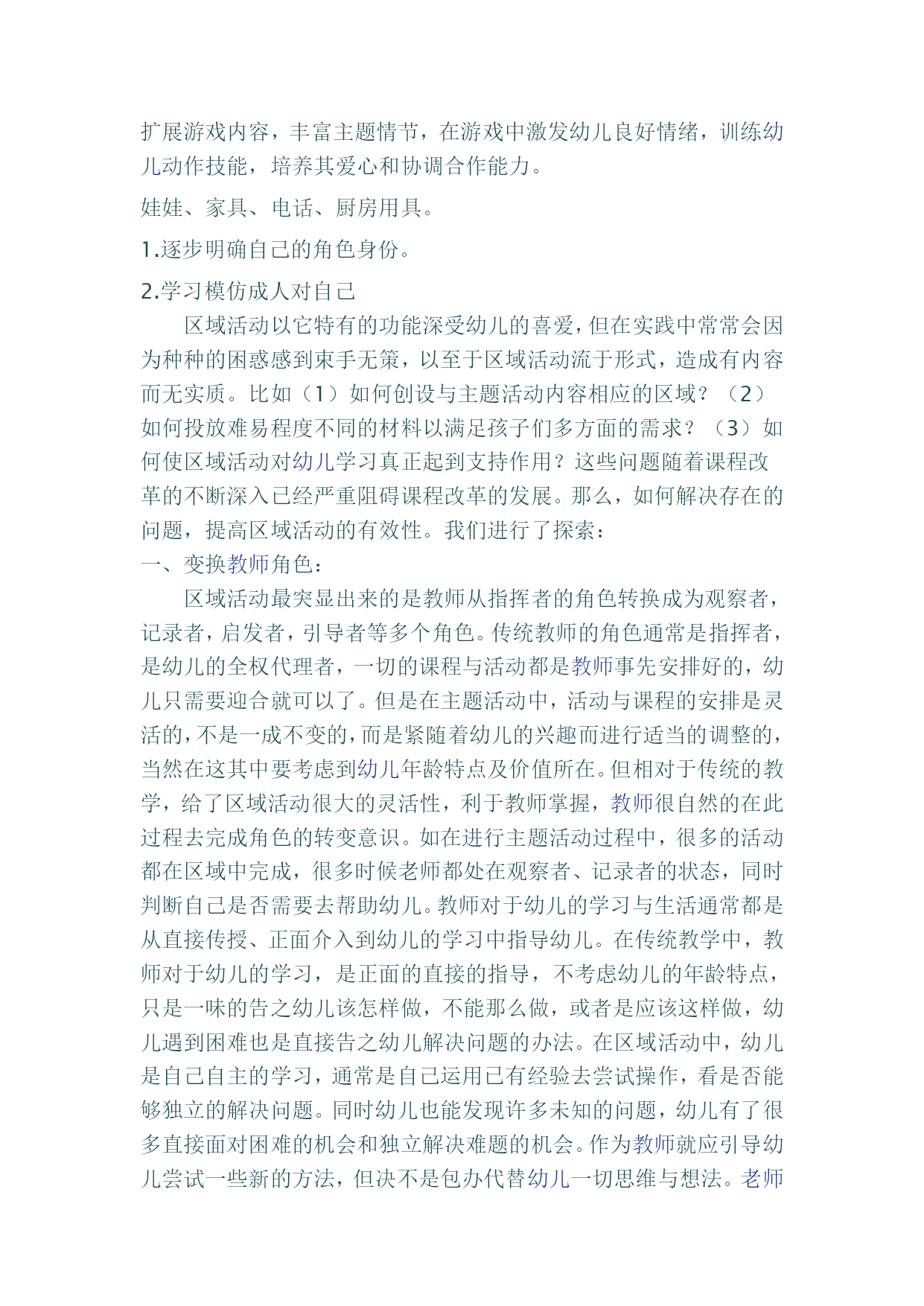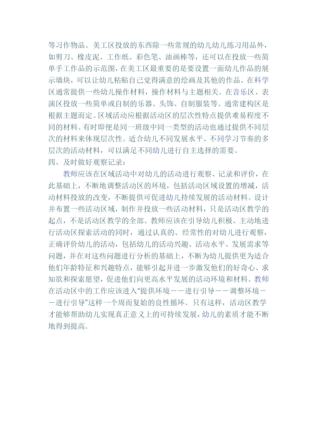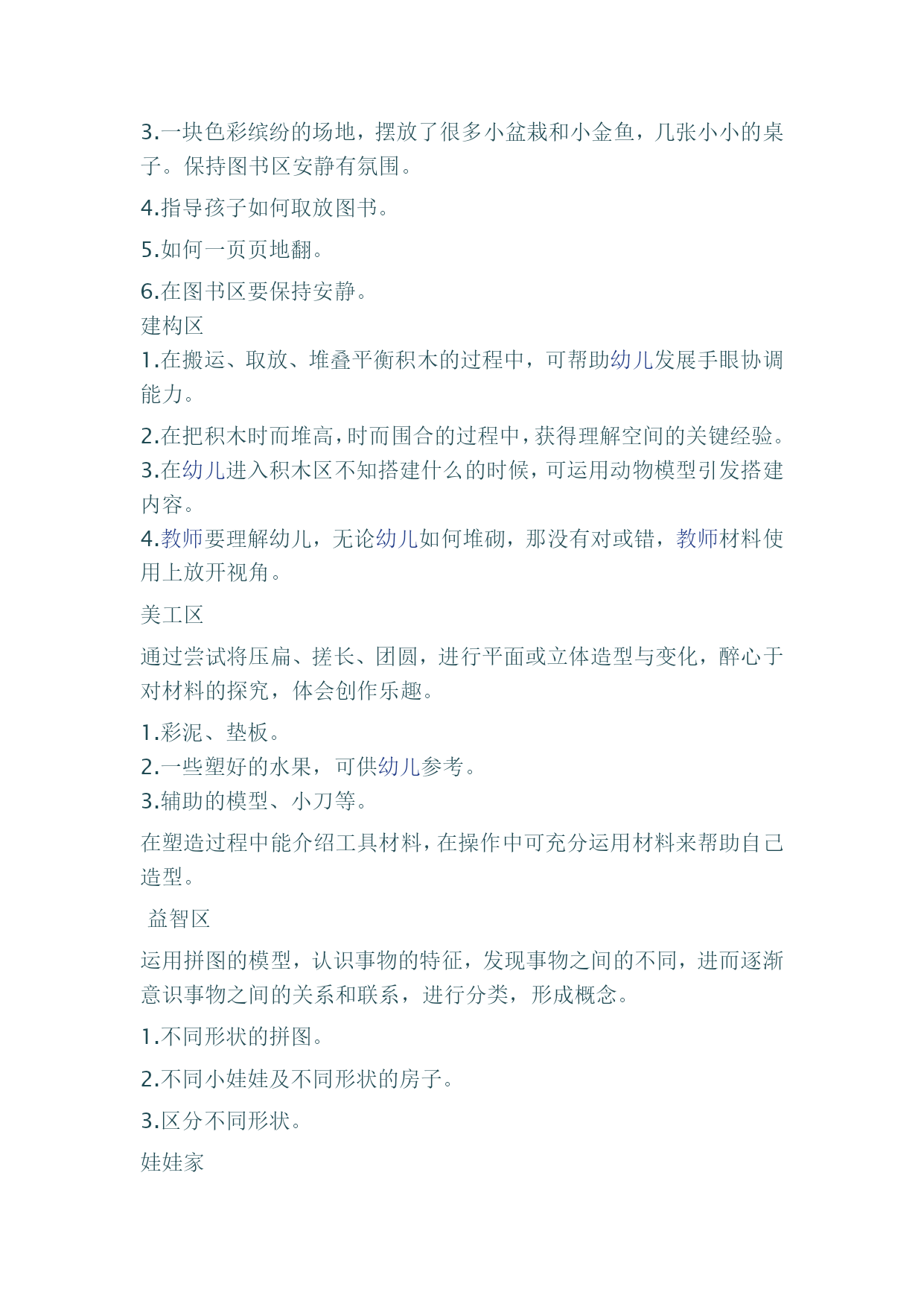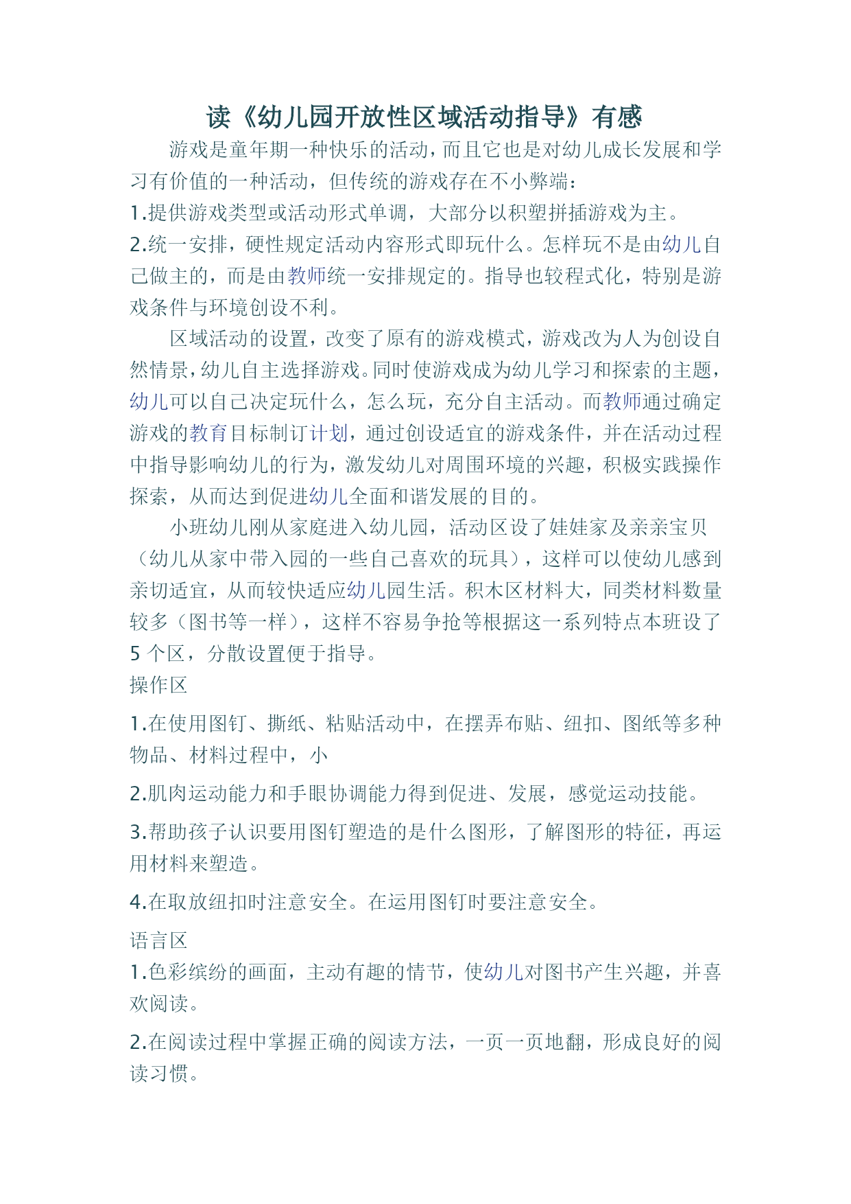 读《幼儿园开放性区域活动指导》有感 游戏是童年期一种快乐的活动,而且它也是对幼儿成长发展和学习有价值的一种活动,但传统的游戏存在不小弊端: 1.提供游戏类型或活动形式单调,大部分以积塑拼插游戏为主。 2.统一安排,硬性规定活动内容形式即玩什么。怎样玩不是由HYPERLINK"http://y.3edu.net/"\t"_blank"幼儿自己做主的,而是由HYPERLINK"http://www.3edu.net/New/jstd/"\t"_blank"教师统一安排规定的。指导也较程式化,特别是游戏条件与环境创设不利。 区域活动的设置,改变了原有的游戏模式,游戏改为人为创设自然情景,幼儿自主选择游戏。同时使游戏成为幼儿学习和探索的主题,HYPERLINK"http://y.3edu.net/"\t"_blank"幼儿可以自己决定玩什么,怎么玩,充分自主活动。而HYPERLINK"http://www.3edu.net/New/jstd/"\t"_blank"教师通过确定游戏的HYPERLINK"http://www.3edu.net/"教育目标制订HYPERLINK"http://j.3edu.net/"\t"_blank"计划,通过创设适宜的游戏条件,并在活动过程中指导影响幼儿的行为,激发幼儿对周围环境的兴趣,积极实践操作探索,从而达到促进HYPERLINK"http://y.3edu.net/"\t"_blank"幼儿全面和谐发展的目的。 小班幼儿刚从家庭进入幼儿园,活动区设了娃娃家及亲亲宝贝(幼儿从家中带入园的一些自己喜欢的玩具),这样可以使幼儿感到亲切适宜,从而较快适应HYPERLINK"http://y.3edu.net/"\t"_blank"幼儿园生活。积木区材料大,同类材料数量较多(图书等一样),这样不容易争抢等根据这一系列特点本班设了5个区,分散设置便于指导。 操作区 1.在使用图钉、撕纸、粘贴活动中,在摆弄布贴、纽扣、图纸等多种物品、材料过程中,小 2.肌肉运动能力和手眼协调能力得到促进、发展,感觉运动技能。 3.帮助孩子认识要用图钉塑造的是什么图形,了解图形的特征,再运用材料来塑造。 4.在取放纽扣时注意安全。在运用图钉时要注意安全。 语言区 1.色彩缤纷的画面,主动有趣的情节,使HYPERLINK"http://y.3edu.net/"\t"_blank"幼儿对图书产生兴趣,并喜欢阅读。 2.在阅读过程中掌握正确的阅读方法,一页一页地翻,形成良好的阅读习惯。 3.一块色彩缤纷的场地,摆放了很多小盆栽和小金鱼,几张小小的桌子。保持图书区安静有氛围。 4.指导孩子如何取放图书。 5.如何一页页地翻。 6.在图书区要保持安静。 建构区 1.在搬运、取放、堆叠平衡积木的过程中,可帮助HYPERLINK"http://y.3edu.net/"\t"_blank"幼儿发展手眼协调能力。 2.在把积木时而堆高,时而围合的过程中,获得理解空间的关键经验。 3.在HYPERLINK"http://y.3edu.net/"\t"_blank"幼儿进入积木区不知搭建什么的时候,可运用动物模型引发搭建内容。 4.HYPERLINK"http://www.3edu.net/New/jstd/"\t"_blank"教师要理解幼儿,无论HYPERLINK"http://y.3edu.net/"\t"_blank"幼儿如何堆砌,那没有对或错,HYPERLINK"http://www.3edu.net/New/jstd/"\t"_blank"教师材料使用上放开视角。 美工区 通过尝试将压扁、搓长、团圆,进行平面或立体造型与变化,醉心于对材料的探究,体会创作乐趣。 1.彩泥、垫板。 2.一些塑好的水果,可供HYPERLINK"http://y.3edu.net/"\t"_blank"幼儿参考。 3.辅助的模型、小刀等。 在塑造过程中能介绍工具材料,在操作中可充分运用材料来帮助自己造型。 益智区 运用拼图的模型,认识事物的特征,发现事物之间的不同,进而逐渐意识事物之间的关系和联系,进行分类,形成概念。 1.不同形状的拼图。 2.不同小娃娃及不同形状的房子。 3.区分不同形状。 娃娃家 扩展游戏内容,丰富主题情节,在游戏中激发幼儿良好情绪,训练HYPERLINK"http://y.3edu.net/"\t"_blank"幼儿动作技能,培养其爱心和协调合作能力。 娃娃、家具、电话、厨房用具。 1.逐步明确自己的角色身份。 2.学习模仿成人对自己 区域活动以它特有的功能深受幼儿的喜爱,但在实践中常常会因为种种的困惑感到束手无策,以至于区域活动流于形式,造成