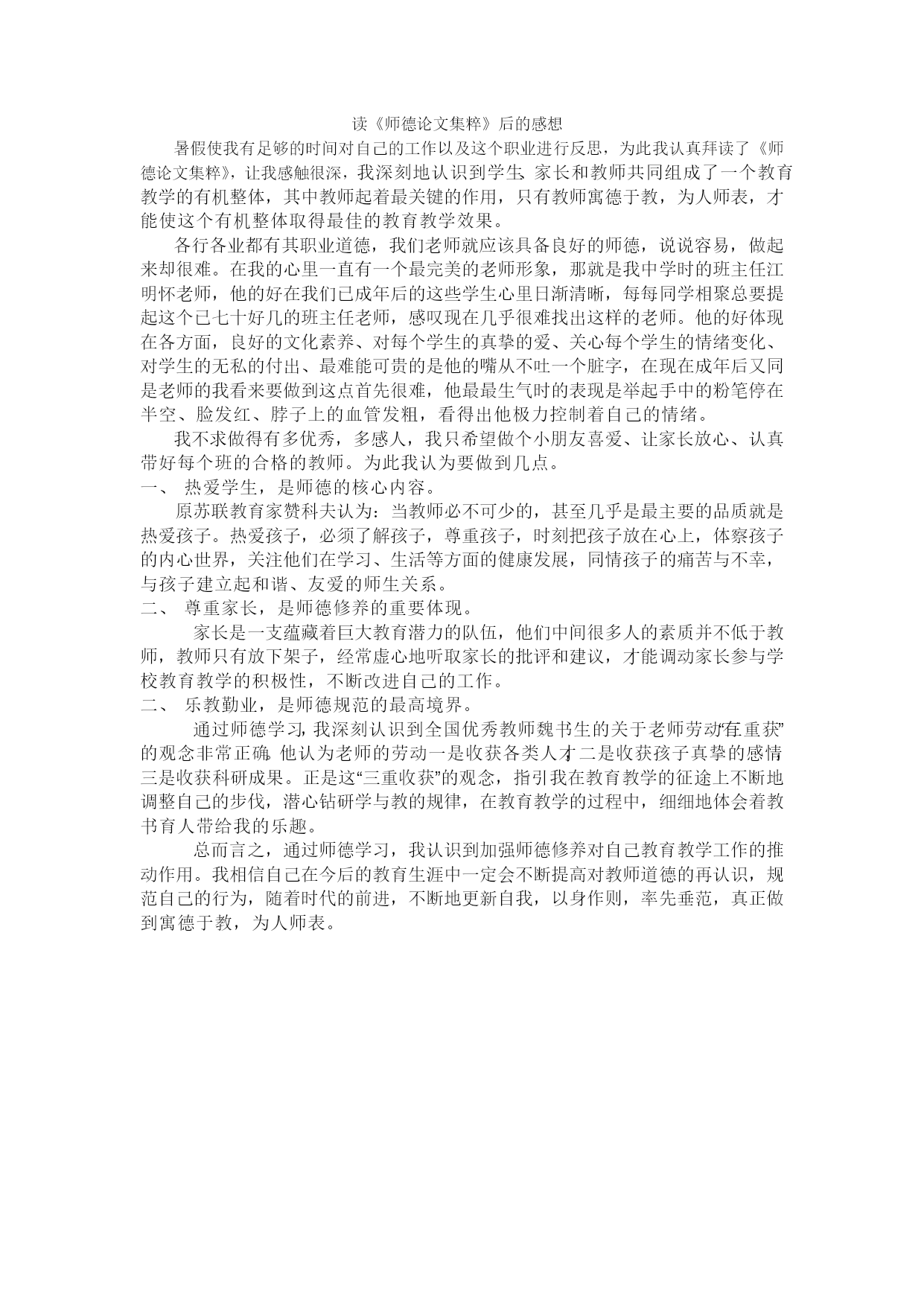 读《师德论文集粹》后的感想 暑假使我有足够的时间对自己的工作以及这个职业进行反思,为此我认真拜读了《师德论文集粹》,让我感触很深,我深刻地认识到学生、家长和教师共同组成了一个教育教学的有机整体,其中教师起着最关键的作用,只有教师寓德于教,为人师表,才能使这个有机整体取得最佳的教育教学效果。 各行各业都有其职业道德,我们老师就应该具备良好的师德,说说容易,做起来却很难。在我的心里一直有一个最完美的老师形象,那就是我中学时的班主任江明怀老师,他的好在我们已成年后的这些学生心里日渐清晰,每每同学相聚总要提起这个已七十好几的班主任老师,感叹现在几乎很难找出这样的老师。他的好体现在各方面,良好的文化素养、对每个学生的真挚的爱、关心每个学生的情绪变化、对学生的无私的付出、最难能可贵的是他的嘴从不吐一个脏字,在现在成年后又同是老师的我看来要做到这点首先很难,他最最生气时的表现是举起手中的粉笔停在半空、脸发红、脖子上的血管发粗,看得出他极力控制着自己的情绪。 我不求做得有多优秀,多感人,我只希望做个小朋友喜爱、让家长放心、认真带好每个班的合格的教师。为此我认为要做到几点。 热爱学生,是师德的核心内容。 原苏联教育家赞科夫认为:当教师必不可少的,甚至几乎是最主要的品质就是热爱孩子。热爱孩子,必须了解孩子,尊重孩子,时刻把孩子放在心上,体察孩子的内心世界,关注他们在学习、生活等方面的健康发展,同情孩子的痛苦与不幸,与孩子建立起和谐、友爱的师生关系。 二、尊重家长,是师德修养的重要体现。 家长是一支蕴藏着巨大教育潜力的队伍,他们中间很多人的素质并不低于教师,教师只有放下架子,经常虚心地听取家长的批评和建议,才能调动家长参与学校教育教学的积极性,不断改进自己的工作。 乐教勤业,是师德规范的最高境界。 通过师德学习,我深刻认识到全国优秀教师魏书生的关于老师劳动有“三重获”的观念非常正确。他认为老师的劳动一是收获各类人才,二是收获孩子真挚的感情,三是收获科研成果。正是这“三重收获”的观念,指引我在教育教学的征途上不断地调整自己的步伐,潜心钻研学与教的规律,在教育教学的过程中,细细地体会着教书育人带给我的乐趣。 总而言之,通过师德学习,我认识到加强师德修养对自己教育教学工作的推动作用。我相信自己在今后的教育生涯中一定会不断提高对教师道德的再认识,规范自己的行为,随着时代的前进,不断地更新自我,以身作则,率先垂范,真正做到寓德于教,为人师表。