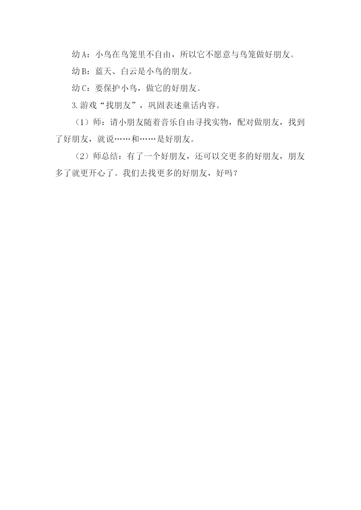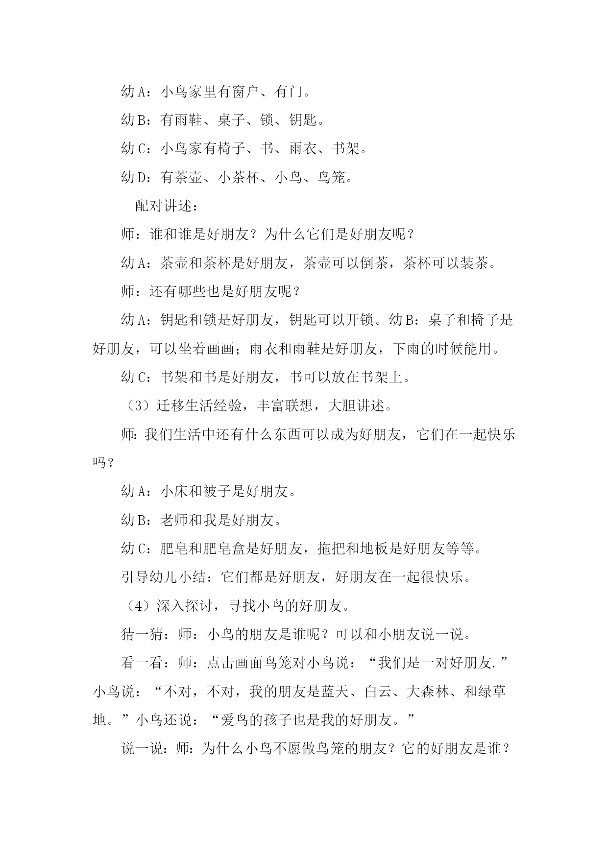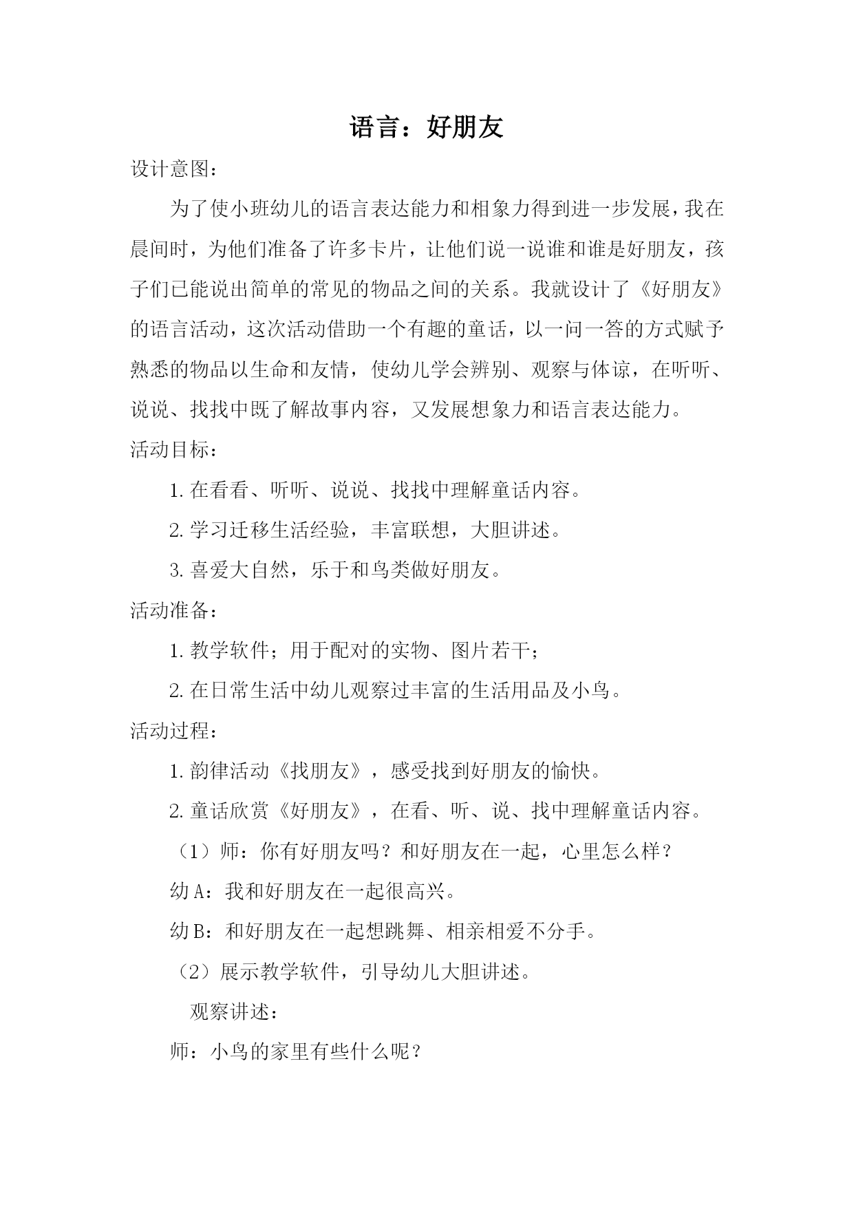 语言:好朋友 设计意图: 为了使小班幼儿的语言表达能力和相象力得到进一步发展,我在晨间时,为他们准备了许多卡片,让他们说一说谁和谁是好朋友,孩子们已能说出简单的常见的物品之间的关系。我就设计了《好朋友》的语言活动,这次活动借助一个有趣的童话,以一问一答的方式赋予熟悉的物品以生命和友情,使幼儿学会辨别、观察与体谅,在听听、说说、找找中既了解故事内容,又发展想象力和语言表达能力。 活动目标: 1.在看看、听听、说说、找找中理解童话内容。 2.学习迁移生活经验,丰富联想,大胆讲述。 3.喜爱大自然,乐于和鸟类做好朋友。 活动准备: 1.教学软件;用于配对的实物、图片若干; 2.在日常生活中幼儿观察过丰富的生活用品及小鸟。 活动过程: 1.韵律活动《找朋友》,感受找到好朋友的愉快。 2.童话欣赏《好朋友》,在看、听、说、找中理解童话内容。 (1)师:你有好朋友吗?和好朋友在一起,心里怎么样? 幼A:我和好朋友在一起很高兴。 幼B:和好朋友在一起想跳舞、相亲相爱不分手。 (2)展示教学软件,引导幼儿大胆讲述。 观察讲述: 师:小鸟的家里有些什么呢? 幼A:小鸟家里有窗户、有门。 幼B:有雨鞋、桌子、锁、钥匙。 幼C:小鸟家有椅子、书、雨衣、书架。 幼D:有茶壶、小茶杯、小鸟、鸟笼。 配对讲述: 师:谁和谁是好朋友?为什么它们是好朋友呢? 幼A:茶壶和茶杯是好朋友,茶壶可以倒茶,茶杯可以装茶。 师:还有哪些也是好朋友呢? 幼A:钥匙和锁是好朋友,钥匙可以开锁。幼B:桌子和椅子是好朋友,可以坐着画画;雨衣和雨鞋是好朋友,下雨的时候能用。 幼C:书架和书是好朋友,书可以放在书架上。 (3)迁移生活经验,丰富联想,大胆讲述。 师:我们生活中还有什么东西可以成为好朋友,它们在一起快乐吗? 幼A:小床和被子是好朋友。 幼B:老师和我是好朋友。 幼C:肥皂和肥皂盒是好朋友,拖把和地板是好朋友等等。 引导幼儿小结:它们都是好朋友,好朋友在一起很快乐。 (4)深入探讨,寻找小鸟的好朋友。 猜一猜:师:小鸟的朋友是谁呢?可以和小朋友说一说。 看一看:师:点击画面鸟笼对小鸟说:“我们是一对好朋友.”小鸟说:“不对,不对,我的朋友是蓝天、白云、大森林、和绿草地。”小鸟还说:“爱鸟的孩子也是我的好朋友。” 说一说:师:为什么小鸟不愿做鸟笼的朋友?它的好朋友是谁? 幼A:小鸟在鸟笼里不自由,所以它不愿意与鸟笼做好朋友。 幼B:蓝天、白云是小鸟的朋友。 幼C:要保护小鸟,做它的好朋友。 3.游戏“找朋友”,巩固表述童话内容。 (1)师:请小朋友随着音乐自由寻找实物,配对做朋友,找到了好朋友,就说……和……是好朋友。 (2)师总结:有了一个好朋友,还可以交更多的好朋友,朋友多了就更开心了。我们去找更多的好朋友,好吗?